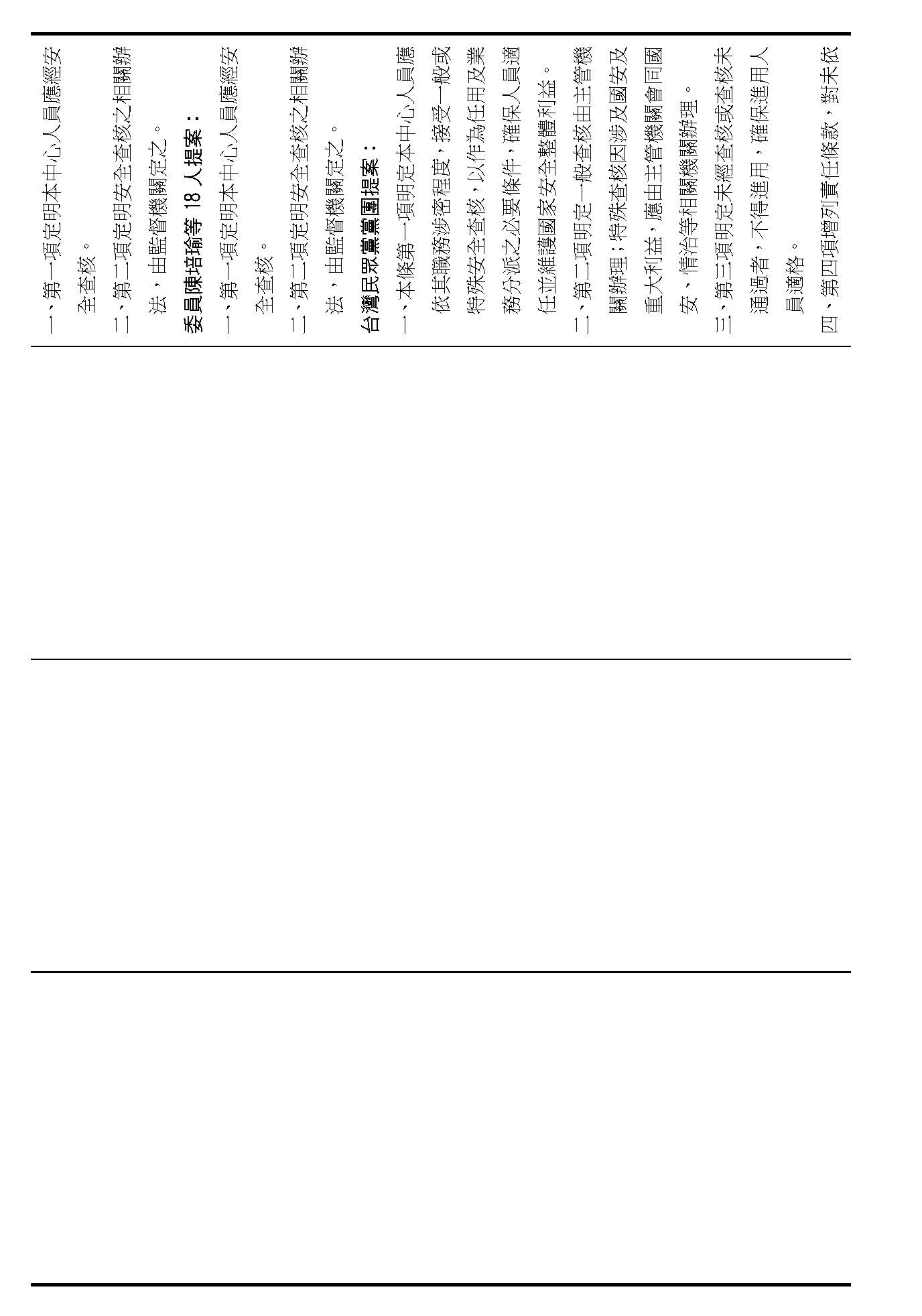 主席:謝謝黃國昌委員的說明。關於台灣民眾黨的版本,黃國昌委員剛剛提到第二十條中心人員的部分,安全查核他把它區分了,依涉密程度分為接受一般或特殊安全查核,這個部分倒是很完整,是不是我們這個先暫時……
