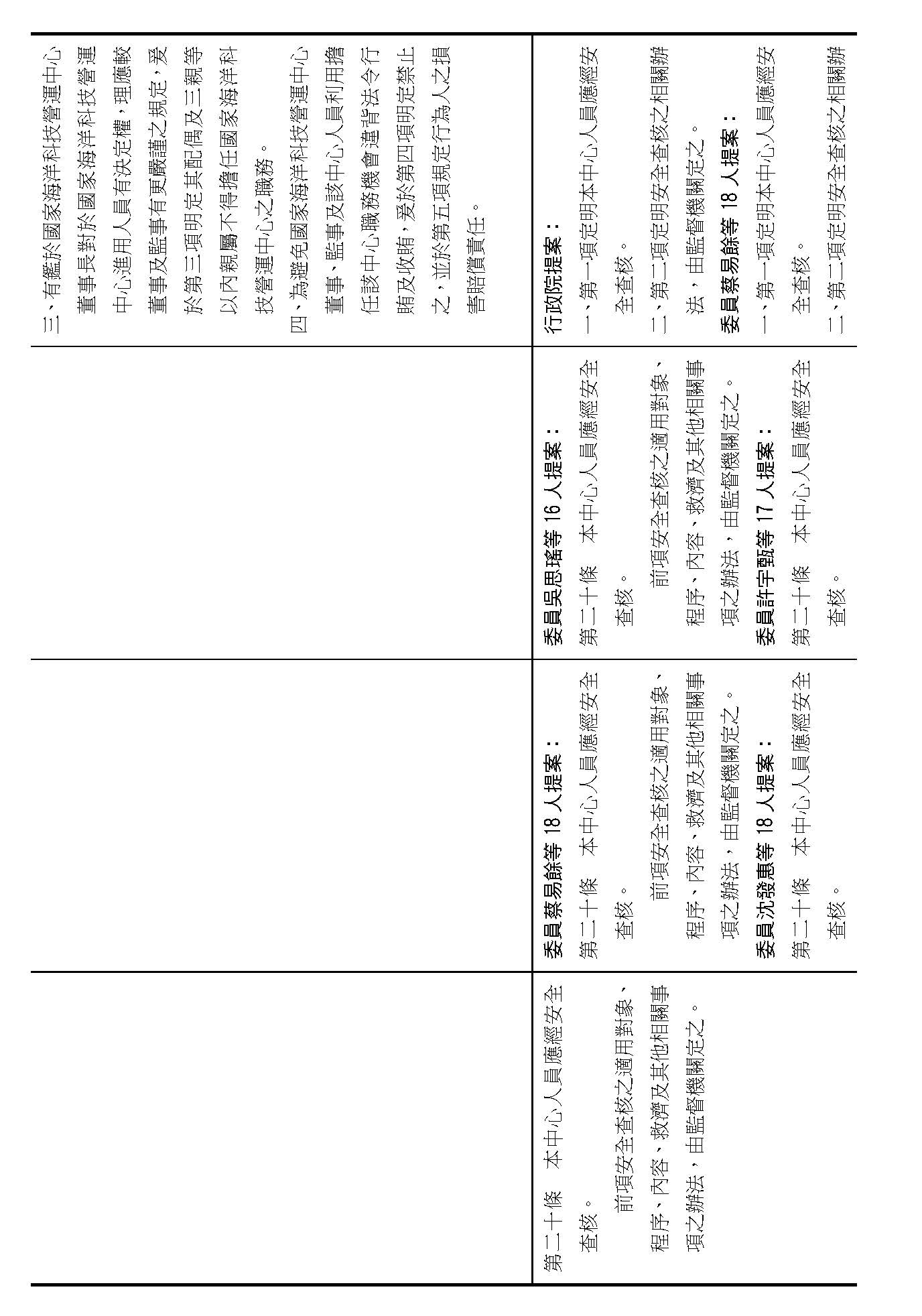 主席:看起來也比較完整,剛才也宣讀過了,修正動議第一項:「本中心人員應經安全查核。」;第二項:「前項安全查核之適用對象、程序、內容、救濟及其他相關事項之辦法,由監督機關會商有關機關定之。」,請問海委會有沒有什麼不同的意見?