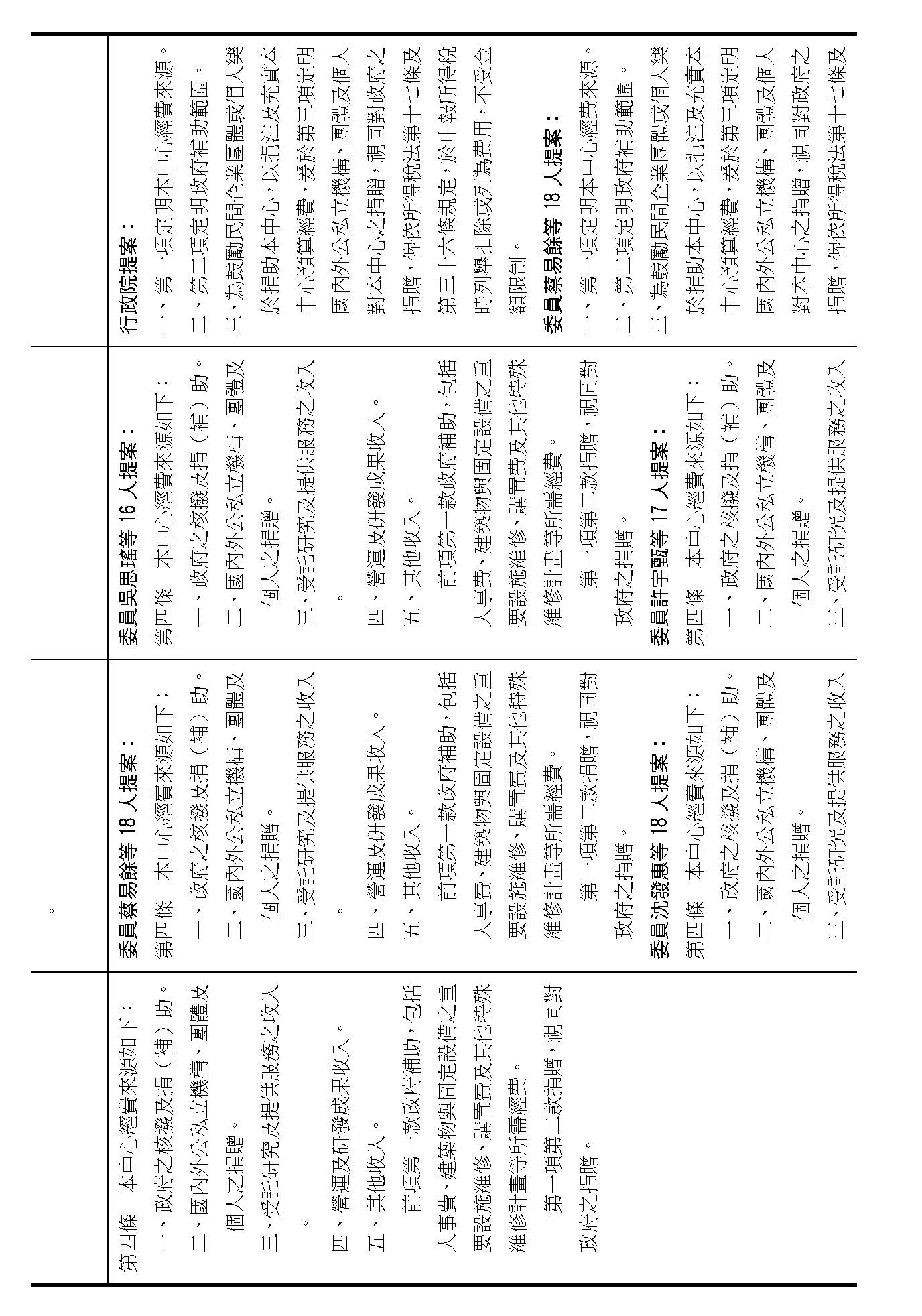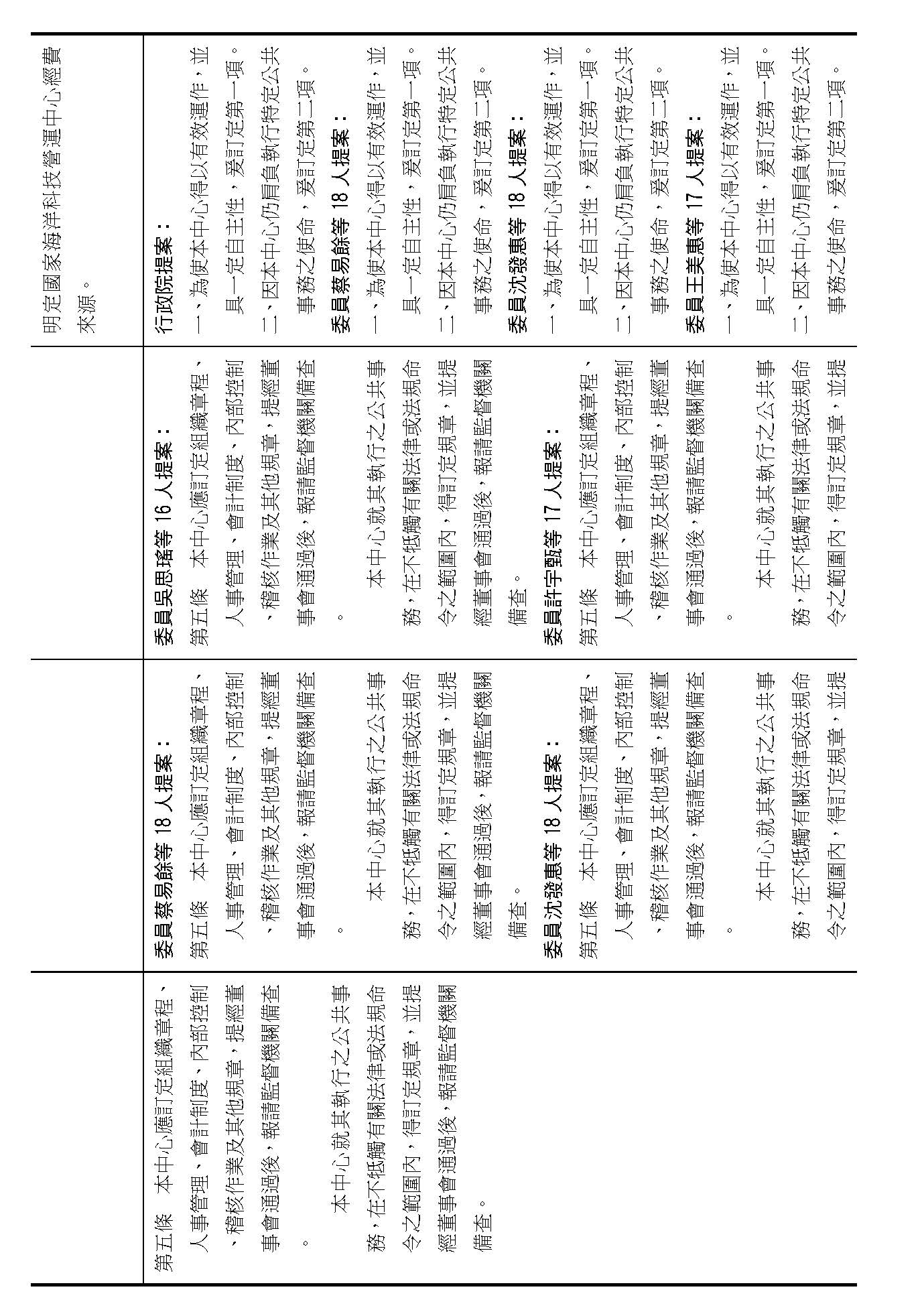 第五條是中心的組織規章訂定的程序,我看大家這條提案的內容都相同,如果在場委員沒有異議的話,我們就按照行政院的提案通過。
