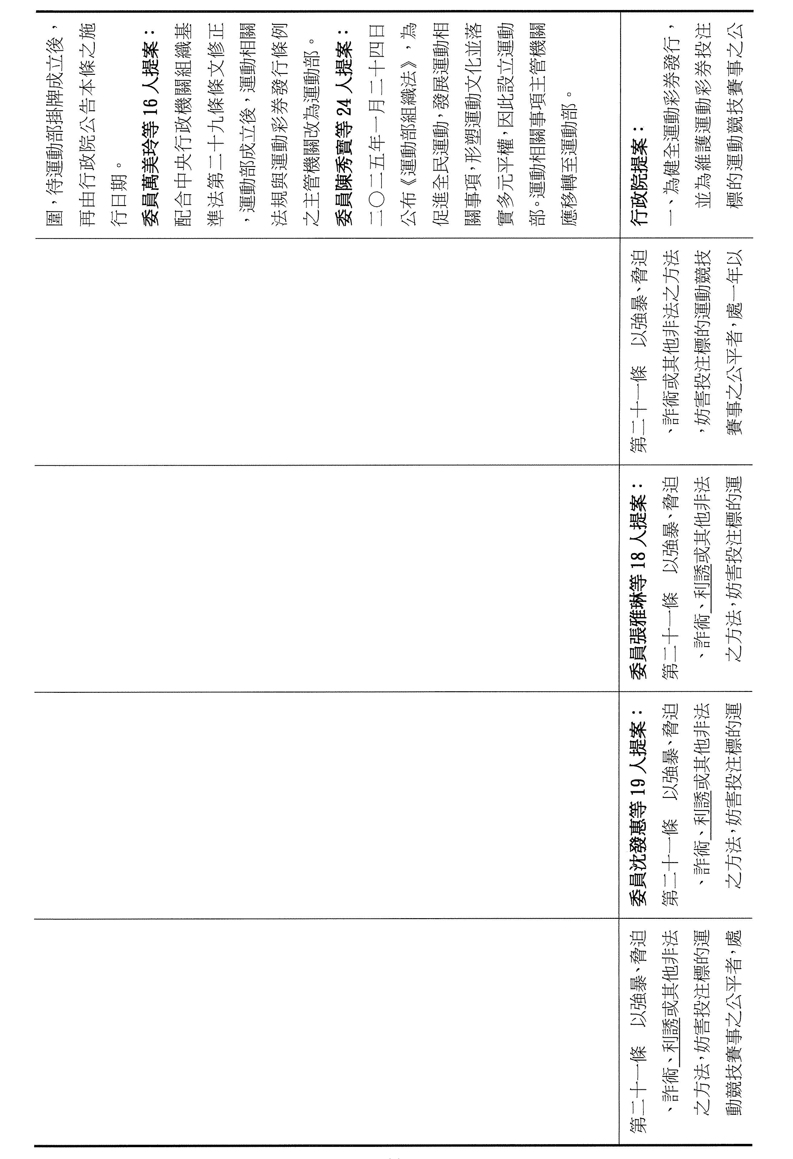 一、繼續審查(一)行政院函請審議「運動彩券發行條例第二十一條及第二十一條之一條文修正草案」案。(二)委員沈發惠等19人擬具「運動彩券發行條例第二條及第二十一條條文修正草案」案。(三)委員葉元之等19人擬具「運動彩券發行條例第二條條文修正草案」案。(四)委員葛如鈞等20人擬具「運動彩券發行條例第二條及第二十一條條文修正草案」案。(五)委員羅廷瑋等17人擬具「運動彩券發行條例第二十一條及第二十一條之一條文修正草案」案。(六)委員蔡其昌等16人擬具「運動彩券發行條例第二條及第二十一條條文修正草案」案。(七)委員王美惠等24人擬具「運動彩券發行條例第二十一條及第二十一條之一條文修正草案」案。(八)委員吳思瑤等18人擬具「運動彩券發行條例第二十一條及第二十一條之一條文修正草案」案。(九)委員郭國文等17人擬具「運動彩券發行條例第二十一條及第二十一條之一條文修正草案」案。(十)委員張雅琳等18人擬具「運動彩券發行條例第二條、第二十一條及第二十一條之一條文修正草案」案。(十一)委員伍麗華Saidhai Tahovecahe等17人擬具「運動彩券發行條例第二條、第二十一條及第二十一條之一條文修正草案」案。(十二)委員鍾佳濱等21人擬具「運動彩券發行條例第二十一條及第二十一條之一條文修正草案」案。(十三)委員吳沛憶等21人擬具「運動彩券發行條例部分條文修正草案」案。(十四)委員林宜瑾等28人擬具「運動彩券發行條例第二十一條及第二十一條之一條文修正草案」案。(十五)委員李坤城等24人擬具「運動彩券發行條例第二十一條及第二十一條之一條文修正草案」案。(十六)委員柯志恩等19人擬具「運動彩券發行條例第二十一條及第二十一條之一條文修正草案」案。(十七)委員范雲等19人擬具「運動彩券發行條例第二十一條及第二十一條之一條文修正草案」案。
