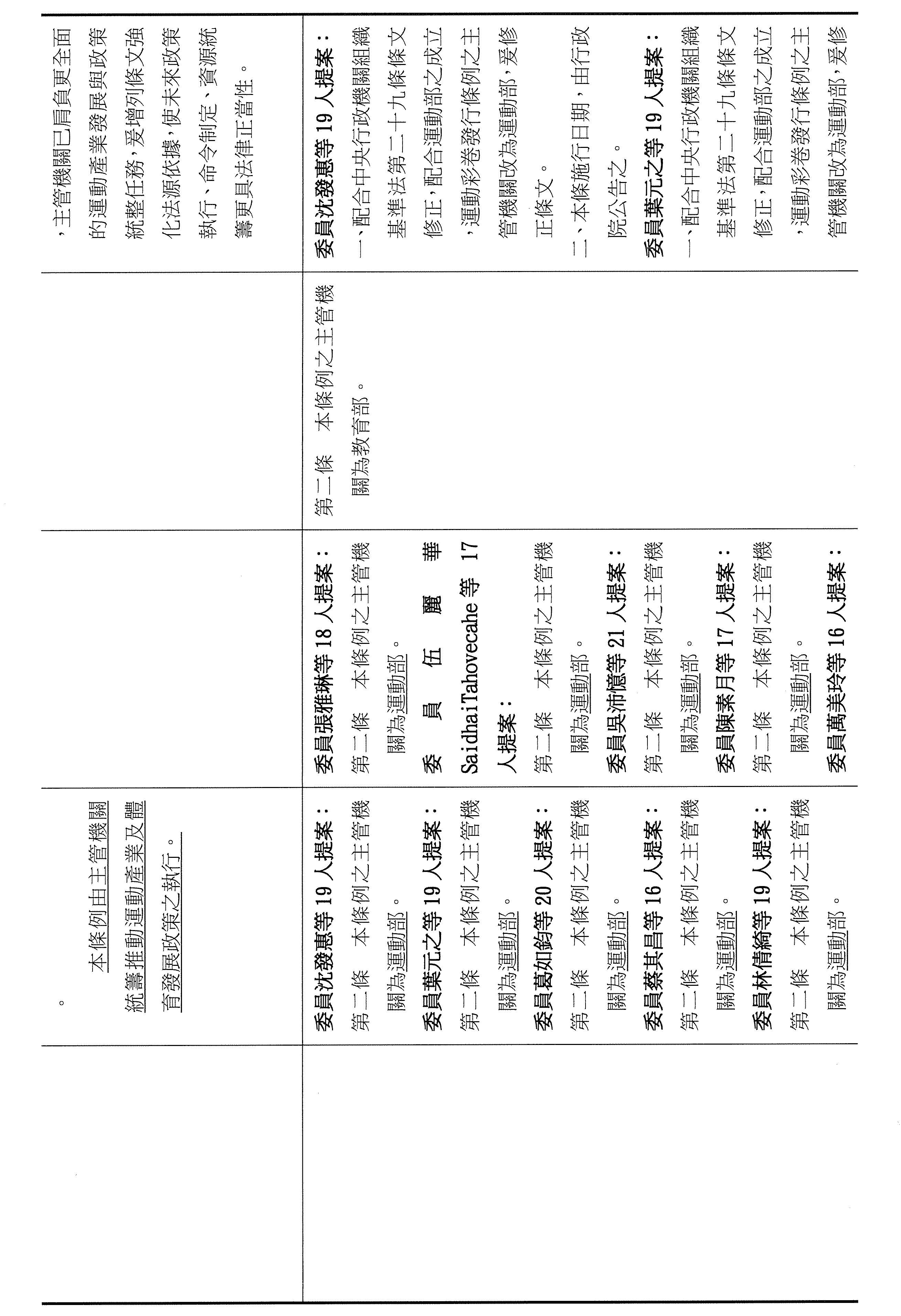 今天的議程是一、繼續審查運動彩券發行條例相關修正草案共17案:(一)行政院函請審議「運動彩券發行條例第二十一條及第二十一條之一條文修正草案」案、(二)委員沈發惠等19人擬具「運動彩券發行條例第二條及第二十一條條文修正草案」案、(三)委員葉元之等19人擬具「運動彩券發行條例第二條條文修正草案」案、(四)委員葛如鈞等20人擬具「運動彩券發行條例第二條及第二十一條條文修正草案」案、(五)委員羅廷瑋等17人擬具「運動彩券發行條例第二十一條及第二十一條之一條文修正草案」案、(六)委員蔡其昌等16人擬具「運動彩券發行條例第二條及第二十一條條文修正草案」案、(七)委員王美惠等24人擬具「運動彩券發行條例第二十一條及第二十一條之一條文修正草案」案、(八)委員吳思瑤等18人擬具「運動彩券發行條例第二十一條及第二十一條之一條文修正草案」案、(九)委員郭國文等17人擬具「運動彩券發行條例第二十一條及第二十一條之一條文修正草案」案、(十)委員張雅琳等18人擬具「運動彩券發行條例第二條、第二十一條及第二十一條之一條文修正草案」案、(十一)委員伍麗華Saidhai Tahovecahe等17人擬具「運動彩券發行條例第二條、第二十一條及第二十一條之一條文修正草案」案、(十二)委員鍾佳濱等21人擬具「運動彩券發行條例第二十一條及第二十一條之一條文修正草案」案、(十三)委員吳沛憶等21人擬具「運動彩券發行條例部分條文修正草案」案、(十四)委員林宜瑾等28人擬具「運動彩券發行條例第二十一條及第二十一條之一條文修正草案」案、(十五)委員李坤城等24人擬具「運動彩券發行條例第二十一條及第二十一條之一條文修正草案」案、(十六)委員柯志恩等19人擬具「運動彩券發行條例第二十一條及第二十一條之一條文修正草案」案、(十七)委員范雲等19人擬具「運動彩券發行條例第二十一條及第二十一條之一條文修正草案」案;二、審查運動彩券發行條例相關修正草案共12案:(一)委員蔡易餘等18人擬具「運動彩券發行條例第二十一條及第二十一條之一條文修正草案」案;(二)委員林思銘等20人擬具「運動彩券發行條例第二十一條及第二十一條之一條文修正草案」案;(三)委員洪孟楷等16人擬具「運動彩券發行條例第二十一條及第二十一條之一條文修正草案」案;(四)委員林倩綺等19人擬具「運動彩券發行條例部分條文修正草案」案;(五)委員陳素月等17人擬具「運動彩券發行條例第二條、第二十一條及第二十一條之一條文修正草案」案;(六)委員郭昱晴等18人擬具「運動彩券發行條例第二十一條條文修正草案」案;(七)委員陳秀寳等24人擬具「運動彩券發行條例第二條、第二十一條及第二十一條之一條文修正草案」案;(八)委員萬美玲等16人擬具「運動彩券發行條例第二條及第二十一條條文修正草案」案;(九)委員羅美玲等17人擬具「運動彩券發行條例第二條、第二十一條及第二十一條之一條文修正草案」案;(十)台灣民眾黨黨團擬具「運動彩券發行條例第二條、第二十一條及第二十一條之一條文修正草案」案;(十一)委員葉元之等20人擬具「運動彩券發行條例第二十一條及第二十一條之一條文修正草案」案;(十二)委員李柏毅等17人擬具「運動彩券發行條例第二十一條及第二十一條之一條文修正草案」案。我們今天就針對以上這些修正草案來進行逐條審查。