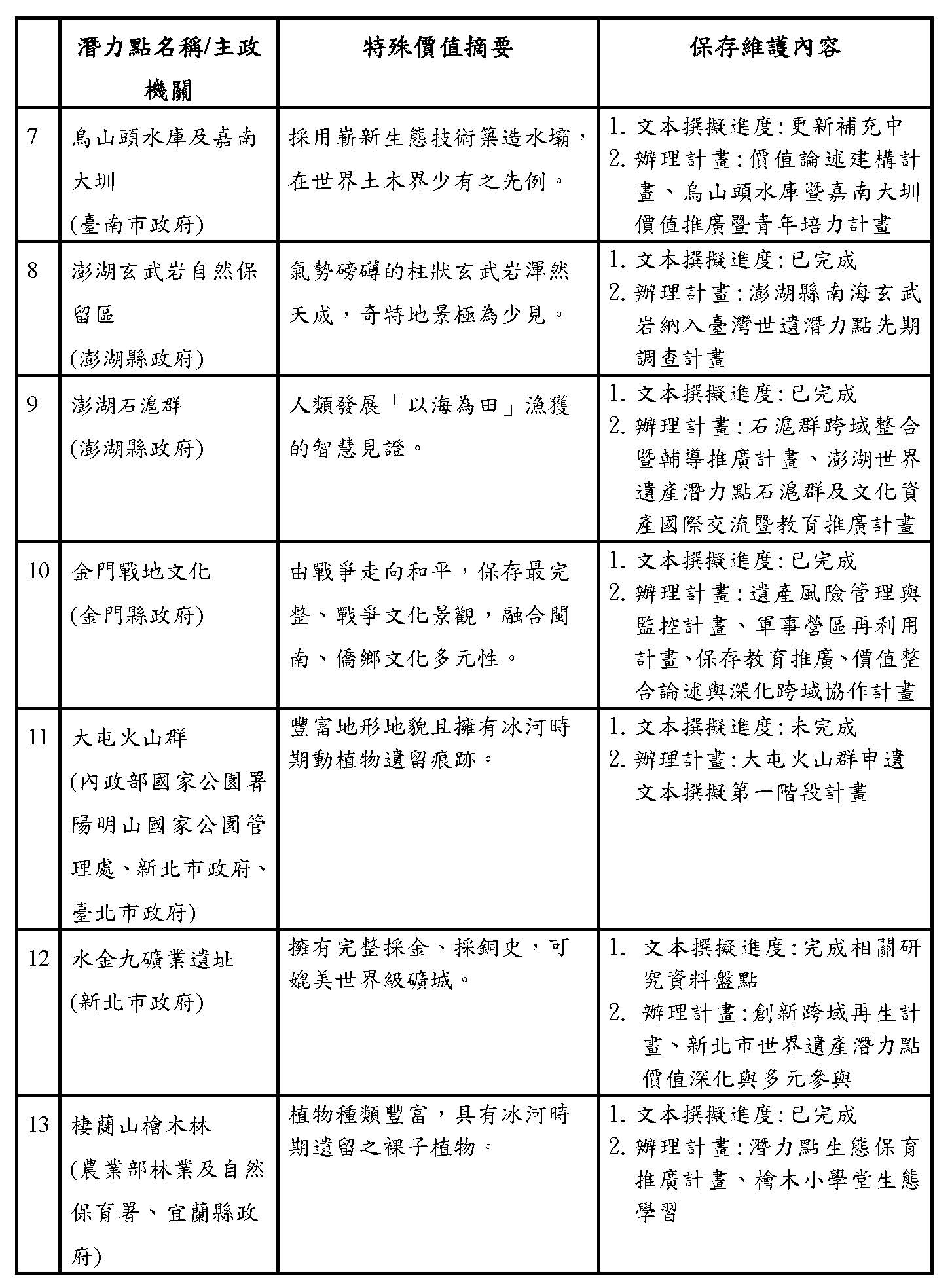截至113年,18處潛力點中,總計已完成11處文本,並持續督請、鼓勵尚未完成之潛力點所在縣市政府與中央等單位撰擬及補充;114年起,本部為強化潛力點特殊價值之論述,及因應國際文化遺產保存趨勢強調面對氣候變遷之永續與韌性,爰針對提案辦理世遺文本撰擬或更新、補充之潛力點主政機關,列為優先重點補助。