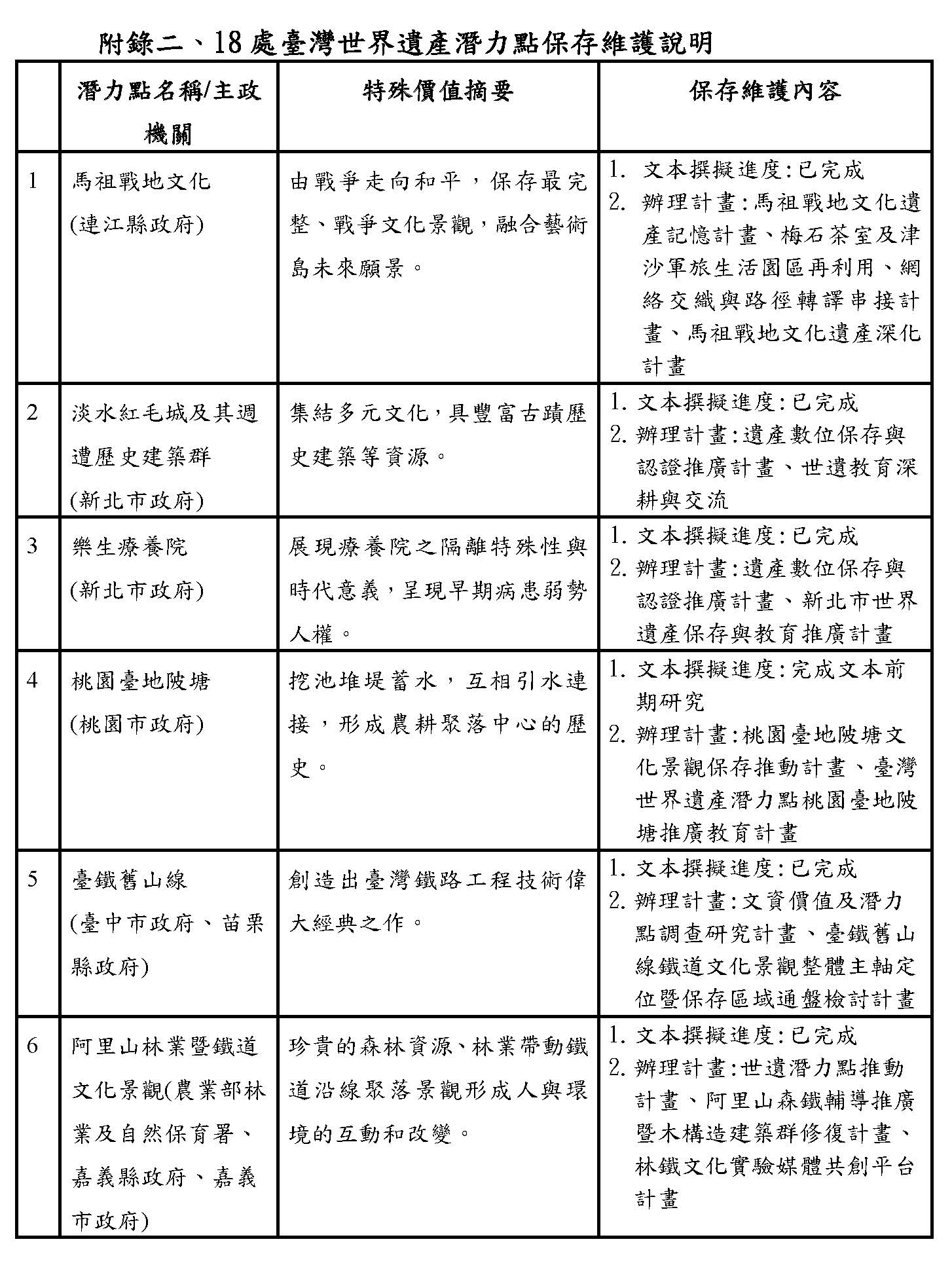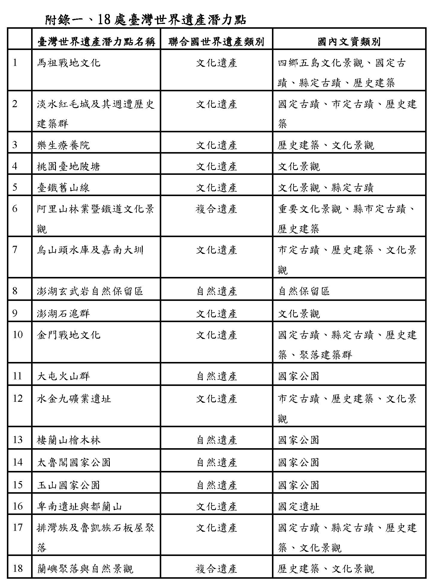 本部於民國92年(文建會時期)徵詢國內專家學者並函請縣市政府及地方文史工作室提報、推薦,邀請國內外專家學者現勘,依世界遺產登錄標準遴選出12處世界遺產潛力點;民國98年成立第一屆世界遺產推動會,並召開第1次會議增加5處潛力點,計17處;民國99年第一屆第4次推動會決議將原潛力點金馬戰地文化,分別列為金門戰地文化、馬祖戰地文化2處潛力點,爰共計18處。(詳附錄一)