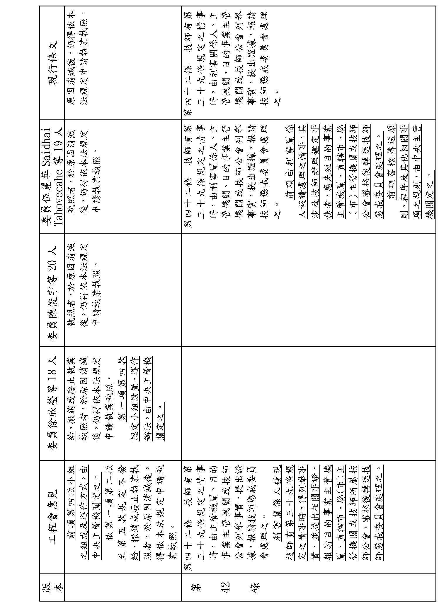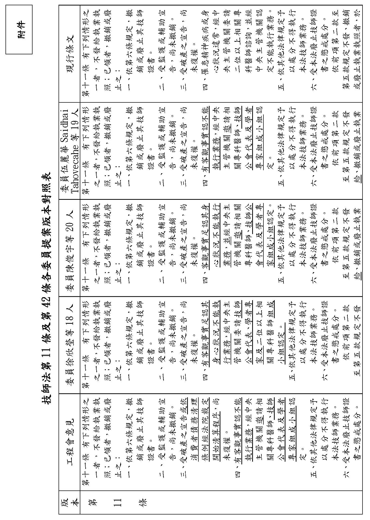 審查一、委員徐欣瑩等18人、二、委員陳俊宇等20人分別擬具「技師法第十一條條文修正草案」及三、委員伍麗華Saidhai Tahovecahe等19人擬具「技師法第十一條及第四十二條條文修正草案」案。