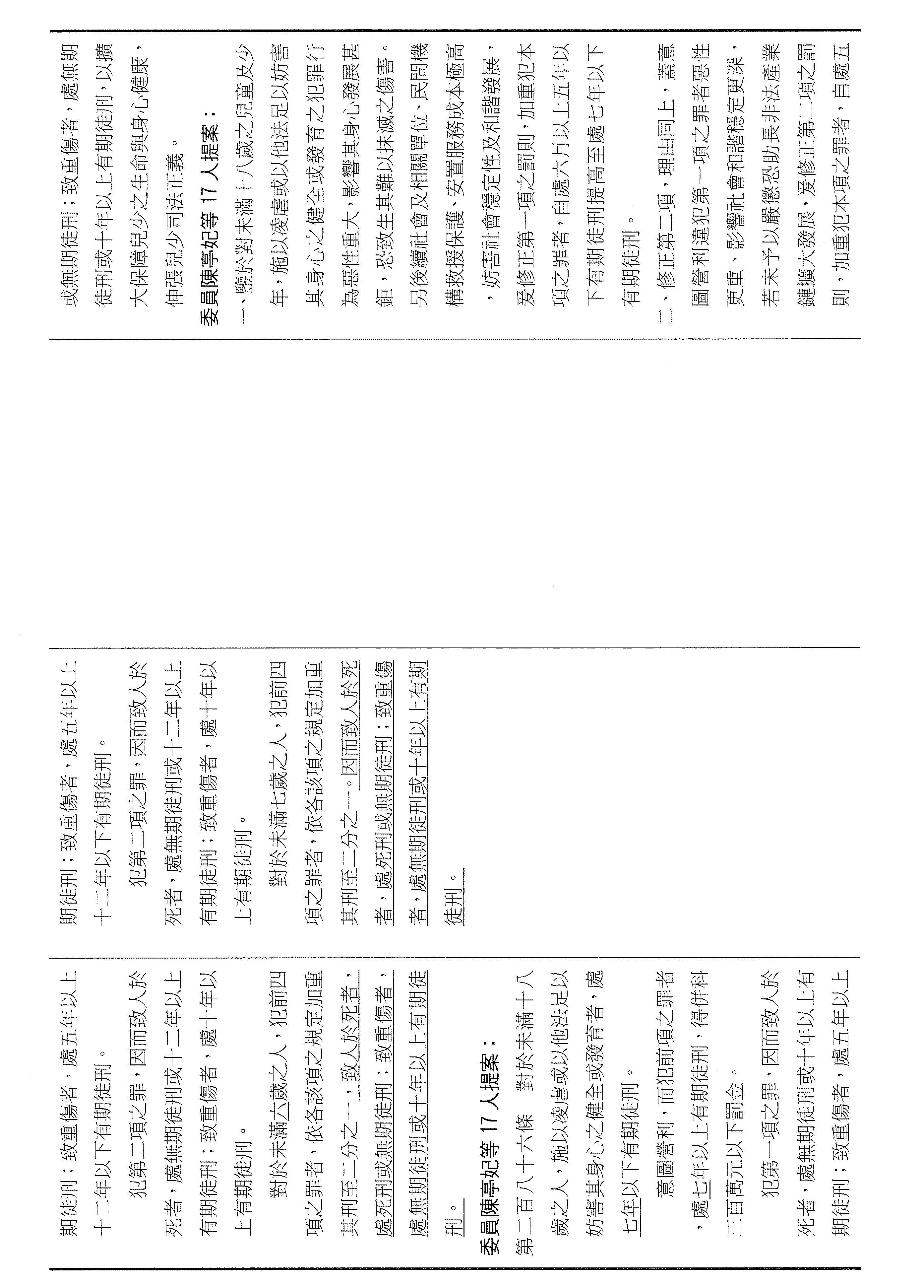 王委員鴻薇:可能比較懂法的人,在法條上、在法意上都非常講究,但是今天為什麼有這麼大的、來自於民間的聲音,希望能夠修法呢?最後他們其實都非常周到的,直接把第二百八十六條提供給委員,甚至是跨黨派的委員,但是我也會認為,其實希望修法的人,他不會執著於今天一定要放在哪一條文裡面,重點是來自於必須把保護幼兒;避免凌虐,甚至凌虐致死;應該要處以極刑這樣一個精神跟原則,放到法條裡面,希望這樣一個最基本的正義得以實現。因為我不是學法的,我非常能夠理解很多父母的心情,所以我剛才就說,今天針對第二百七十一條去修,或者去修第二百八十六條,對於也身為父母的我,我不會去堅持,雖然我自己的提案是修笫二百八十六條,但是如果你今天把我們希望修的精神能夠放到第二百七十一條,也OK啊!