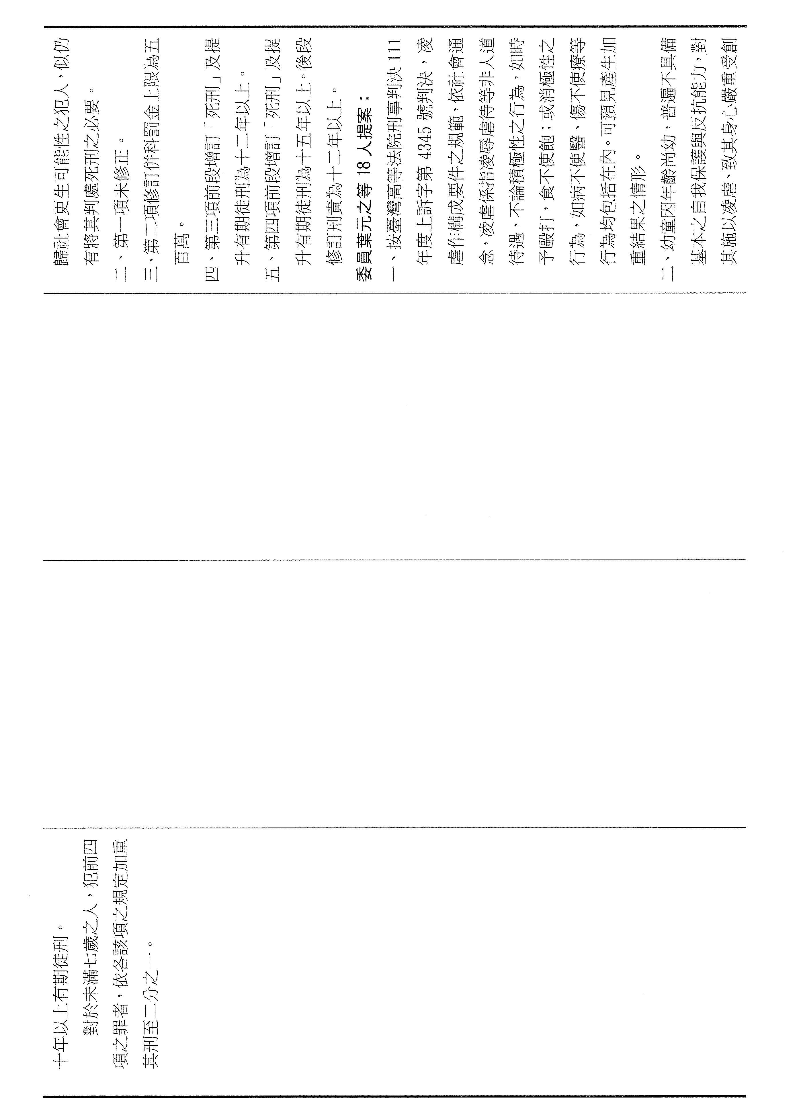 主席:剛剛談的這部分我是認同黃國昌委員所提到的,如果放在第二百七十一條裡面,也就是多一項的話,其實在第二百七十二條的適用上基本上是沒有問題的,因為第二百七十二條有一個構成要件,就是已經限縮在直系血親尊親屬,所以在適用第二百七十一條的時候,不會跑到比他年輕的幼童去,所以在適用上面確實剛剛黃委員講得沒錯,這會讓條文的編排變得很醜,但是不會影響到實務上面的適用,所以剛剛黃委員講的這塊我是認同的,也給次長參考一下。