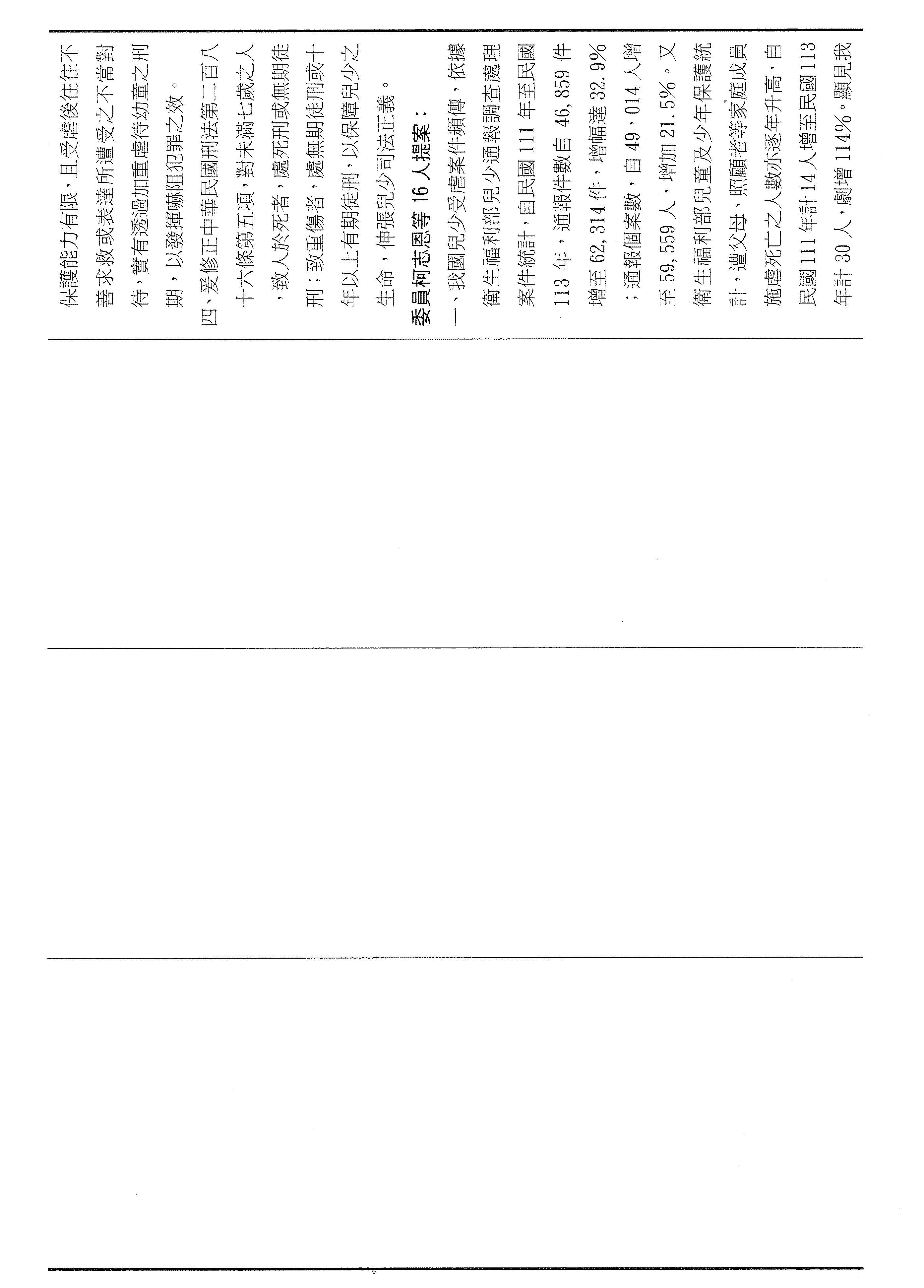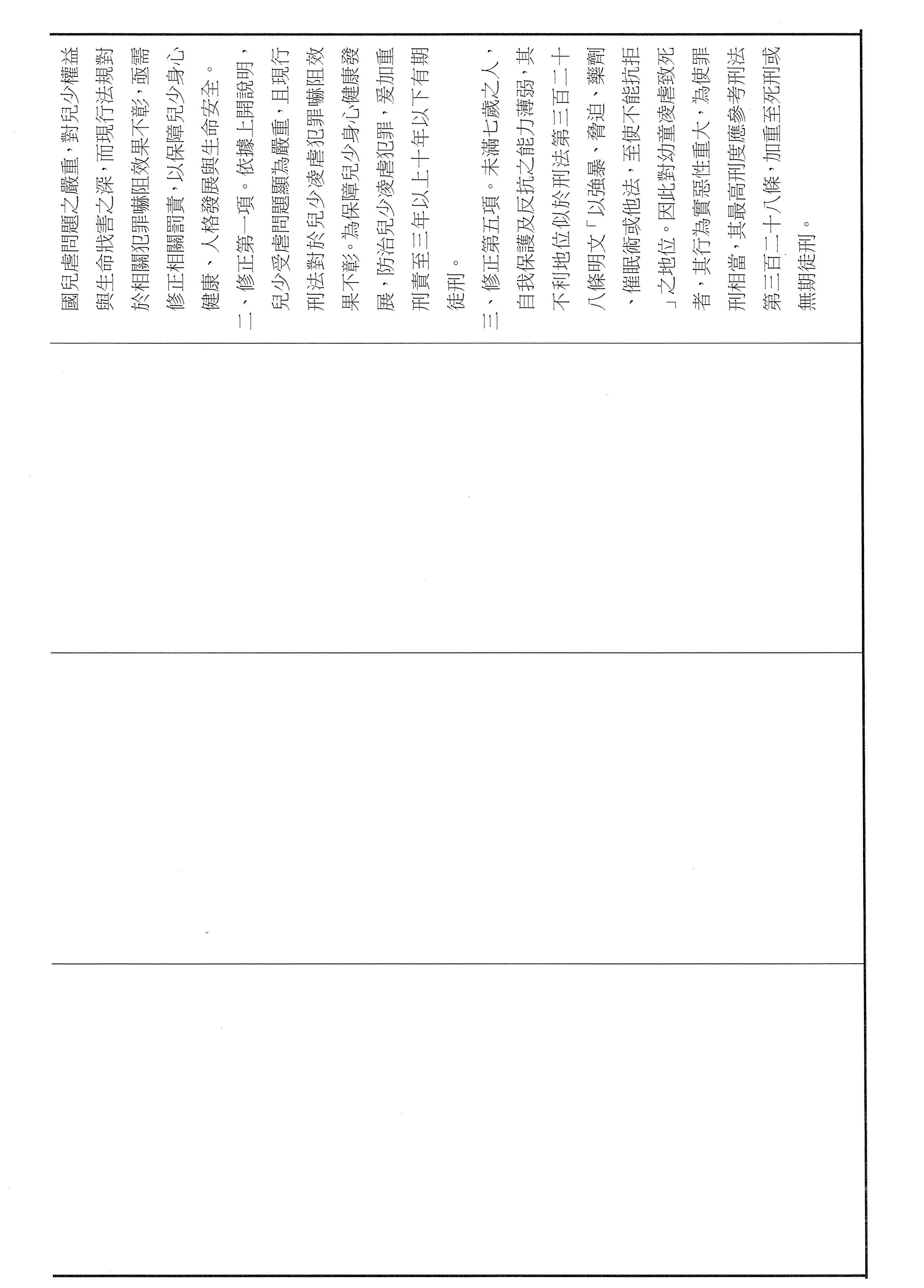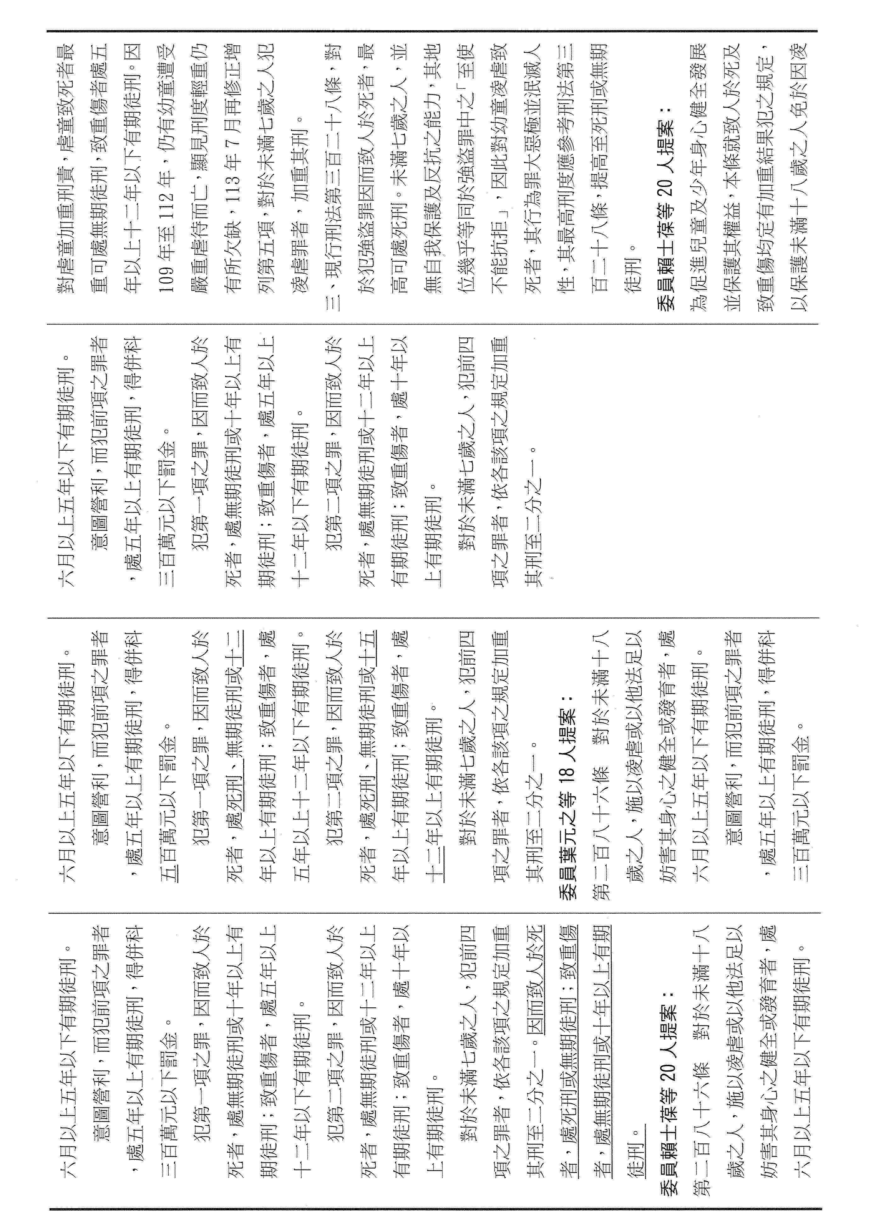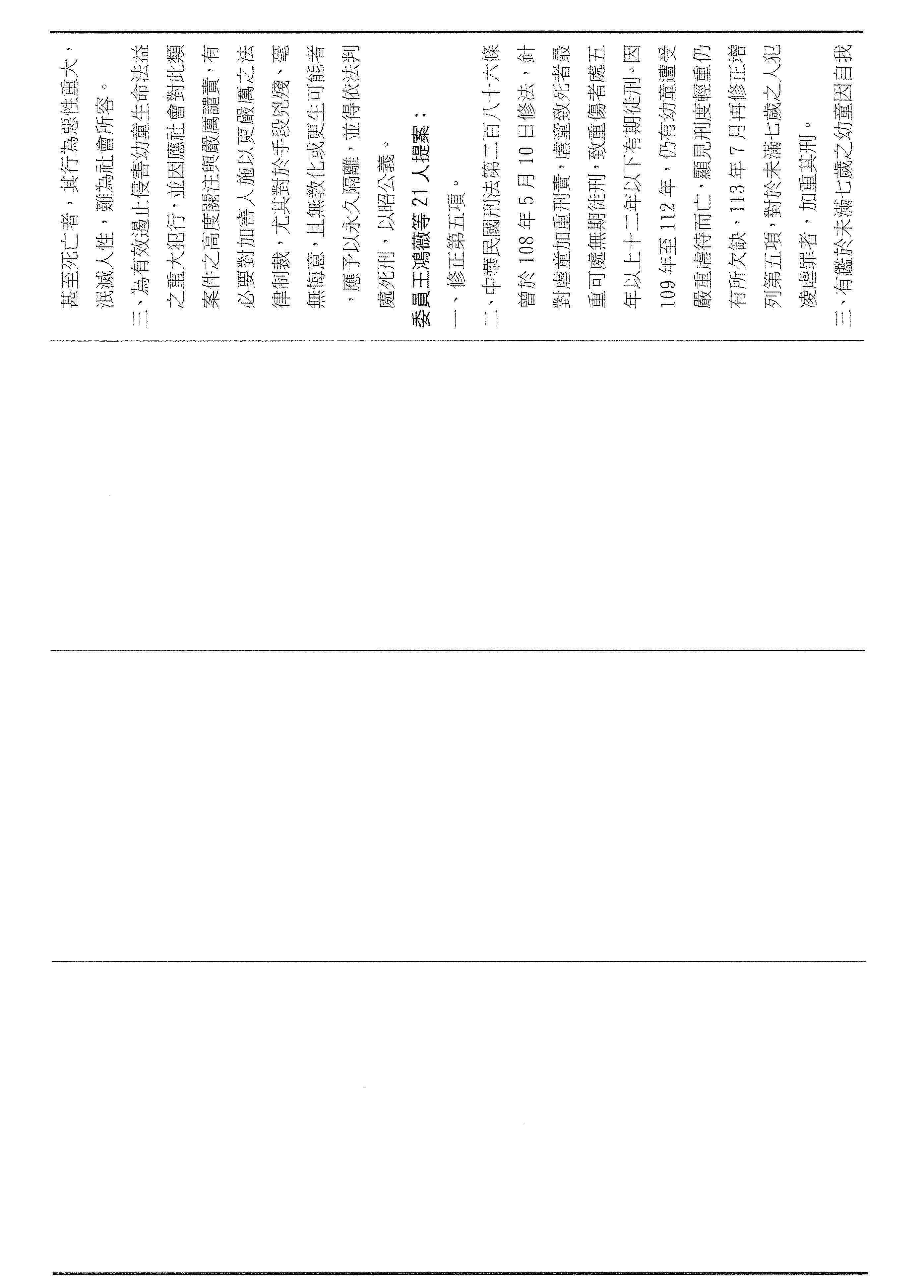 本席針對刑法第二百七十一條及第二百八十六條提案,增訂加重處罰之規定,對於未滿7歲之人,若以凌虐方式致死,處以死刑或無期徒刑,處以無期徒刑者,明文不得假釋,並同步提高對於未滿18歲兒少虐待之基本刑責,致重傷、致死結果處罰之標準應符合比例原則,提升整體法律威嚇力。我們這次所修正的條文除參考聯合國兒童權利公約及公民與政治權利國際公約的精神外,更充分體現我國政府對於保障兒童生命權、身心發展與人性尊嚴之責任,希望透過此次修法建立社會對於兒虐零容忍之共識,並有效遏止不法,使每一位孩子皆能在安全與尊重中成長茁壯。敬請各位委員支持本修正提案,儘速完成立法程序,落實大家對兒童權益的保障,謝謝。