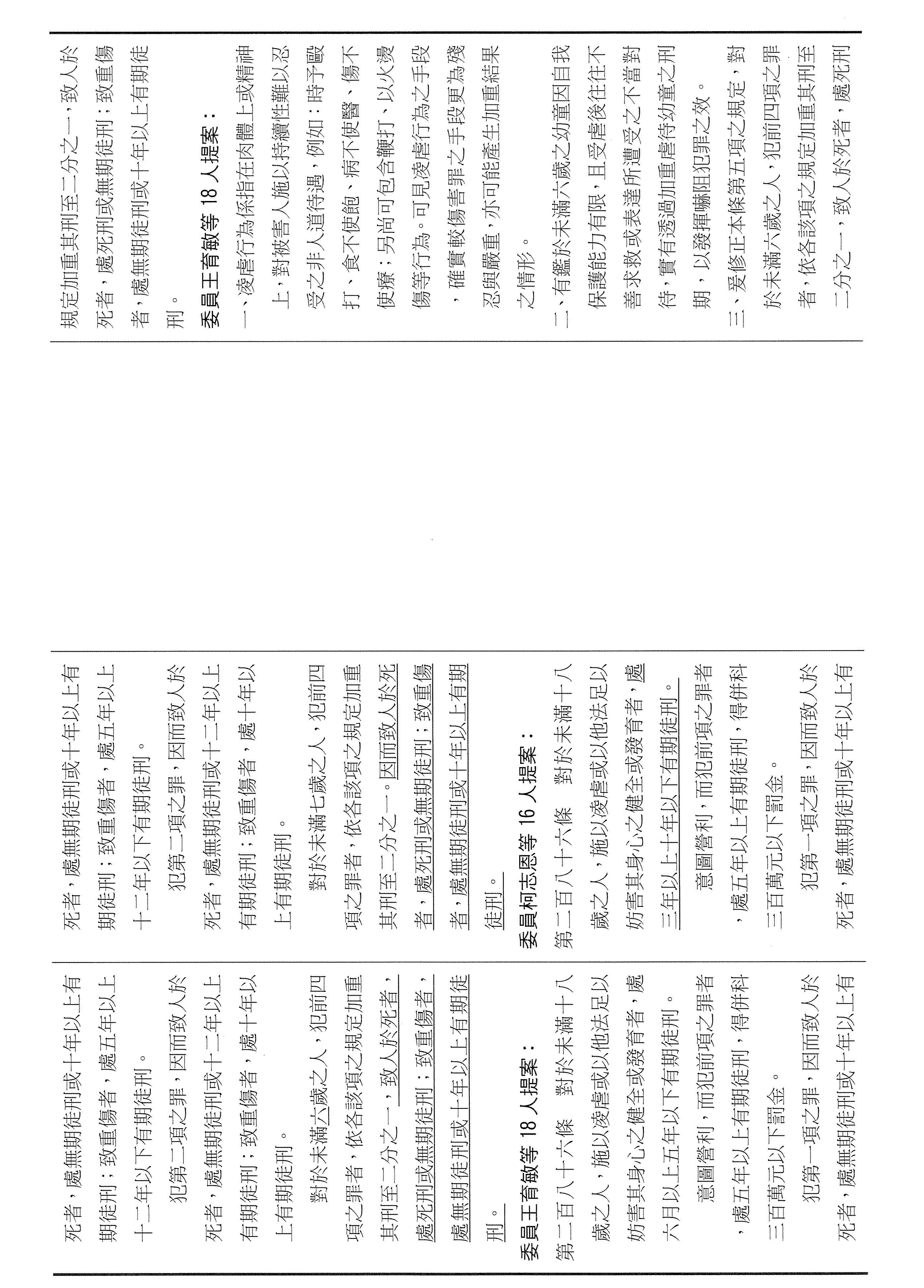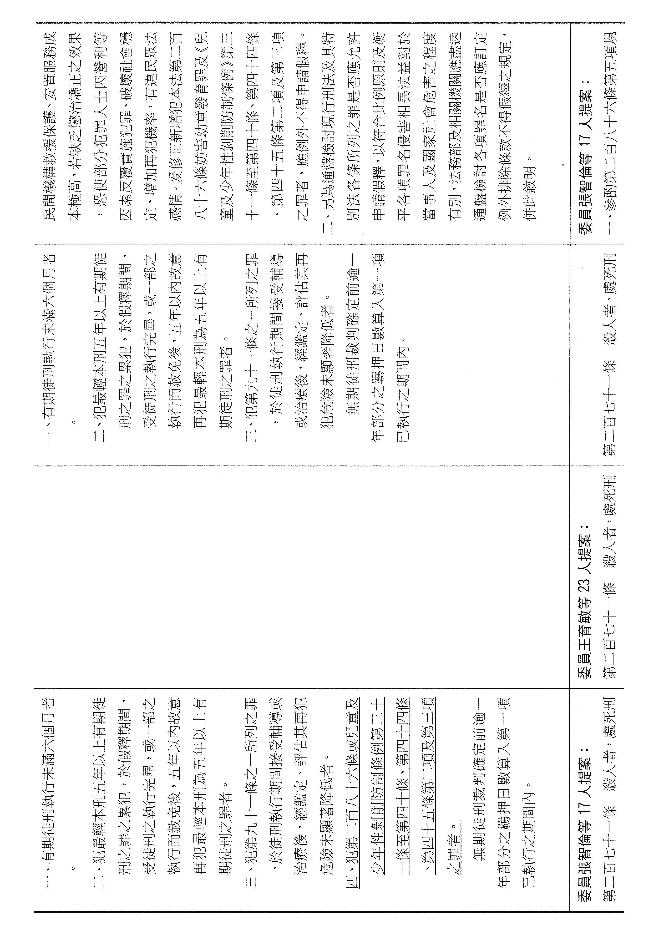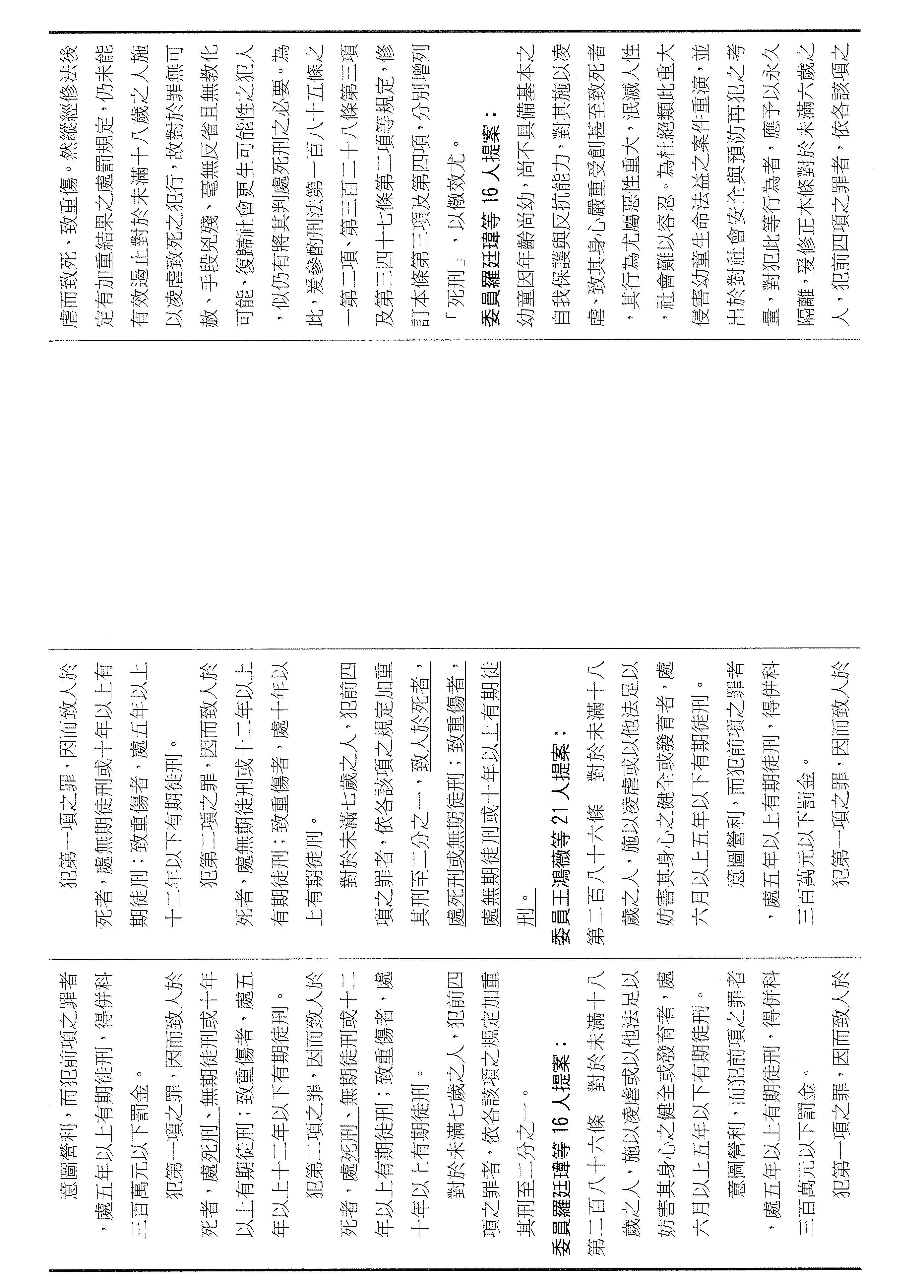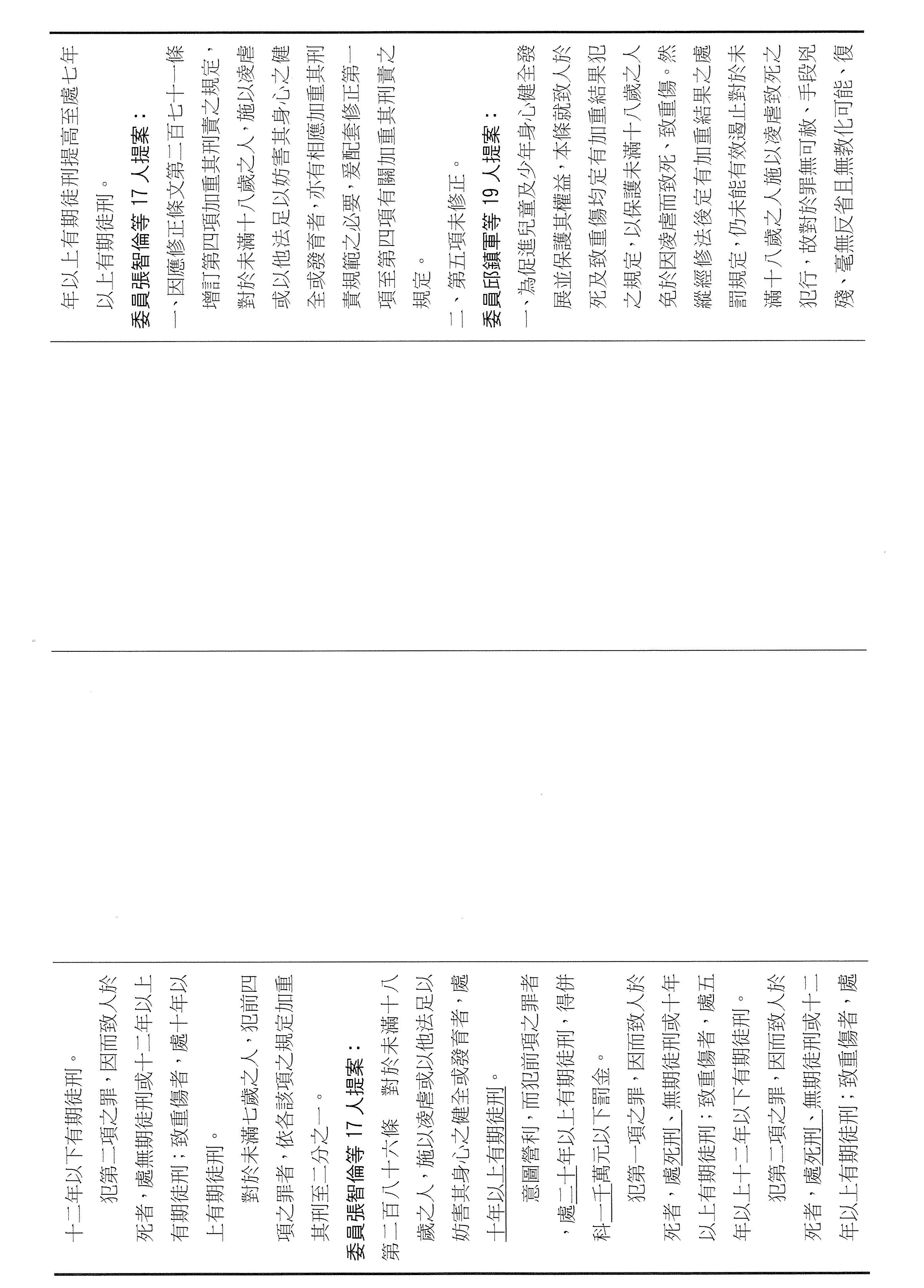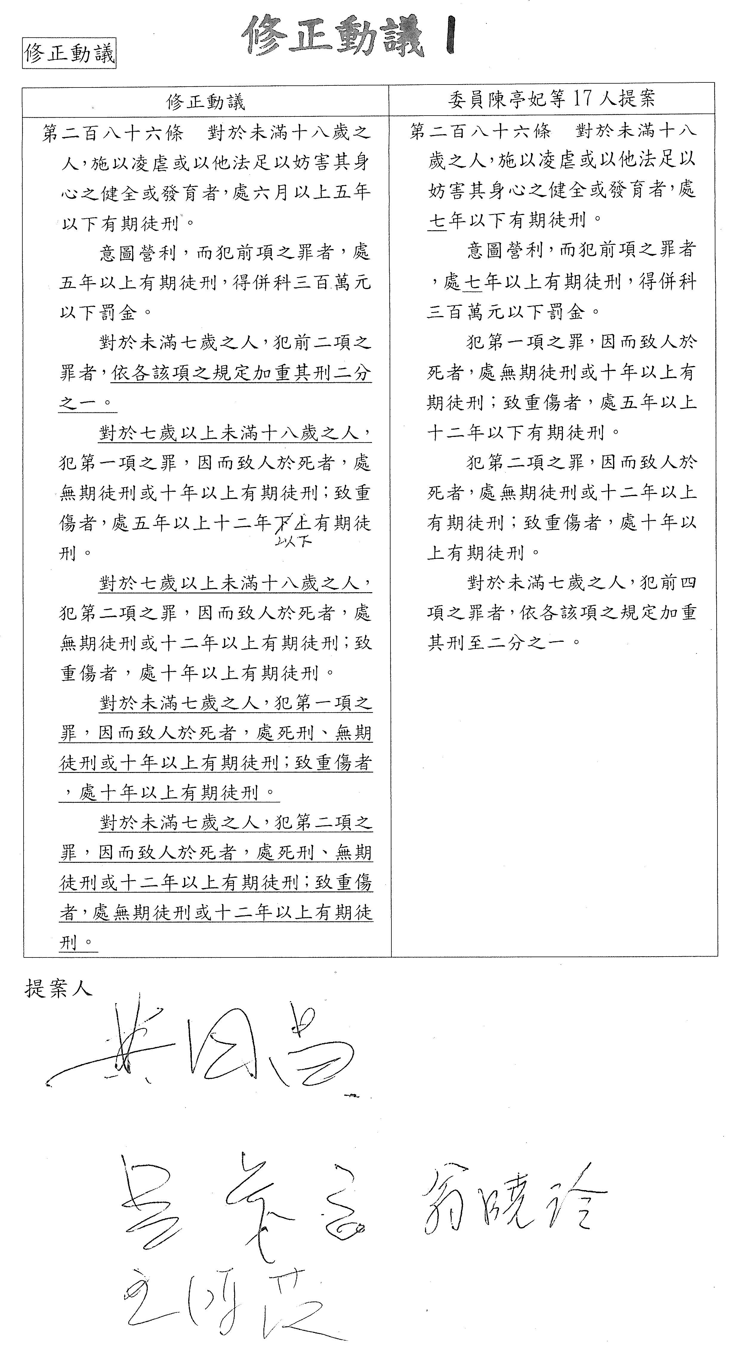 王委員育敏:我提出來的第二百七十一條主要是因為之前修第二百八十六條,法務部也一直反對,所以我們就想直接在第二百七十一條直接殺人罪這邊可以再增加,就是凌虐兒童致死,一樣最高可以到死刑。剛剛法務部有說明他們要再另立一個法條,剛剛部長回答我的時候是說他們要再另立一個新增的法條,我的原則是無論定在第二百八十六條或第二百七十一條,或者是法務部要另立一個新的法條,我就是希望朝野大家共同支持,如果是凌虐兒童致死,最高可以到死刑,這個大家有共識可以往前進,修在哪一條,我都可以接受,以上,謝謝。