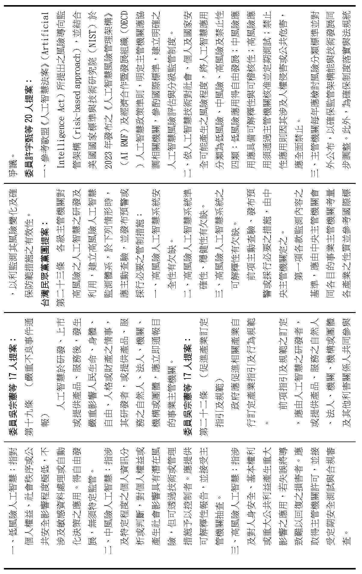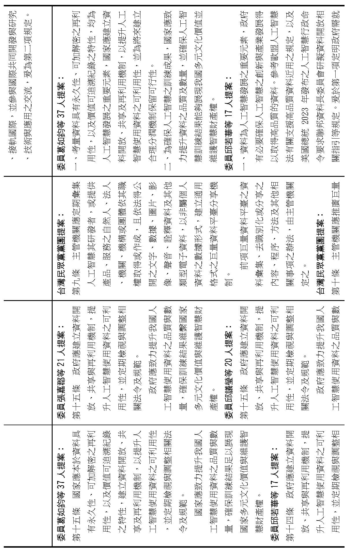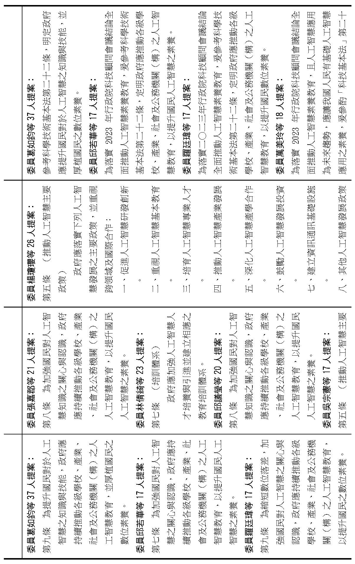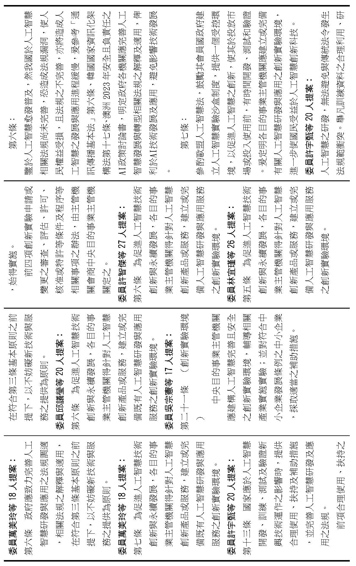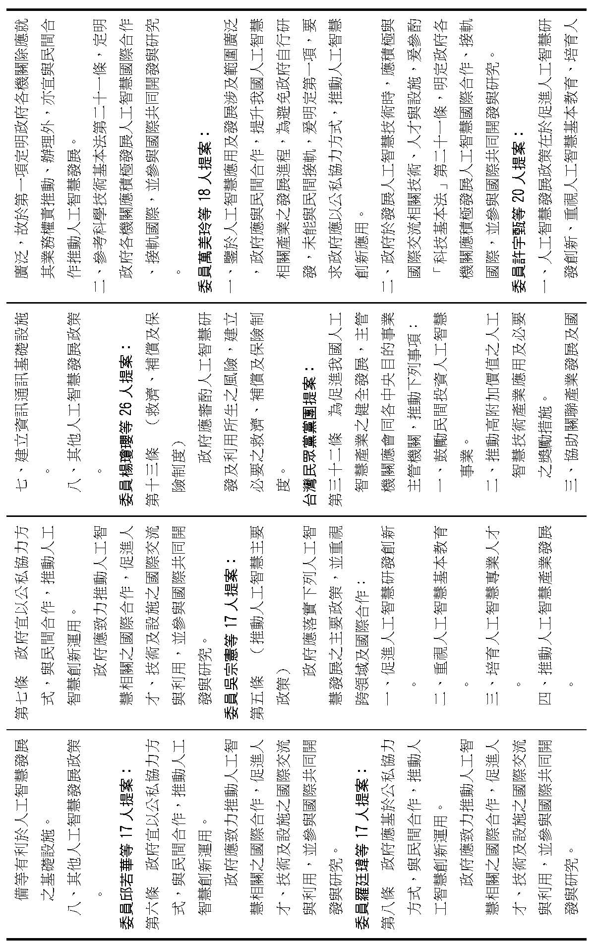 今天的議程是繼續審查人工智慧基本法草案相關草案,包括委員葛如鈞等37人、委員邱若華等17人、委員羅廷瑋等17人、委員萬美玲等18人、委員許宇甄等20人、委員張嘉郡等21人、委員林倩綺等21人擬具人工智慧基本法草案,同時審查人工智慧基本法草案相關草案,包括委員邱議瑩等20人、委員吳宗憲等17人、委員賴士葆等28人、委員楊瓊瓔等26人、委員許智傑等27人、委員林宜瑾等26人擬具人工智慧基本法草案,台灣民眾黨黨團擬具的是人工智慧發展及管理條例草案一案。