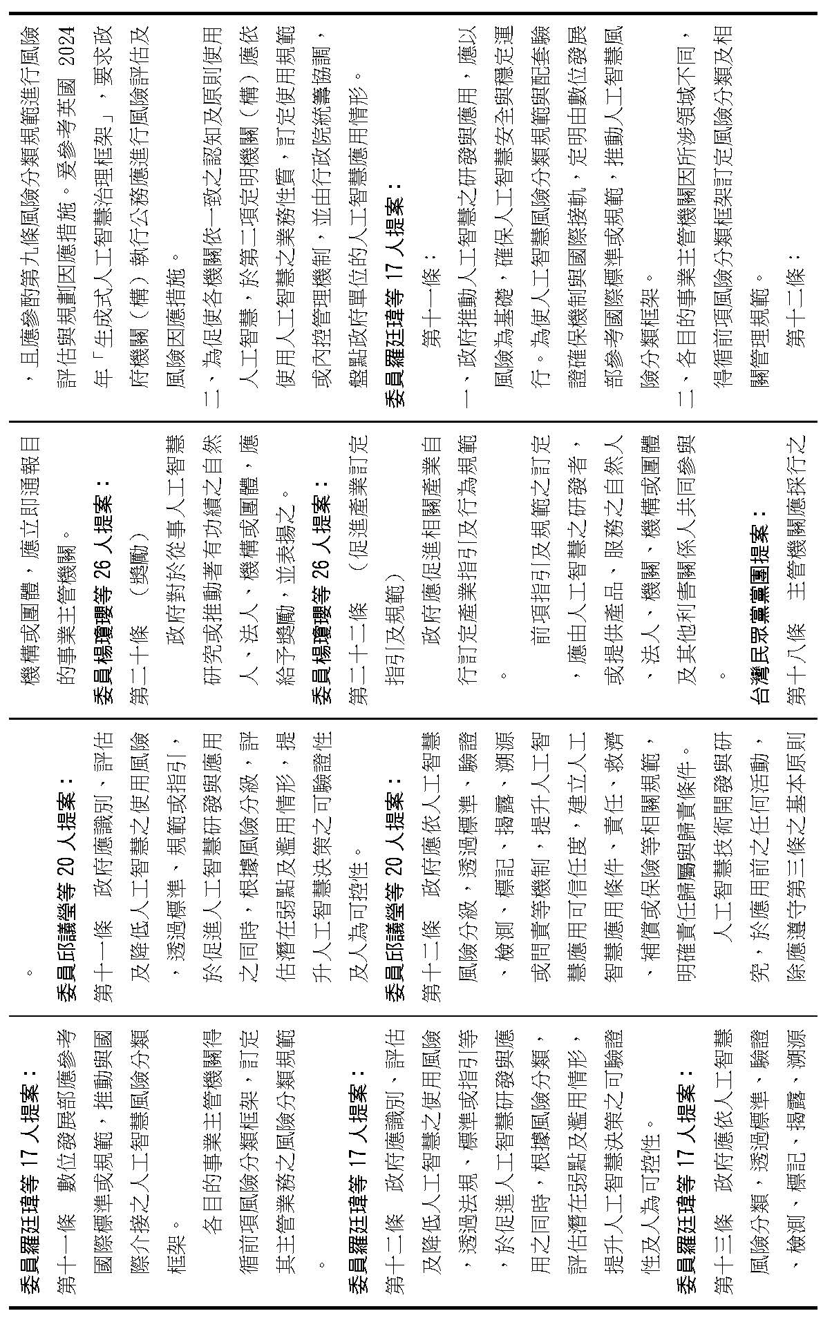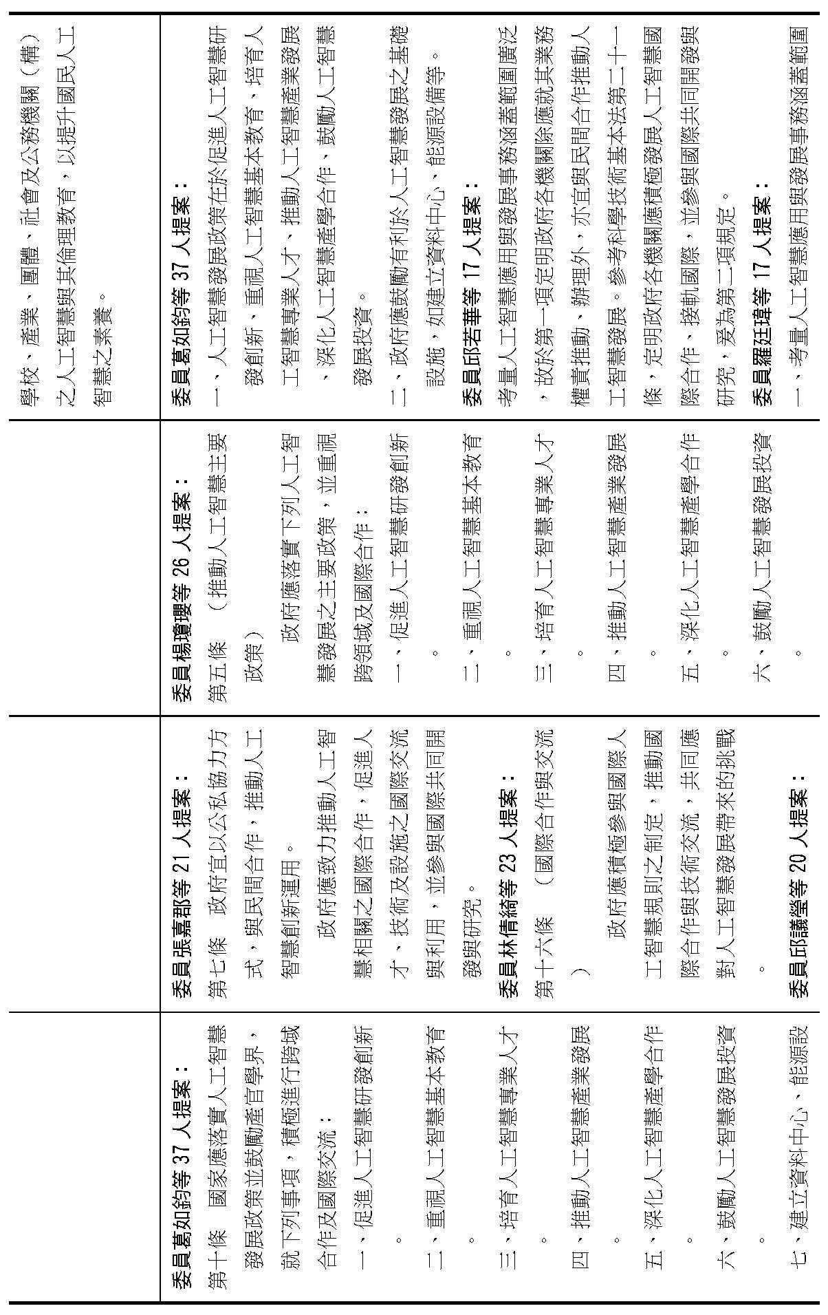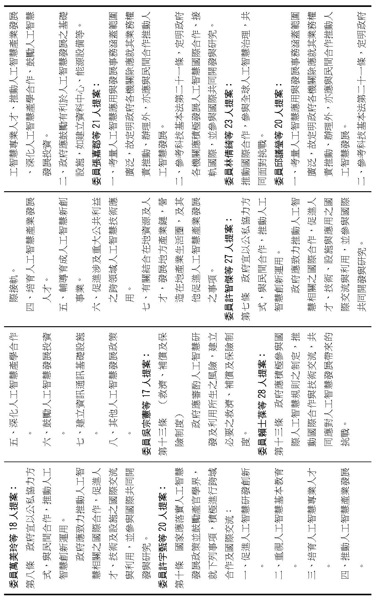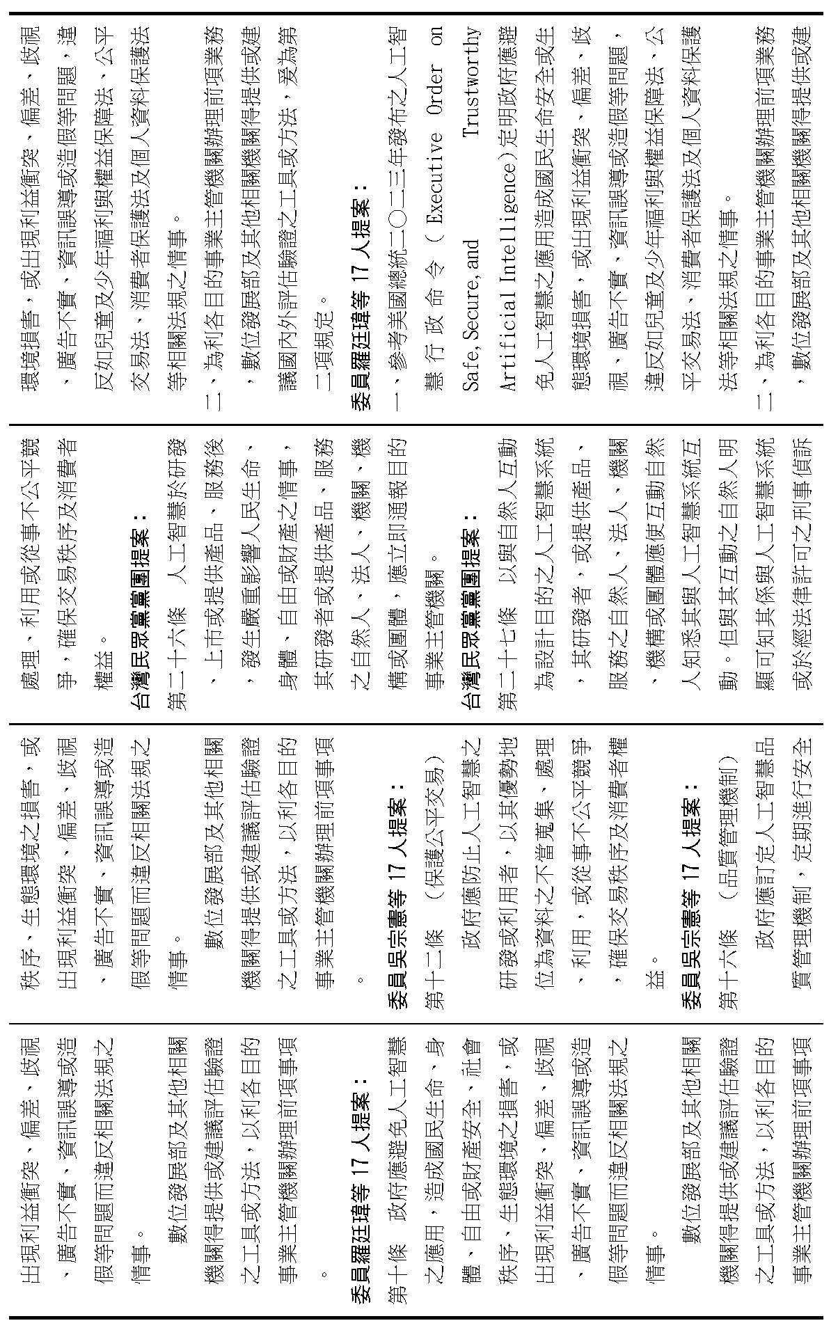 今天的議程是繼續審查人工智慧基本法草案相關草案,包括委員葛如鈞等37人、委員邱若華等17人、委員羅廷瑋等17人、委員萬美玲等18人、委員許宇甄等20人、委員張嘉郡等21人、委員林倩綺等21人擬具人工智慧基本法草案,同時審查人工智慧基本法草案相關草案,包括委員邱議瑩等20人、委員吳宗憲等17人、委員賴士葆等28人、委員楊瓊瓔等26人、委員許智傑等27人、委員林宜瑾等26人擬具人工智慧基本法草案,台灣民眾黨黨團擬具的是人工智慧發展及管理條例草案一案。