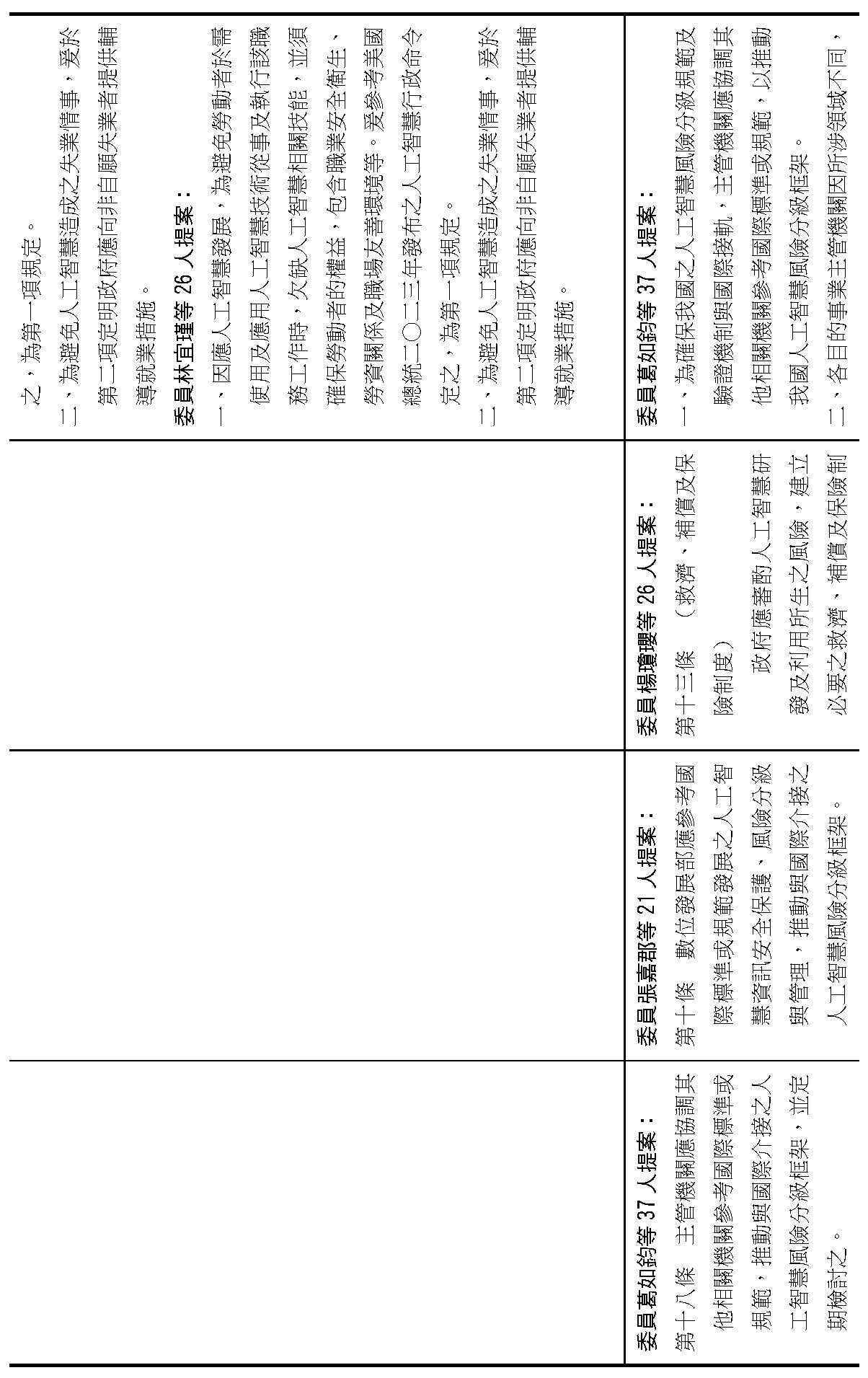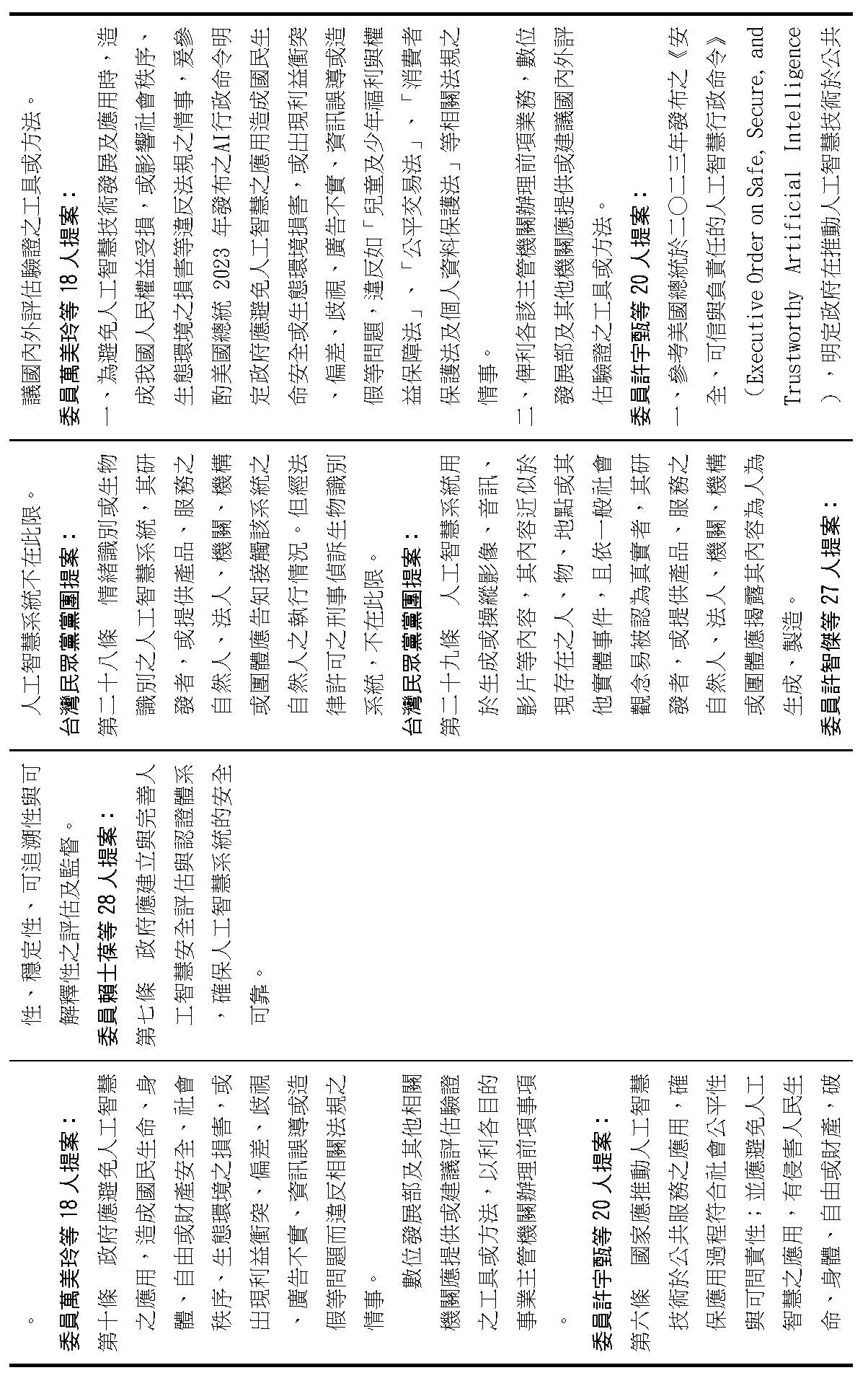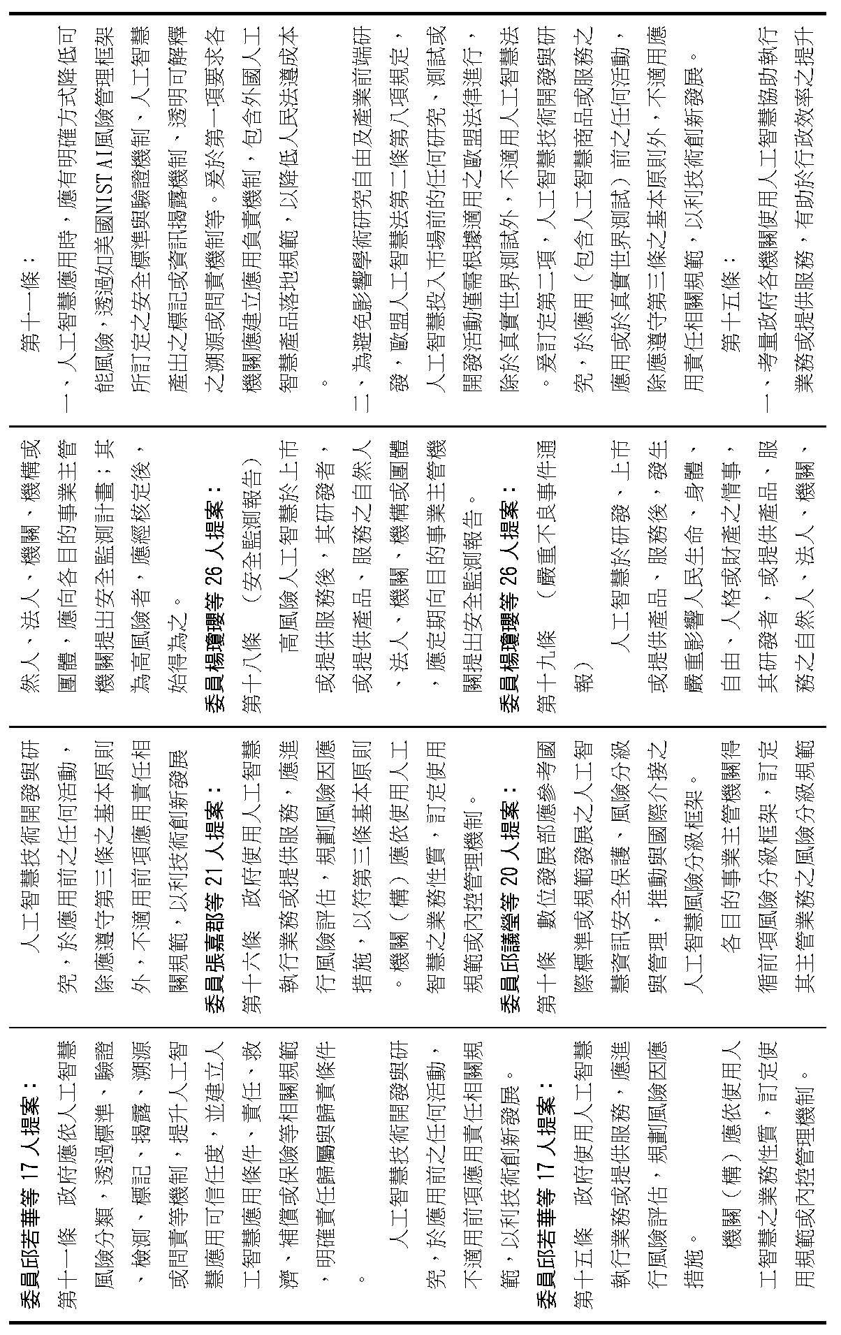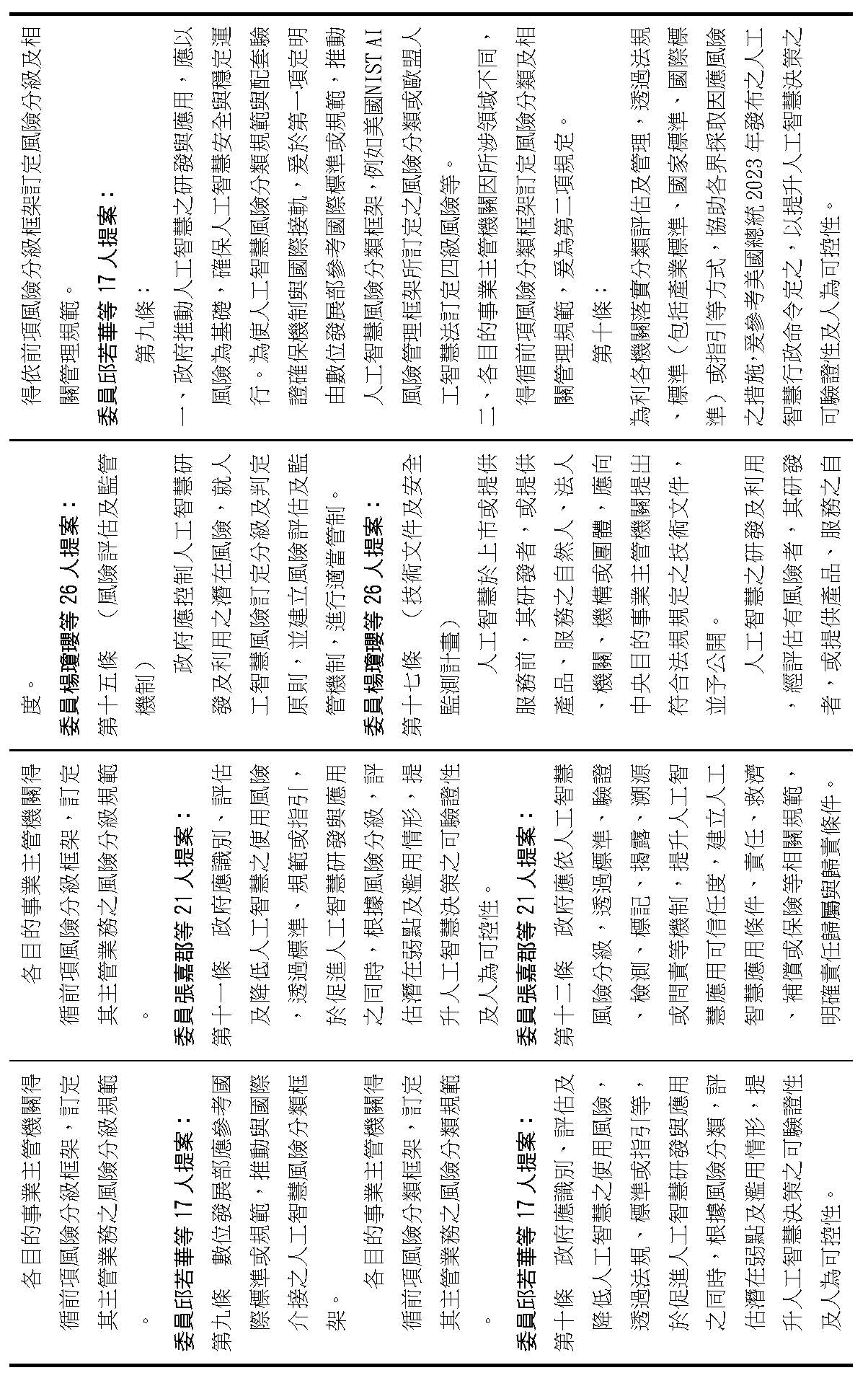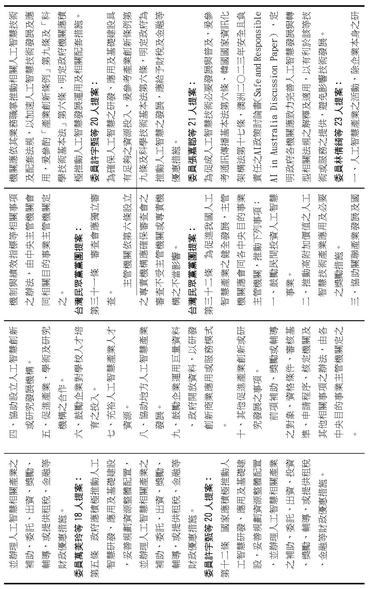 今天的議程是繼續審查人工智慧基本法草案相關草案,包括委員葛如鈞等37人、委員邱若華等17人、委員羅廷瑋等17人、委員萬美玲等18人、委員許宇甄等20人、委員張嘉郡等21人、委員林倩綺等21人擬具人工智慧基本法草案,同時審查人工智慧基本法草案相關草案,包括委員邱議瑩等20人、委員吳宗憲等17人、委員賴士葆等28人、委員楊瓊瓔等26人、委員許智傑等27人、委員林宜瑾等26人擬具人工智慧基本法草案,台灣民眾黨黨團擬具的是人工智慧發展及管理條例草案一案。