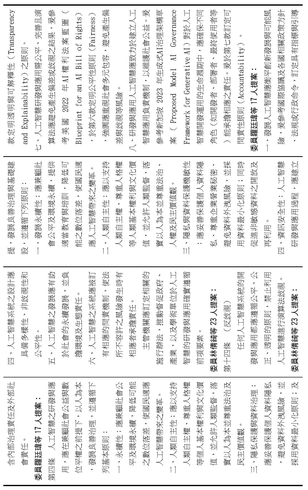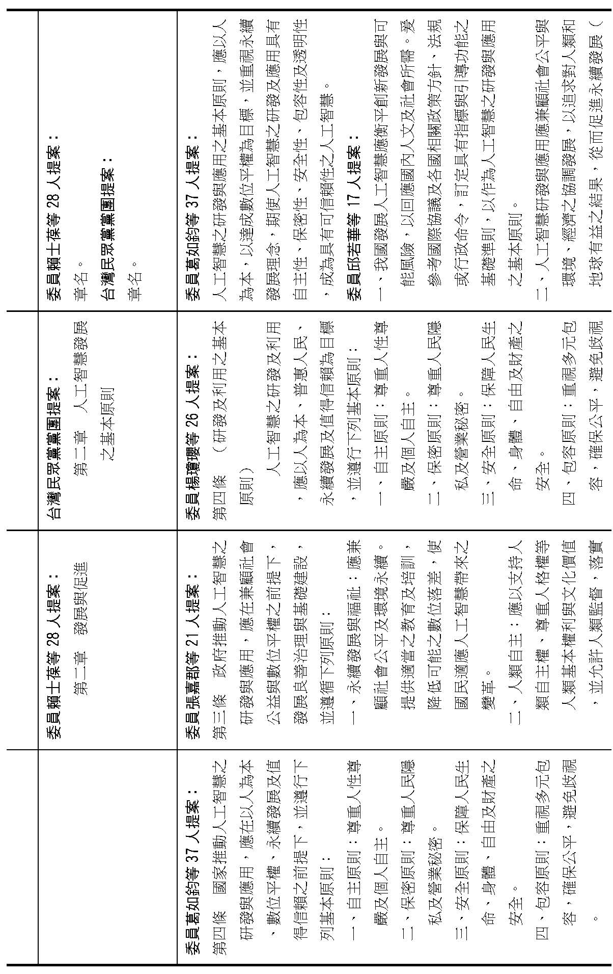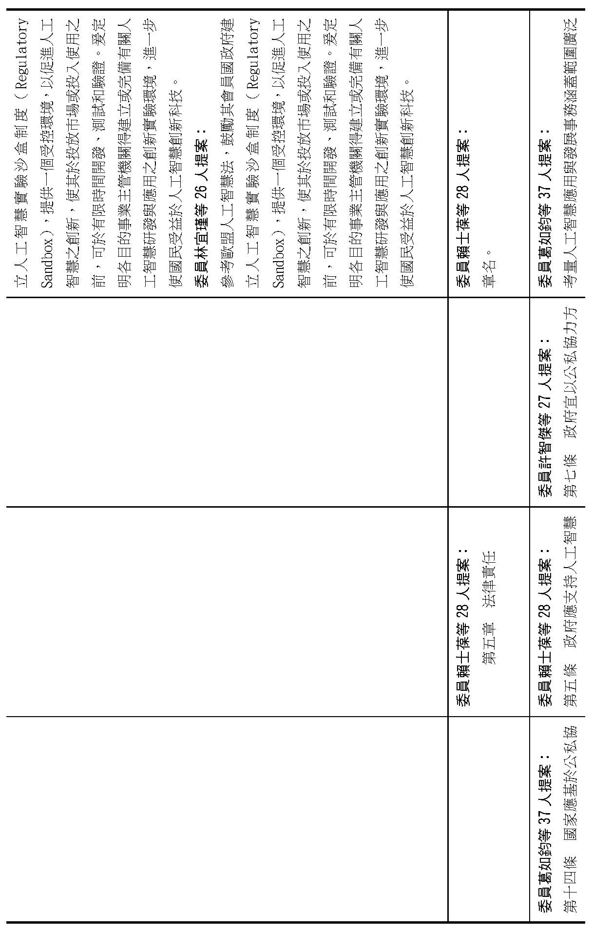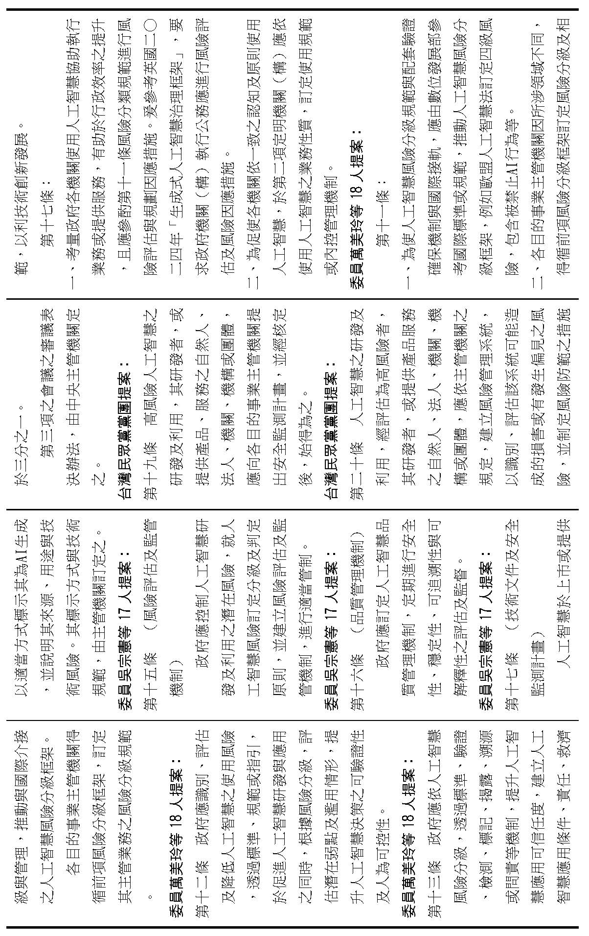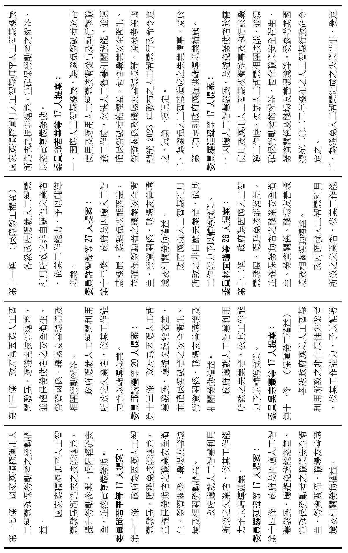 今天的議程是繼續審查人工智慧基本法草案相關草案,包括委員葛如鈞等37人、委員邱若華等17人、委員羅廷瑋等17人、委員萬美玲等18人、委員許宇甄等20人、委員張嘉郡等21人、委員林倩綺等21人擬具人工智慧基本法草案,同時審查人工智慧基本法草案相關草案,包括委員邱議瑩等20人、委員吳宗憲等17人、委員賴士葆等28人、委員楊瓊瓔等26人、委員許智傑等27人、委員林宜瑾等26人擬具人工智慧基本法草案,台灣民眾黨黨團擬具的是人工智慧發展及管理條例草案一案。