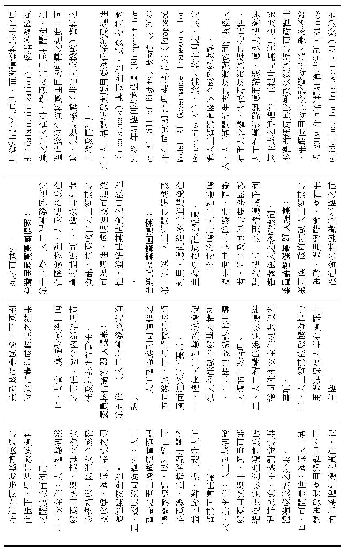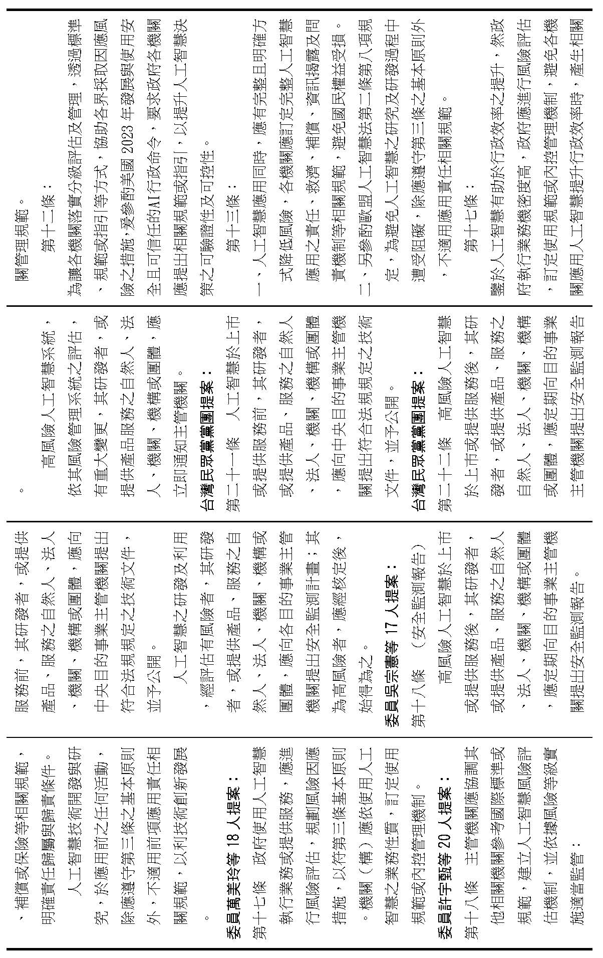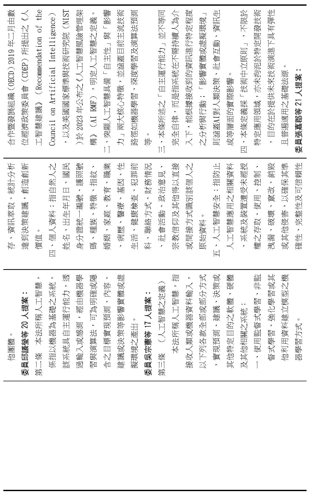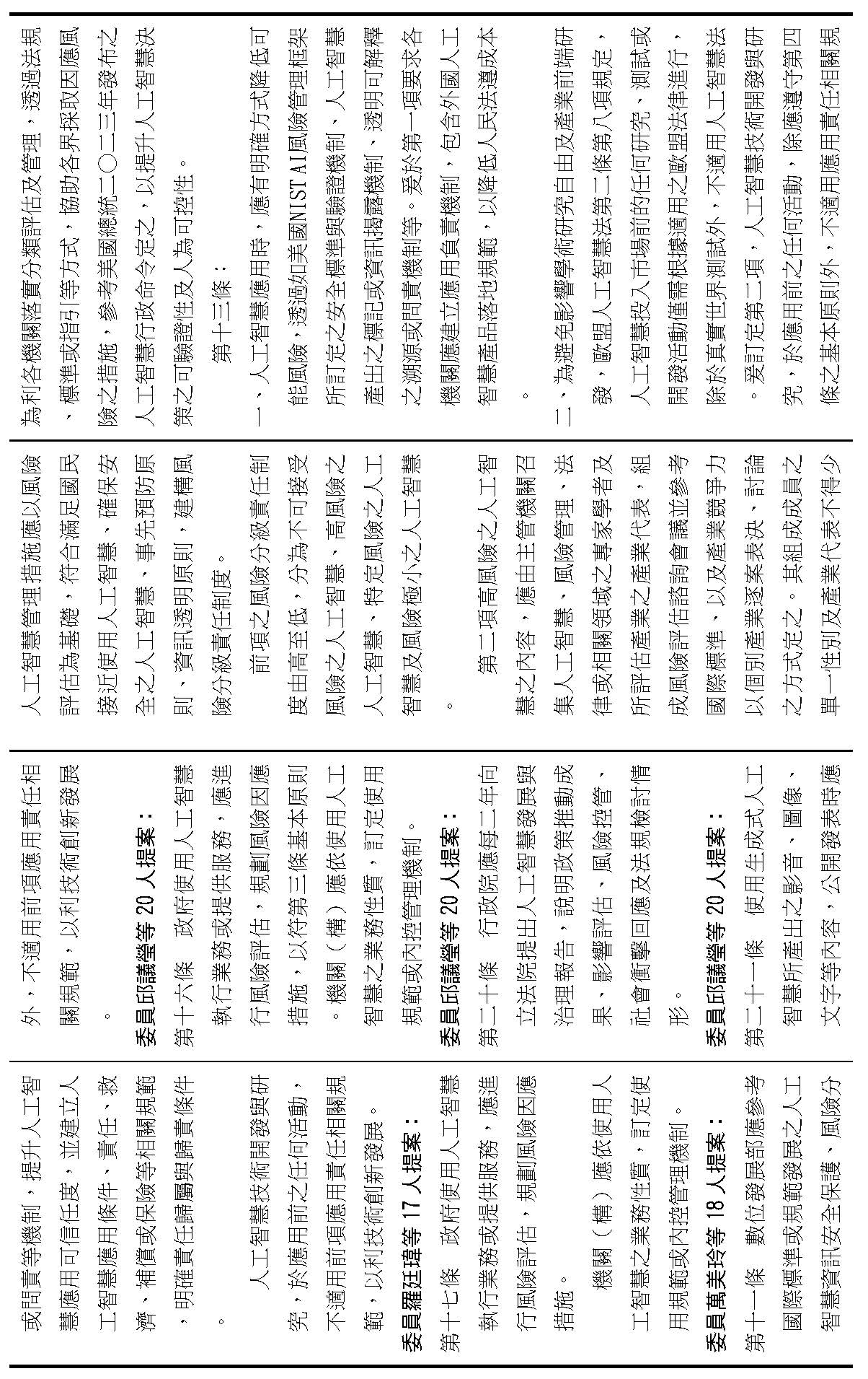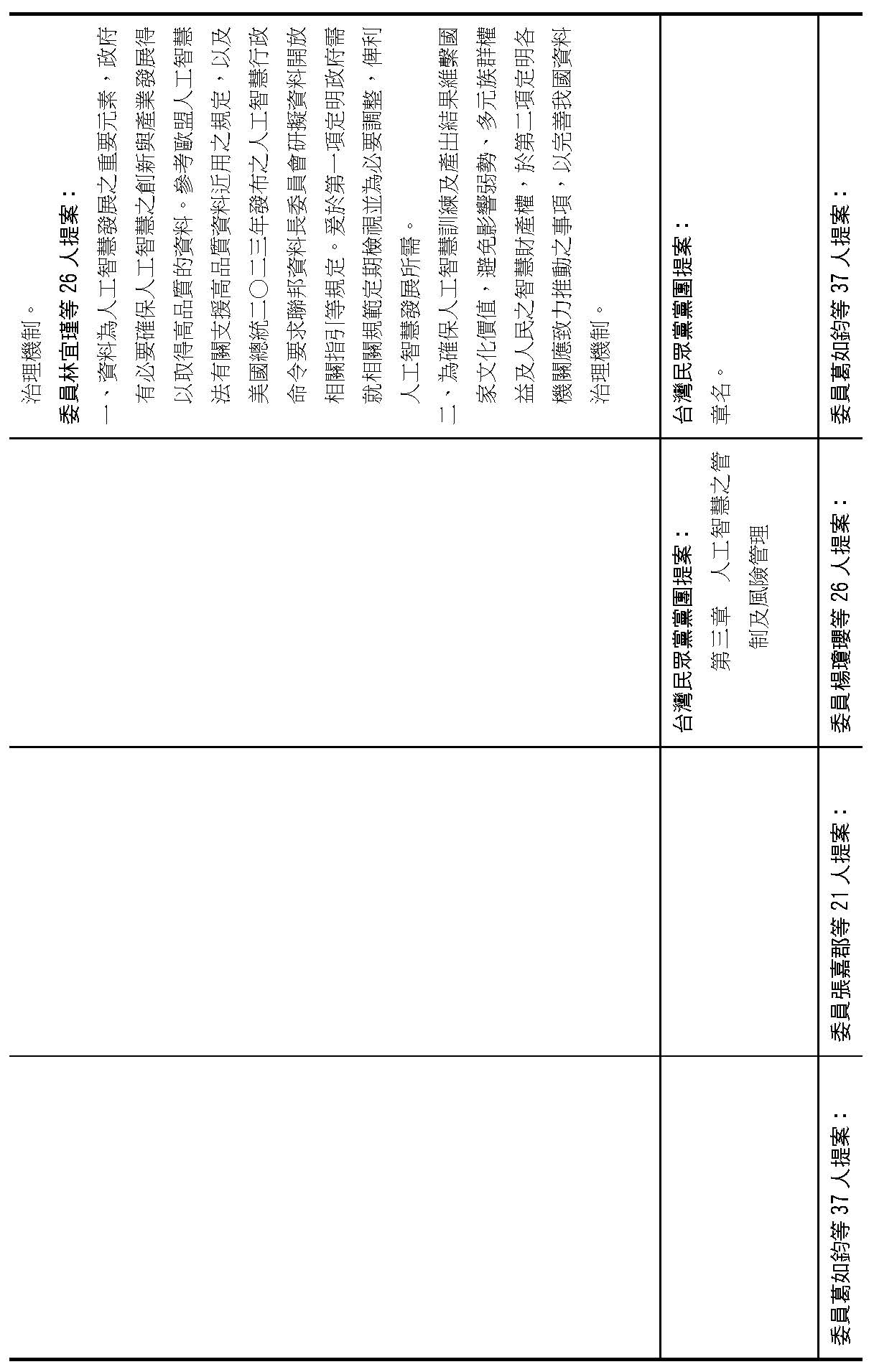 今天的議程是繼續審查人工智慧基本法草案相關草案,包括委員葛如鈞等37人、委員邱若華等17人、委員羅廷瑋等17人、委員萬美玲等18人、委員許宇甄等20人、委員張嘉郡等21人、委員林倩綺等21人擬具人工智慧基本法草案,同時審查人工智慧基本法草案相關草案,包括委員邱議瑩等20人、委員吳宗憲等17人、委員賴士葆等28人、委員楊瓊瓔等26人、委員許智傑等27人、委員林宜瑾等26人擬具人工智慧基本法草案,台灣民眾黨黨團擬具的是人工智慧發展及管理條例草案一案。