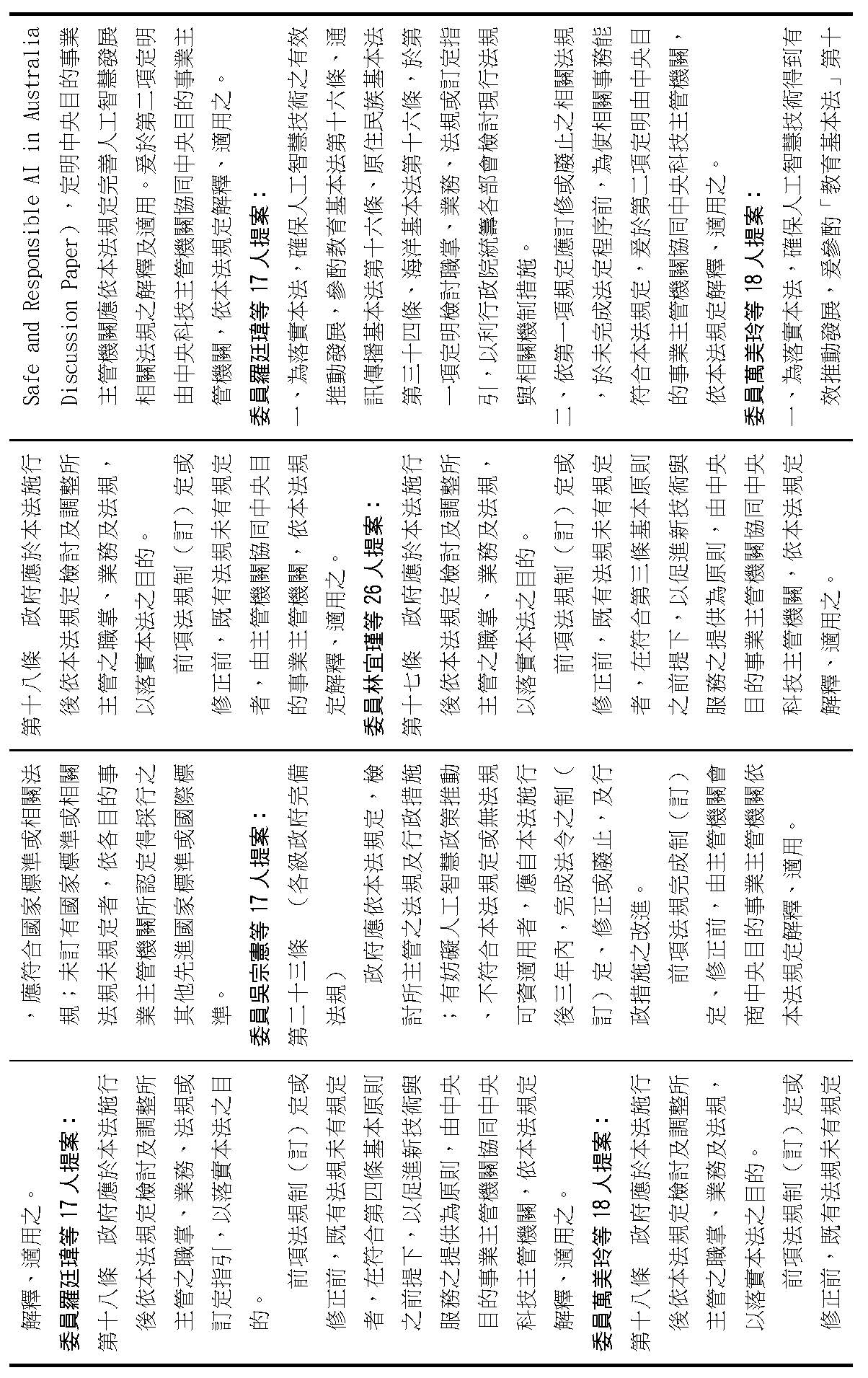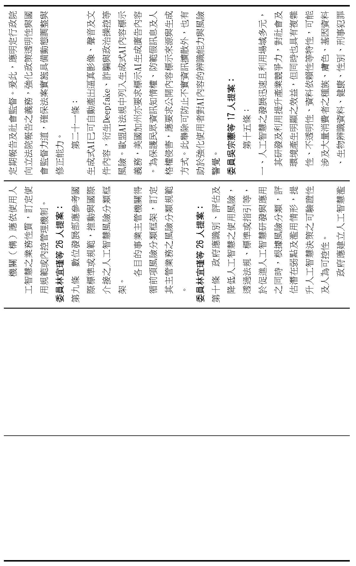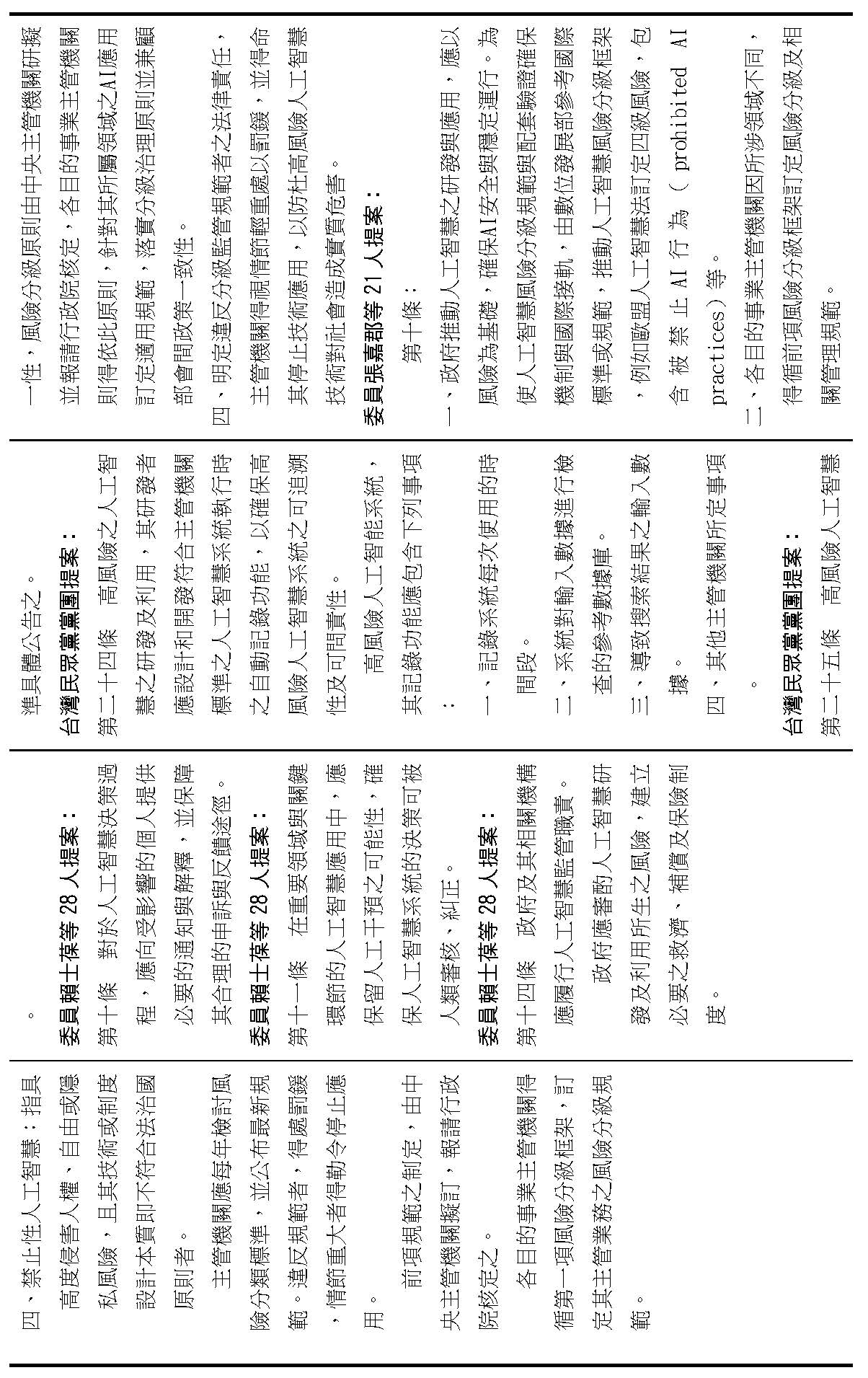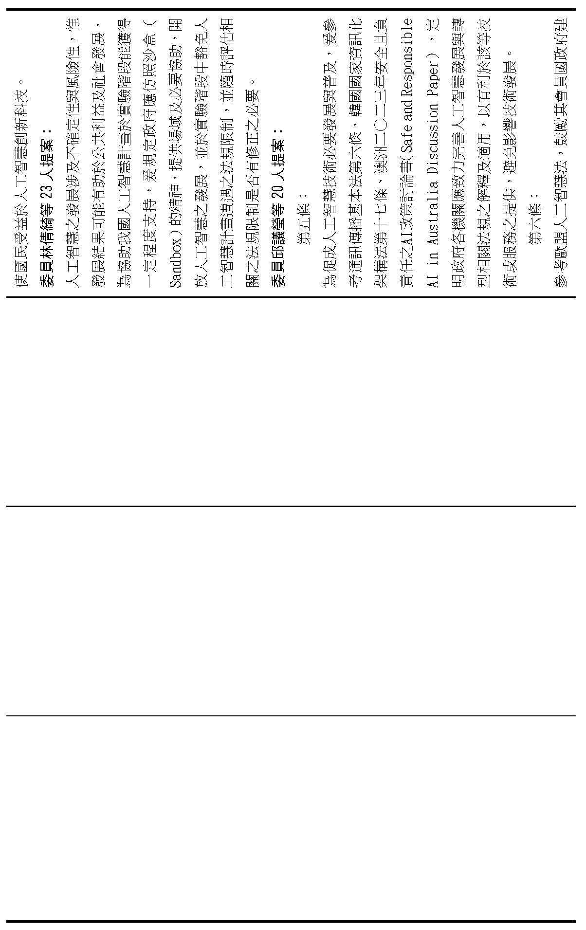 今天的議程是繼續審查人工智慧基本法草案相關草案,包括委員葛如鈞等37人、委員邱若華等17人、委員羅廷瑋等17人、委員萬美玲等18人、委員許宇甄等20人、委員張嘉郡等21人、委員林倩綺等21人擬具人工智慧基本法草案,同時審查人工智慧基本法草案相關草案,包括委員邱議瑩等20人、委員吳宗憲等17人、委員賴士葆等28人、委員楊瓊瓔等26人、委員許智傑等27人、委員林宜瑾等26人擬具人工智慧基本法草案,台灣民眾黨黨團擬具的是人工智慧發展及管理條例草案一案。