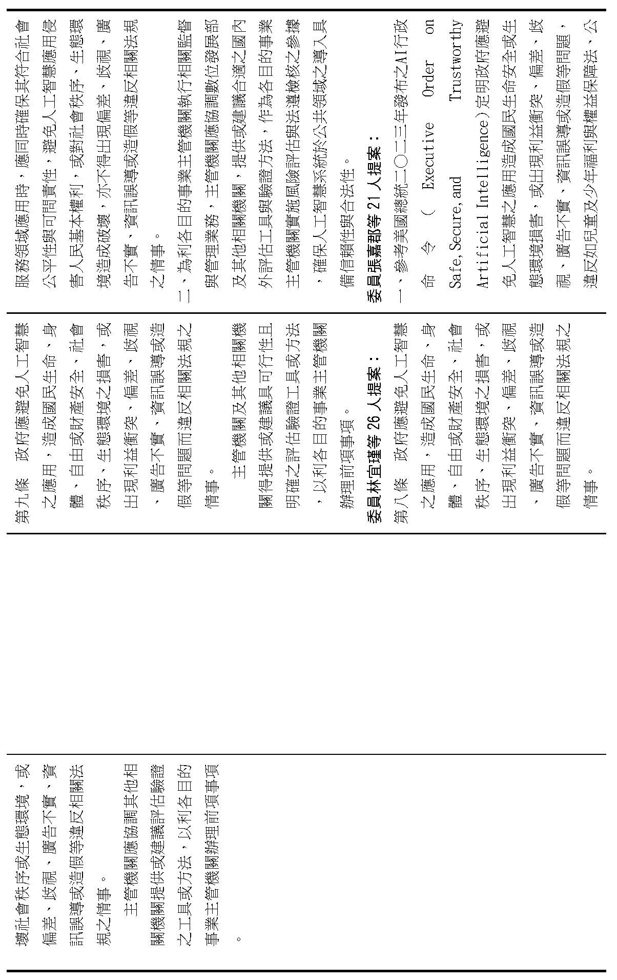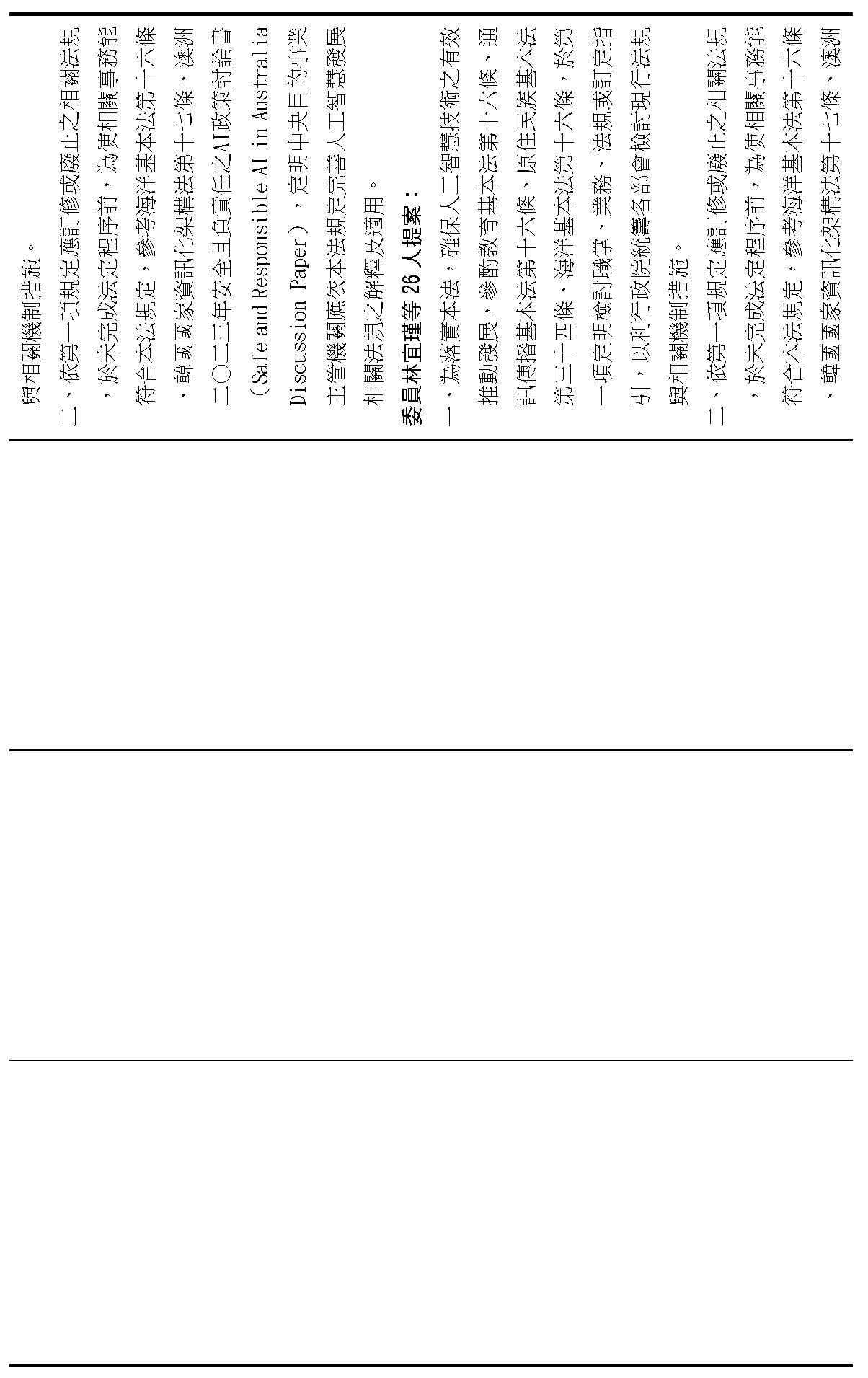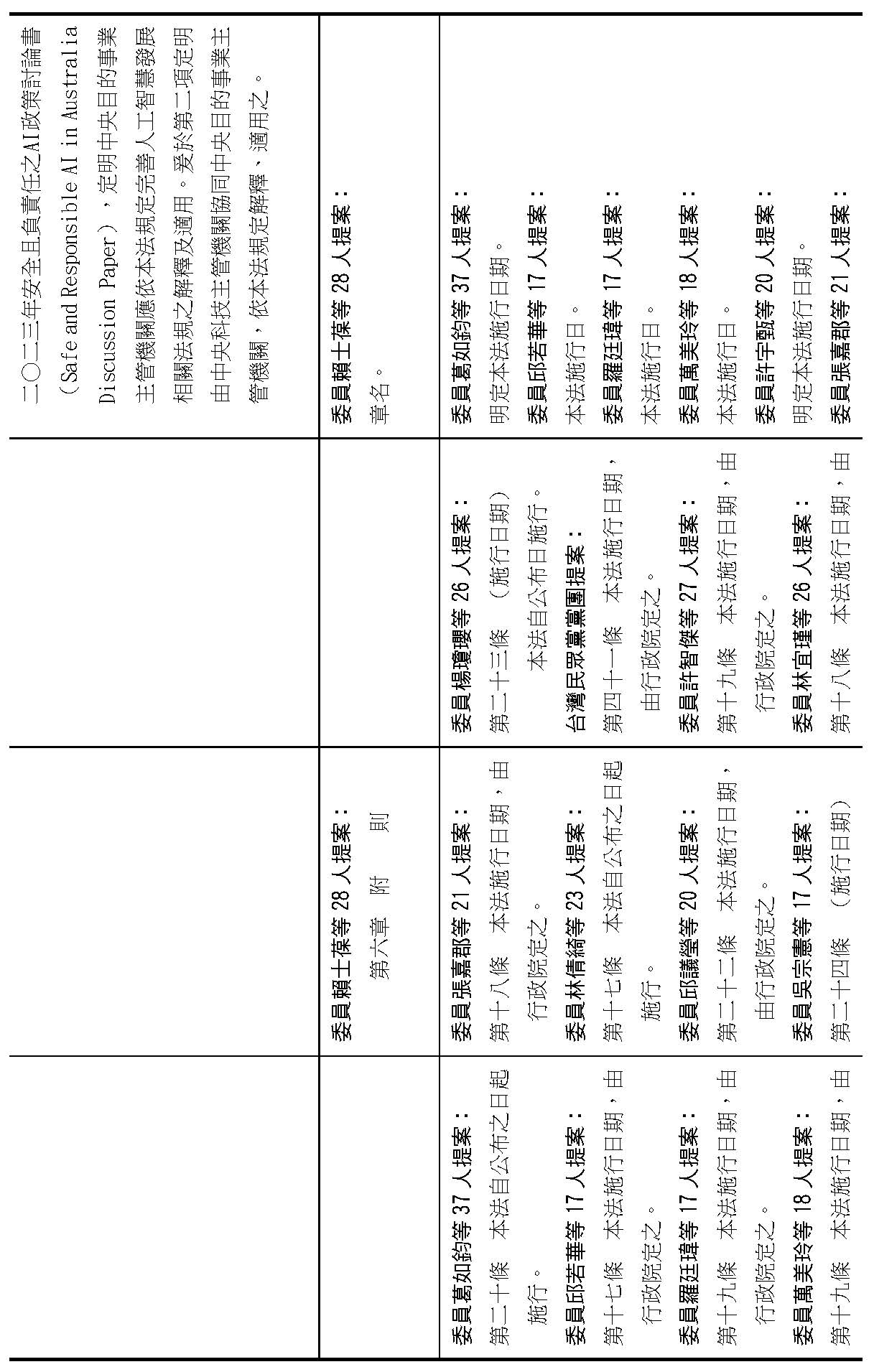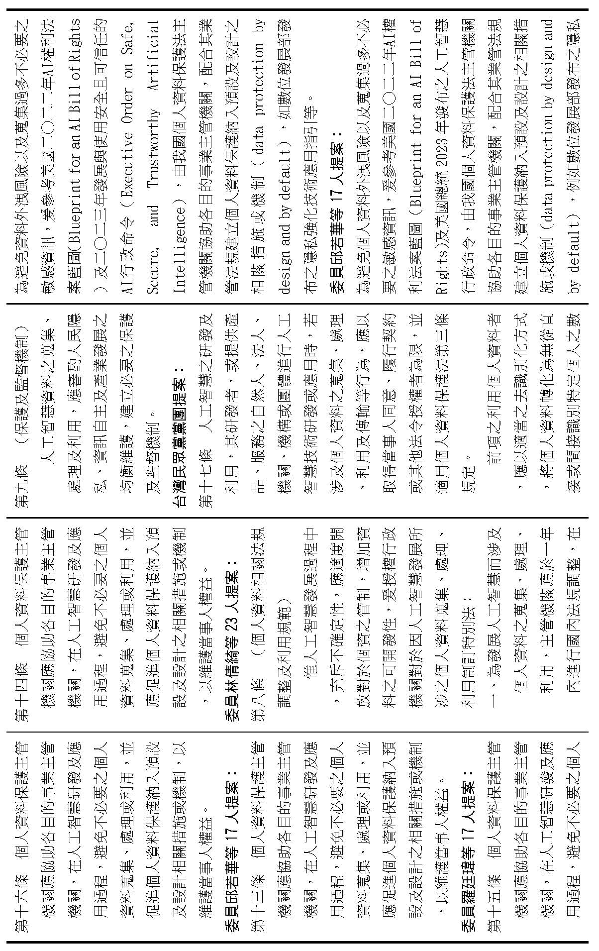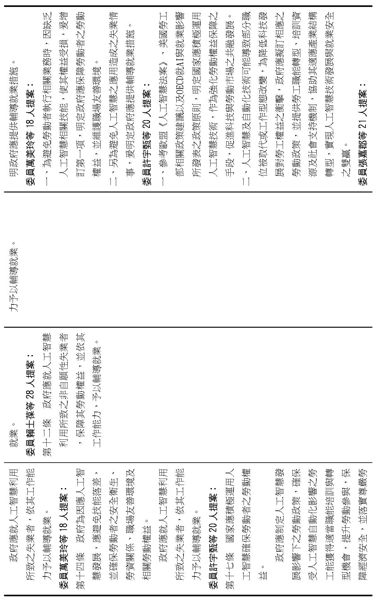 今天的議程是繼續審查人工智慧基本法草案相關草案,包括委員葛如鈞等37人、委員邱若華等17人、委員羅廷瑋等17人、委員萬美玲等18人、委員許宇甄等20人、委員張嘉郡等21人、委員林倩綺等21人擬具人工智慧基本法草案,同時審查人工智慧基本法草案相關草案,包括委員邱議瑩等20人、委員吳宗憲等17人、委員賴士葆等28人、委員楊瓊瓔等26人、委員許智傑等27人、委員林宜瑾等26人擬具人工智慧基本法草案,台灣民眾黨黨團擬具的是人工智慧發展及管理條例草案一案。