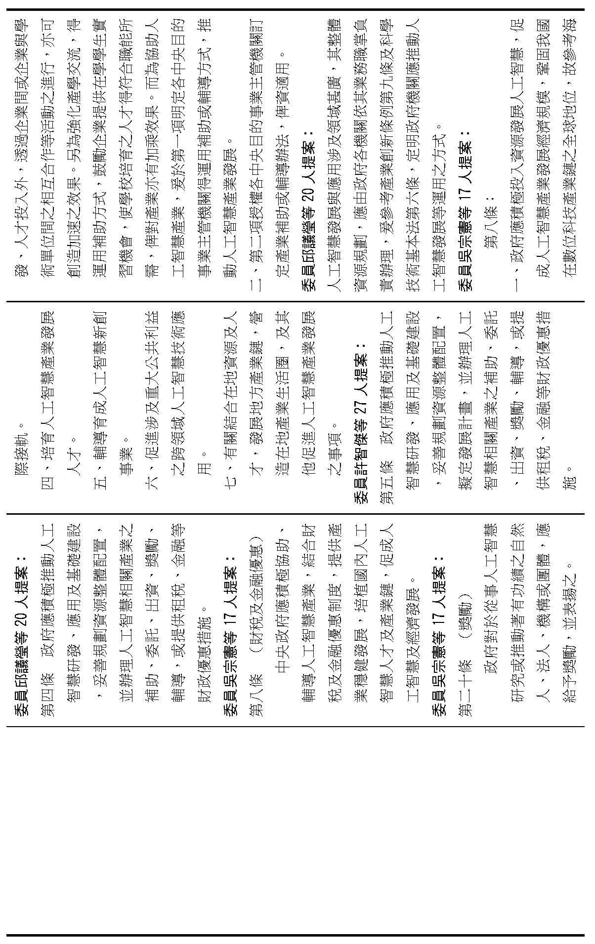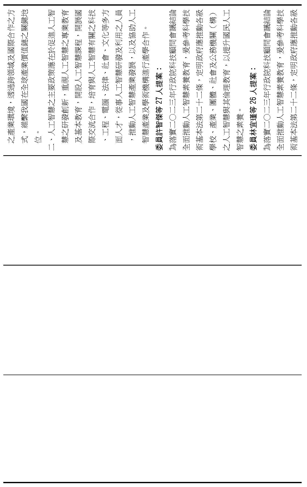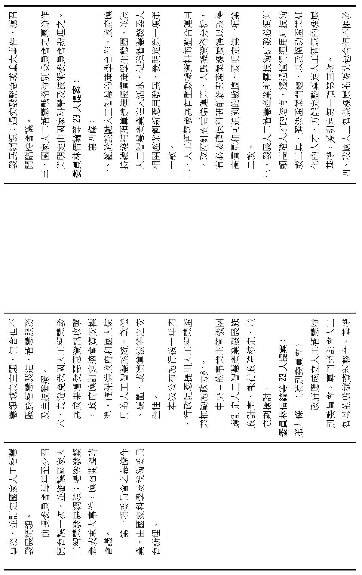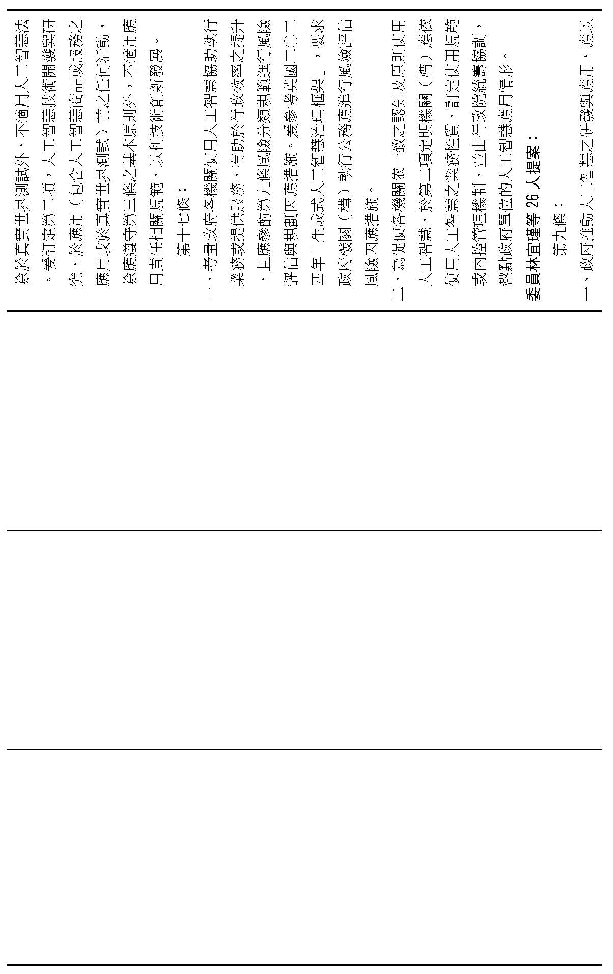 劉委員書彬:謝謝主席,關於人工智慧的相關法令的確已經是……我雖然大概3月才進來,但是我已經看到至少有公聽會和其他的相關會議,連交通委員會都已經審查了很多次,因此我也覺得也許不用再大體討論,但是可以先請主管機關來說明為什麼沒有提出院版,但是我們知道國科會有它的部版出來,把這個原因、流程還有院的態度講清楚,我們就可以進入逐條討論,不然的話,因為人工智慧各界都已經在如火如荼的運用當中,可是卻沒有一個法去規範,的確會使我們立法院陷入怠惰立法的狀況。