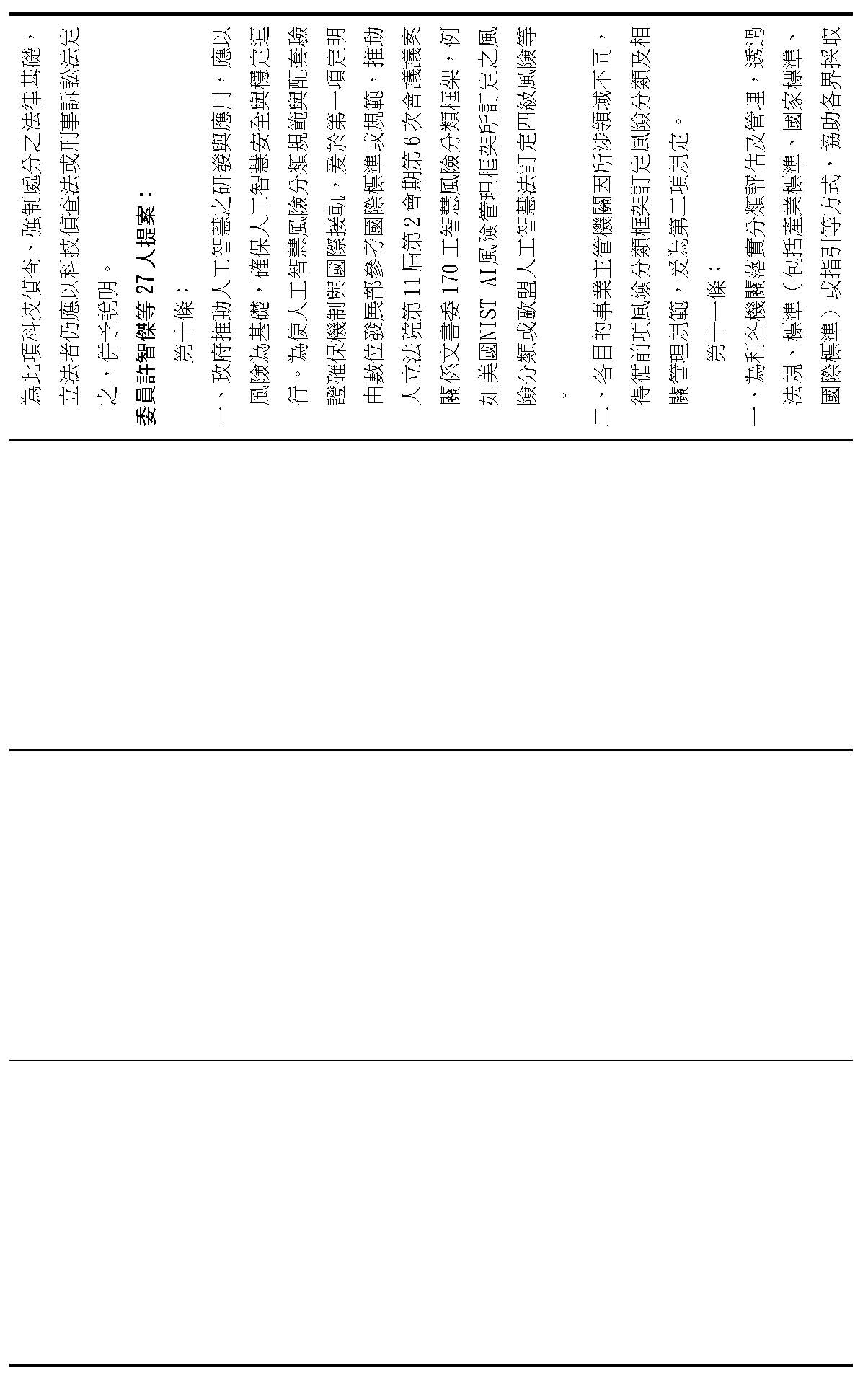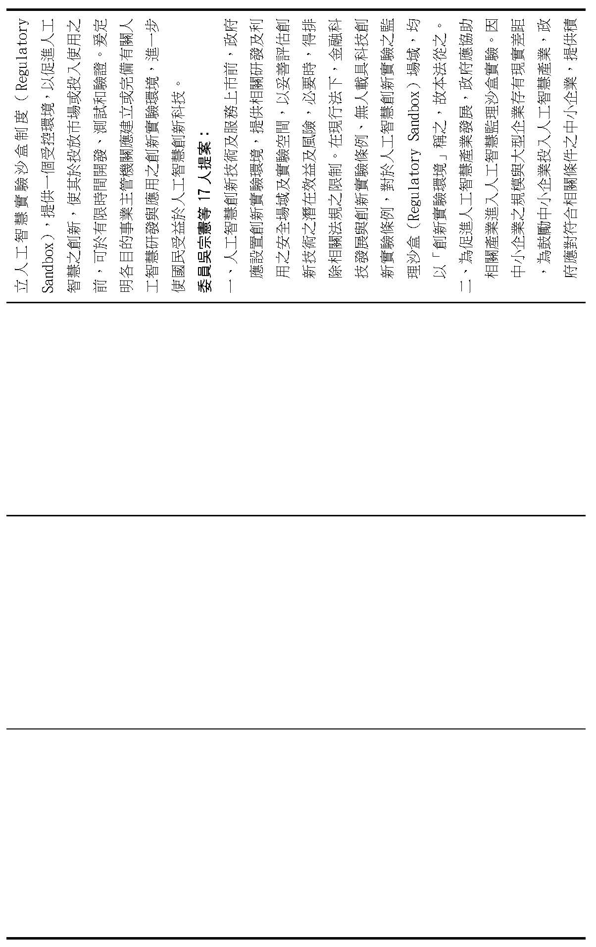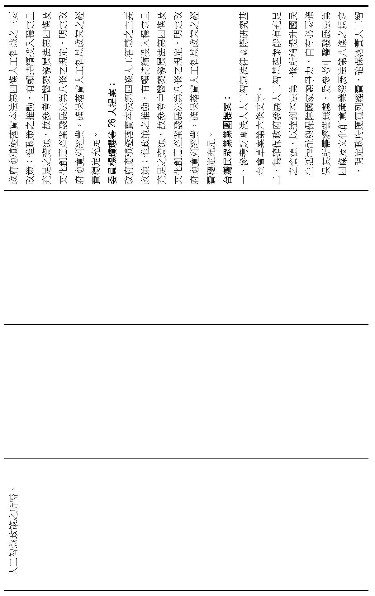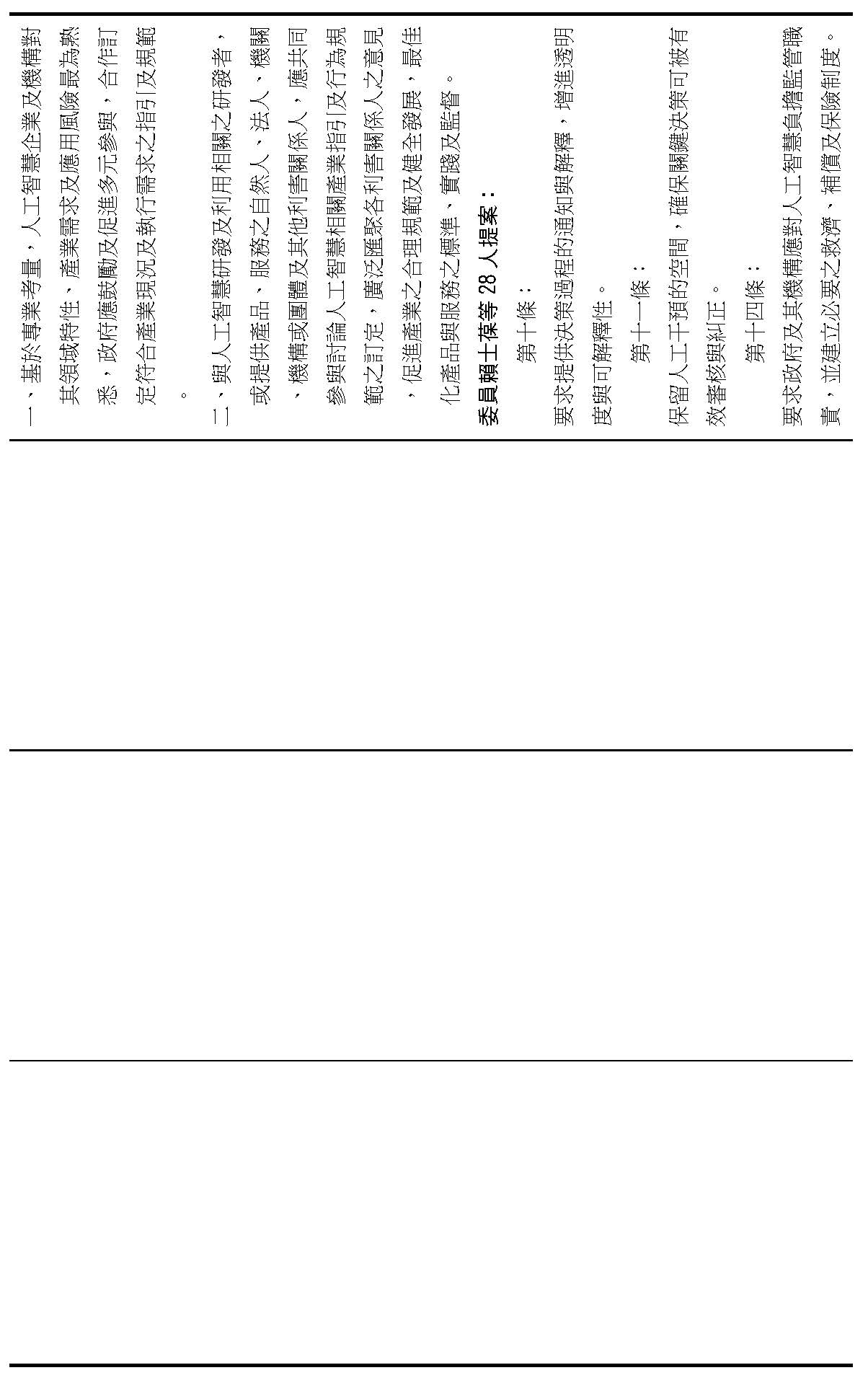 劉委員書彬:謝謝主席,關於人工智慧的相關法令的確已經是……我雖然大概3月才進來,但是我已經看到至少有公聽會和其他的相關會議,連交通委員會都已經審查了很多次,因此我也覺得也許不用再大體討論,但是可以先請主管機關來說明為什麼沒有提出院版,但是我們知道國科會有它的部版出來,把這個原因、流程還有院的態度講清楚,我們就可以進入逐條討論,不然的話,因為人工智慧各界都已經在如火如荼的運用當中,可是卻沒有一個法去規範,的確會使我們立法院陷入怠惰立法的狀況。