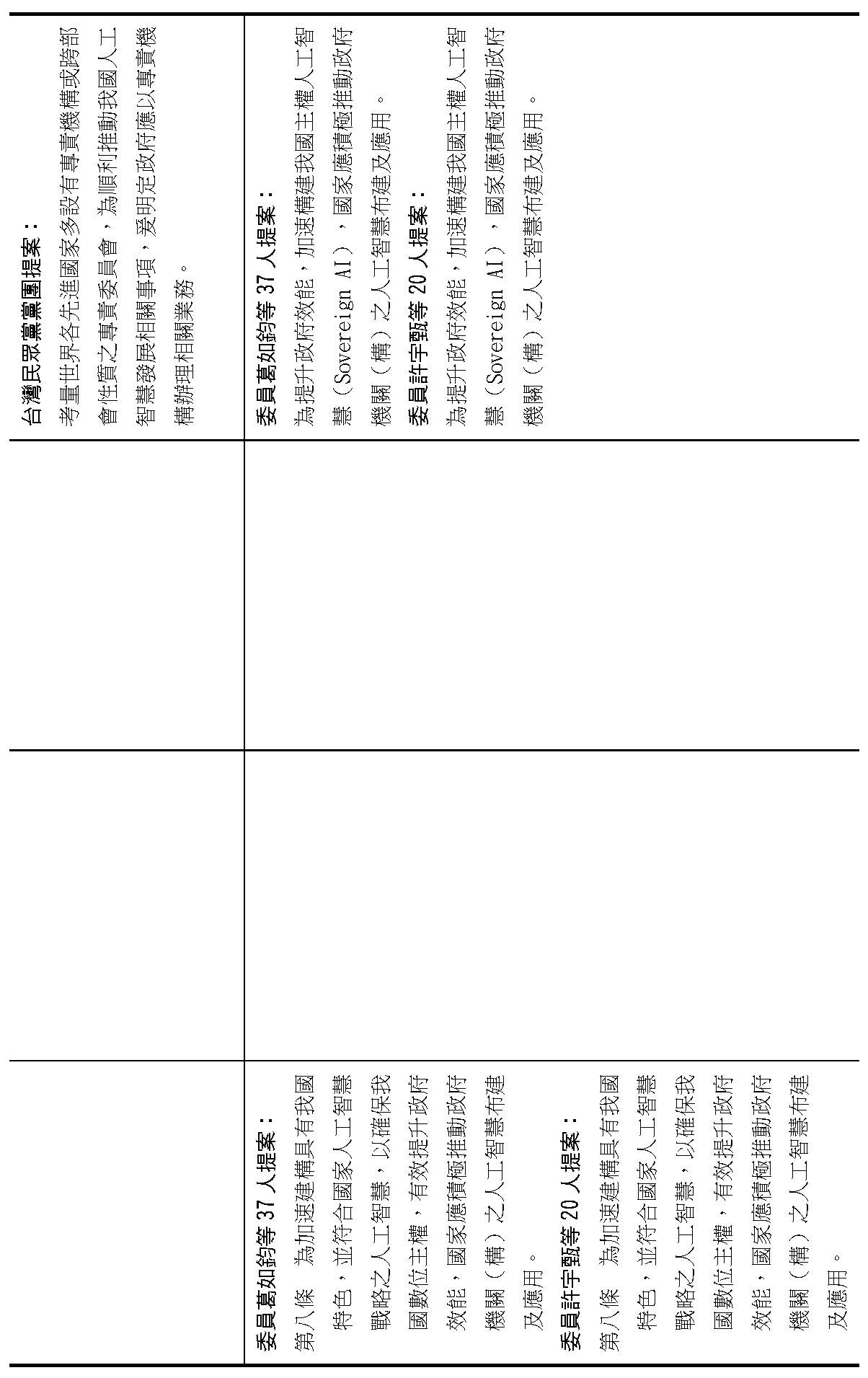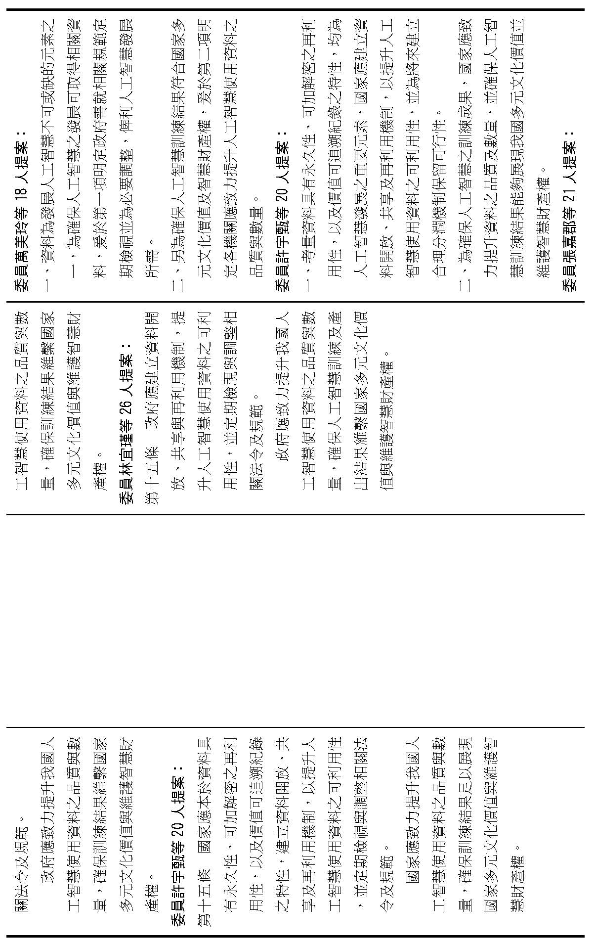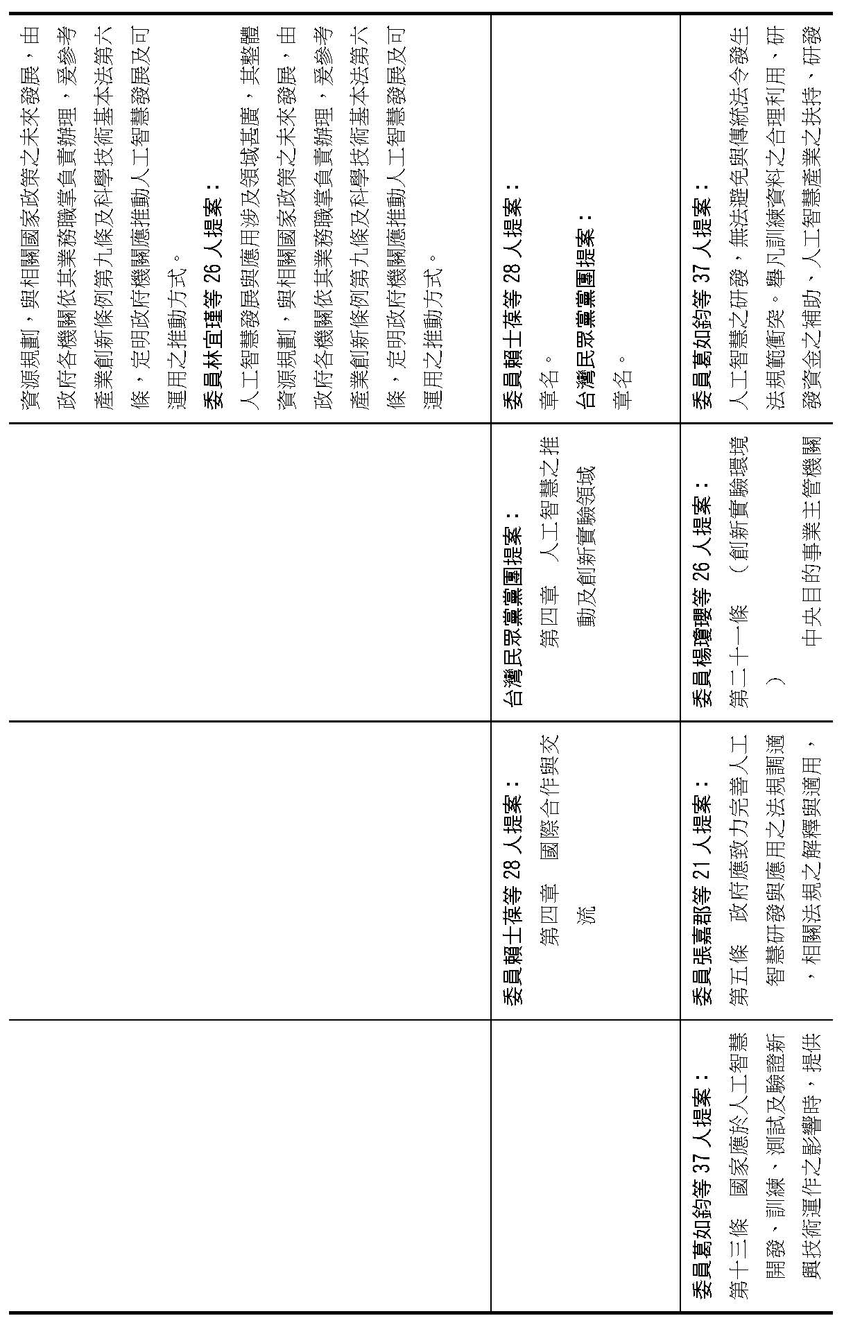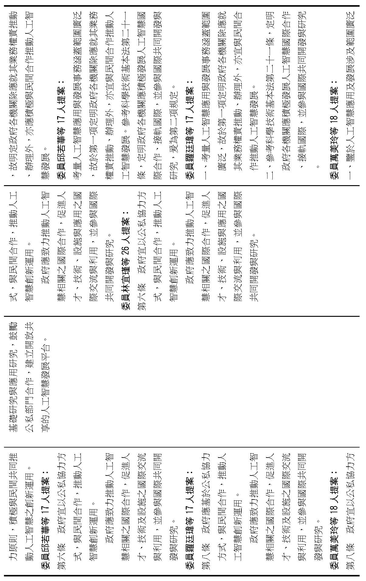 郭委員昱晴:我看到第十條,版本真的是非常混亂,包含葛如鈞委員的版本是放在第十條,就是在講跨域合作、國際參與、產官學的合作、公私協力等等,但是我們看到吳宗憲委員的版本是放在第五條;另外,林倩綺委員是放在第六條;民眾黨的版本是放在第三十二條;楊瓊瓔委員是放在第三十二條;萬美玲委員的公私協力是放在第八條,有這麼多不同的版本,我們現在是要放在哪裡?然後再來討論到底是以誰的版本為主。現在我光看條次就有第五條、第六條、第三十二條、第八條、第十條,還有人是放在第幾條,我不知道還有第幾條是我沒看到的,還有第六條,跟林倩綺委員一樣是第六條,所以到底我們是要依誰的版本?我們繼續這樣子討論下去……我剛剛已經講過,再次回應一下謝龍介委員剛剛講的,不是在比誰跑得快,送件不是在比誰跑得快,這個不是競技場,立法是要非常細緻、非常精緻的,而且講到AI基本法,我們牽扯到的所有部會是這麼的多、話題這麼的多,牽扯的資訊跟所有的關聯性又這麼的不一樣。今天我們光看條次都有這麼多不同的版本,到底要以誰的版本討論?以上。