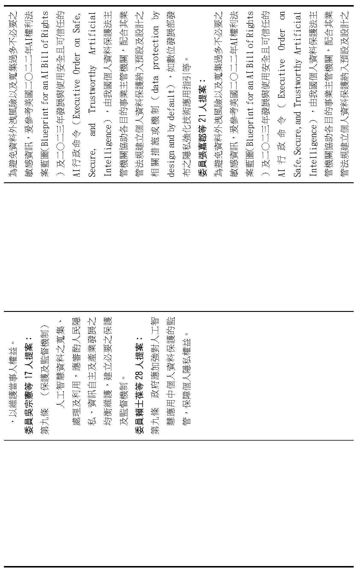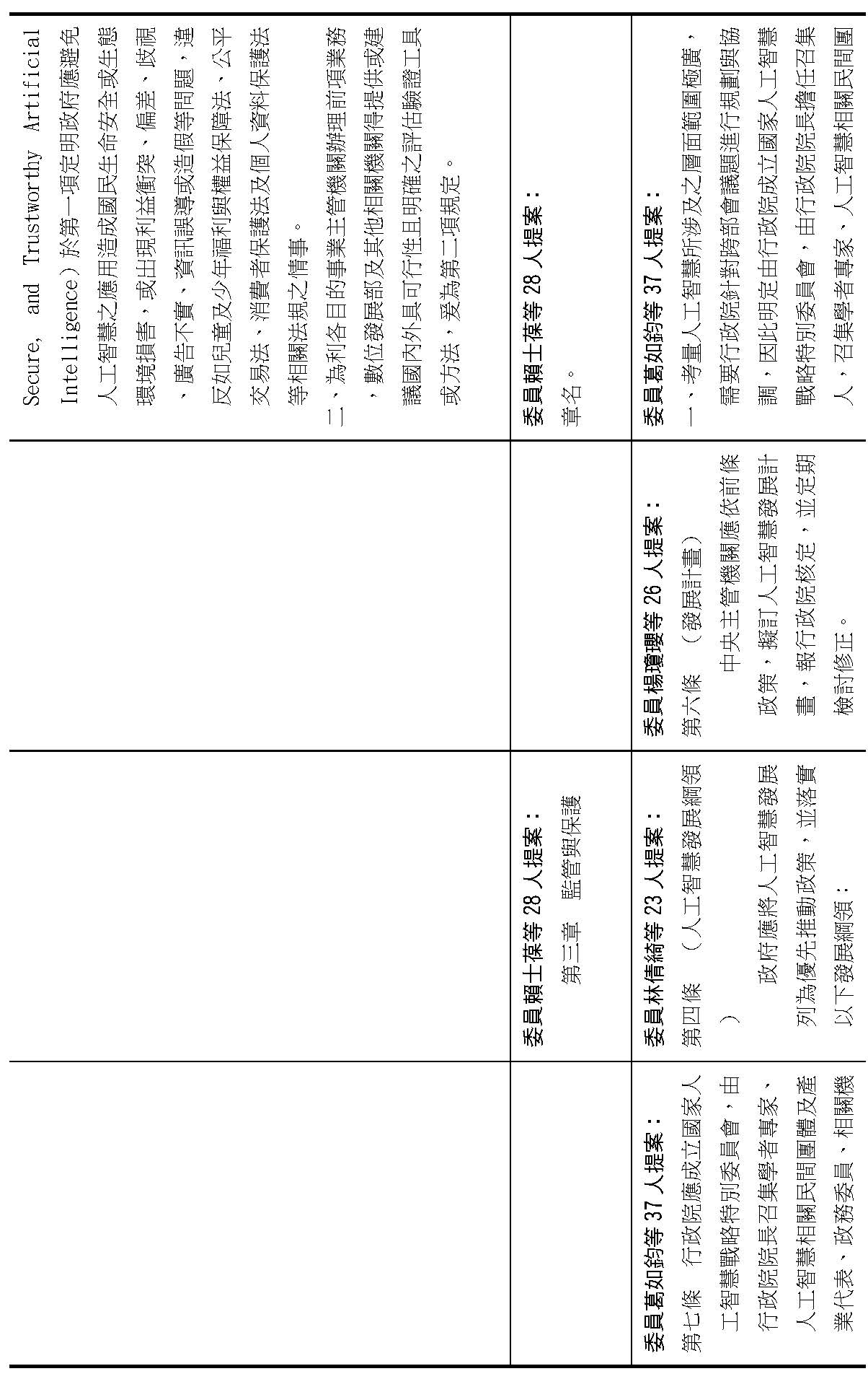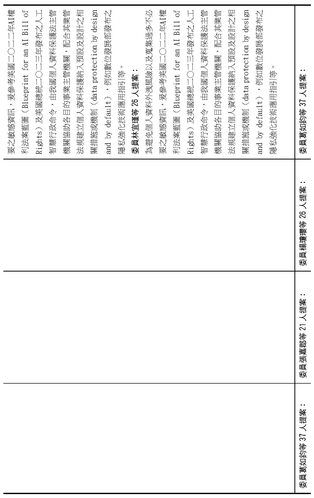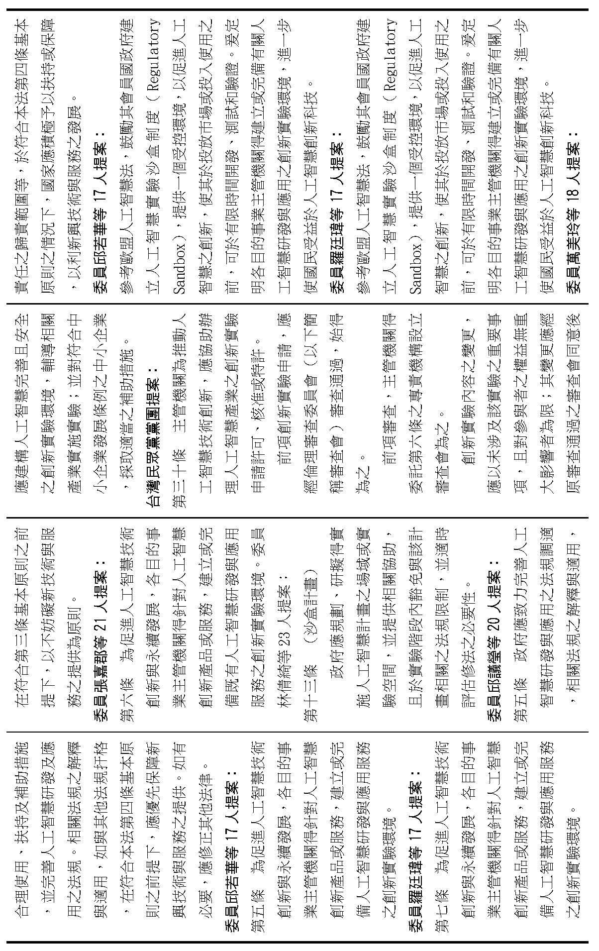 郭委員昱晴:我看到第十條,版本真的是非常混亂,包含葛如鈞委員的版本是放在第十條,就是在講跨域合作、國際參與、產官學的合作、公私協力等等,但是我們看到吳宗憲委員的版本是放在第五條;另外,林倩綺委員是放在第六條;民眾黨的版本是放在第三十二條;楊瓊瓔委員是放在第三十二條;萬美玲委員的公私協力是放在第八條,有這麼多不同的版本,我們現在是要放在哪裡?然後再來討論到底是以誰的版本為主。現在我光看條次就有第五條、第六條、第三十二條、第八條、第十條,還有人是放在第幾條,我不知道還有第幾條是我沒看到的,還有第六條,跟林倩綺委員一樣是第六條,所以到底我們是要依誰的版本?我們繼續這樣子討論下去……我剛剛已經講過,再次回應一下謝龍介委員剛剛講的,不是在比誰跑得快,送件不是在比誰跑得快,這個不是競技場,立法是要非常細緻、非常精緻的,而且講到AI基本法,我們牽扯到的所有部會是這麼的多、話題這麼的多,牽扯的資訊跟所有的關聯性又這麼的不一樣。今天我們光看條次都有這麼多不同的版本,到底要以誰的版本討論?以上。