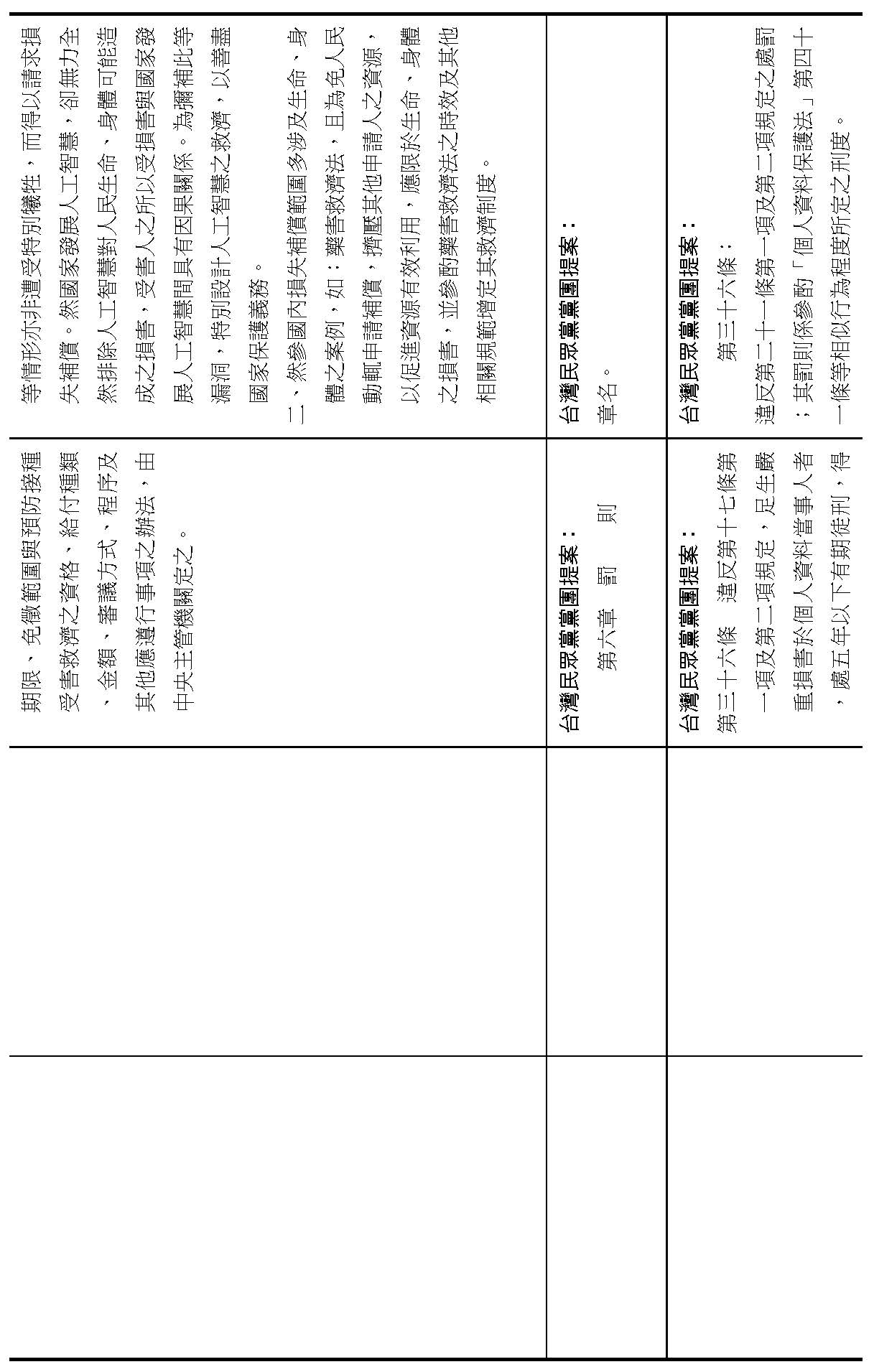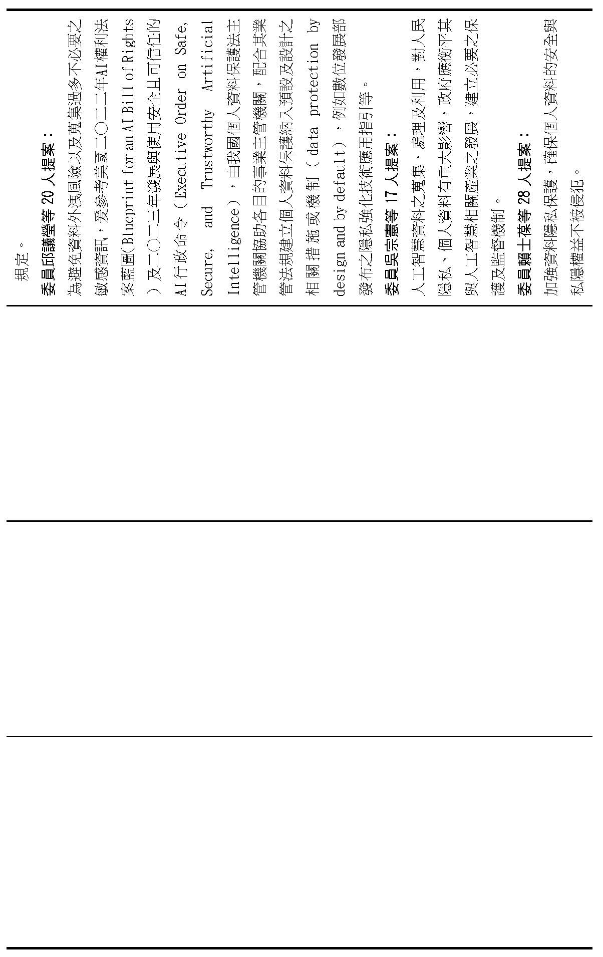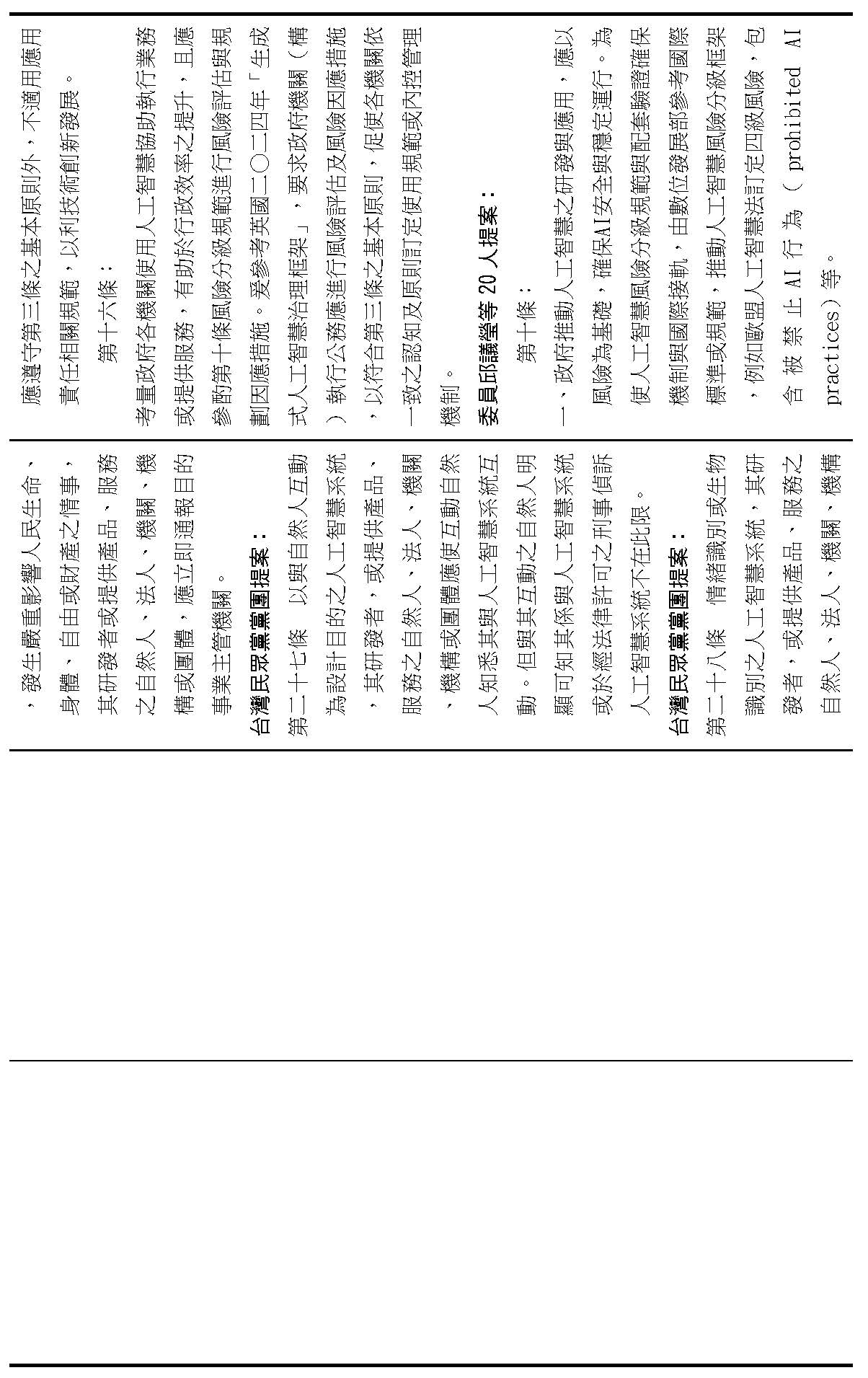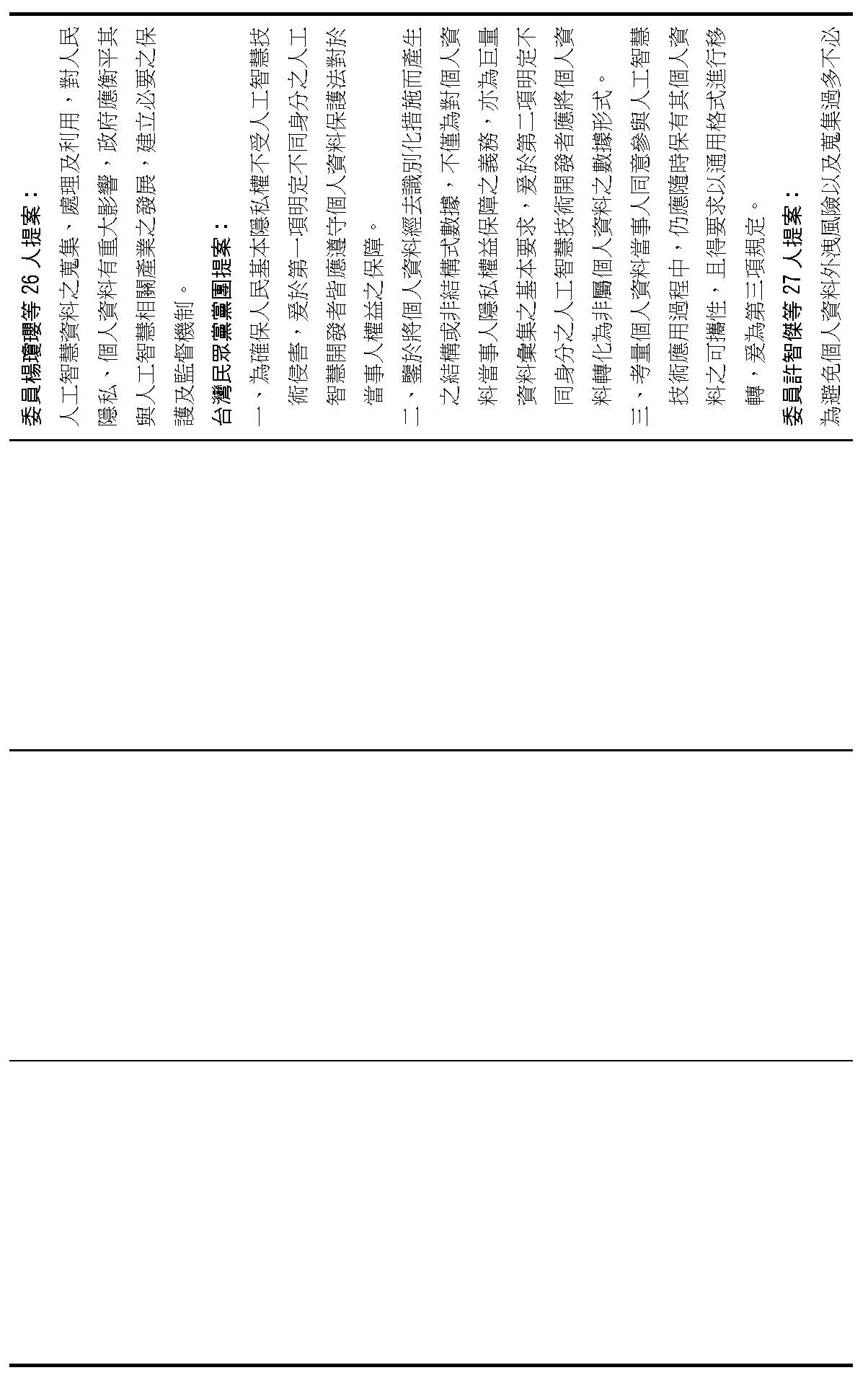 郭委員昱晴:我看到第十條,版本真的是非常混亂,包含葛如鈞委員的版本是放在第十條,就是在講跨域合作、國際參與、產官學的合作、公私協力等等,但是我們看到吳宗憲委員的版本是放在第五條;另外,林倩綺委員是放在第六條;民眾黨的版本是放在第三十二條;楊瓊瓔委員是放在第三十二條;萬美玲委員的公私協力是放在第八條,有這麼多不同的版本,我們現在是要放在哪裡?然後再來討論到底是以誰的版本為主。現在我光看條次就有第五條、第六條、第三十二條、第八條、第十條,還有人是放在第幾條,我不知道還有第幾條是我沒看到的,還有第六條,跟林倩綺委員一樣是第六條,所以到底我們是要依誰的版本?我們繼續這樣子討論下去……我剛剛已經講過,再次回應一下謝龍介委員剛剛講的,不是在比誰跑得快,送件不是在比誰跑得快,這個不是競技場,立法是要非常細緻、非常精緻的,而且講到AI基本法,我們牽扯到的所有部會是這麼的多、話題這麼的多,牽扯的資訊跟所有的關聯性又這麼的不一樣。今天我們光看條次都有這麼多不同的版本,到底要以誰的版本討論?以上。