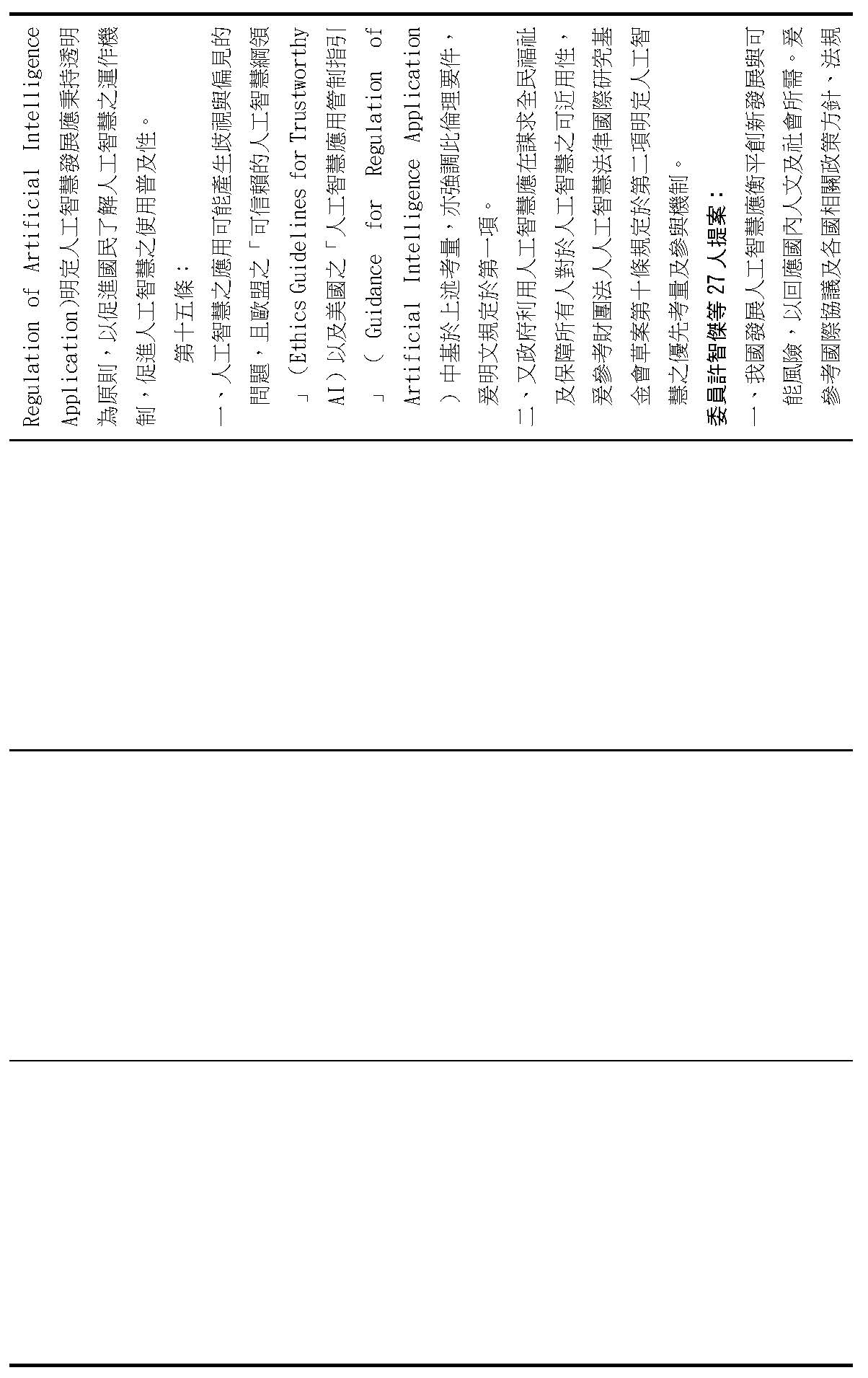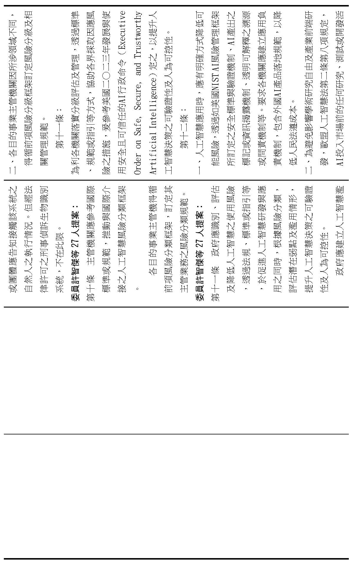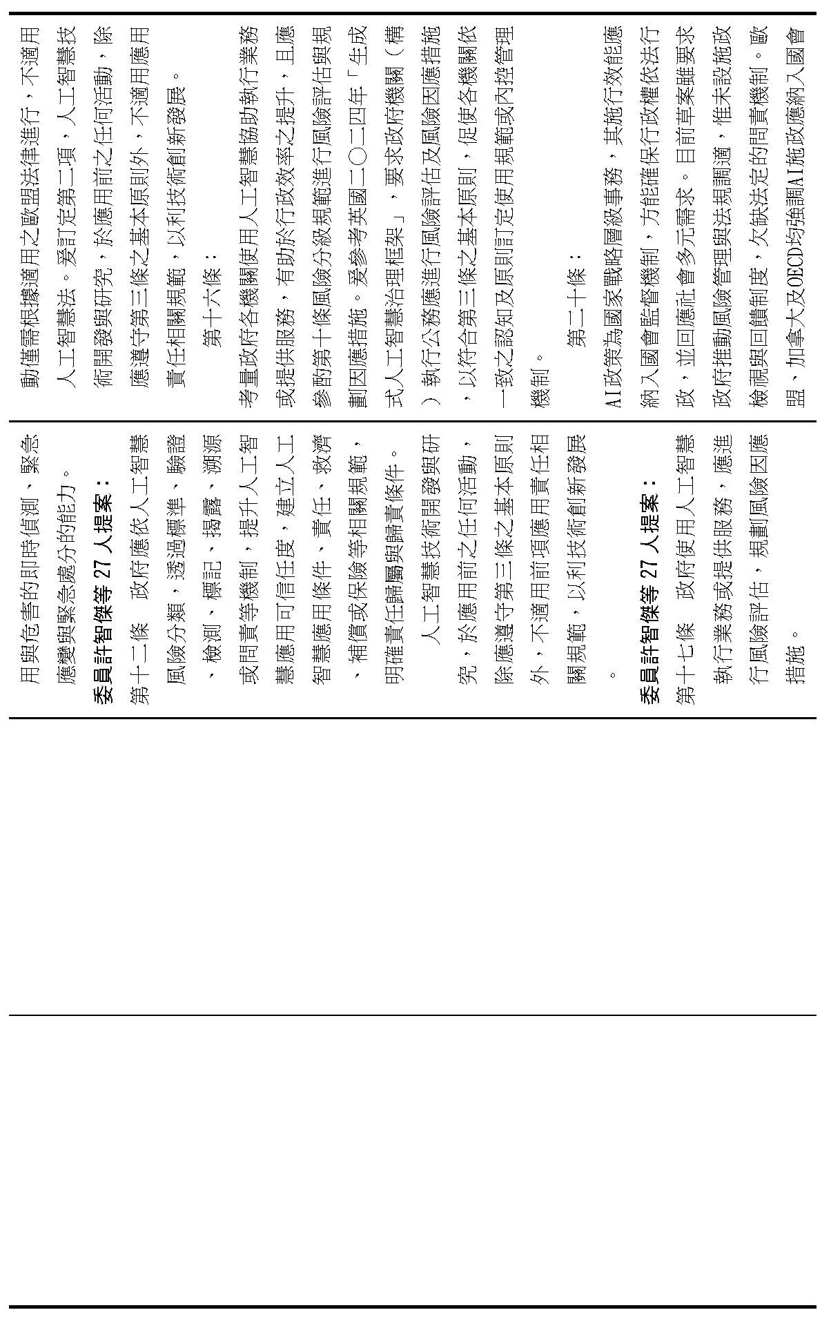 3.再者,國際上已經有多起著作權人對AI工具開發商提起的侵權訴訟,為避免人工智慧之發展侵害他人智慧財產權,本席於條文中明定人工智慧發展及應用,應遵守智慧財產權,不能為了發展AI而侵權。