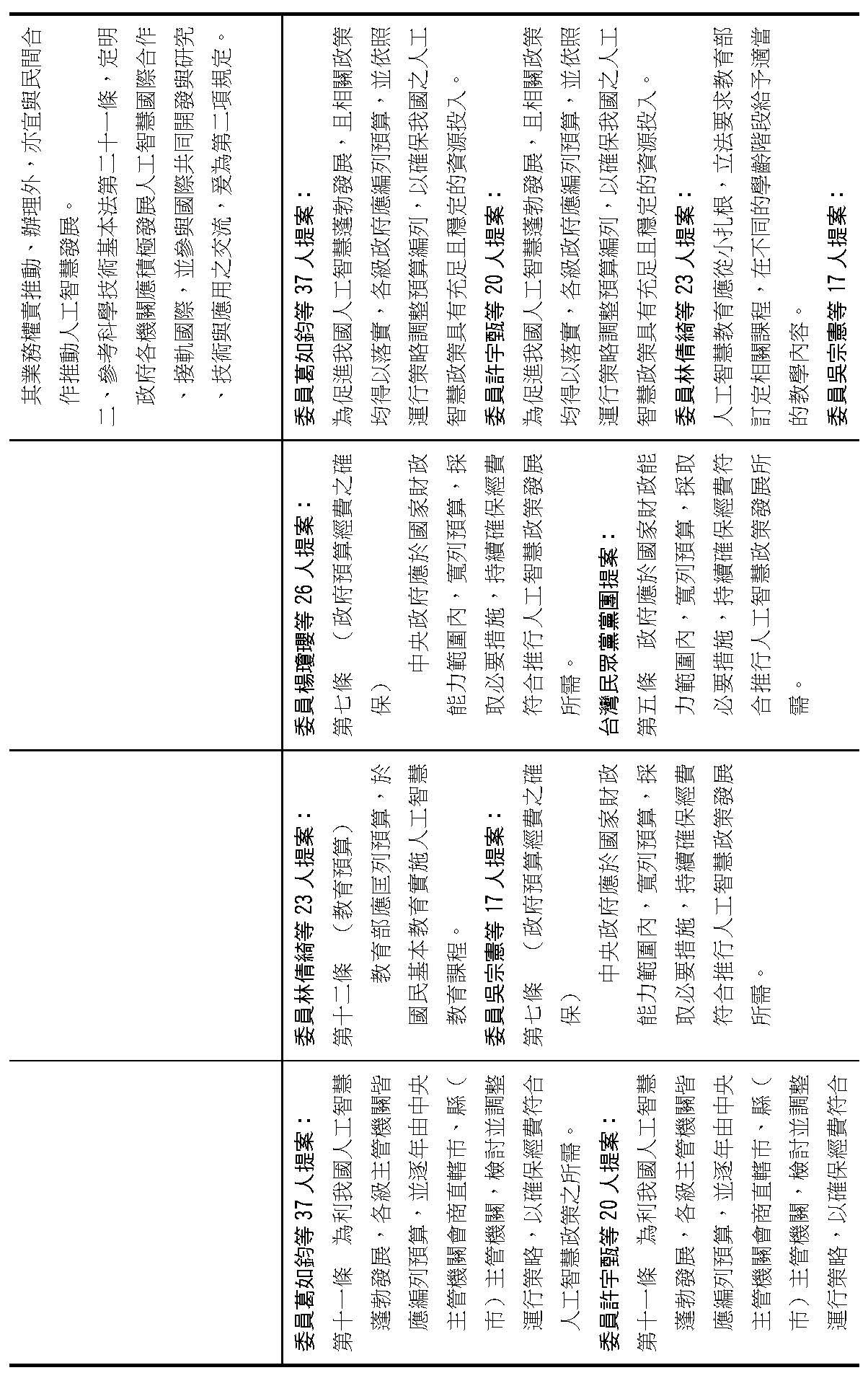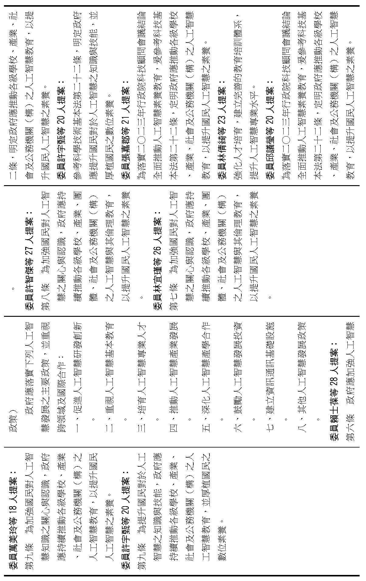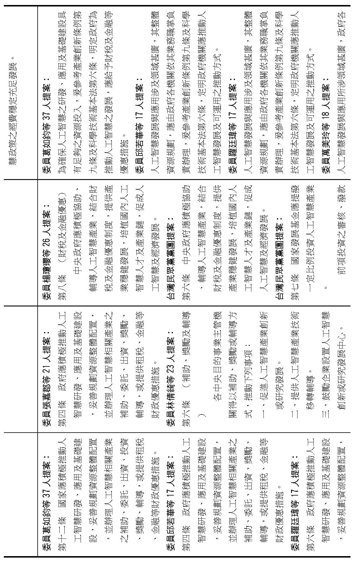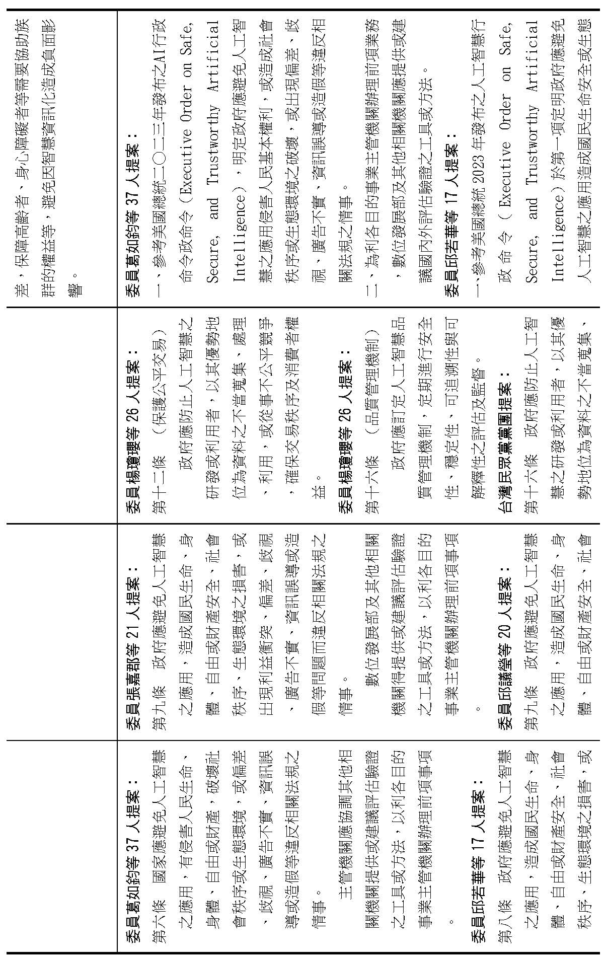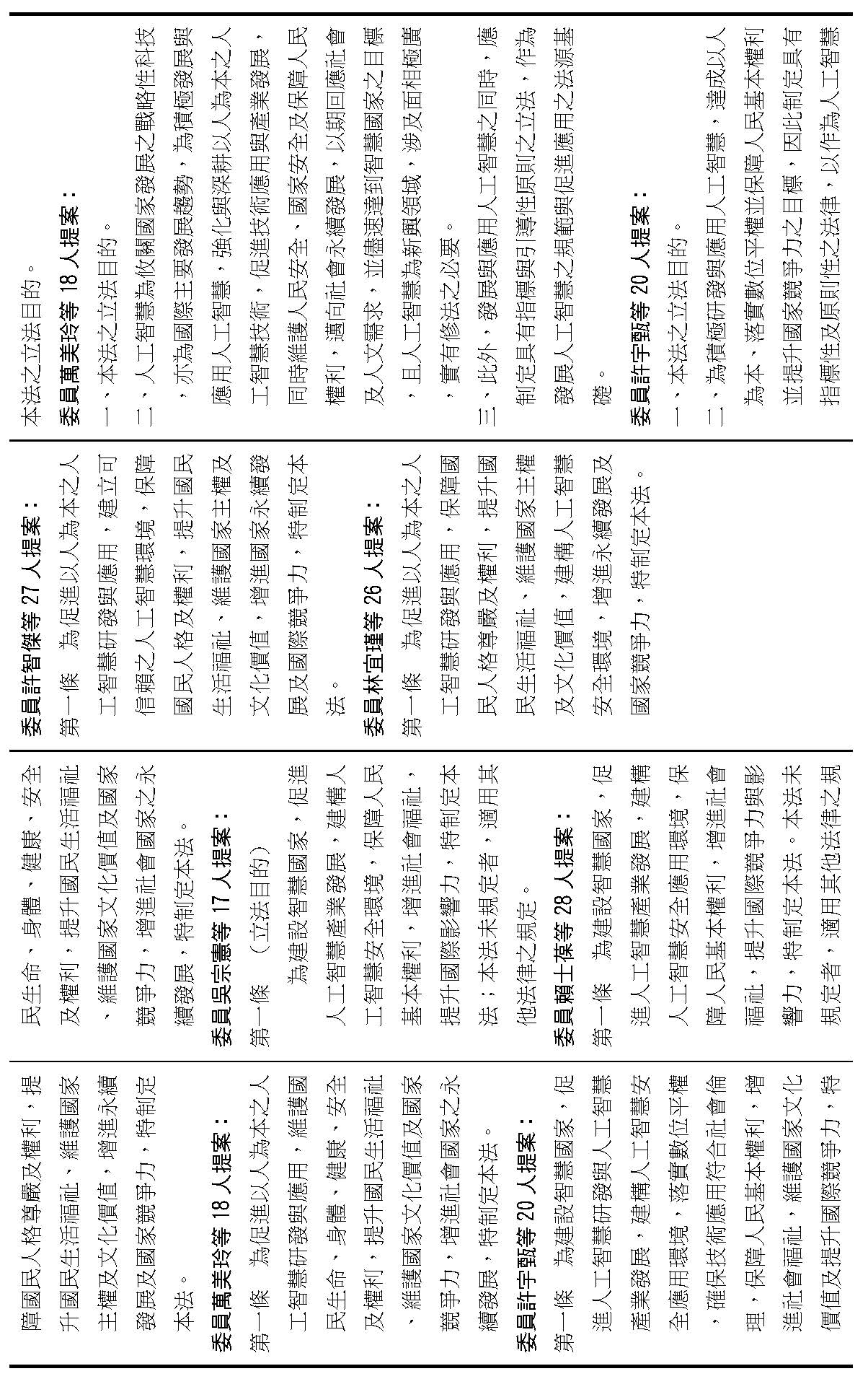 二、審查(一)委員邱議瑩等20人擬具「人工智慧基本法草案」案。(二)委員吳宗憲等17人擬具「人工智慧基本法草案」案。(三)委員賴士葆等28人擬具「人工智慧基本法草案」案。(四)委員楊瓊瓔等26人擬具「人工智慧基本法草案」案。(五)台灣民眾黨黨團擬具「人工智慧發展及管理條例草案」案。(六)委員許智傑等27人擬具「人工智慧基本法草案」案。(七)委員林宜瑾等26人擬具「人工智慧基本法草案」案。