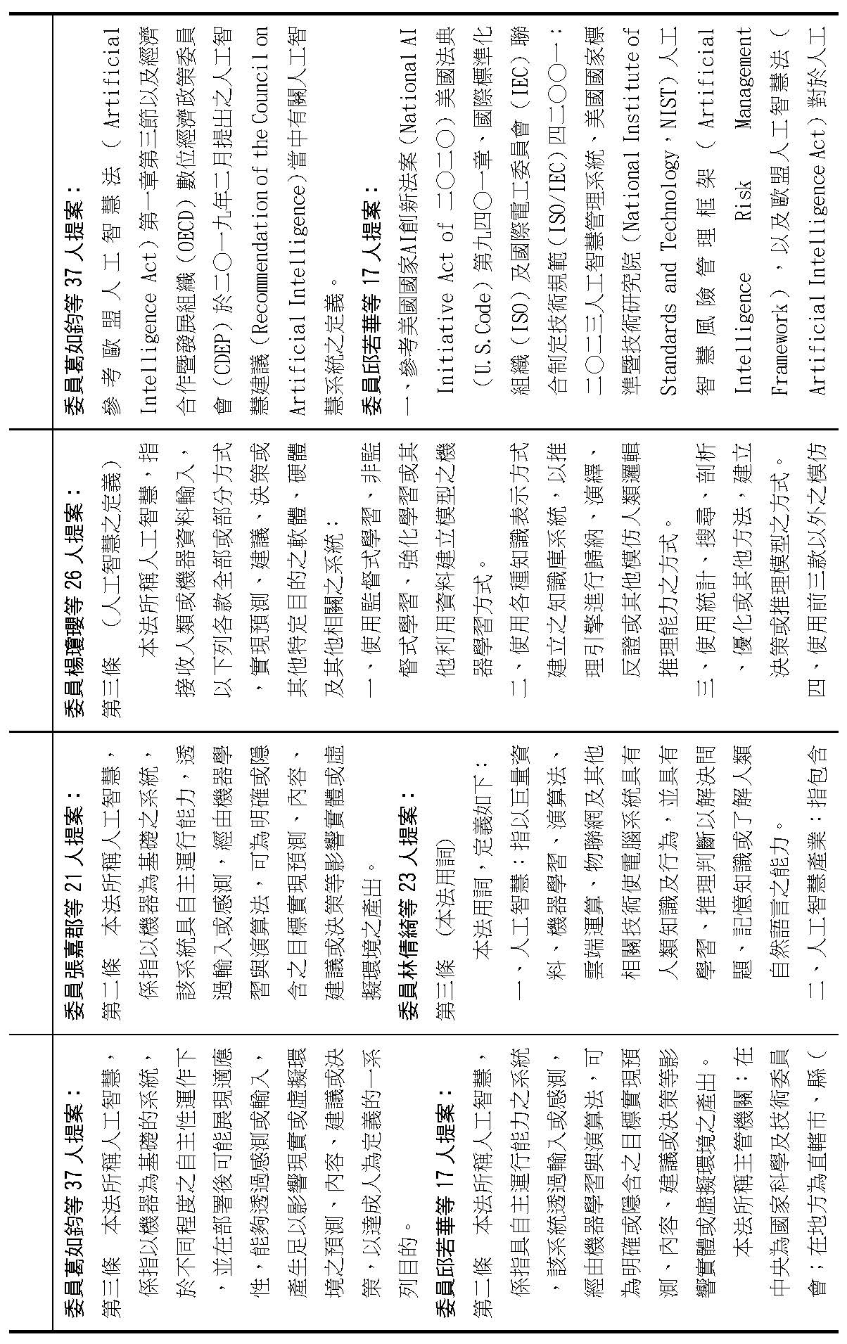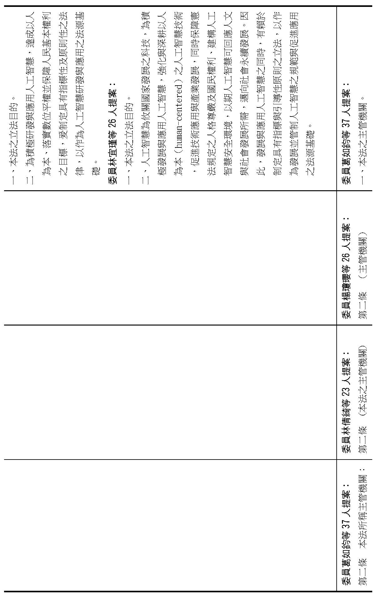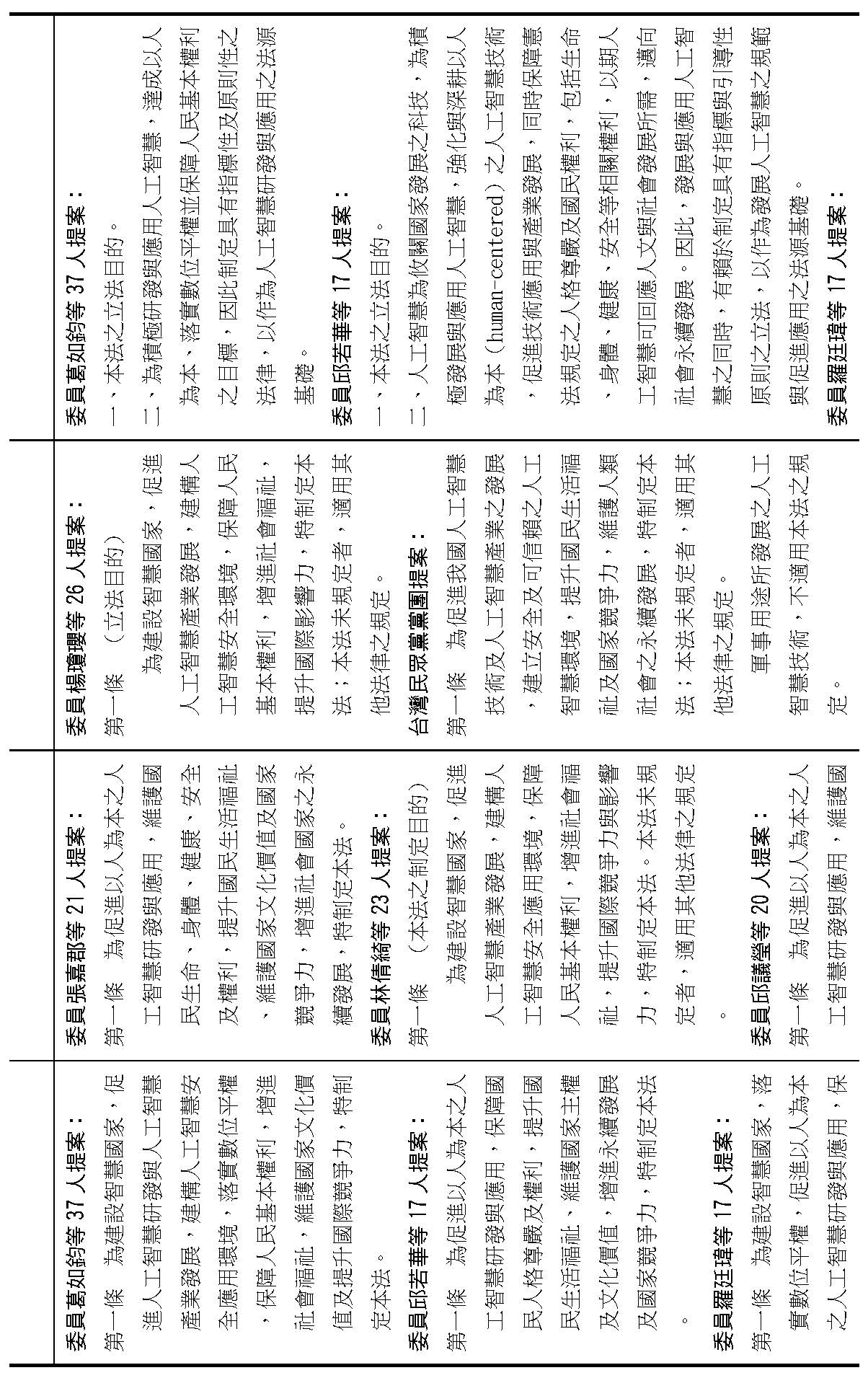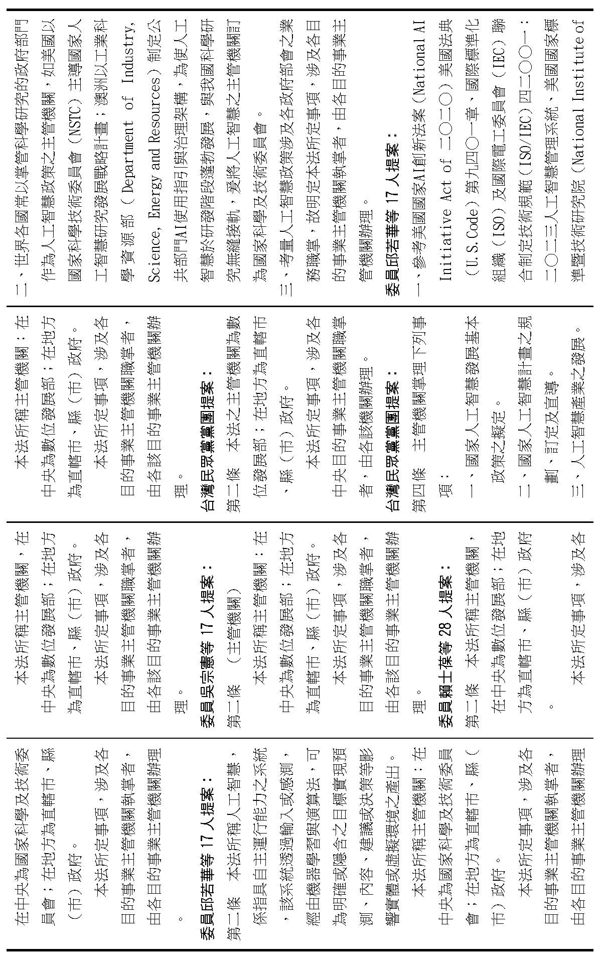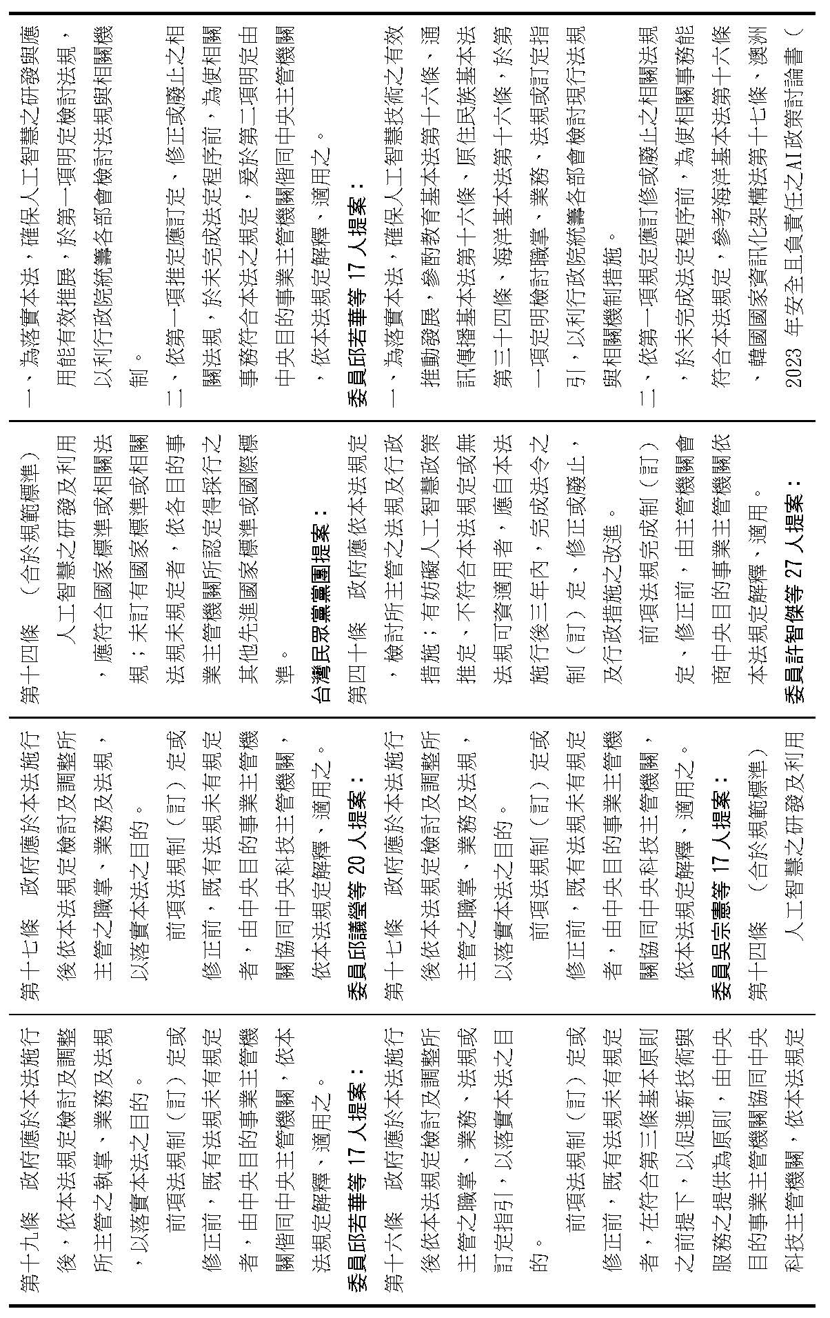 二、審查(一)委員邱議瑩等20人擬具「人工智慧基本法草案」案。(二)委員吳宗憲等17人擬具「人工智慧基本法草案」案。(三)委員賴士葆等28人擬具「人工智慧基本法草案」案。(四)委員楊瓊瓔等26人擬具「人工智慧基本法草案」案。(五)台灣民眾黨黨團擬具「人工智慧發展及管理條例草案」案。(六)委員許智傑等27人擬具「人工智慧基本法草案」案。(七)委員林宜瑾等26人擬具「人工智慧基本法草案」案。