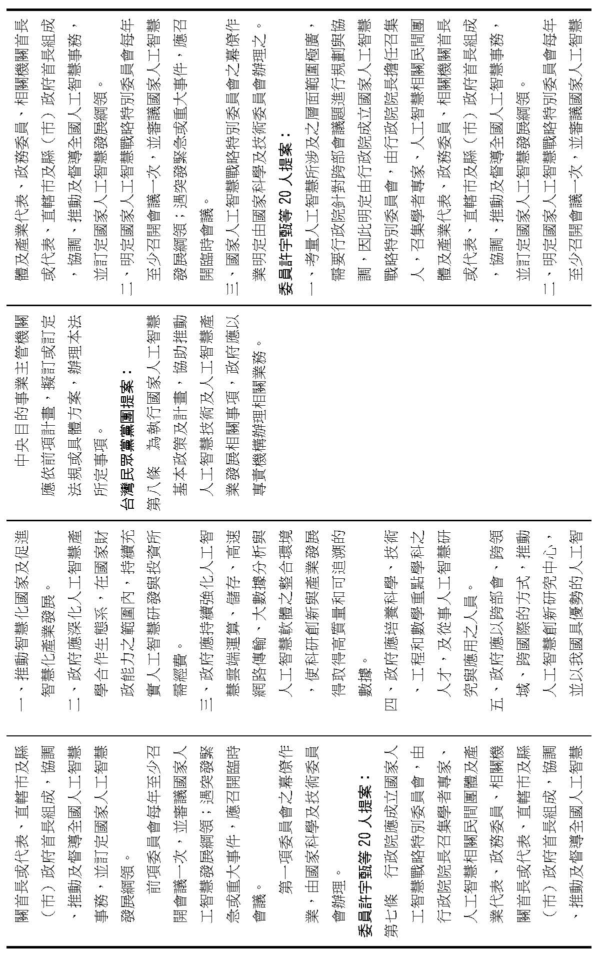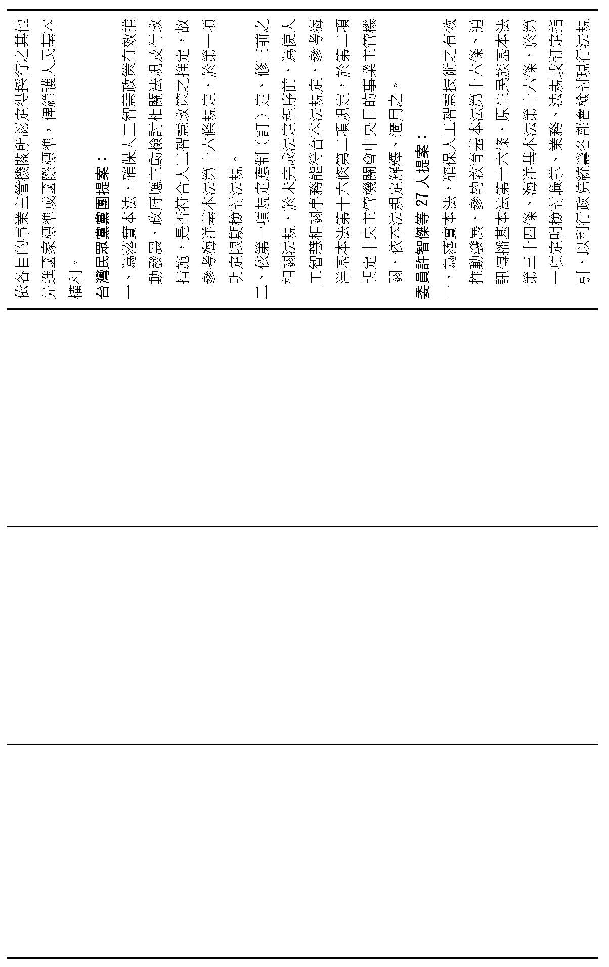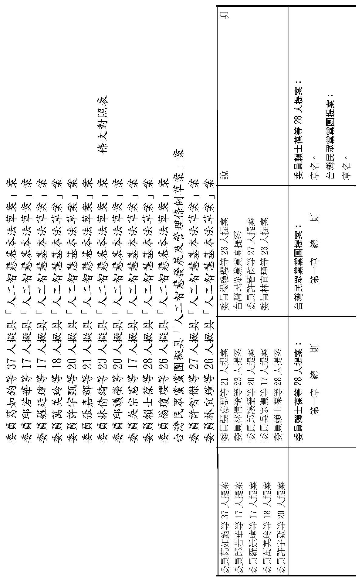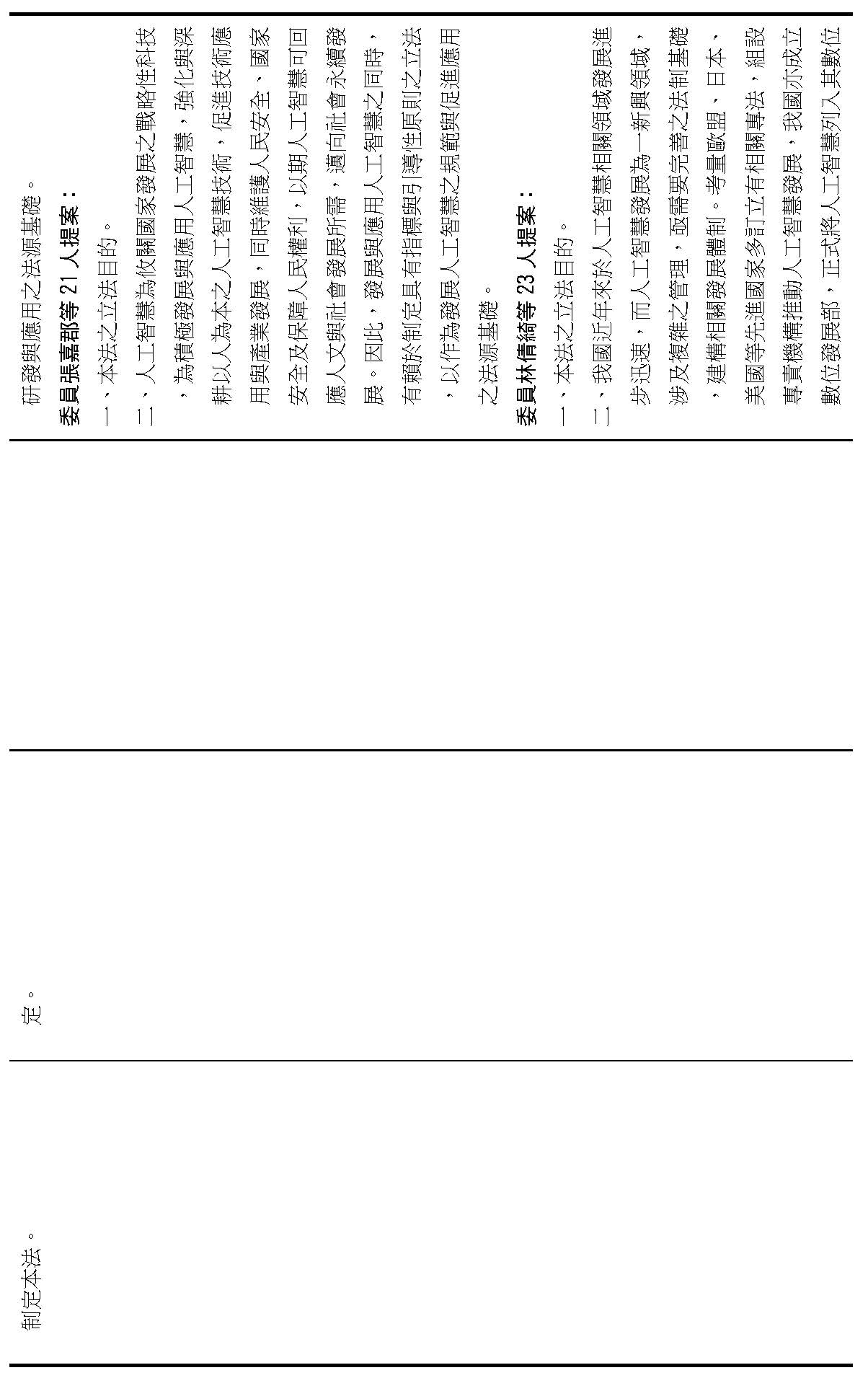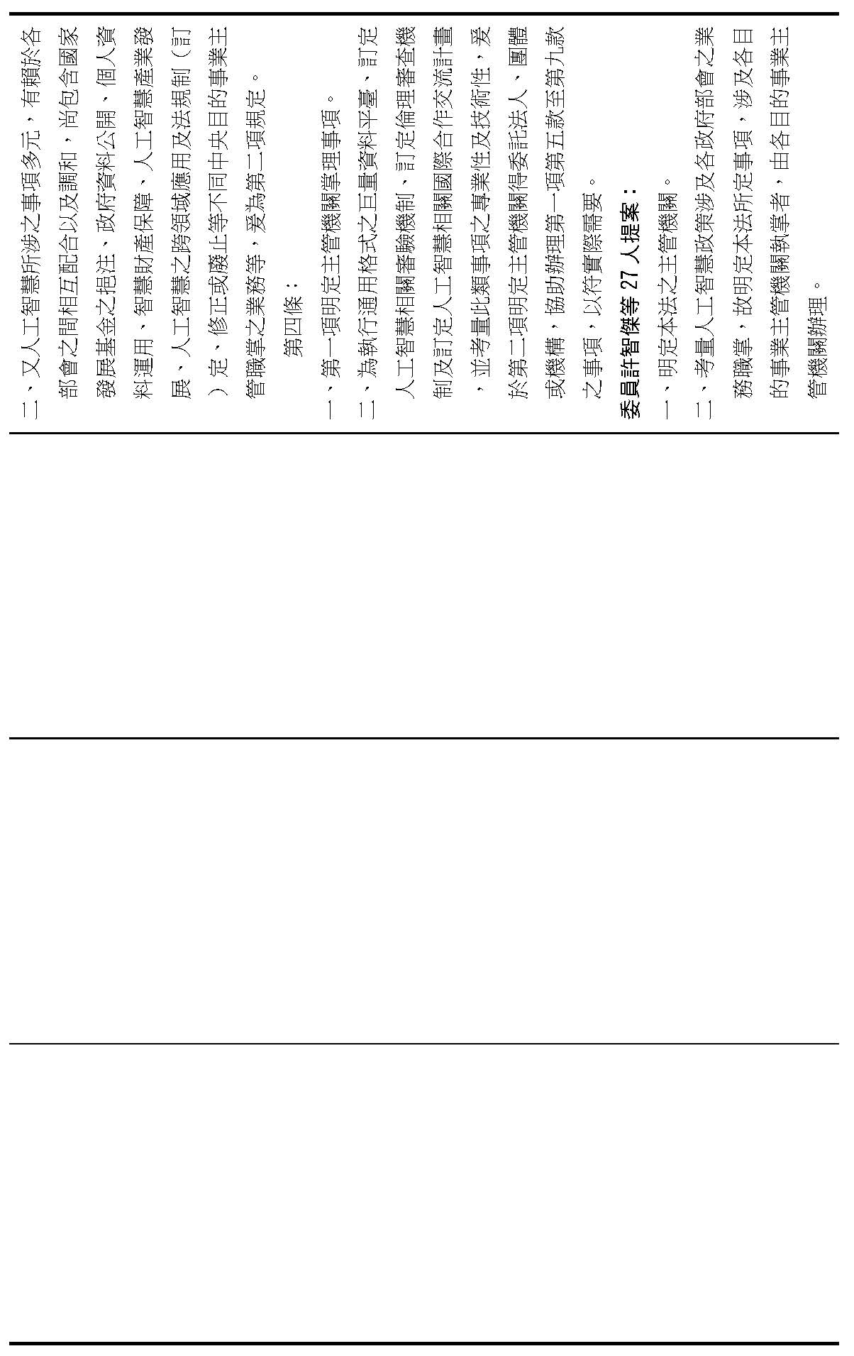 二、審查(一)委員邱議瑩等20人擬具「人工智慧基本法草案」案。(二)委員吳宗憲等17人擬具「人工智慧基本法草案」案。(三)委員賴士葆等28人擬具「人工智慧基本法草案」案。(四)委員楊瓊瓔等26人擬具「人工智慧基本法草案」案。(五)台灣民眾黨黨團擬具「人工智慧發展及管理條例草案」案。(六)委員許智傑等27人擬具「人工智慧基本法草案」案。(七)委員林宜瑾等26人擬具「人工智慧基本法草案」案。