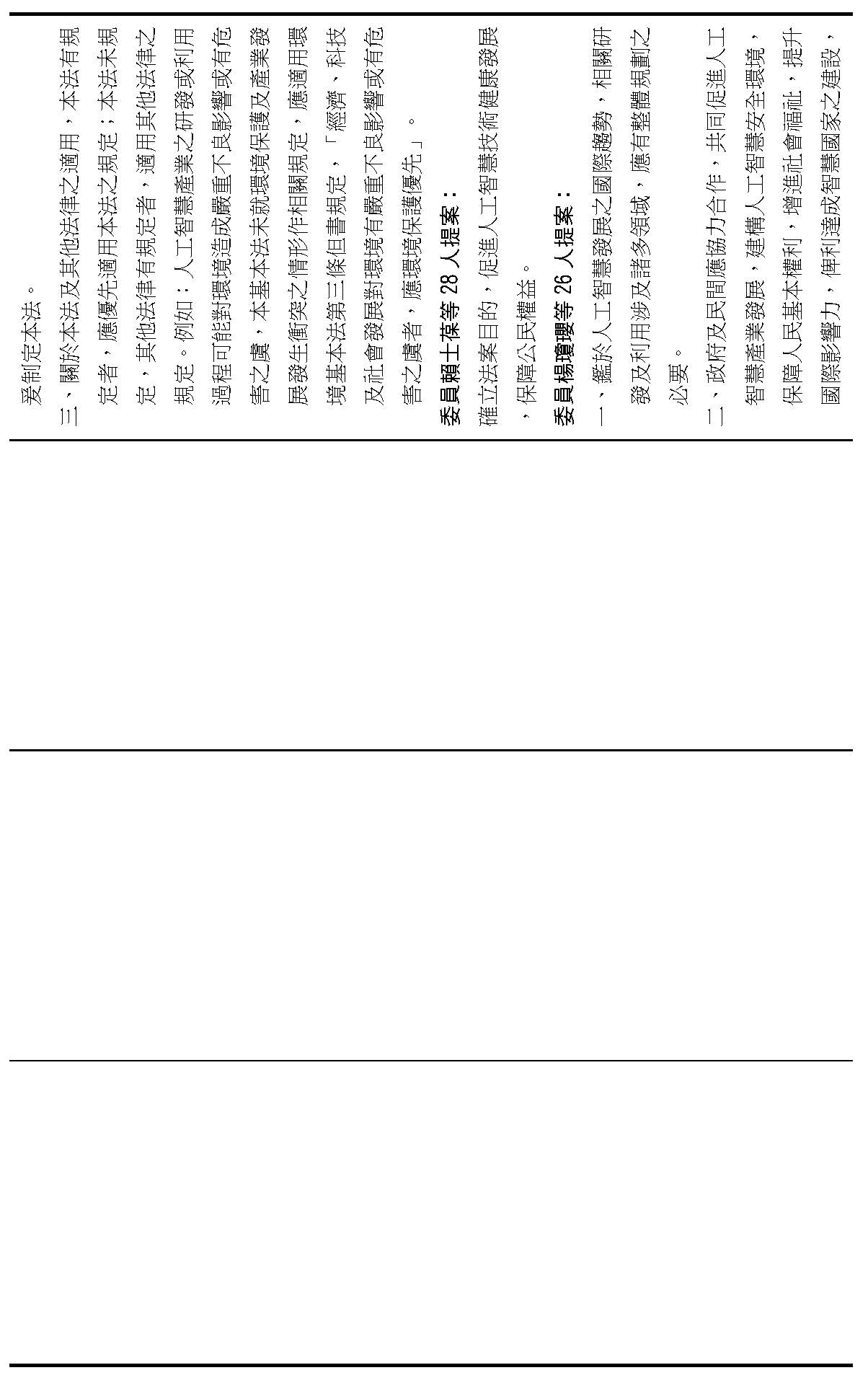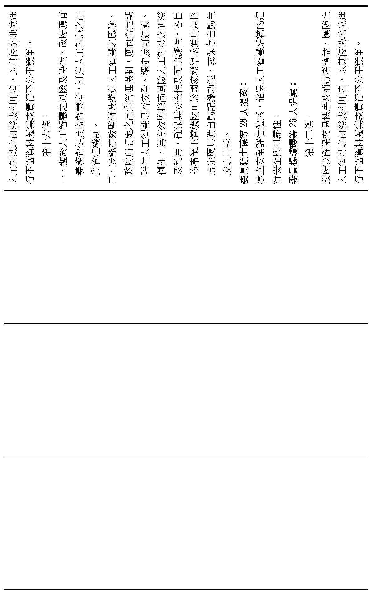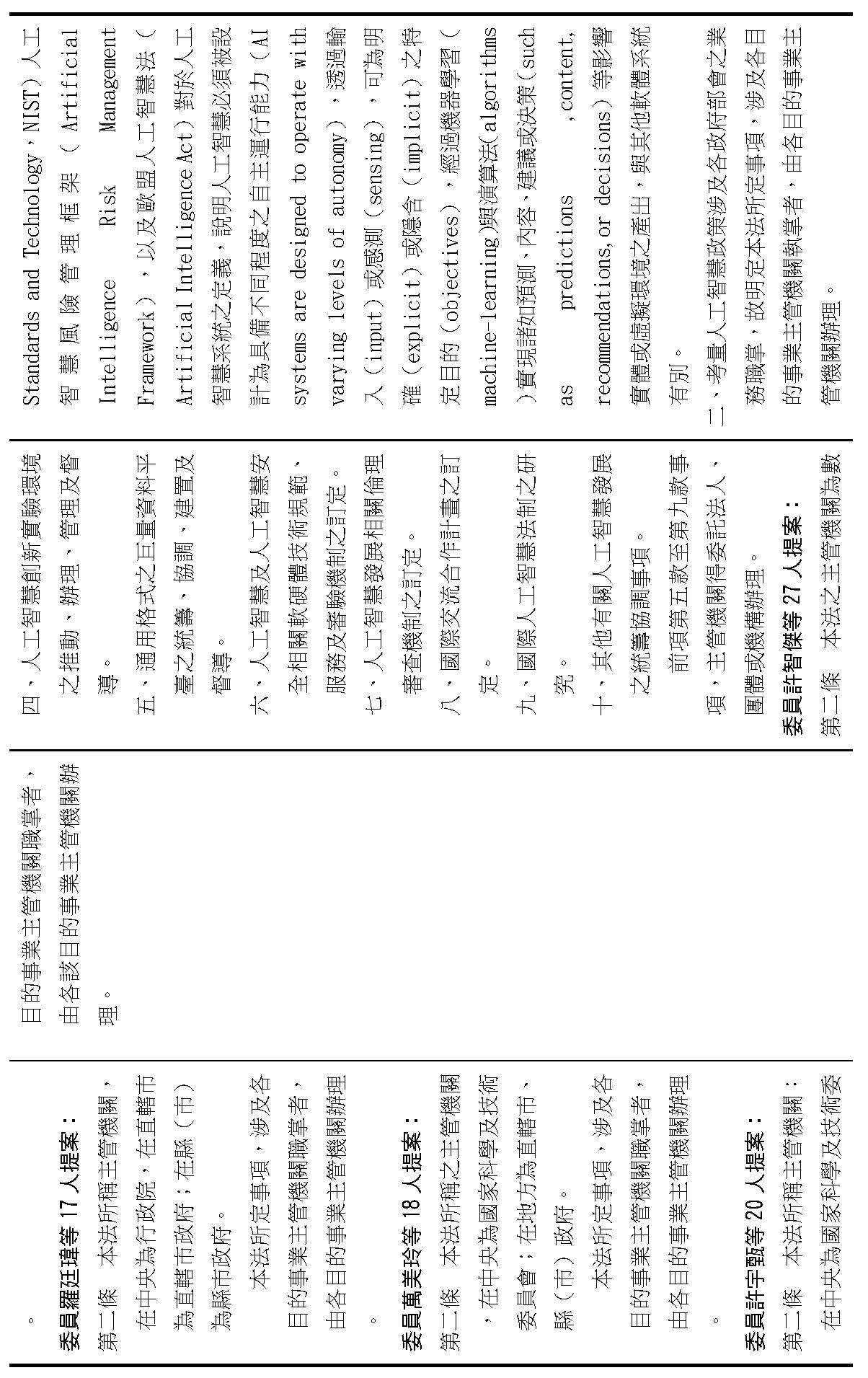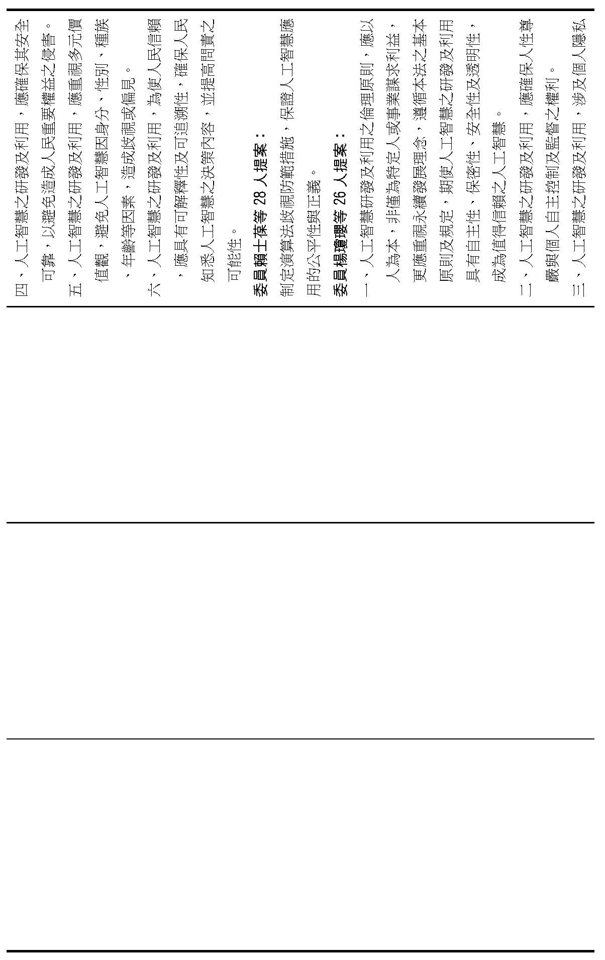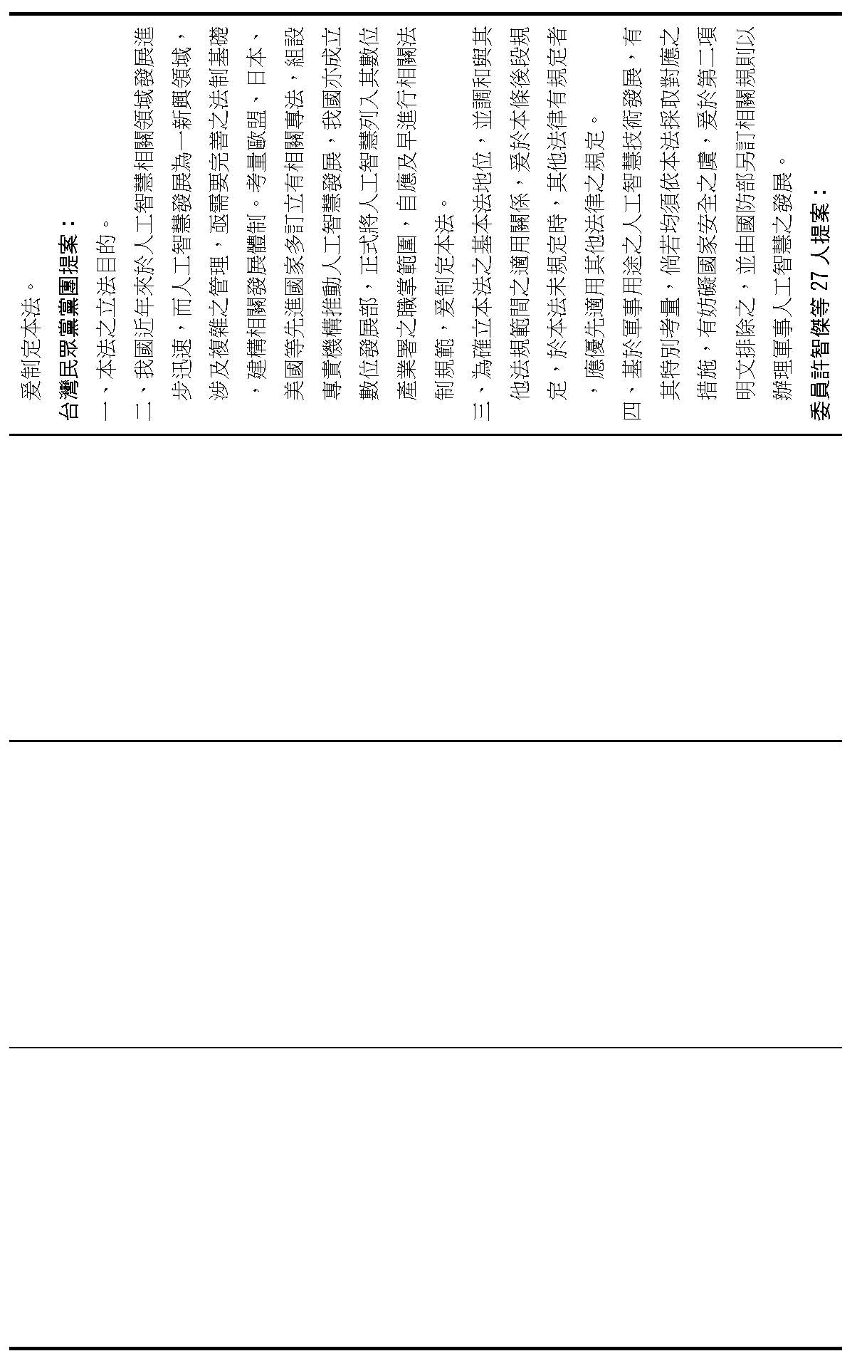 二、審查(一)委員邱議瑩等20人擬具「人工智慧基本法草案」案。(二)委員吳宗憲等17人擬具「人工智慧基本法草案」案。(三)委員賴士葆等28人擬具「人工智慧基本法草案」案。(四)委員楊瓊瓔等26人擬具「人工智慧基本法草案」案。(五)台灣民眾黨黨團擬具「人工智慧發展及管理條例草案」案。(六)委員許智傑等27人擬具「人工智慧基本法草案」案。(七)委員林宜瑾等26人擬具「人工智慧基本法草案」案。