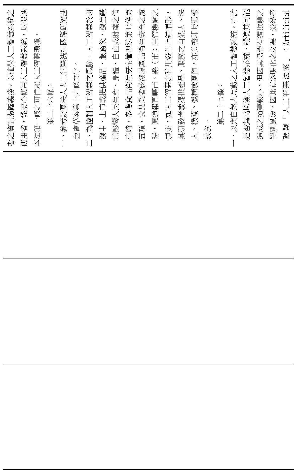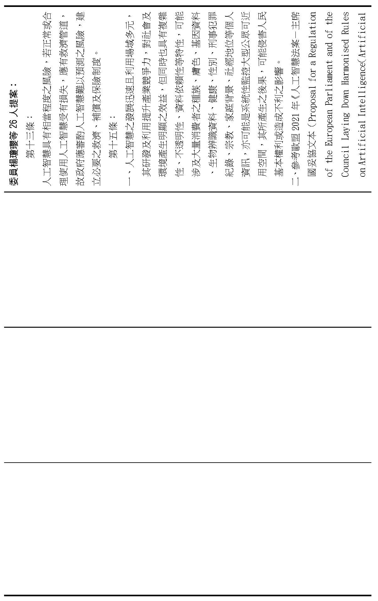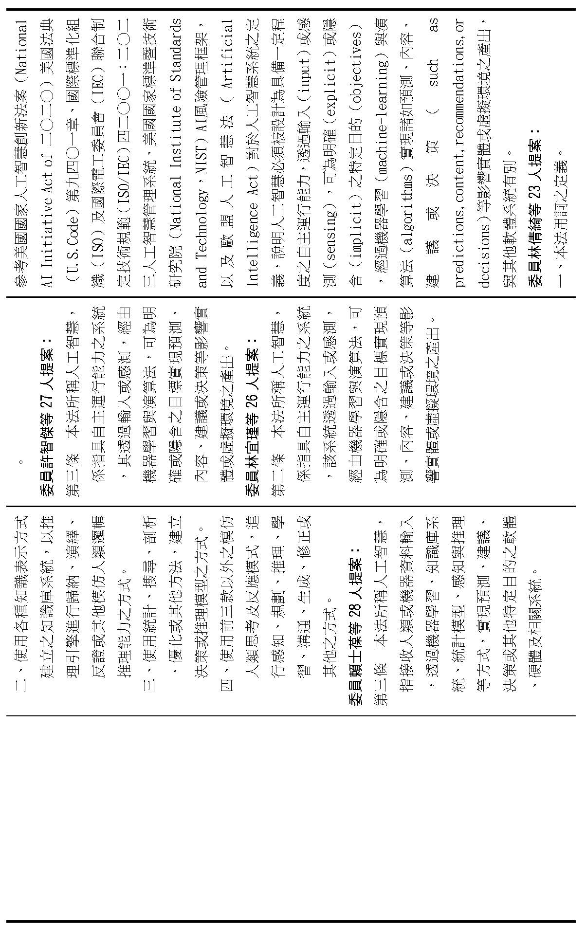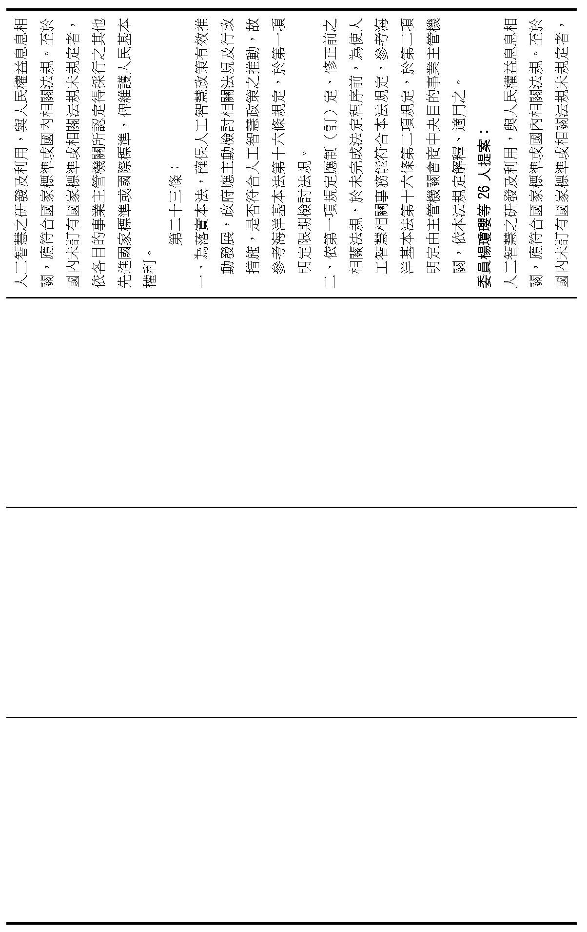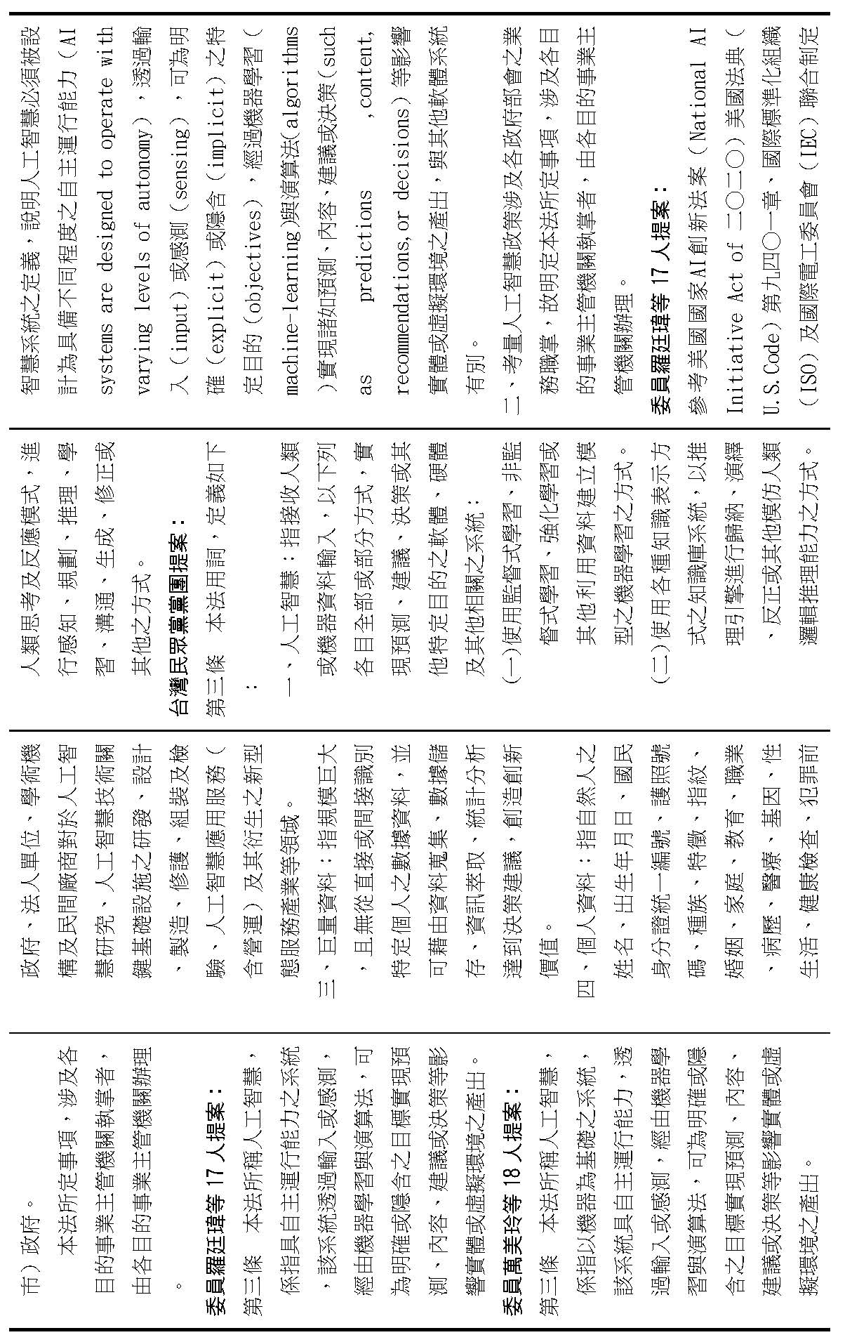 二、審查(一)委員邱議瑩等20人擬具「人工智慧基本法草案」案。(二)委員吳宗憲等17人擬具「人工智慧基本法草案」案。(三)委員賴士葆等28人擬具「人工智慧基本法草案」案。(四)委員楊瓊瓔等26人擬具「人工智慧基本法草案」案。(五)台灣民眾黨黨團擬具「人工智慧發展及管理條例草案」案。(六)委員許智傑等27人擬具「人工智慧基本法草案」案。(七)委員林宜瑾等26人擬具「人工智慧基本法草案」案。