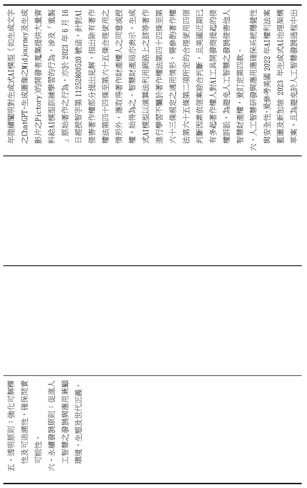 2.智慧財產局也表示,生成式AI模型以演算法利用網路上的著作進行學習,不屬於著作權法第44條至第63條規定的合理使用情形,需參酌著作權法第65條第2項所定合理使用的四個判斷因素: