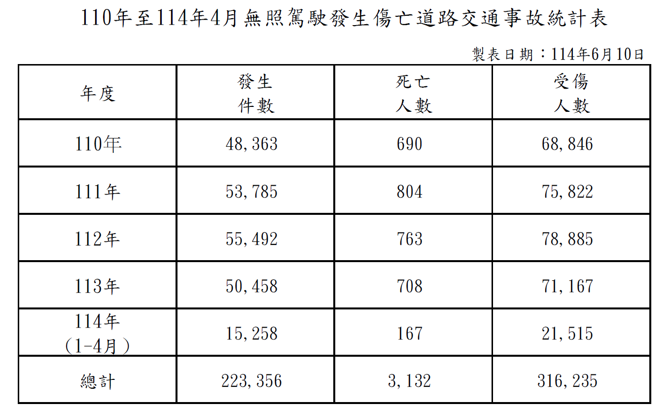 台灣近5年平均一年有5萬件交通事故是與無照駕駛有關,死傷人數更是突破七萬多人,占總交通事故死傷人數的1/5,從110年起總共奪走了3132條性命以及造成31.6萬人受傷。