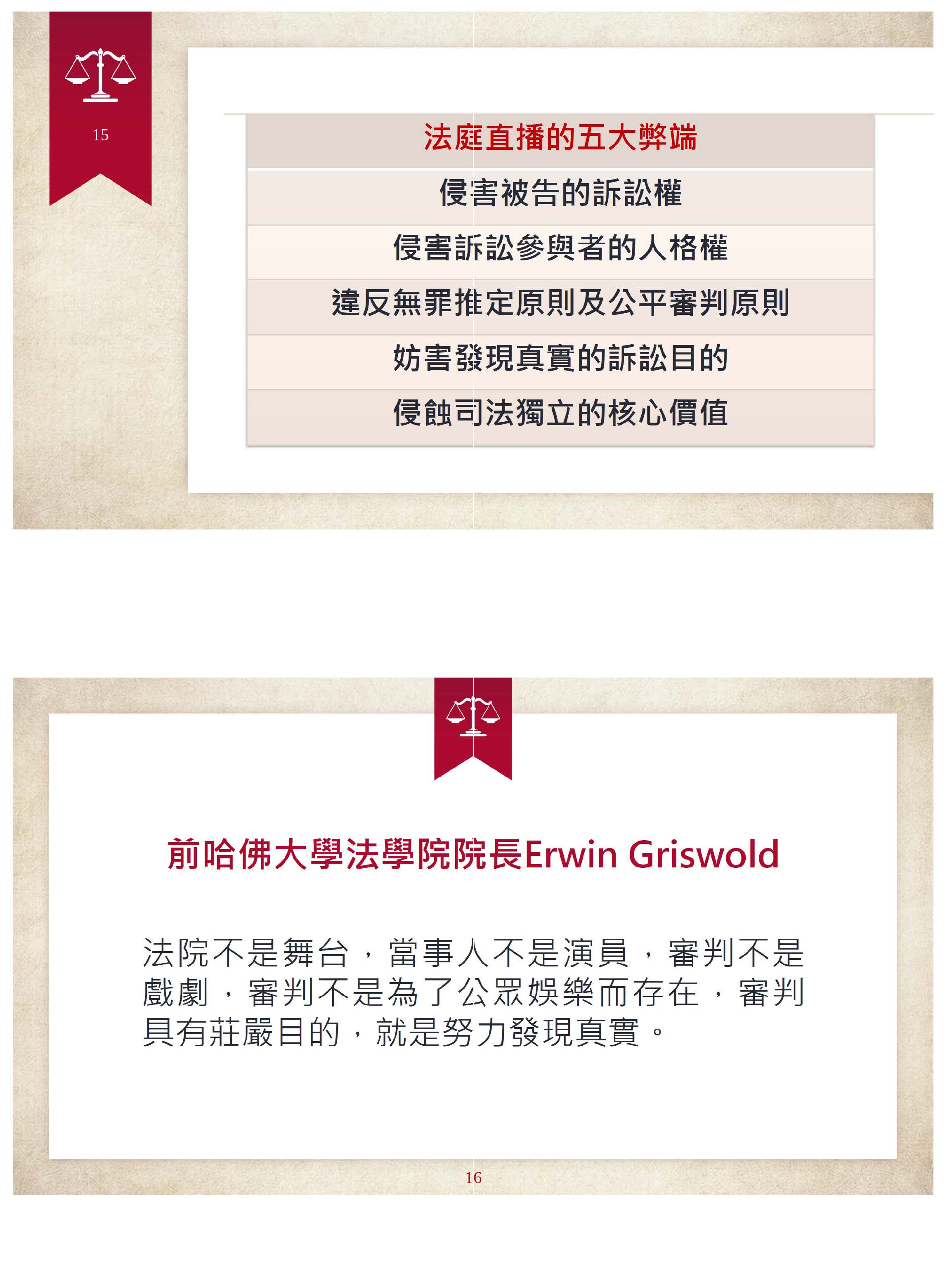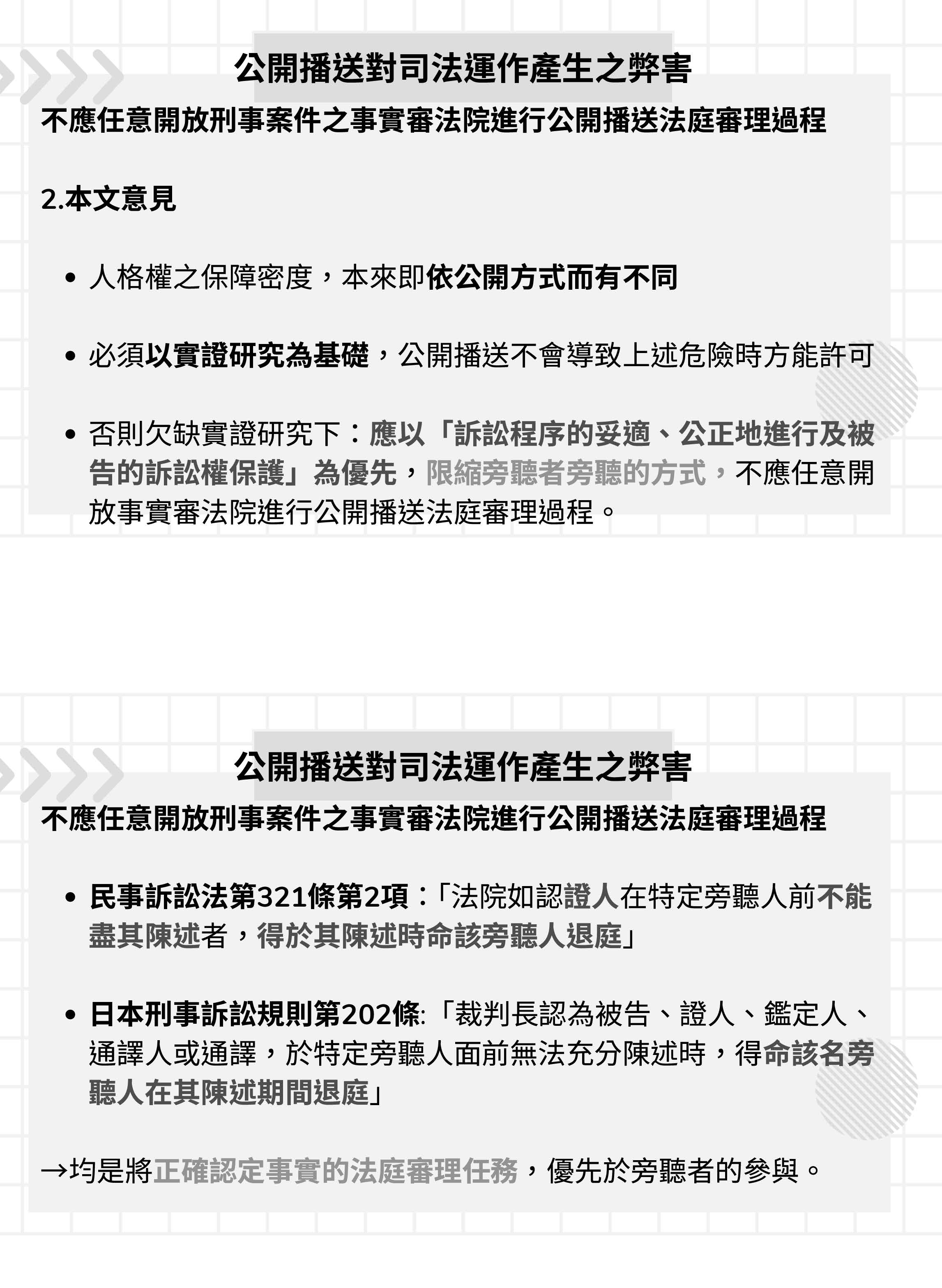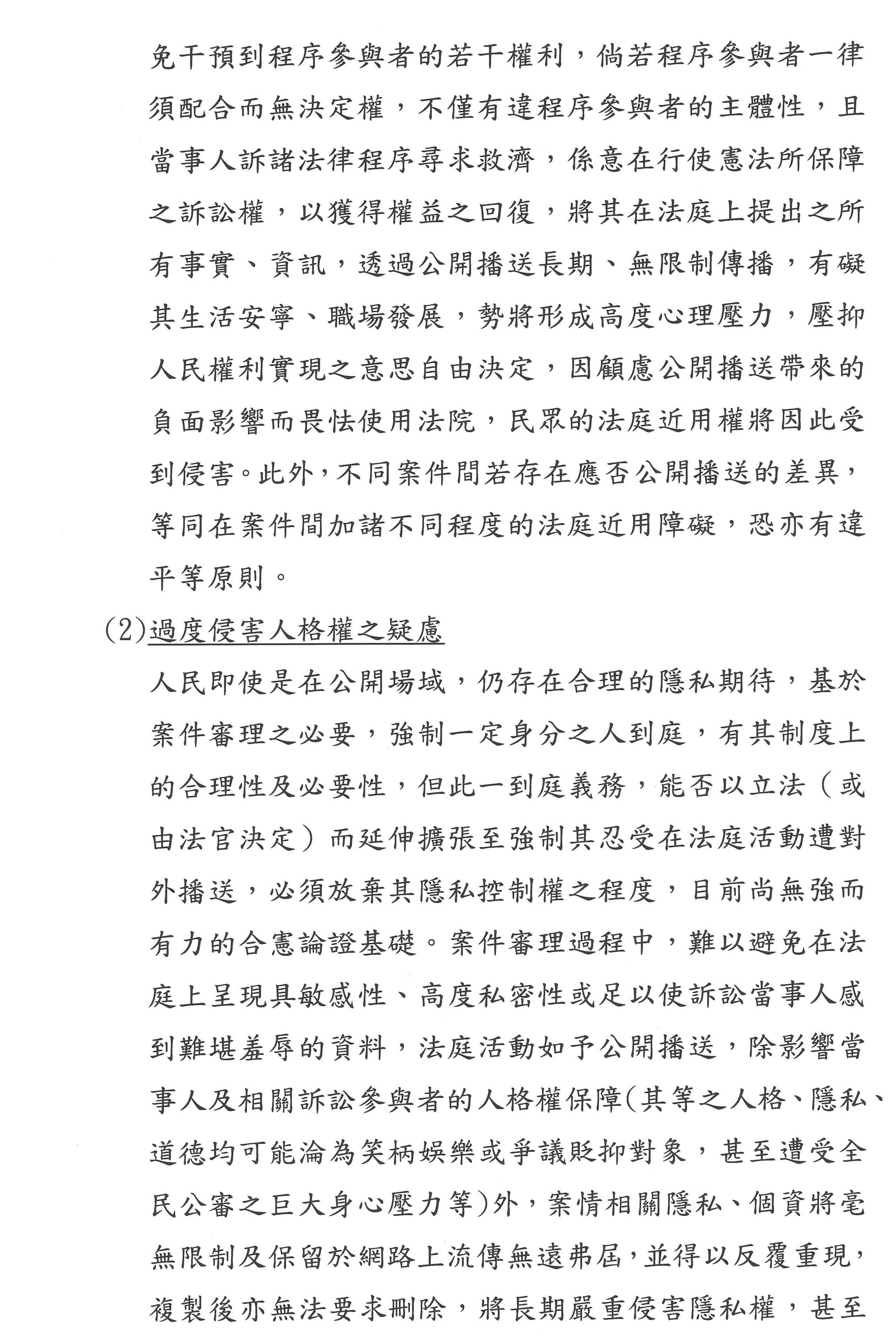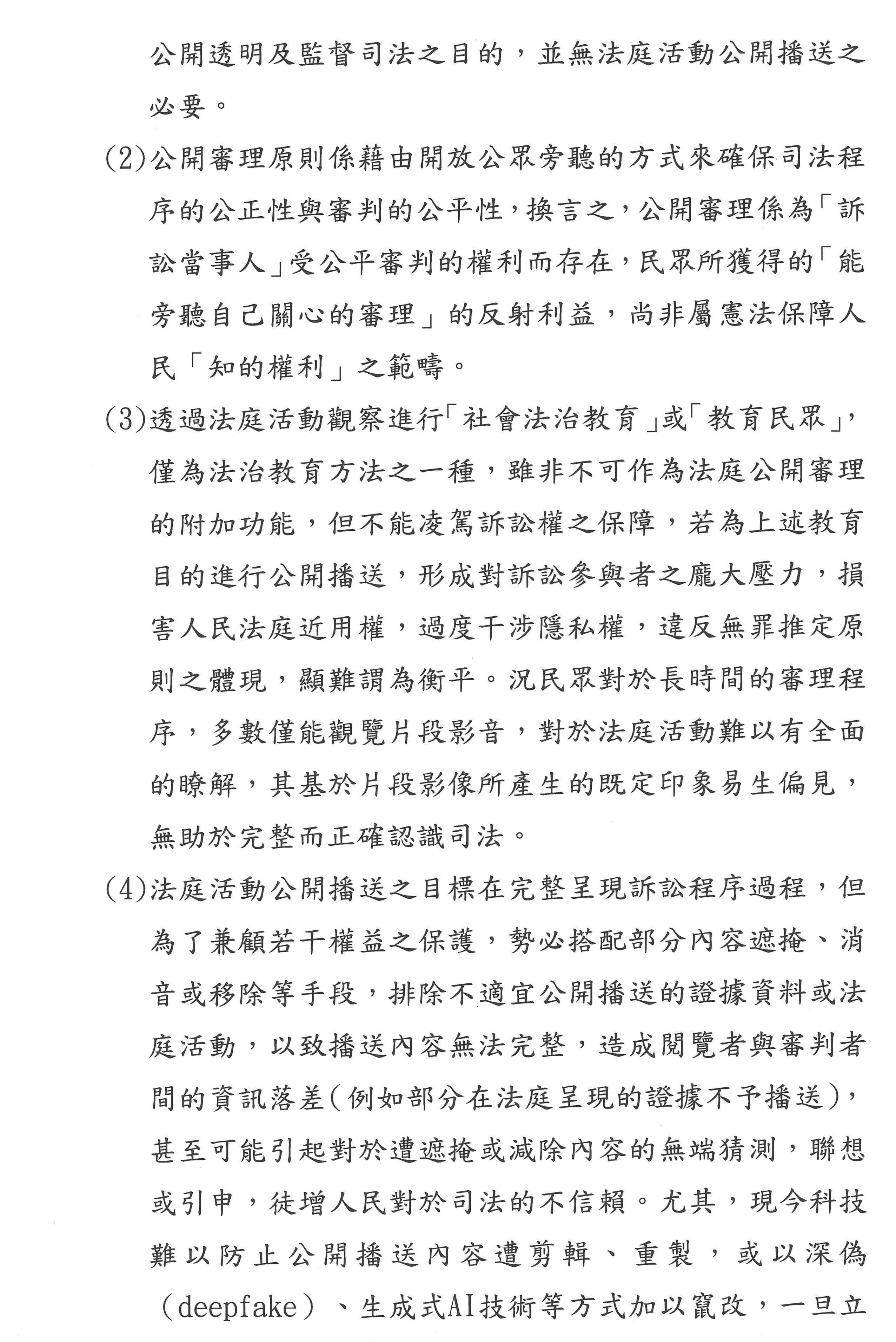 第二個是公平審判,剛才王副秘書長也特別提到,如果所有參與法庭活動的人還要承受直播帶來的壓力,有一些心證的形成或許會受到影響,這已經剝奪了被告公平審判的權利。
