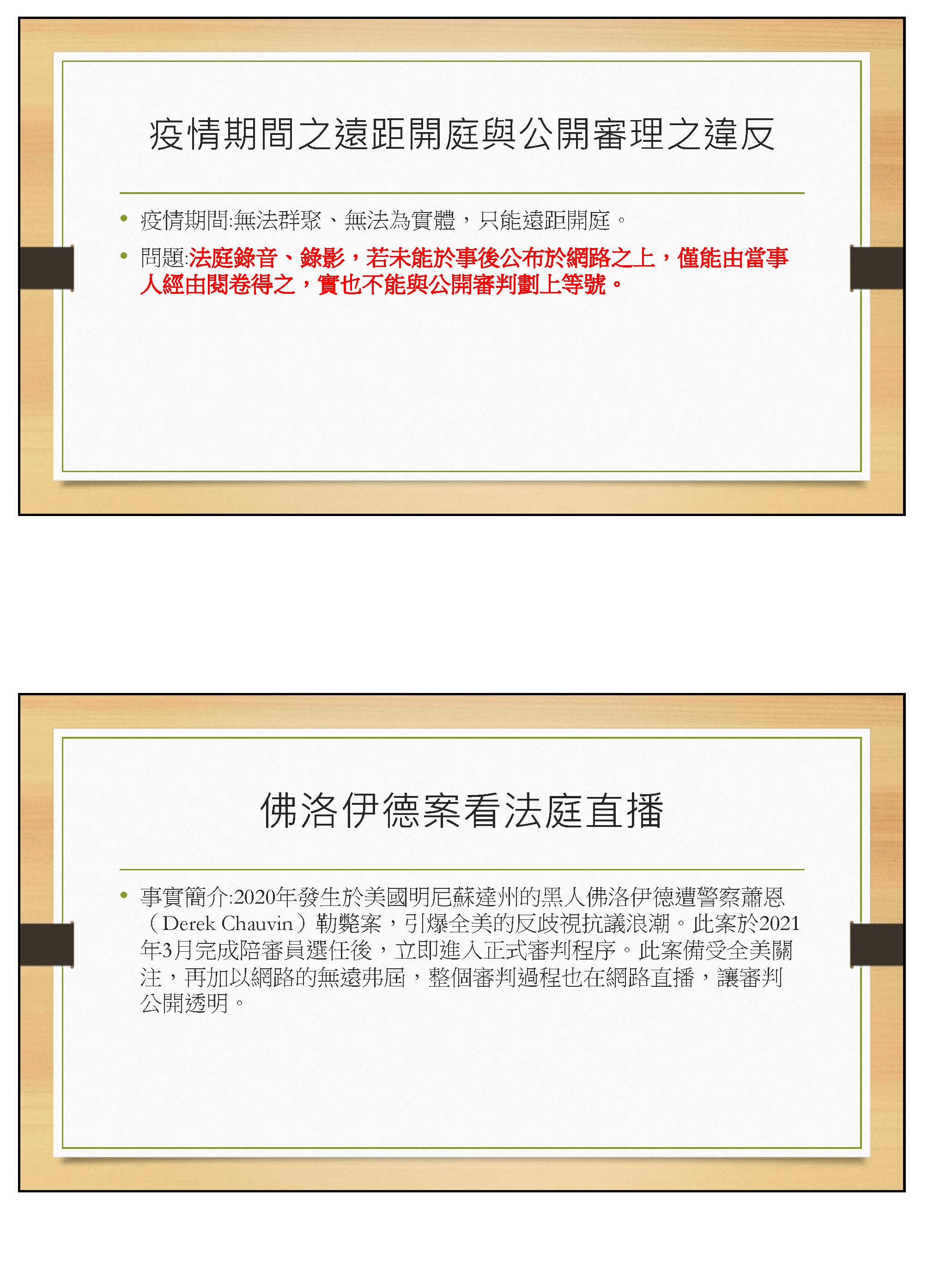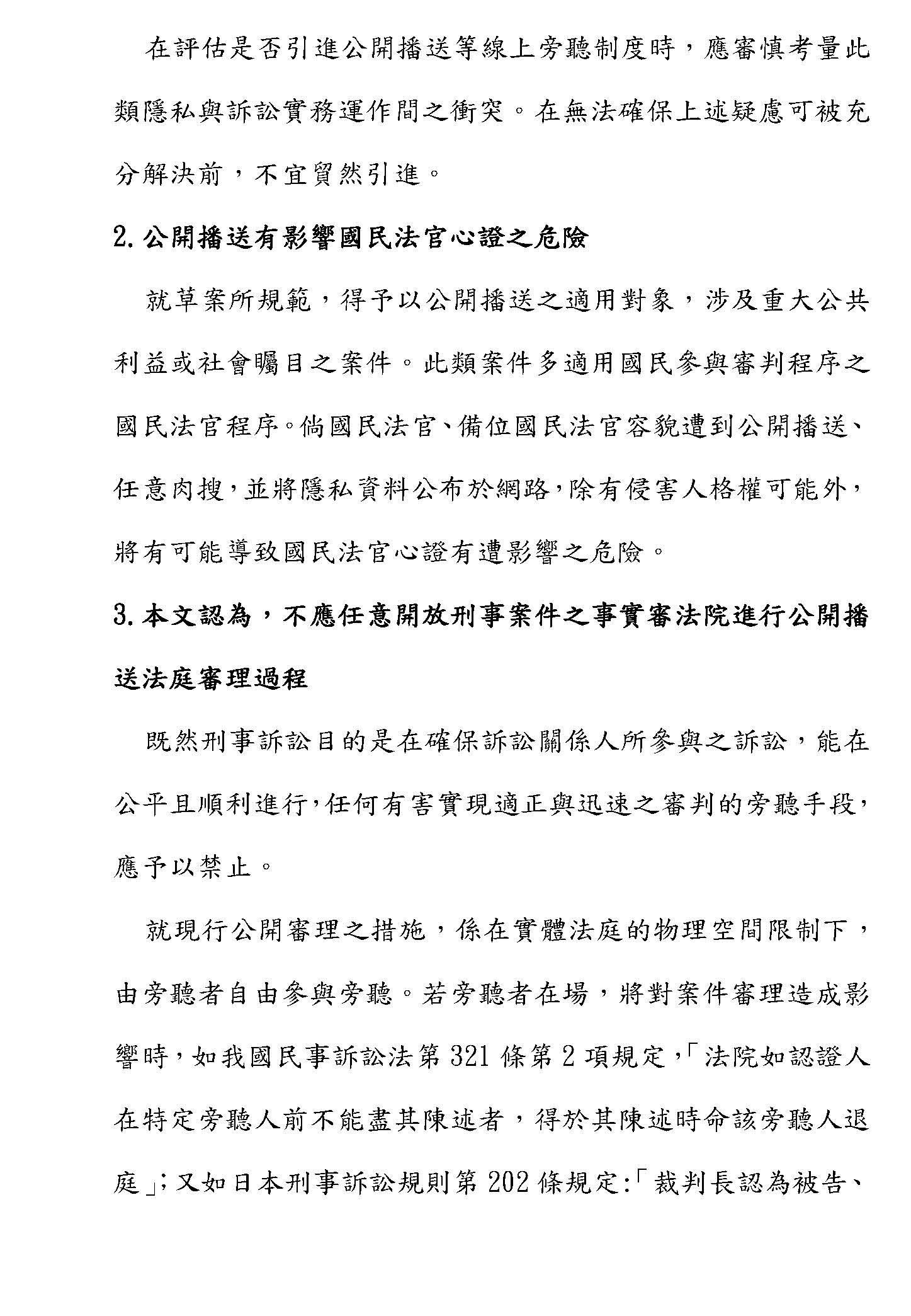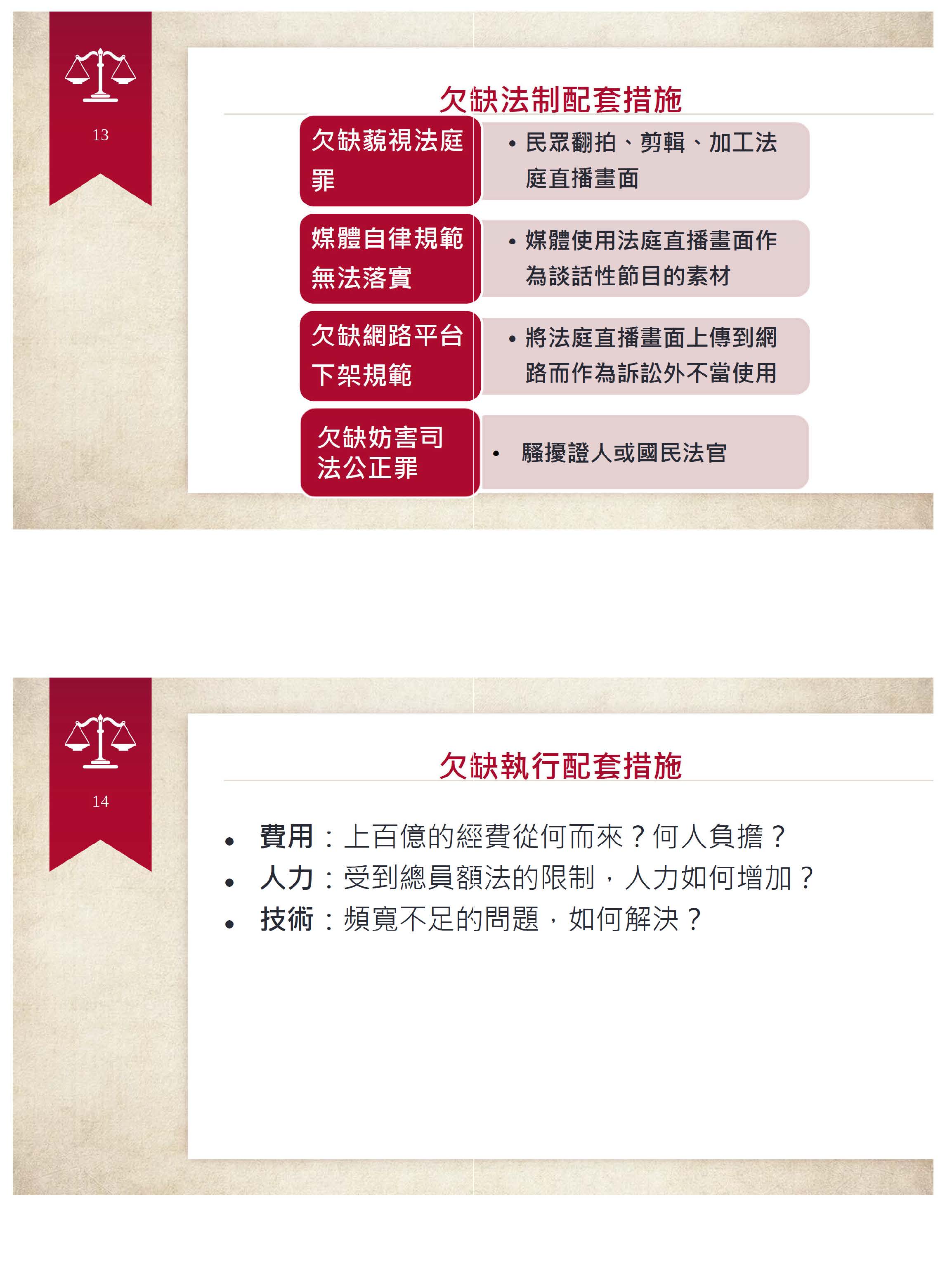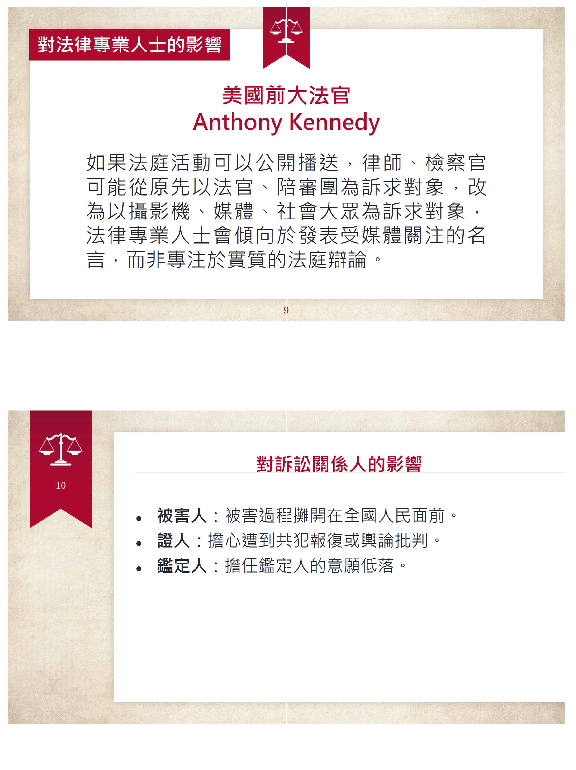 第二個是公平審判,剛才王副秘書長也特別提到,如果所有參與法庭活動的人還要承受直播帶來的壓力,有一些心證的形成或許會受到影響,這已經剝奪了被告公平審判的權利。