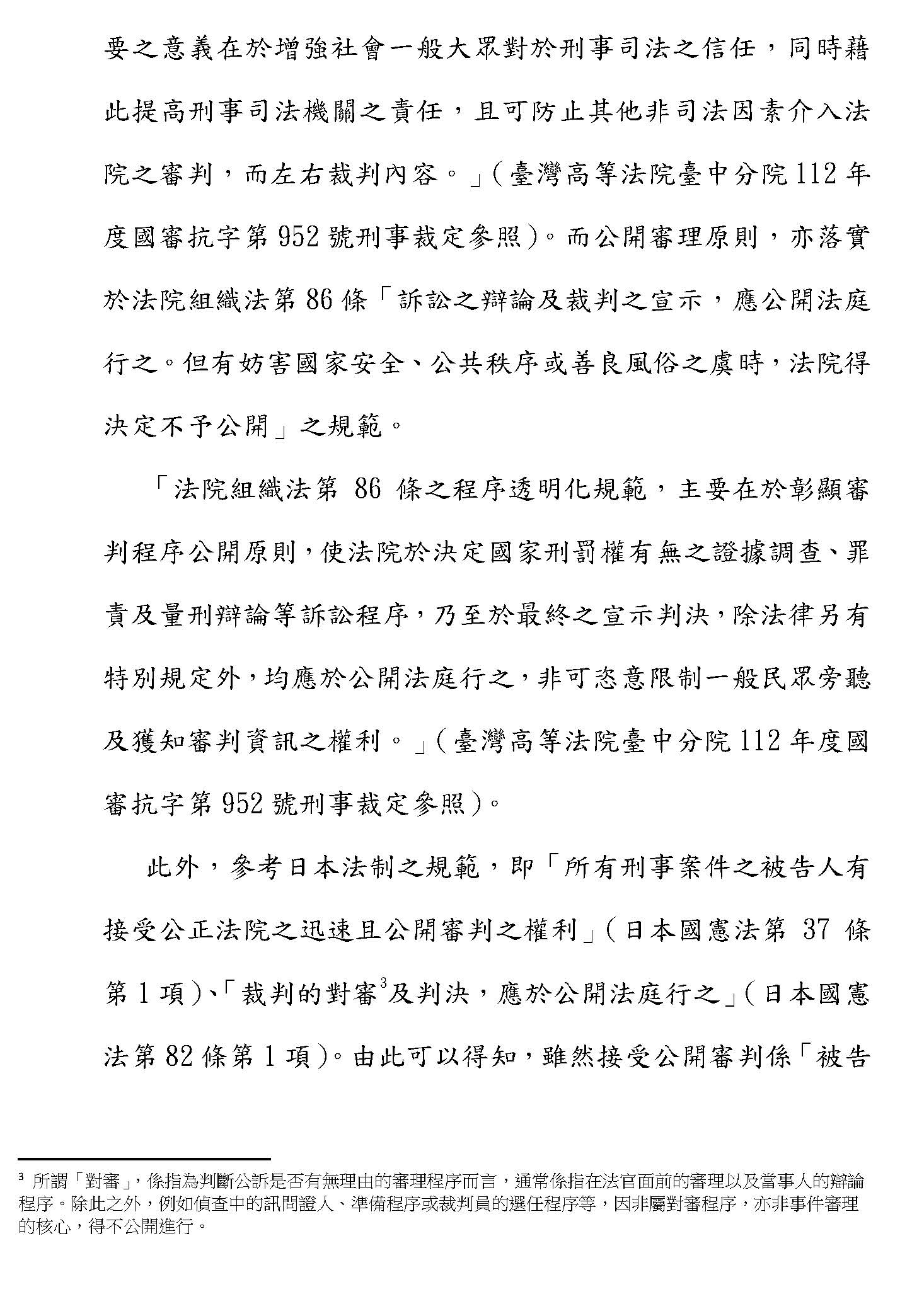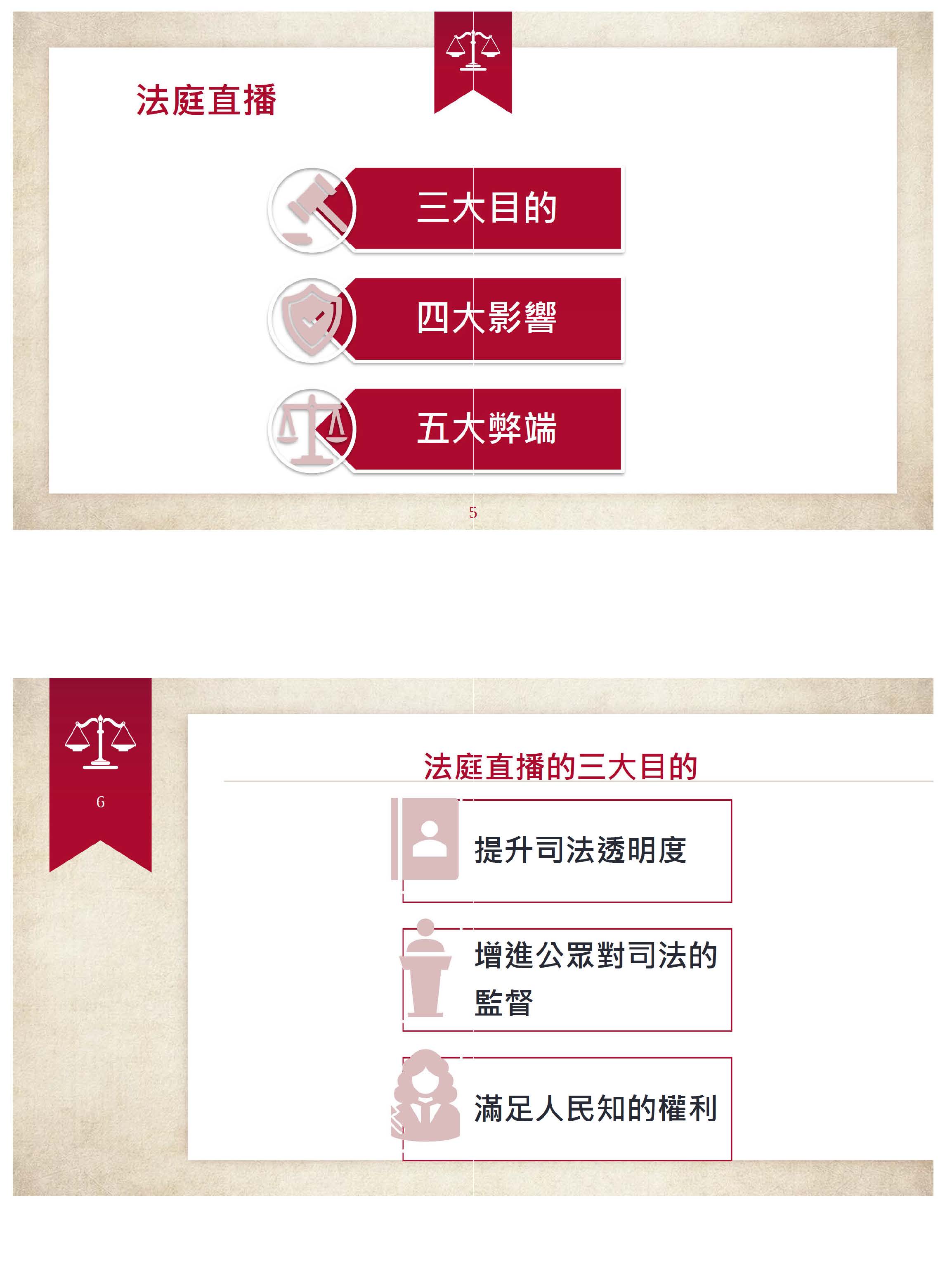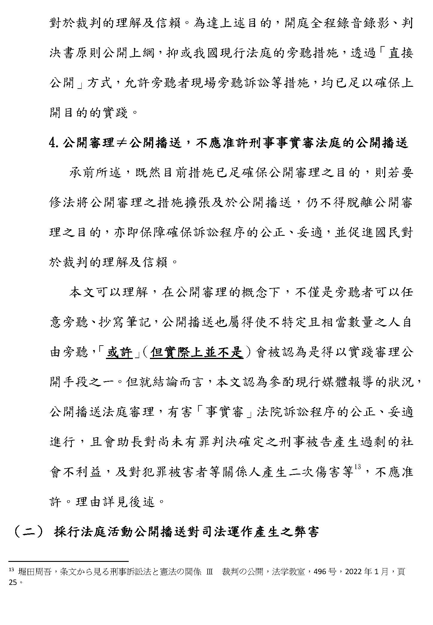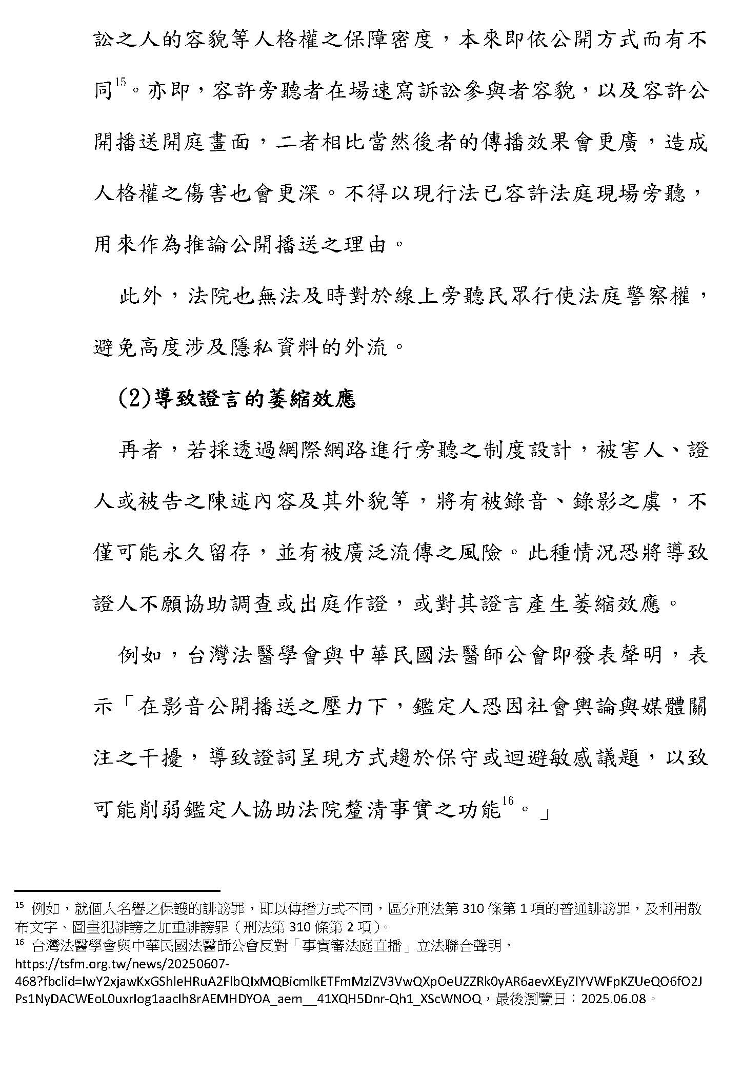 第二個是公平審判,剛才王副秘書長也特別提到,如果所有參與法庭活動的人還要承受直播帶來的壓力,有一些心證的形成或許會受到影響,這已經剝奪了被告公平審判的權利。
