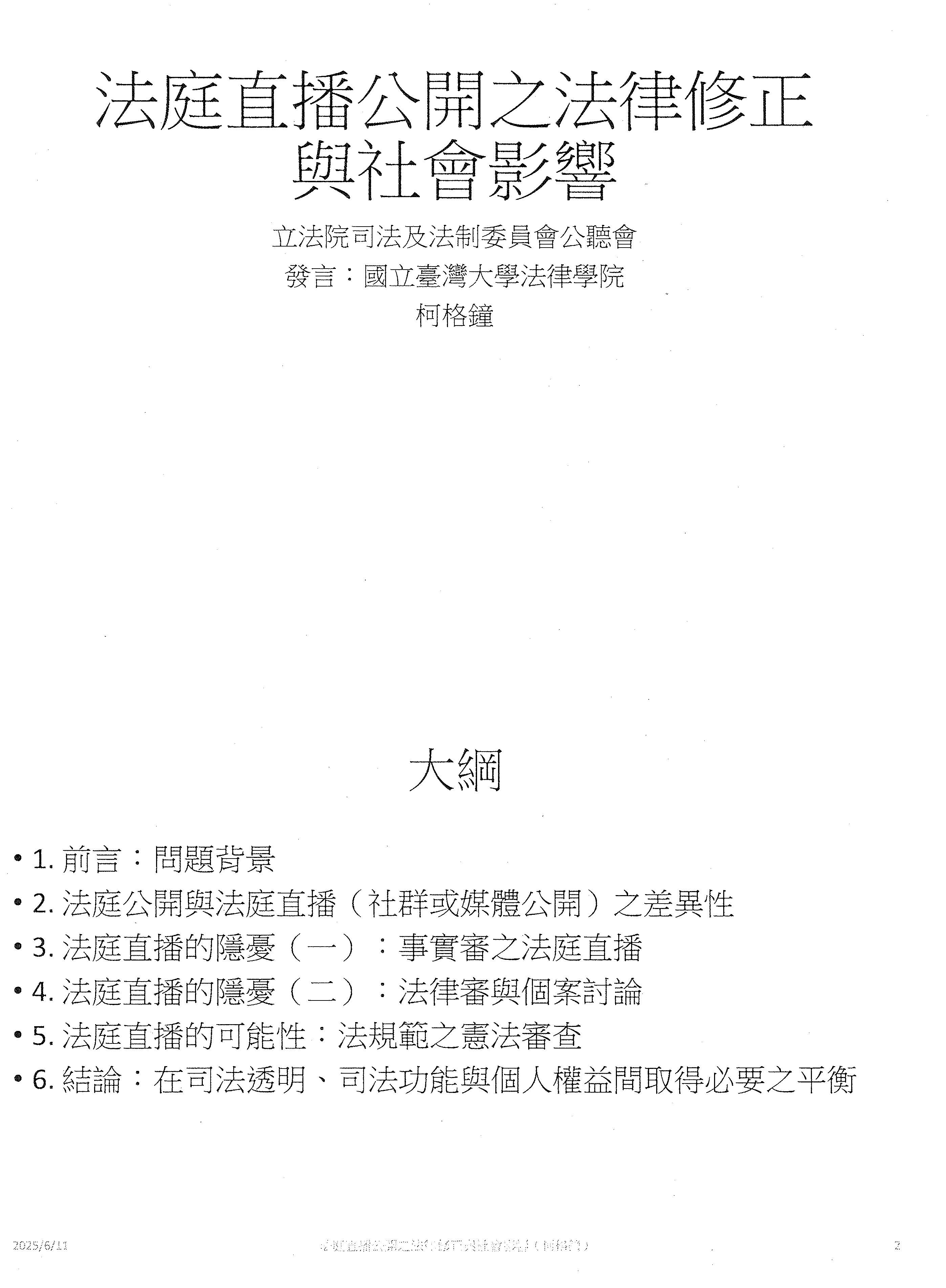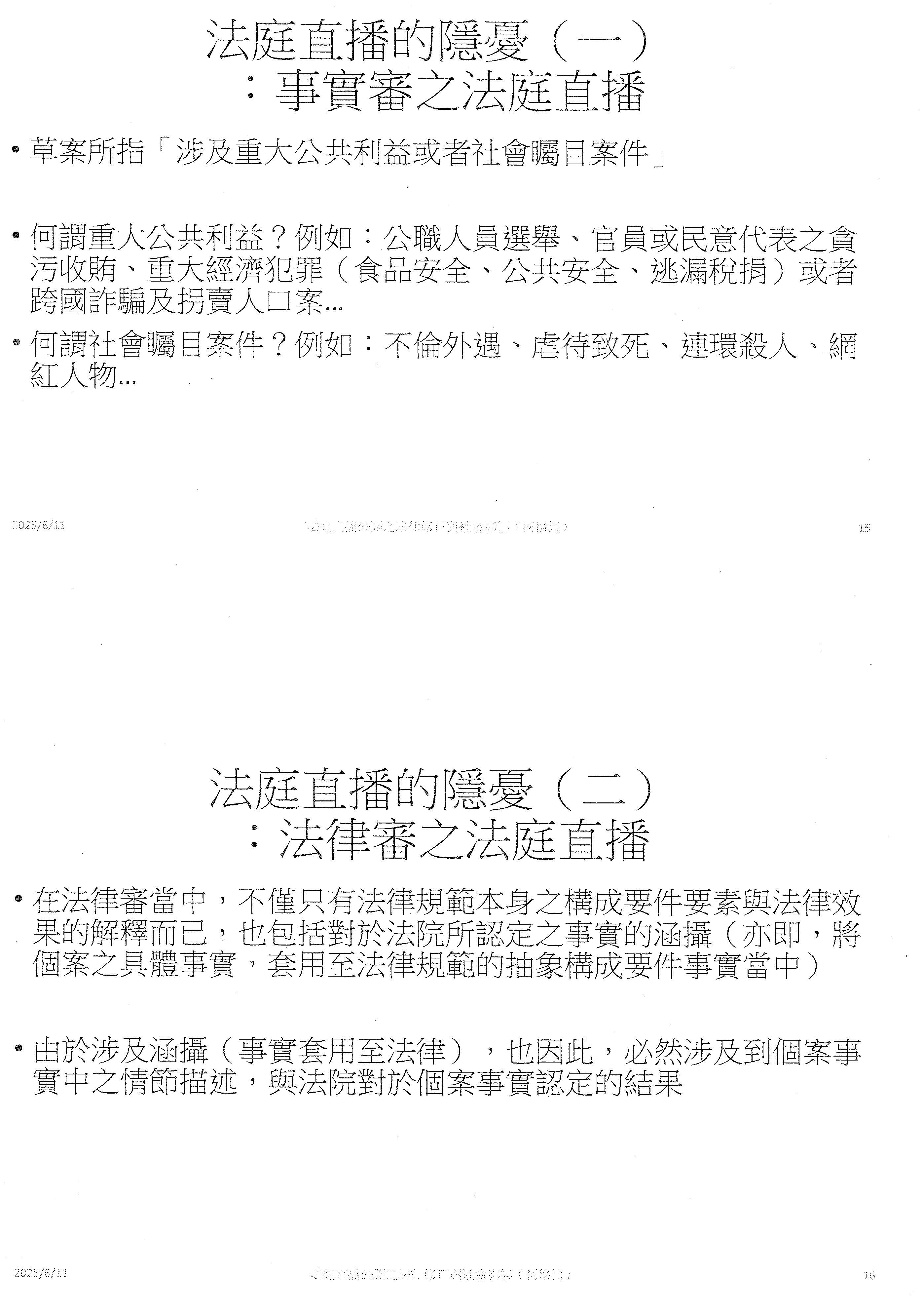 臺灣要推動法庭直播,我支持的層次是限縮於高度法律性的案件,不涉及事實審、不涉及證據調查,而且是單純就法論法的法律攻防論戰,這時候的直播是有意義的。尤其最近司法院也做了很重要的司法院大法庭的處理,針對詐騙集團車手的犯罪所得要如何認定有三派說法,我覺得這種討論就很適合直播,因為社會也需要知道被害人如何對詐騙集團的犯罪所得進行追償,這個部分確實是有教育意義,我覺得像這種裁示直播是好的。如果以今天民眾黨黃國昌這樣的法案來看,到了地方法院、高等法院,無論是民事或刑事,只要是社會矚目就要直播,這個不通啦!事實上,這樣的修法也是害到柯文哲,我們請民眾黨三思,這樣對柯文哲好嗎?謝謝。