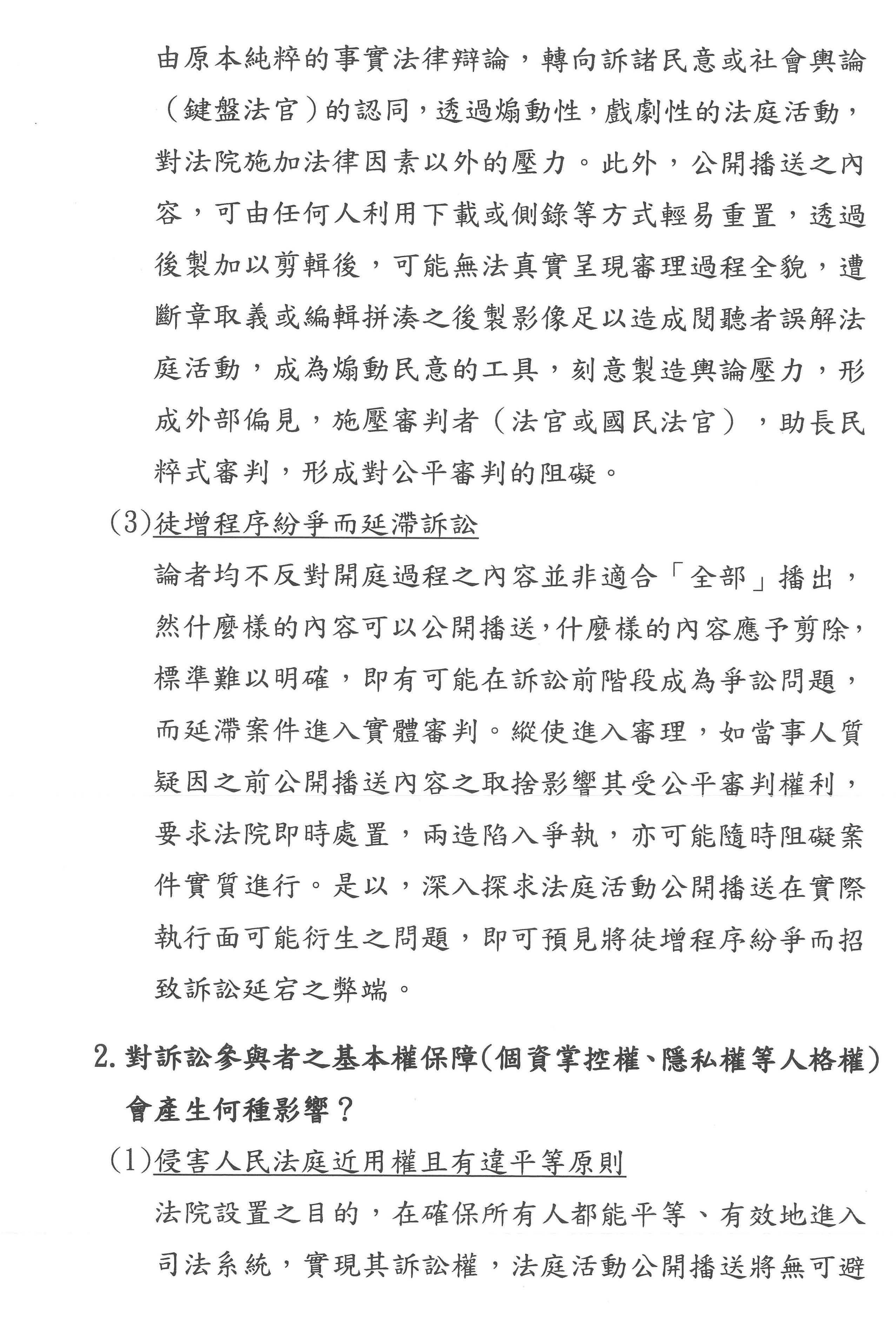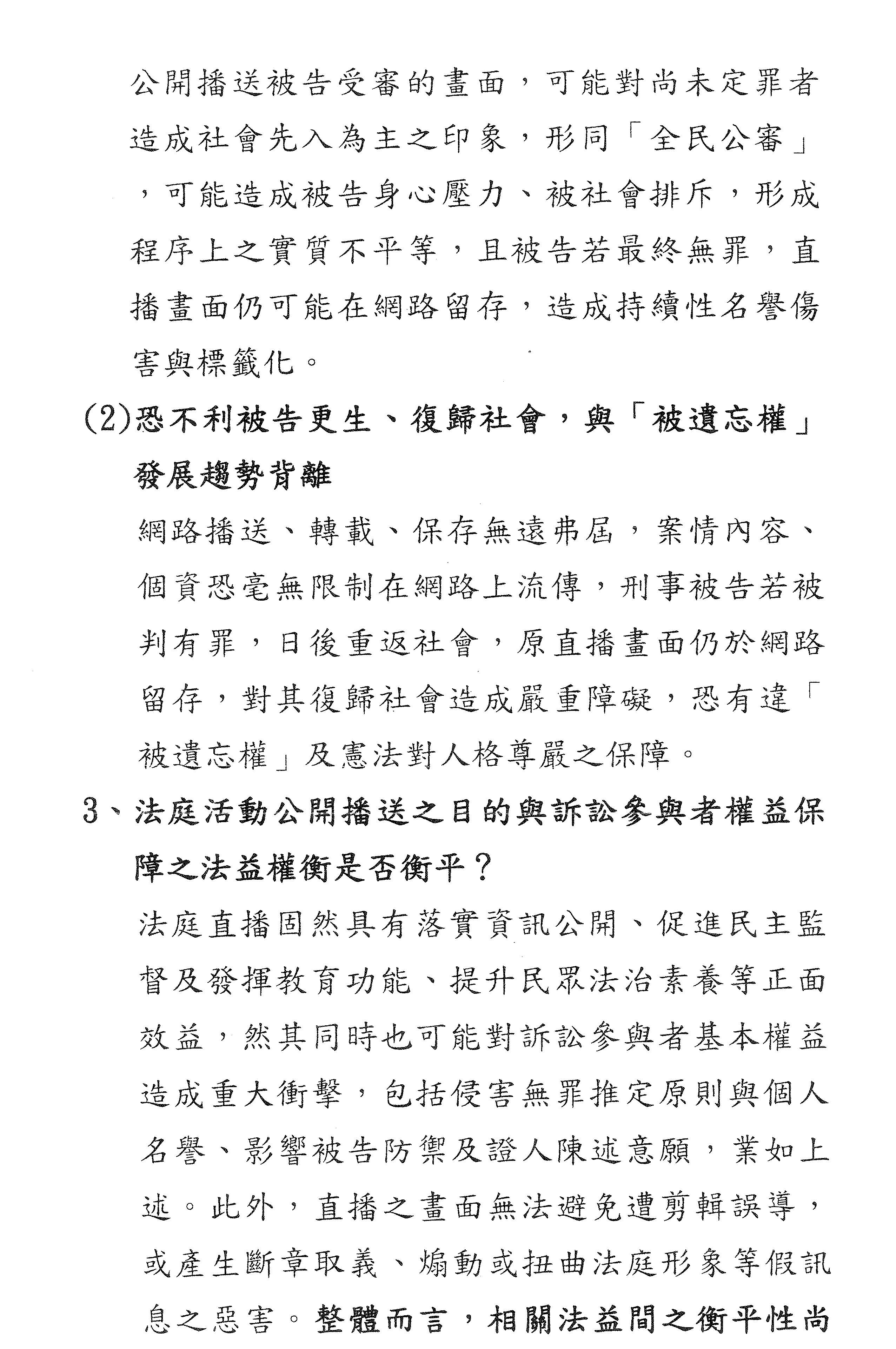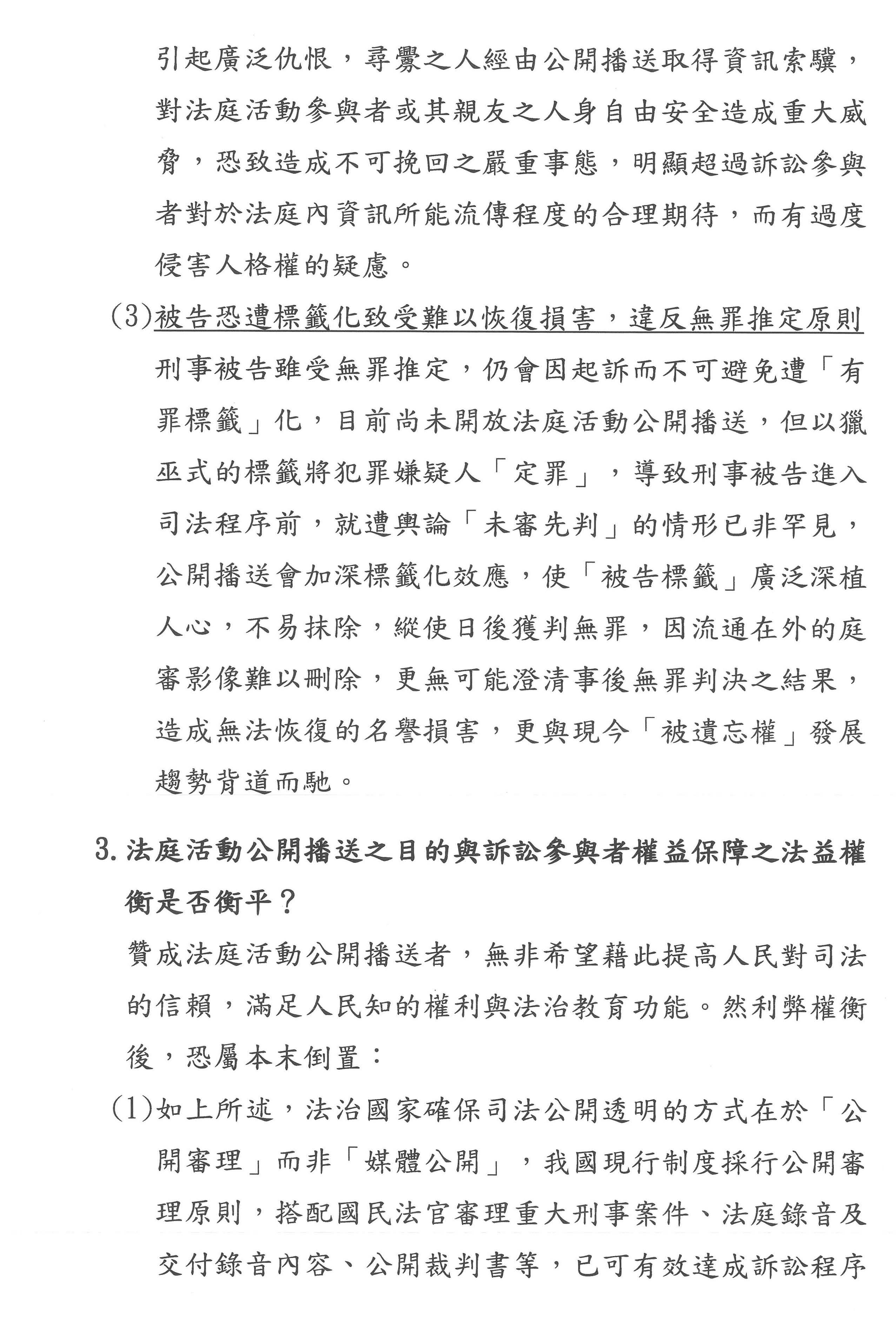 第三個是對訴訟參與者基本權的侵害,我們都知道被告有無罪推定原則,今天就很擔心當案子到法庭審理的時候,所有的輿論都認為他有罪,即使他再怎麼講,網路每天播出來的內容都是這個人罪大惡極,等到有一天他獲得無罪判決,我認為全國的人都不會相信他是無罪的,就算他再怎麼說都沒有用,因為他已經被公審了。換一個角度來看,如果今天他是有罪的,剛剛許多委員提出的都是有罪的案例,如果他是有罪的,我們也要讓他能夠更生啊!我們也要讓他重新回歸社會啊!但是今天你都已經將他標籤化了,他要如何回歸社會?這個紀錄會一輩子跟著他,因此,這個對於他的人權一定會有傷害,更何況所有參與者的隱私權也都會被攤出來,對於憲法保障的基本人權是有妨礙的。
