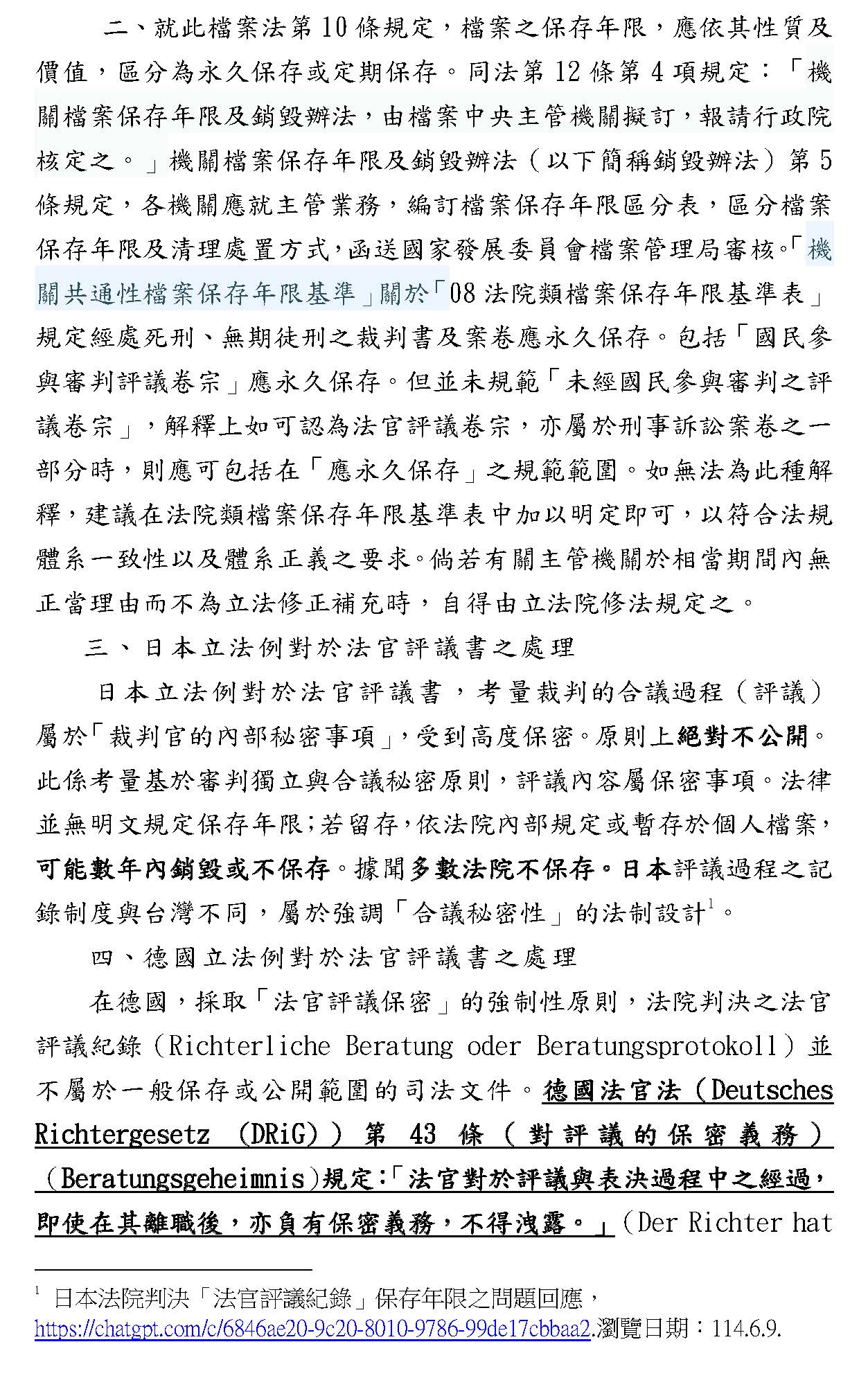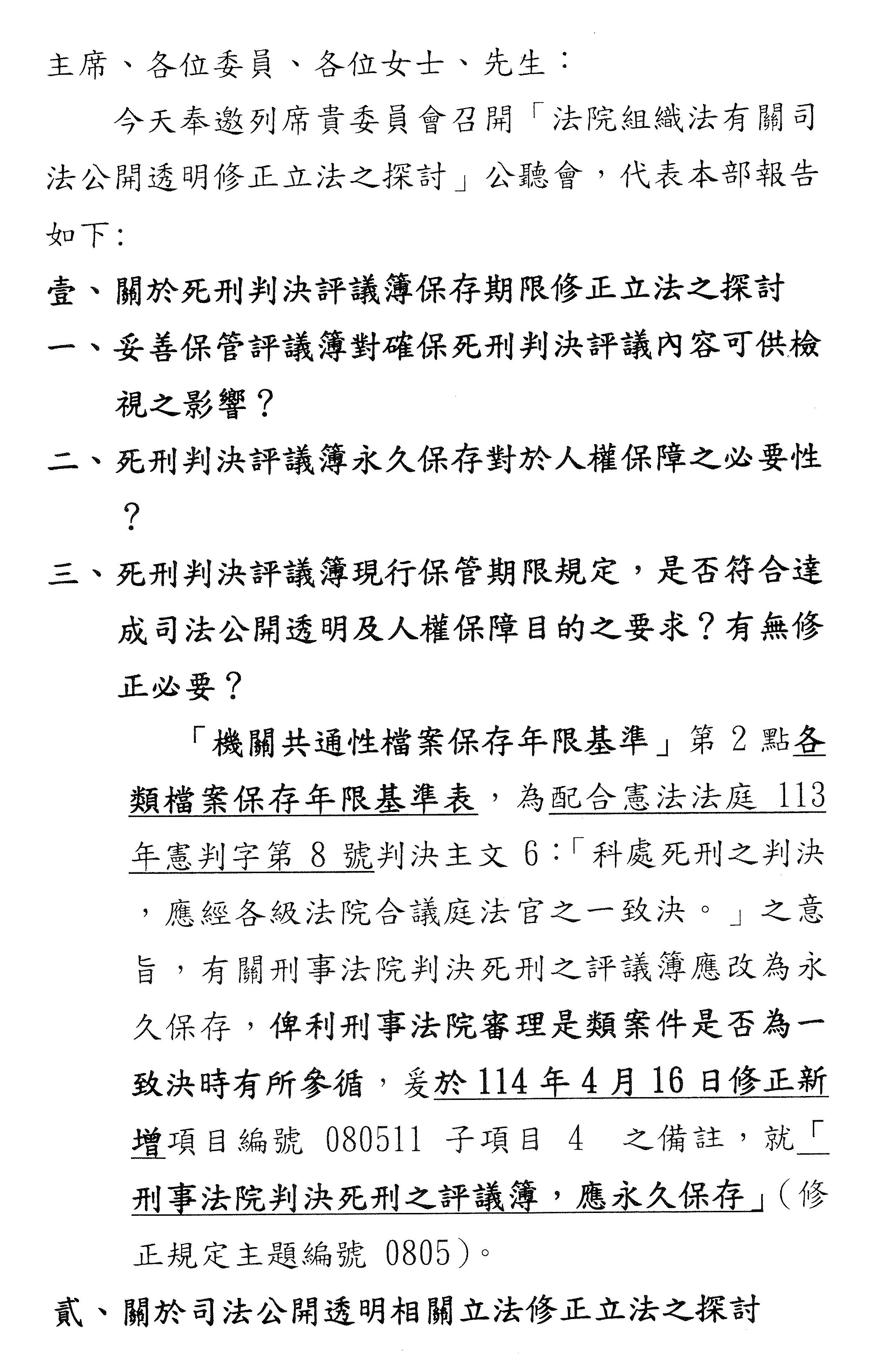 三、死刑判決評議簿現行保管期限規定,是否符合達成司法公開透明及人權保障目的之要求?有無修正必要?