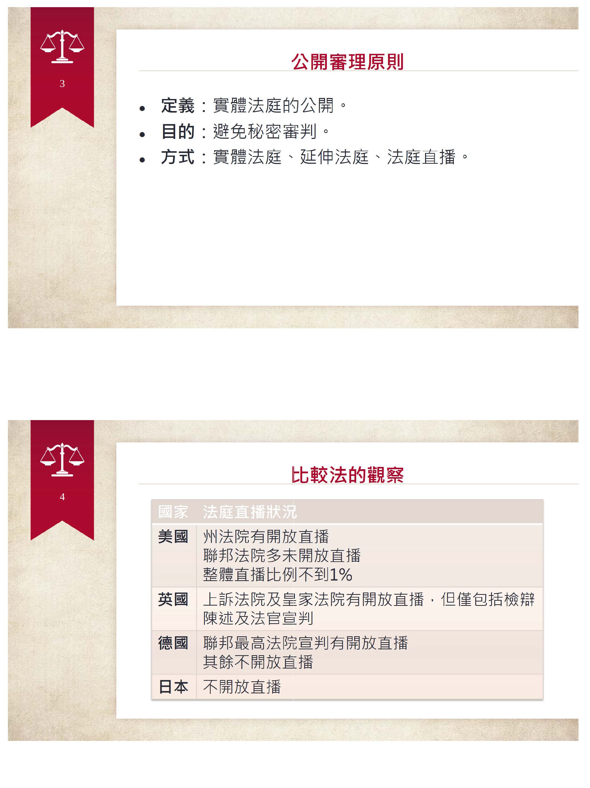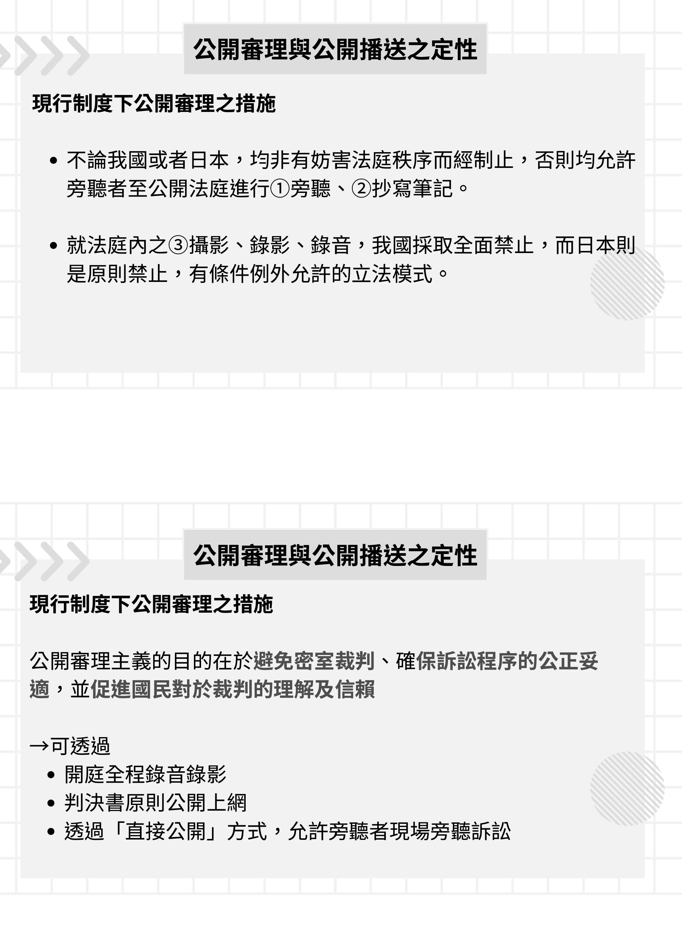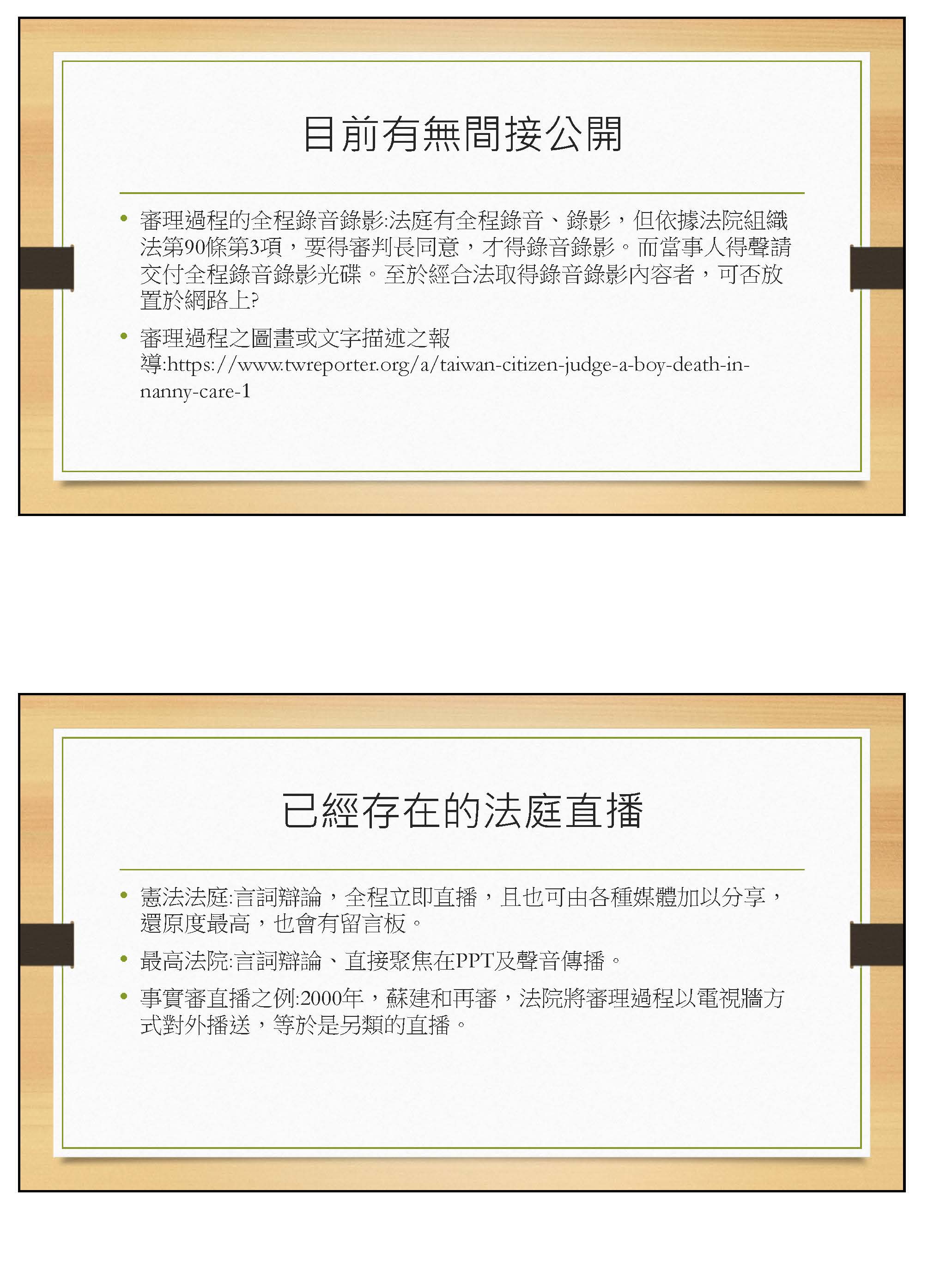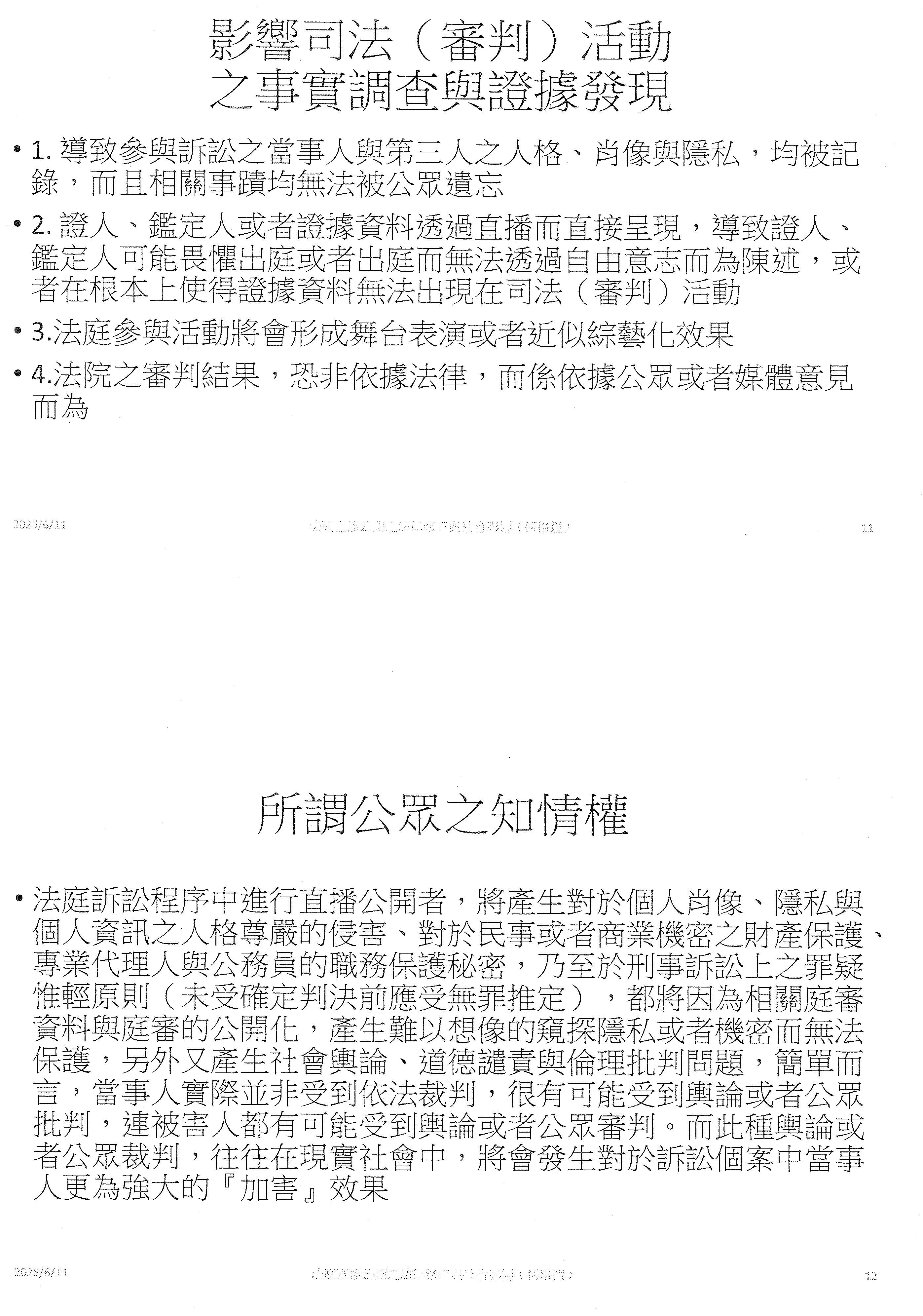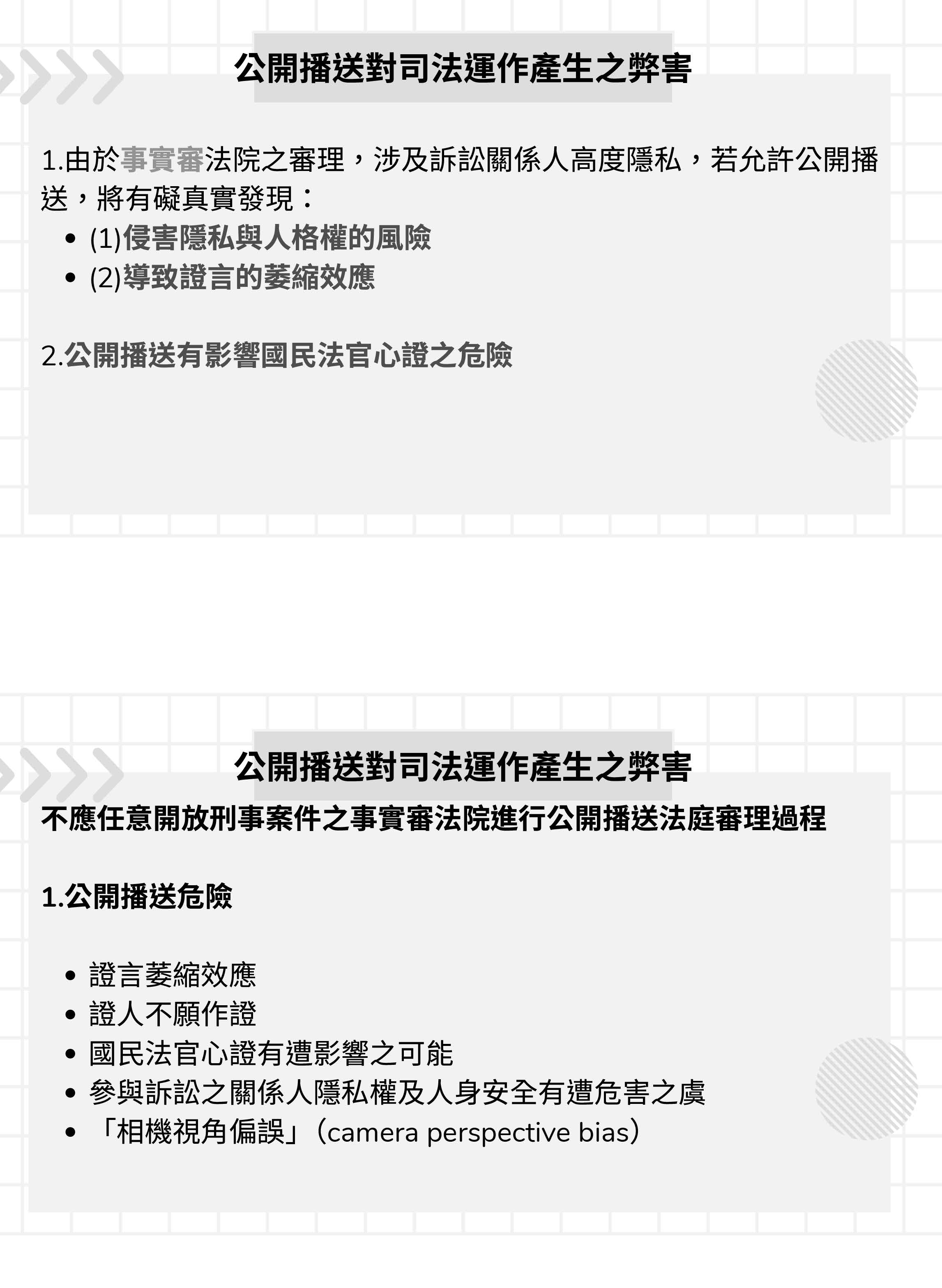 我們可以看一下這次在野黨提出的法院組織法第九十條,在關係文書裡面是說,事實審的法庭活動直播是原則不公開播送,例外公開。因為目前這些相關的配置規套在法條裡面其實是很概括的,我們看不出來,但是我們可以看一下立法理由,它說:主要是權衡、捍衛人民知的權利,我們知道這個知的權利其實就是憲法上保障言論自由的一環,人民有獲知資訊的權利。但是在審判的法庭活動裡面,我們仍然要兼顧很多其他在憲法上面保障的基本價值,也就是要公平審判,同時要兼顧這一些訴訟程序的參與者、使用者的相關權益。