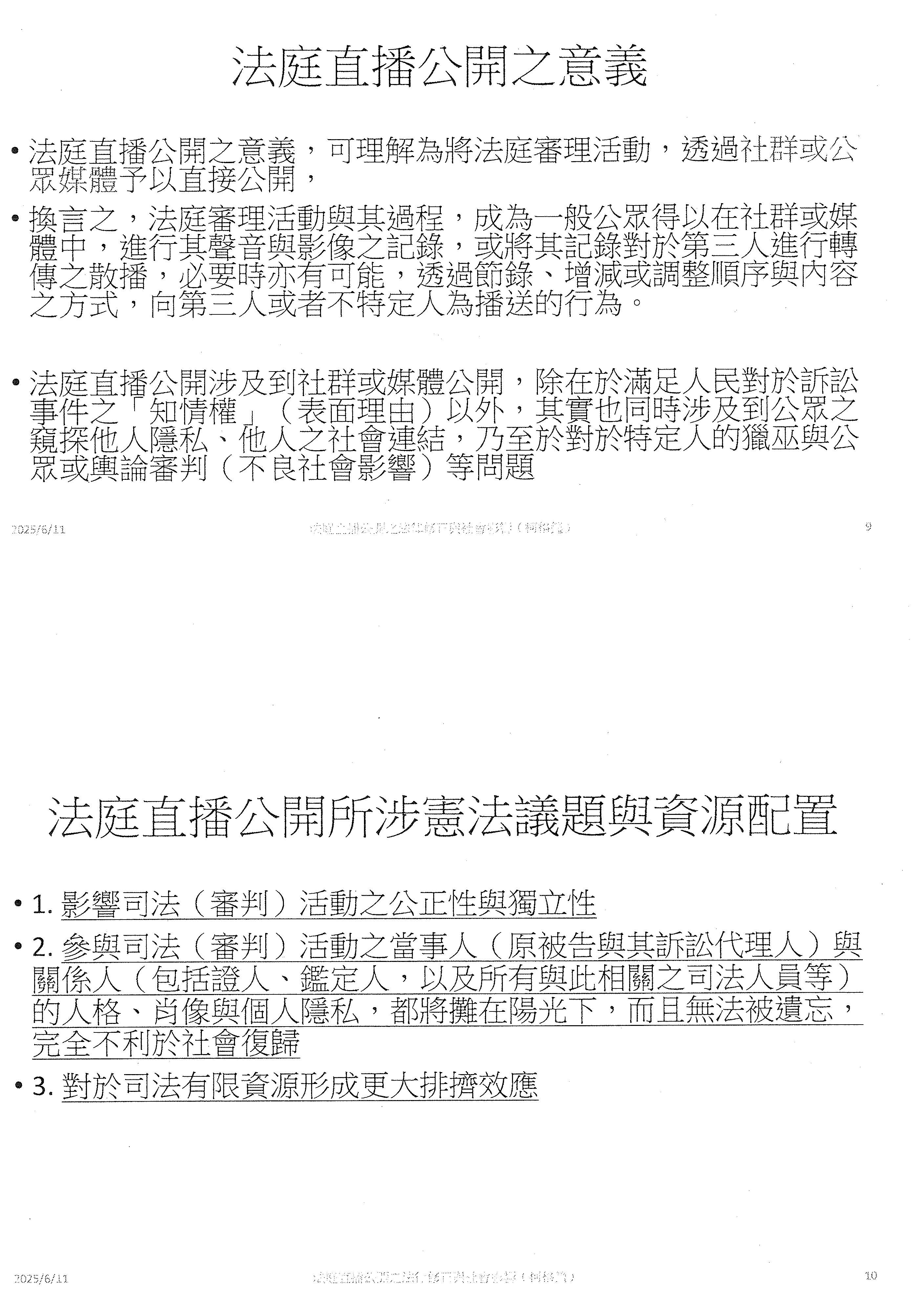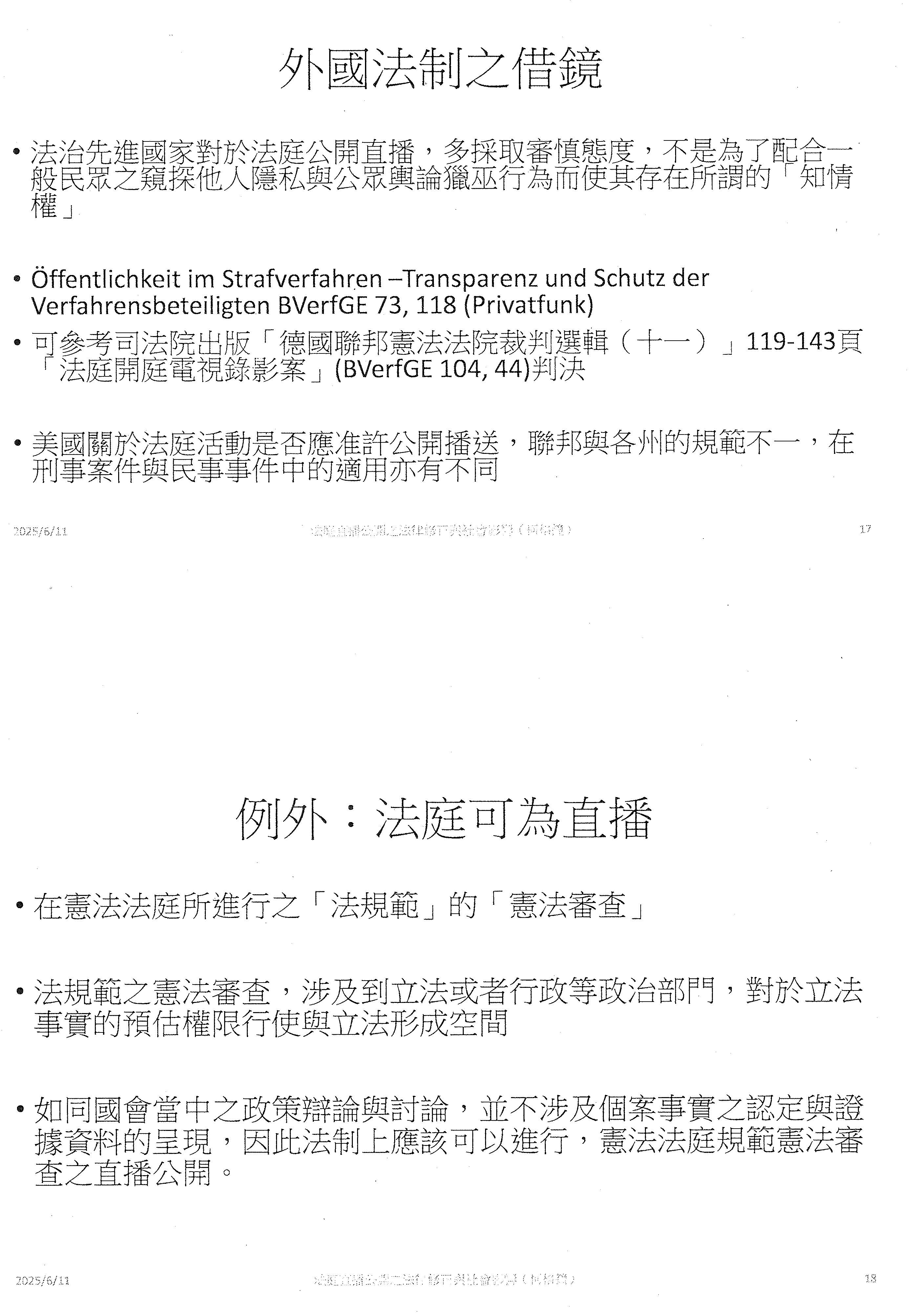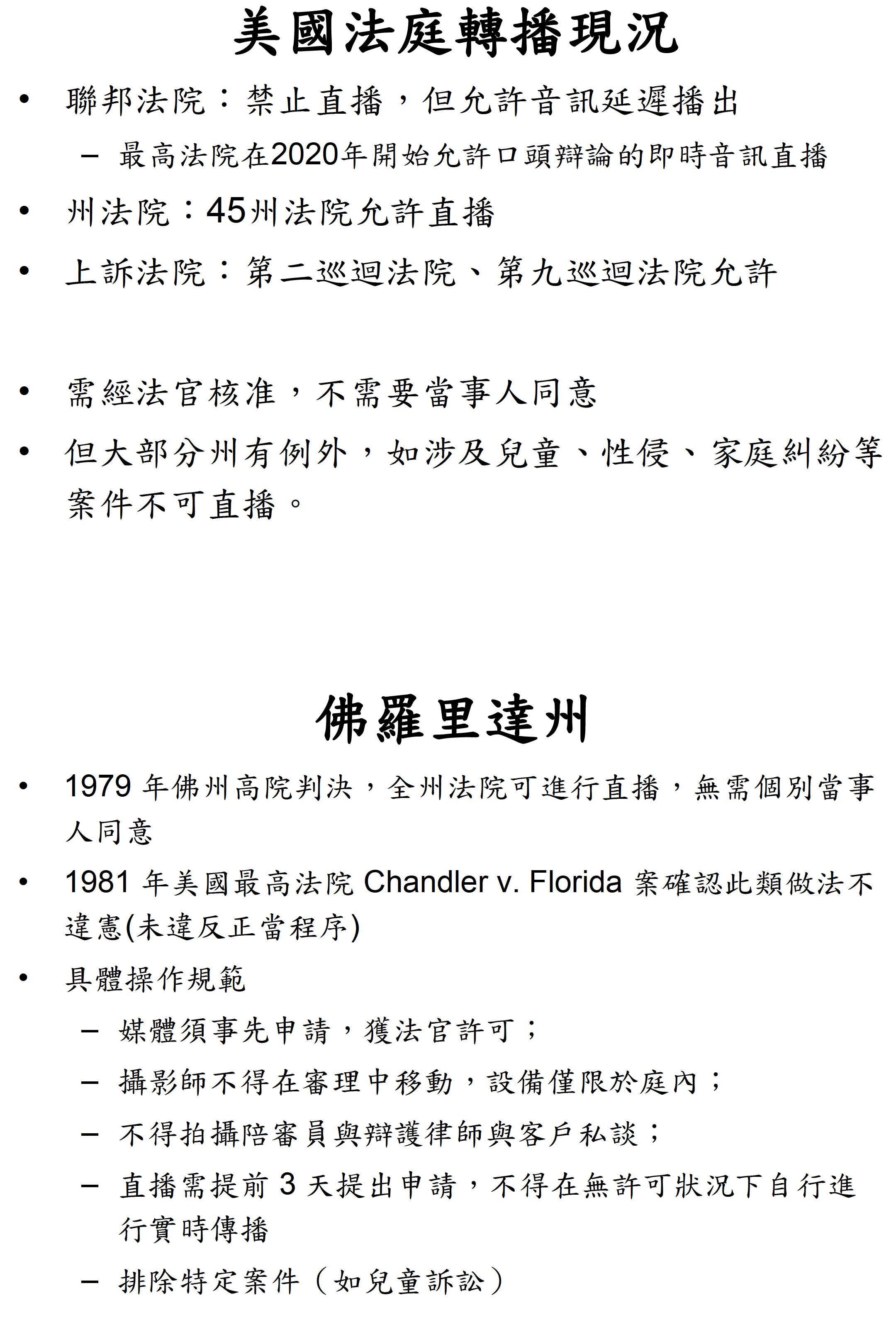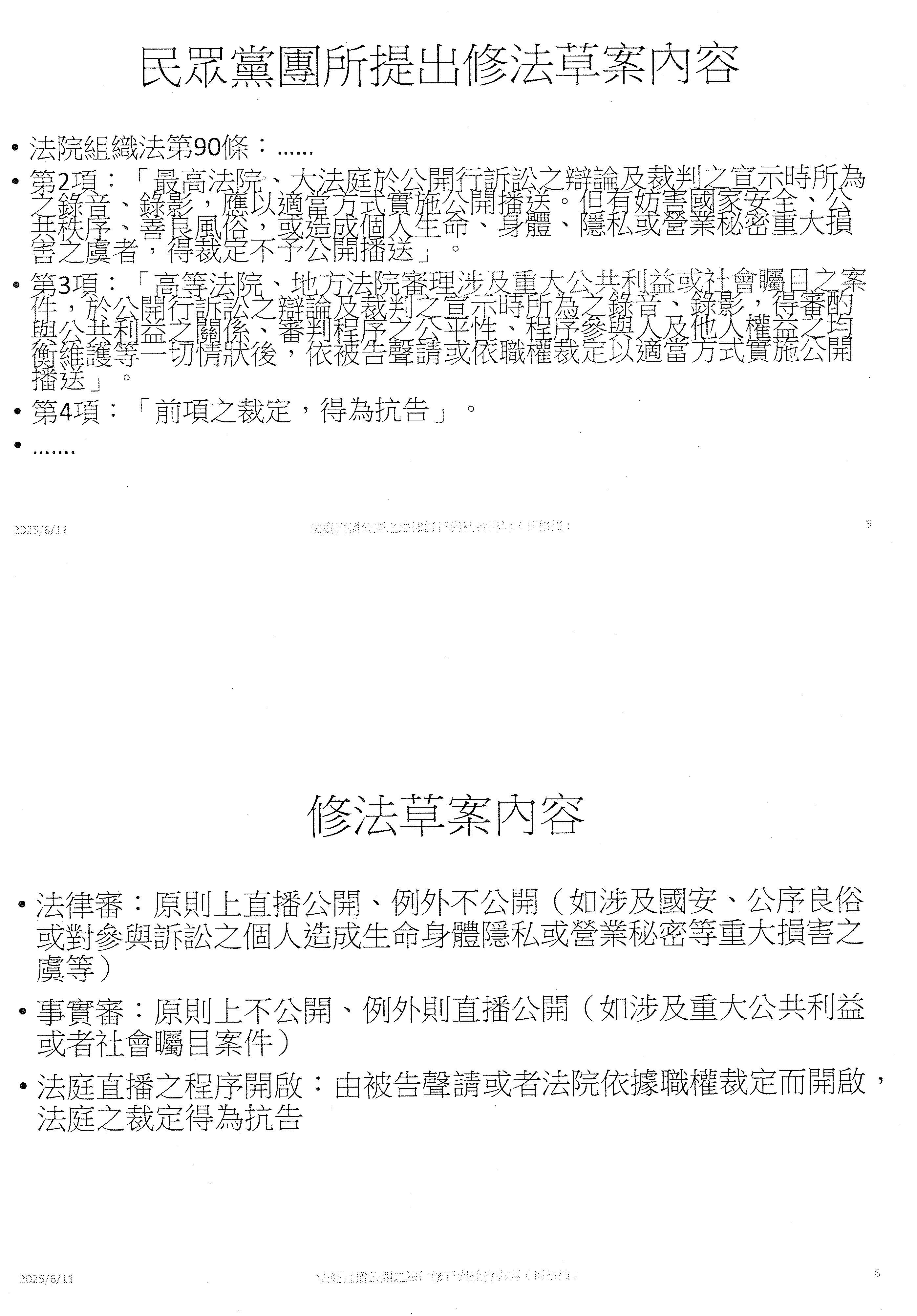 我們可以看一下這次在野黨提出的法院組織法第九十條,在關係文書裡面是說,事實審的法庭活動直播是原則不公開播送,例外公開。因為目前這些相關的配置規套在法條裡面其實是很概括的,我們看不出來,但是我們可以看一下立法理由,它說:主要是權衡、捍衛人民知的權利,我們知道這個知的權利其實就是憲法上保障言論自由的一環,人民有獲知資訊的權利。但是在審判的法庭活動裡面,我們仍然要兼顧很多其他在憲法上面保障的基本價值,也就是要公平審判,同時要兼顧這一些訴訟程序的參與者、使用者的相關權益。