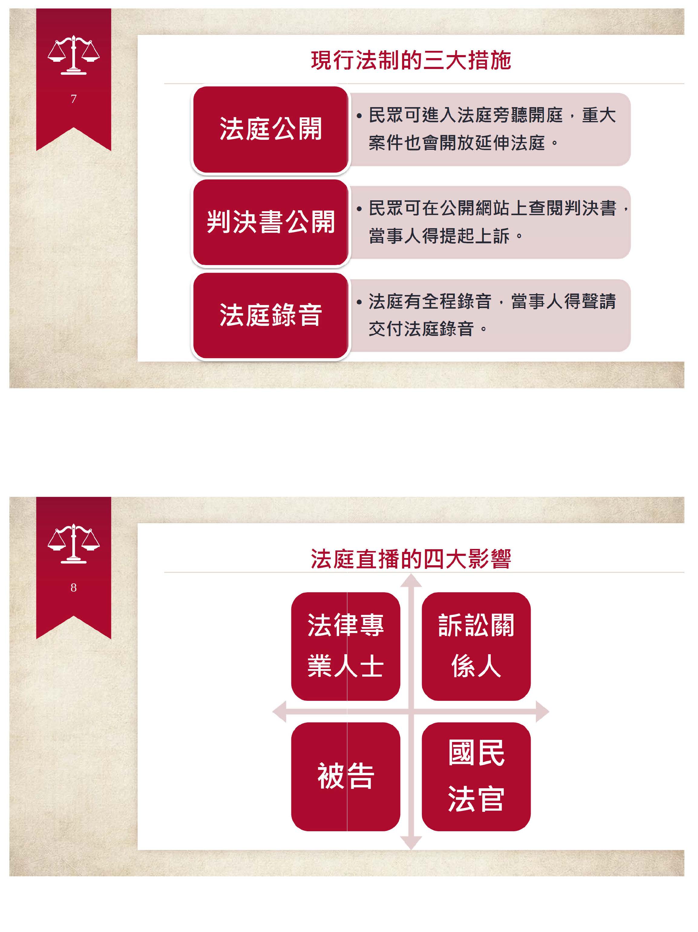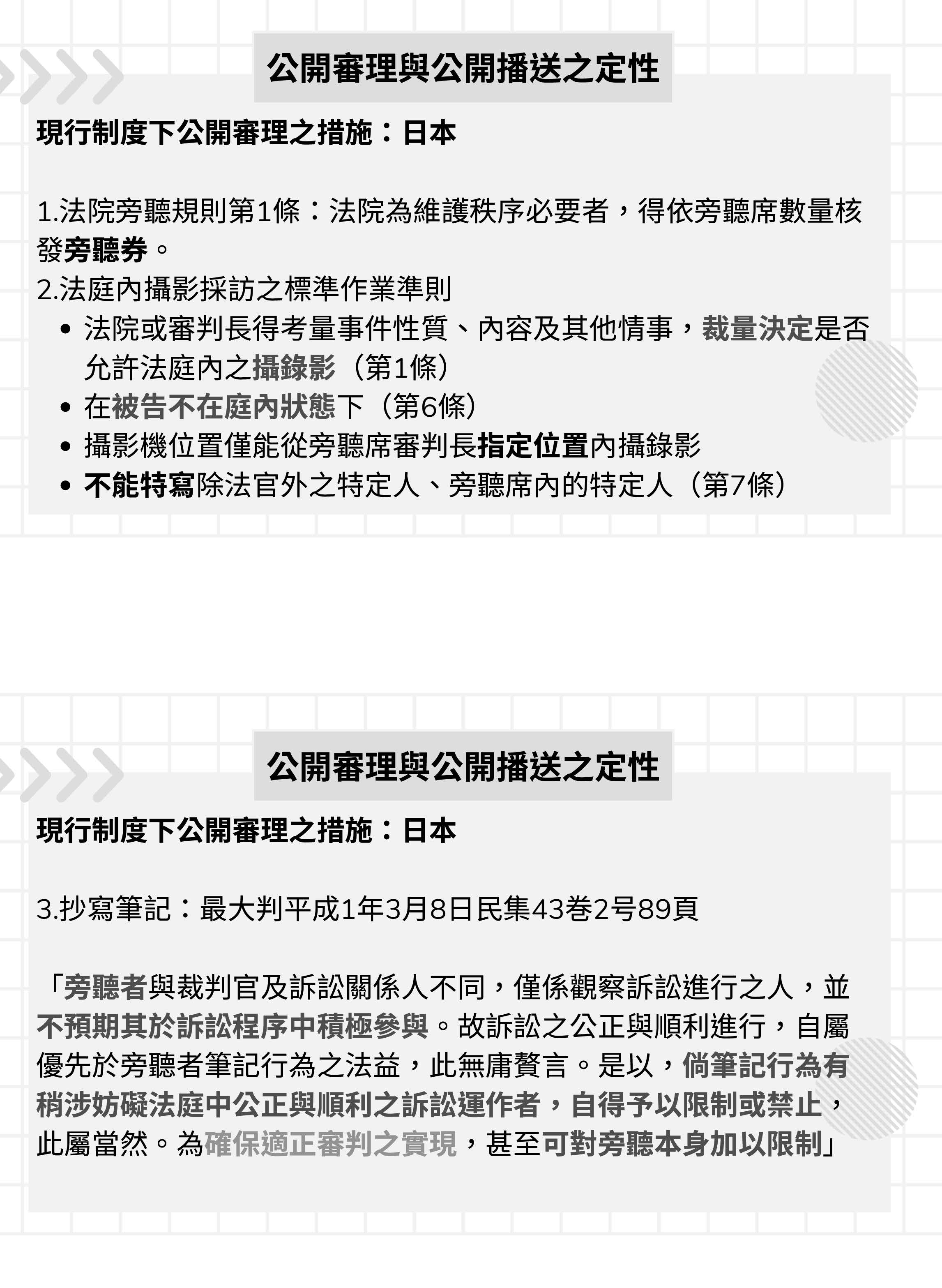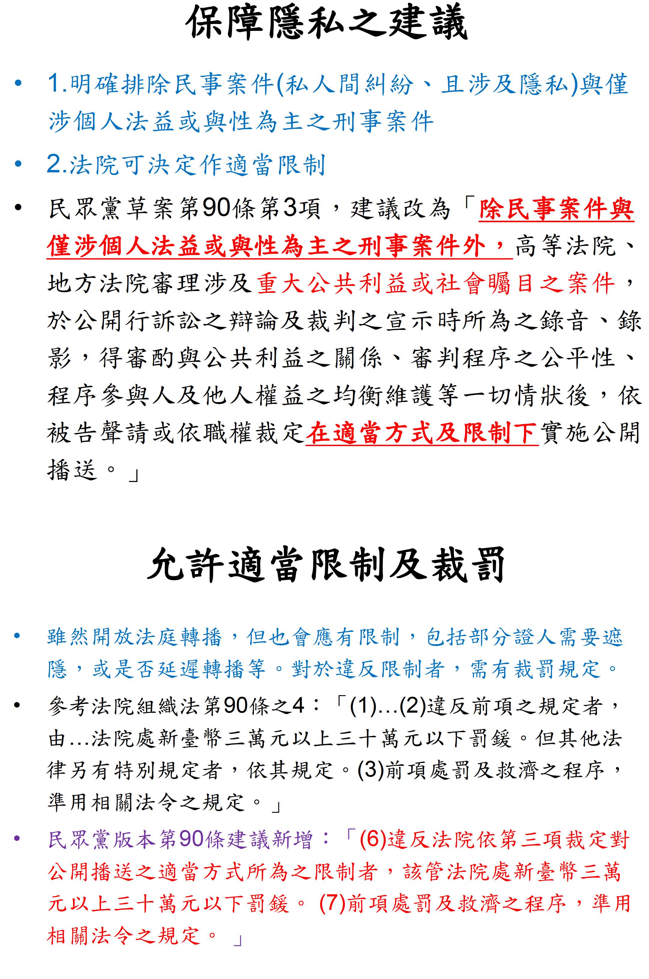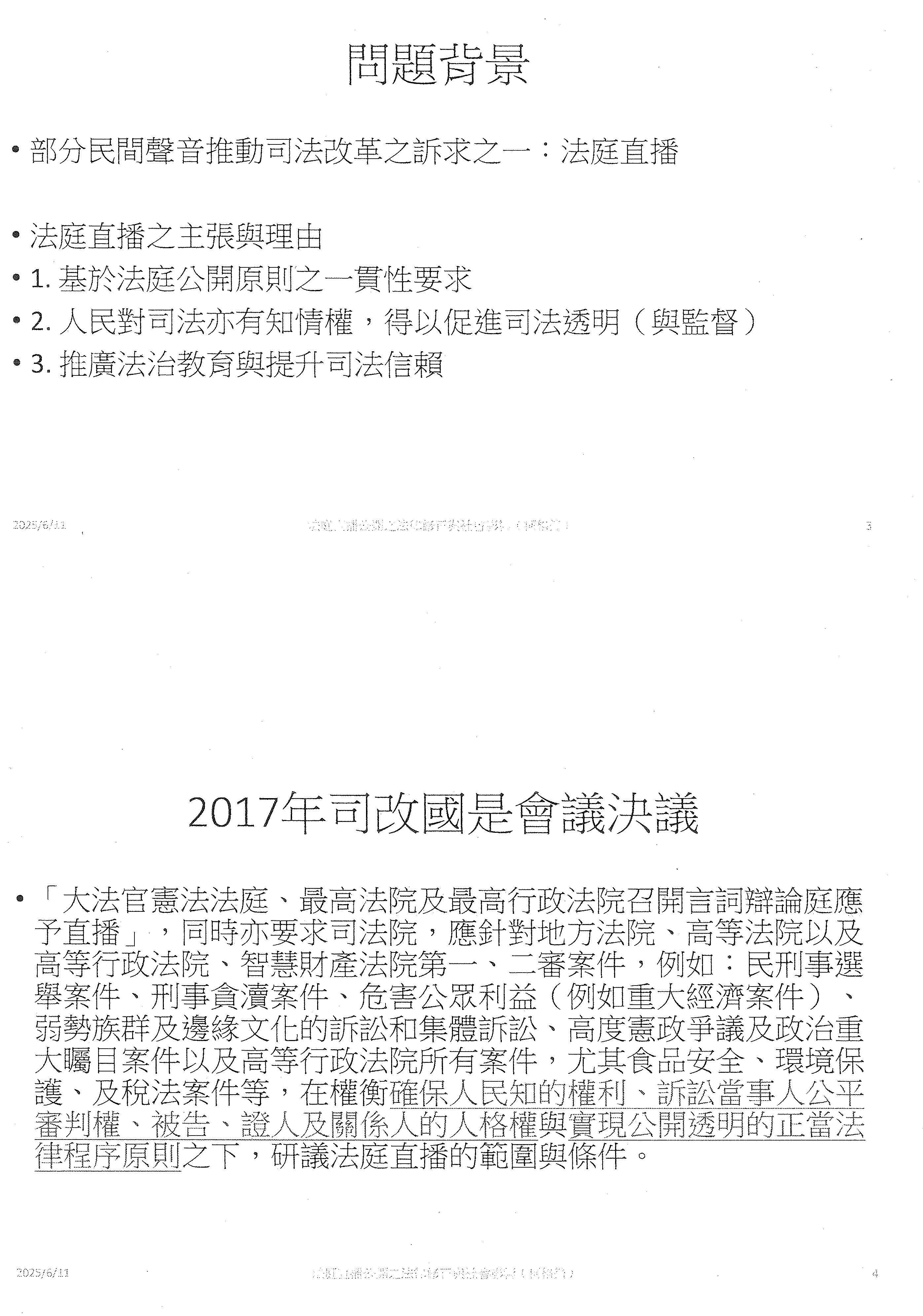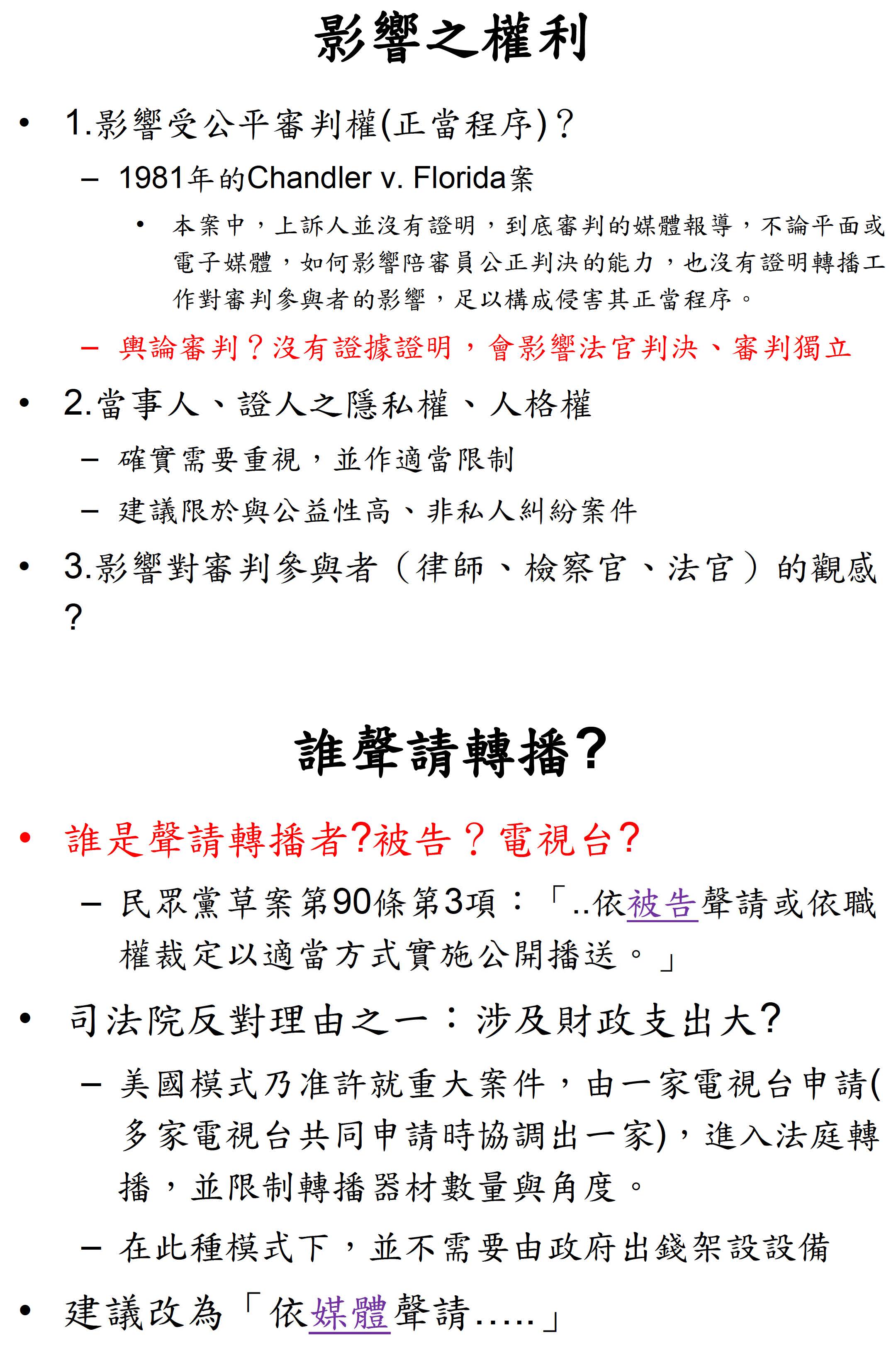 我們可以看一下這次在野黨提出的法院組織法第九十條,在關係文書裡面是說,事實審的法庭活動直播是原則不公開播送,例外公開。因為目前這些相關的配置規套在法條裡面其實是很概括的,我們看不出來,但是我們可以看一下立法理由,它說:主要是權衡、捍衛人民知的權利,我們知道這個知的權利其實就是憲法上保障言論自由的一環,人民有獲知資訊的權利。但是在審判的法庭活動裡面,我們仍然要兼顧很多其他在憲法上面保障的基本價值,也就是要公平審判,同時要兼顧這一些訴訟程序的參與者、使用者的相關權益。