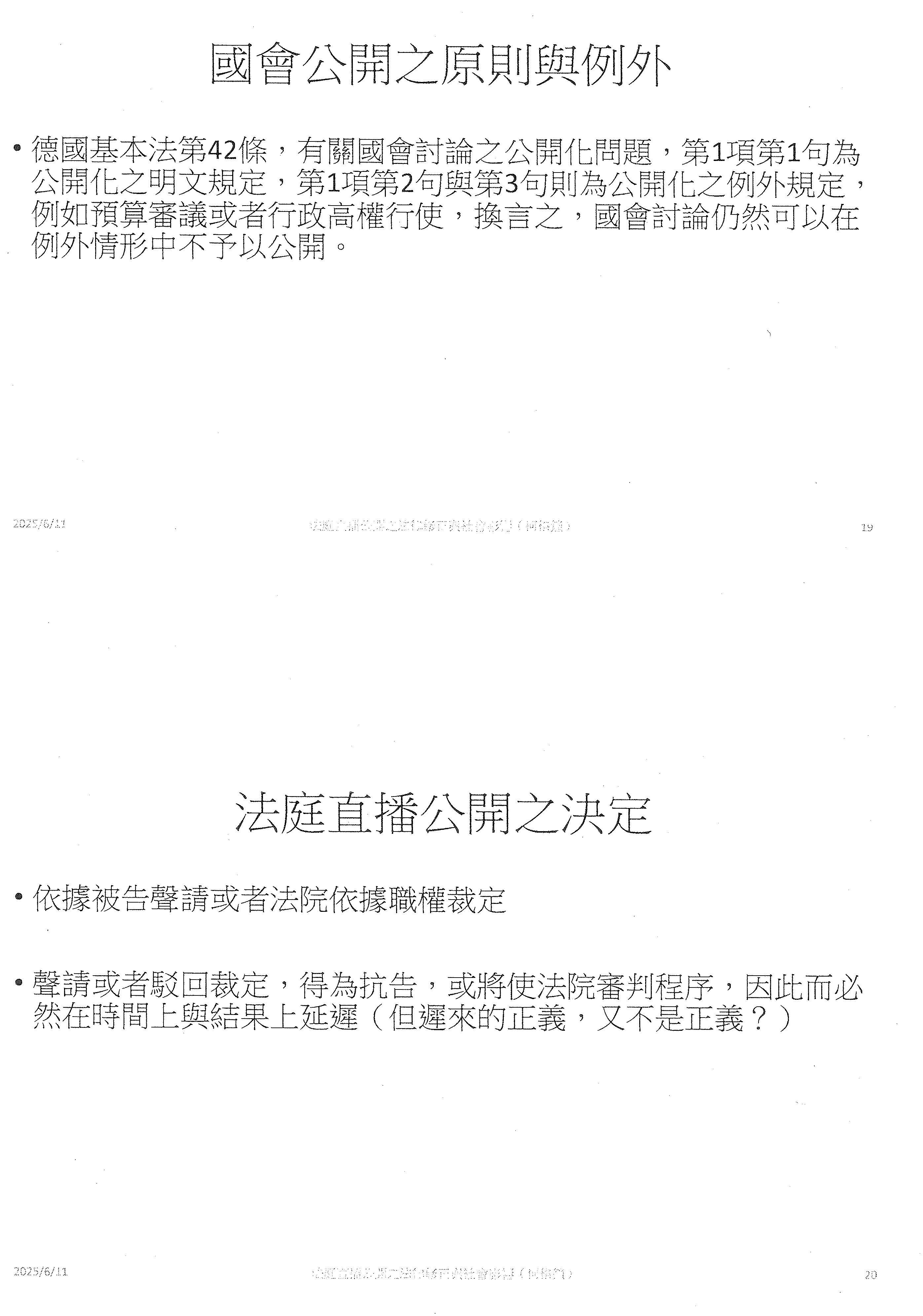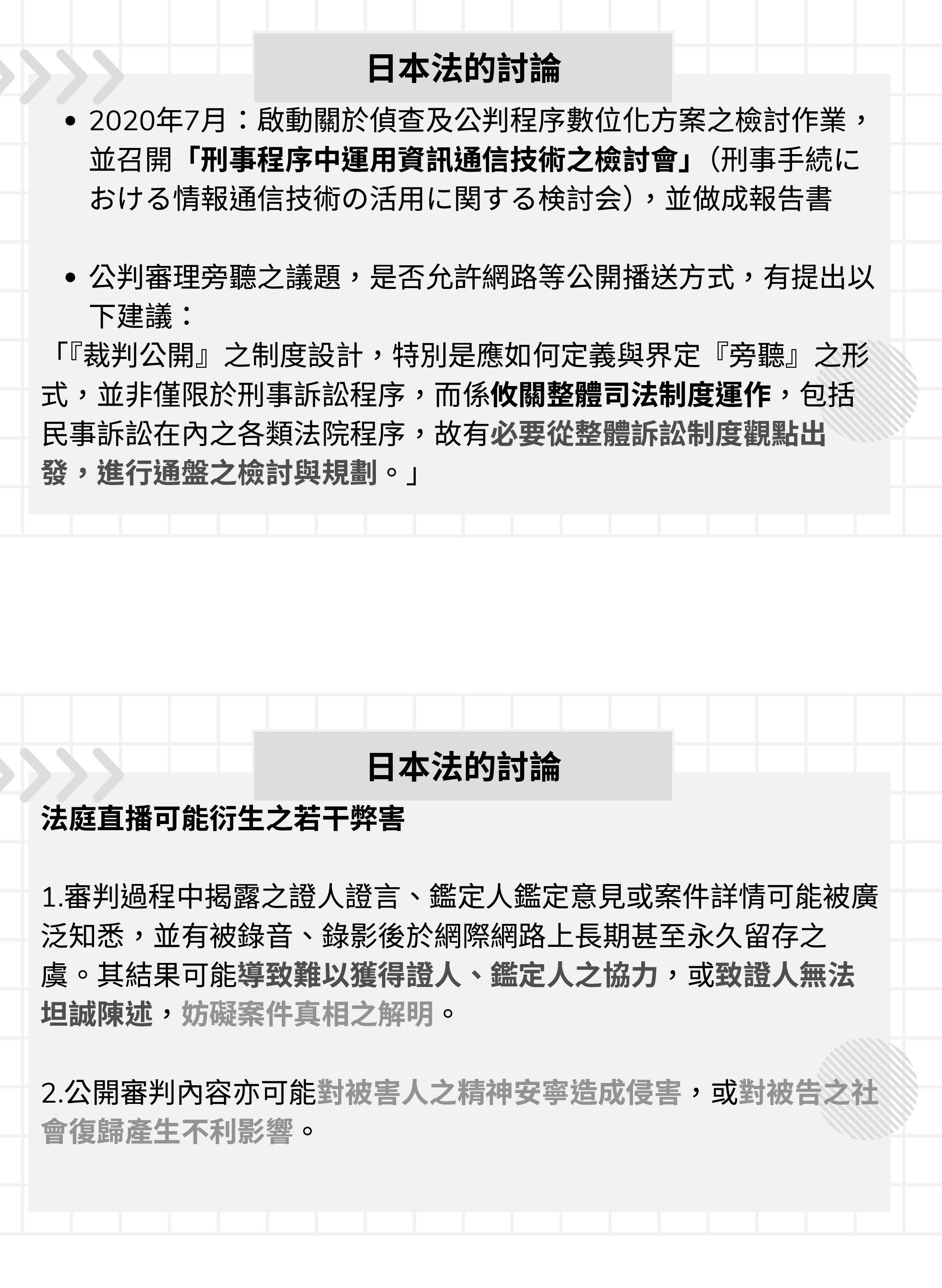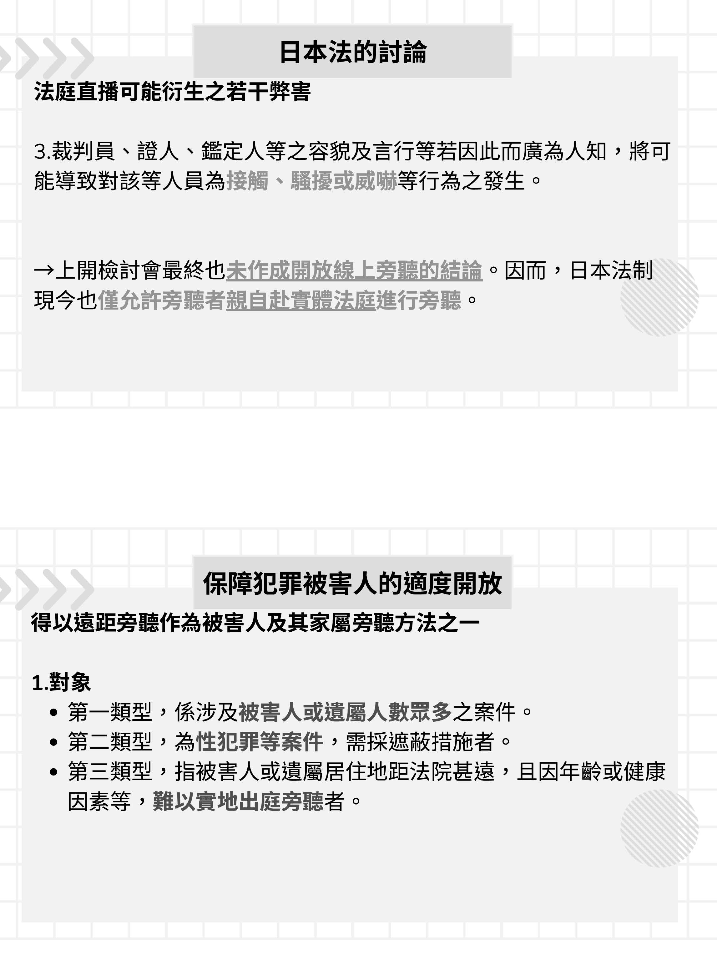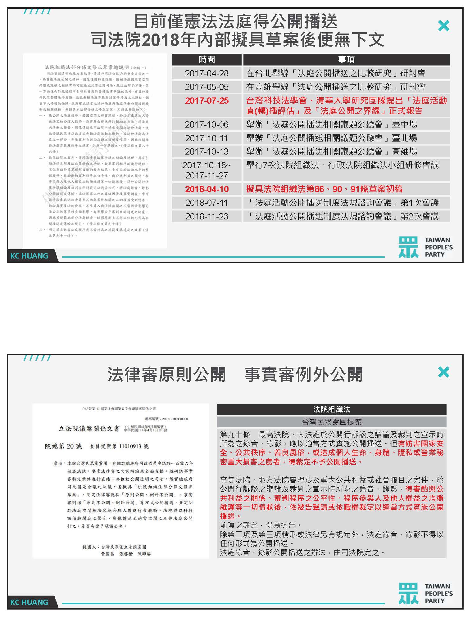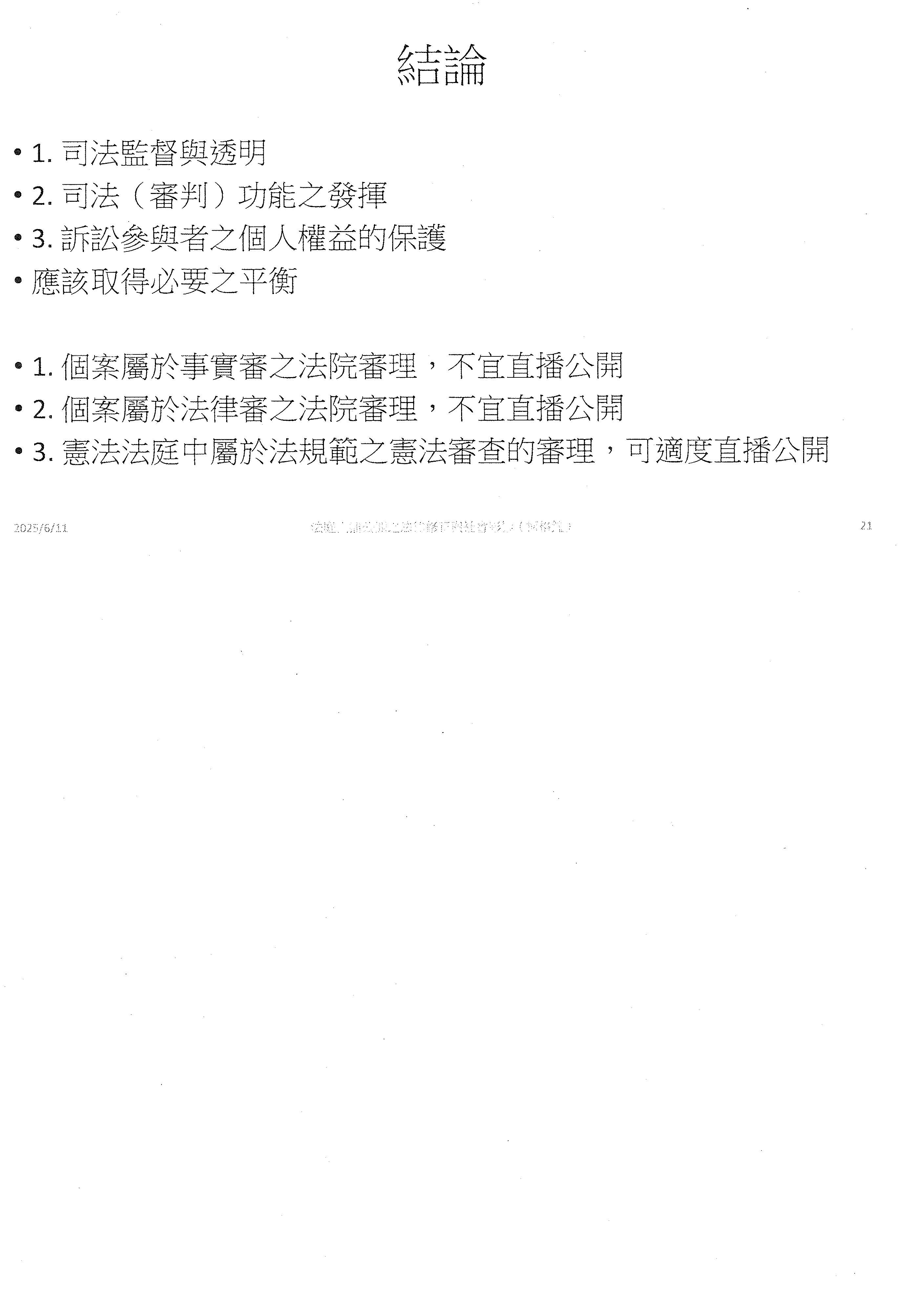 我們可以看一下這次在野黨提出的法院組織法第九十條,在關係文書裡面是說,事實審的法庭活動直播是原則不公開播送,例外公開。因為目前這些相關的配置規套在法條裡面其實是很概括的,我們看不出來,但是我們可以看一下立法理由,它說:主要是權衡、捍衛人民知的權利,我們知道這個知的權利其實就是憲法上保障言論自由的一環,人民有獲知資訊的權利。但是在審判的法庭活動裡面,我們仍然要兼顧很多其他在憲法上面保障的基本價值,也就是要公平審判,同時要兼顧這一些訴訟程序的參與者、使用者的相關權益。