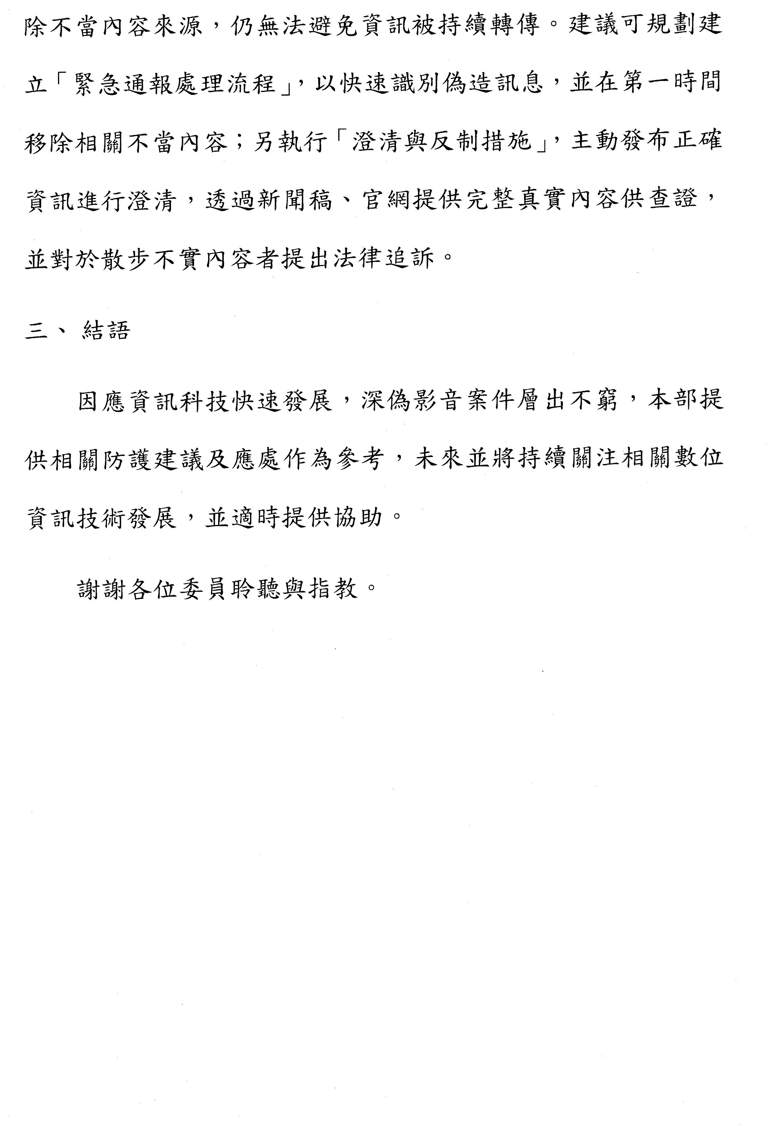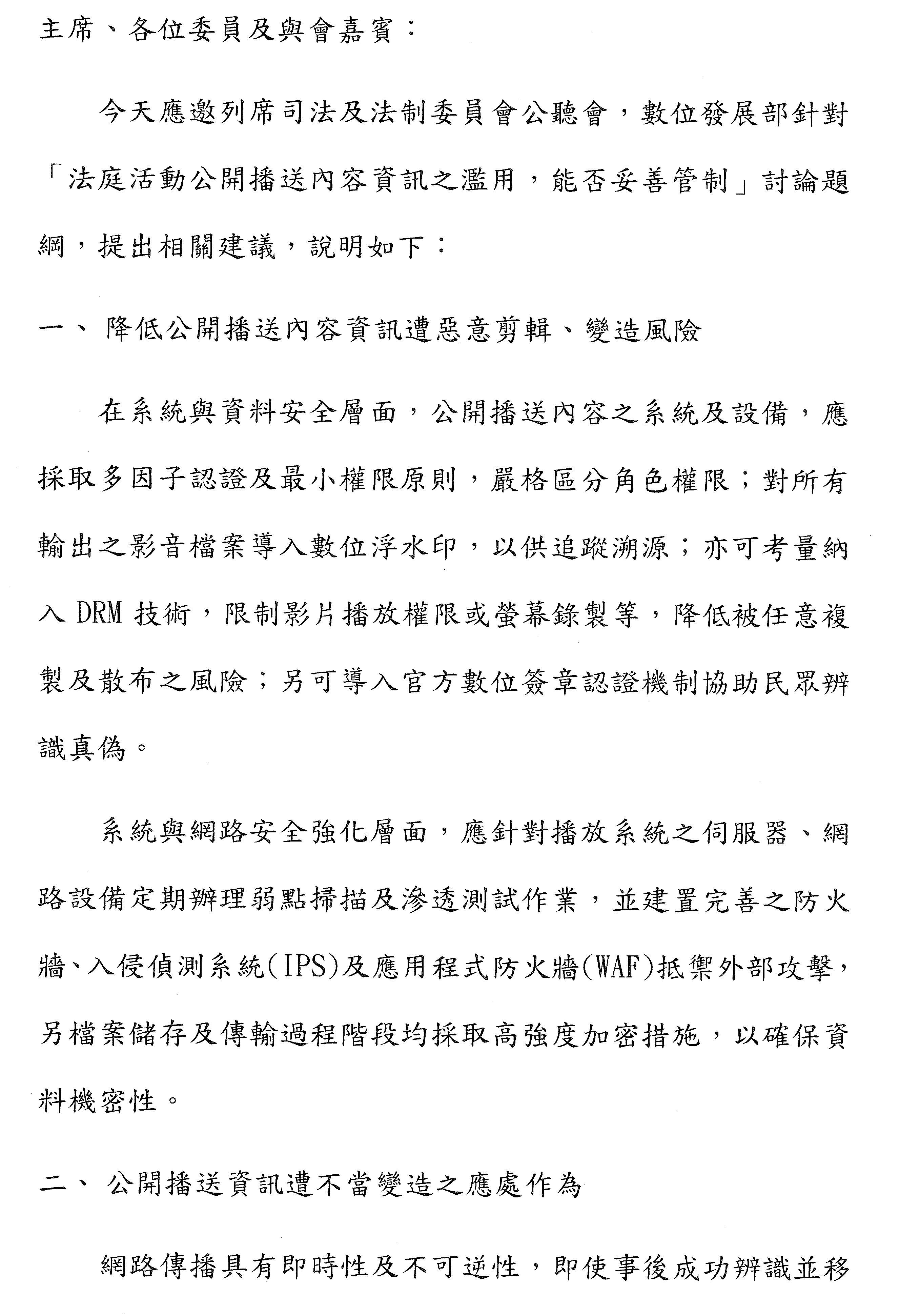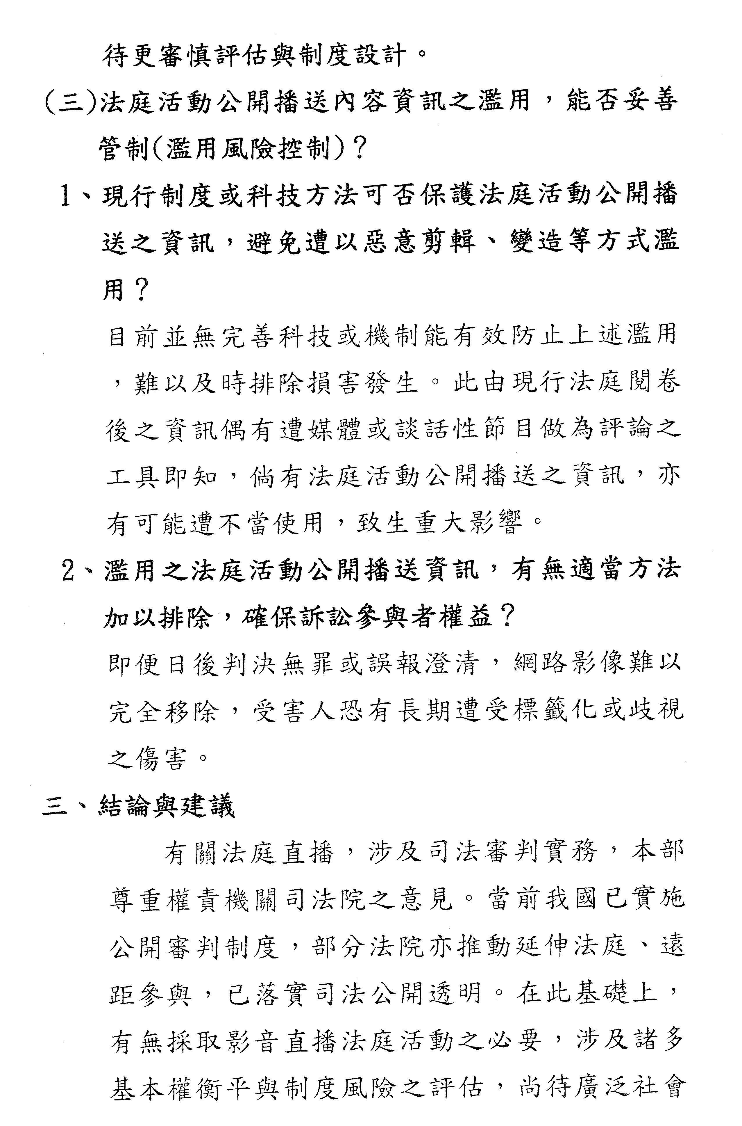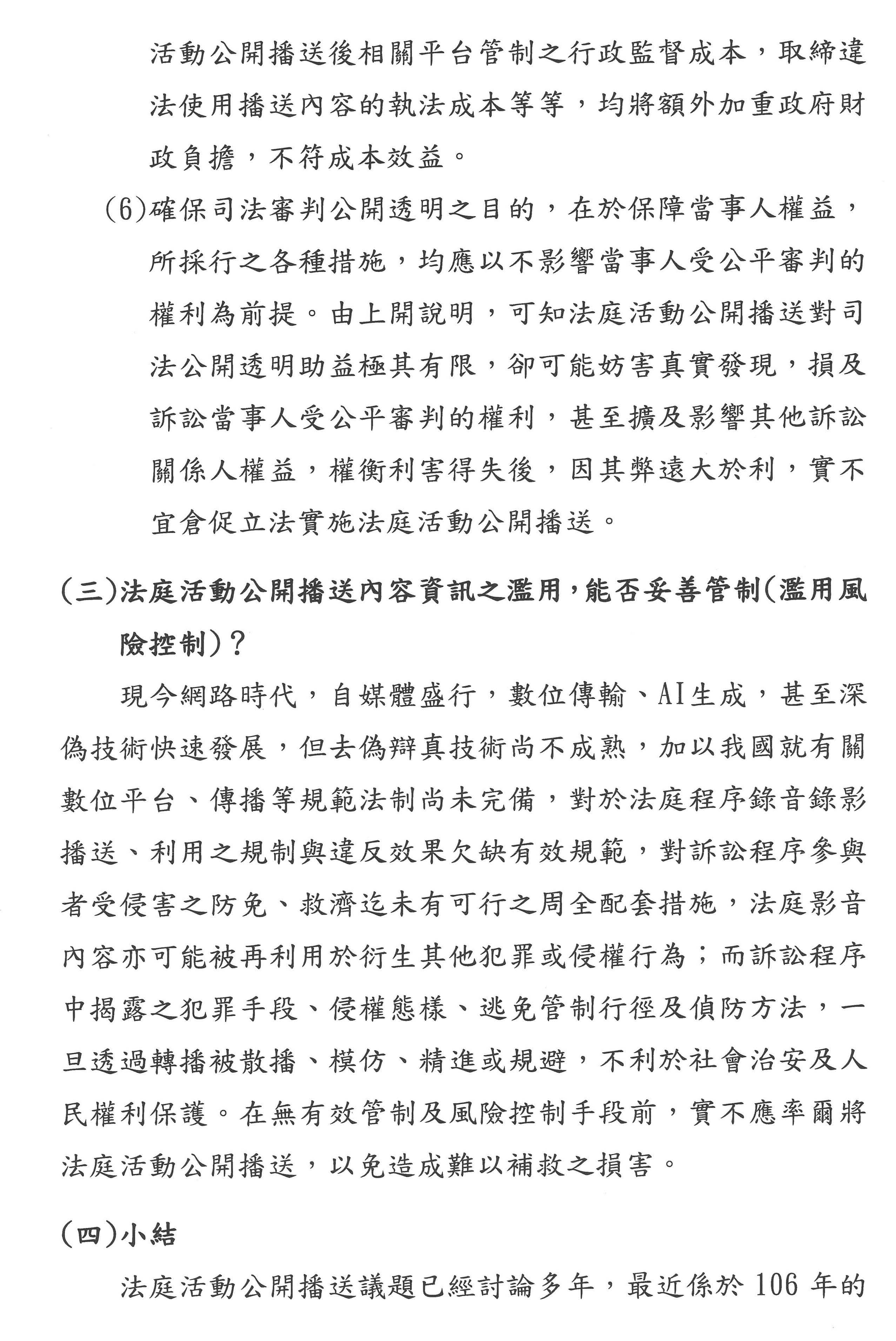 第四個,雖然國是會議召集人提到公開播送內容資訊是必要的,但是他也講了一句話,不知道各位有沒有聽到?他說剩下的就是安全機制的部分,對,這就是我們最擔心的地方:安全機制的部分!這個一公播出去,我們完全沒辦法防止被其他人剪輯或誤導,瞬間就傳播出去,造成輿論的風向或是將來的惡意使用,我們對這些完全沒辦法防止。因此,今天要採用這樣的制度,一定要審慎考慮它所帶來的嚴重社會成本,本部的態度就是希望能夠權衡各種權利的保護以及制度的風險,我想今天文法官也講得很清楚,關於這個風險要仔細的觀察評估,以上。