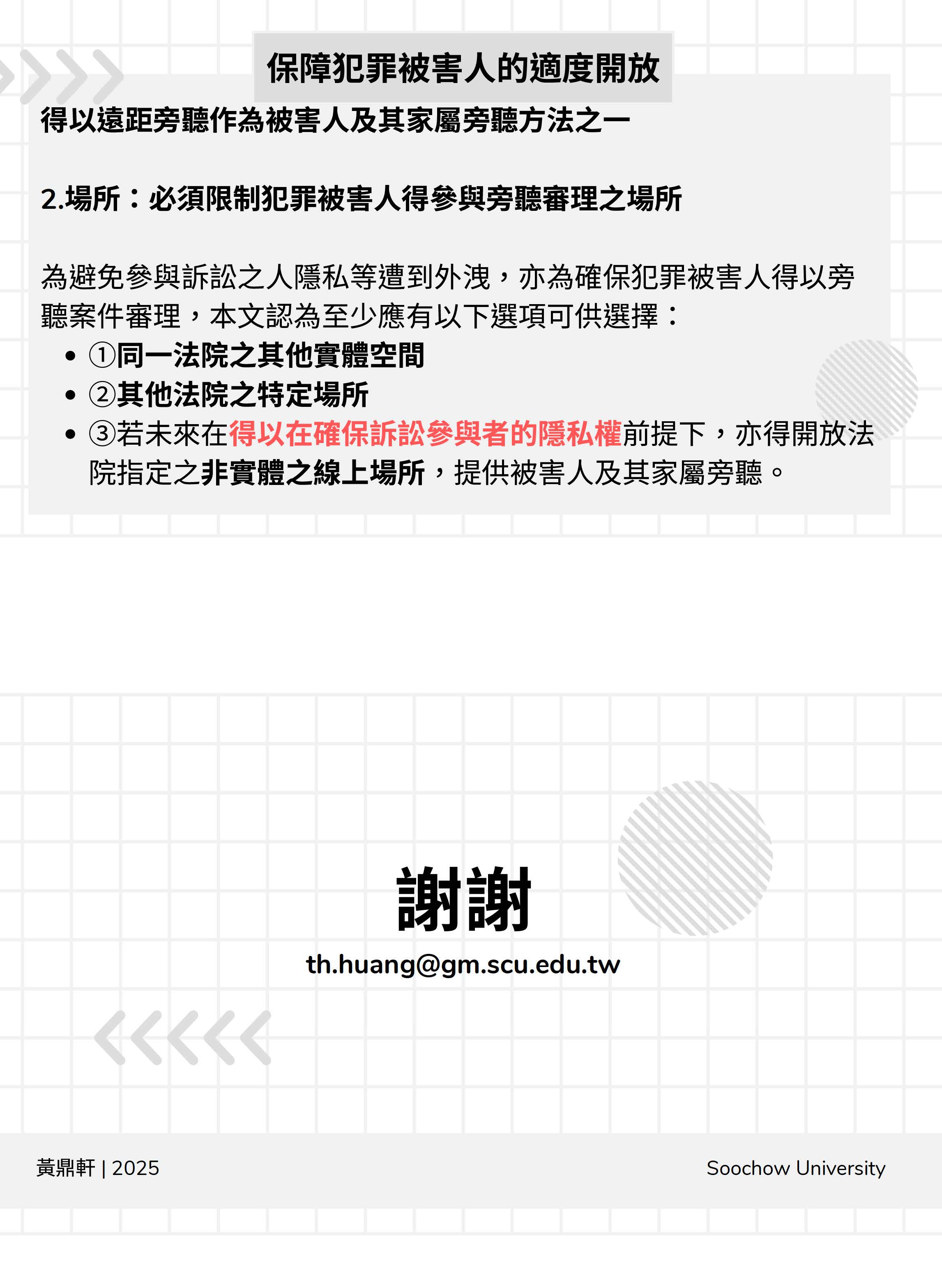 另外一點就是從程序的使用者來看,這個制度的目的其實都不是在嘉惠程序使用者,為什麼呢?我時間到了是不是?因為程序的使用者都在程序裡面了,他們對於整個程序、整個運作知之甚詳啊,那這個程序到底是在保護誰?這個制度的目的到底是要嘉惠誰?其實除了只有表演或者宣傳,或者是作為一種過度地擴散、不負責任的言論、不負責任的評論導致影響判決、影響法官,除了這樣的結果之外,我們在程序的使用者裡面找不到任何被程序嘉惠的使用者。比如說被告,在座的各位都是各方的先進、達人,但是我們永遠要記得,我們任何一個在社會上的人,尤其是現在人跟人的關係緊密,經濟活動昌盛,社會連結緊密的情況下,每個人都有可能成為潛在的被告,包括在座的每一位,有可能是被誤解、被冤屈,被不平,這就是無罪推定及嚴格的法定證據主義,還有正當法律程序所要保護的,如果我們今天把它全部推上公播臺,一個人在還沒有經過審判之前本來就應該要被無罪推定,但推上公播臺以後,全民可以公審,最後縱使這個人是無罪的結果,他的權利可以回復嗎?他受的這些損失又有誰來彌補呢?所以這都要審慎的考量,更不要說其他的訴訟參與者,包括證人、被害人,即便是一般市井小民的案子,他們在法庭作證都極端的懼怕,有些人是第一次來法庭,其實有很多心理測驗的行為科學都說,當有一個鏡頭在對著你,對人類行為絕對會產生一個扭曲的效果,這就是寒蟬效應,更不要說一些重大的組織犯罪、人口販運這些案件的被害人,他們怎麼敢去陳述事實呢?這對於發現真實是有很大的妨礙。所以在這裡誰最高興?我要說這個制度最高興的就是……肥了誰?就是網紅直播主、政論節目的參與者,他們可以蹭流量、賺流量,他們可以把這個司法產業鏈商業化、金錢化、有價化,甚至操控主流民意、操弄人心,配合職業網軍,未來很可能判決結果都可以用金錢來堆砌,這是我們非常不願意見到的結果。很抱歉,我的發言有點超過,以上是我的個人意見。