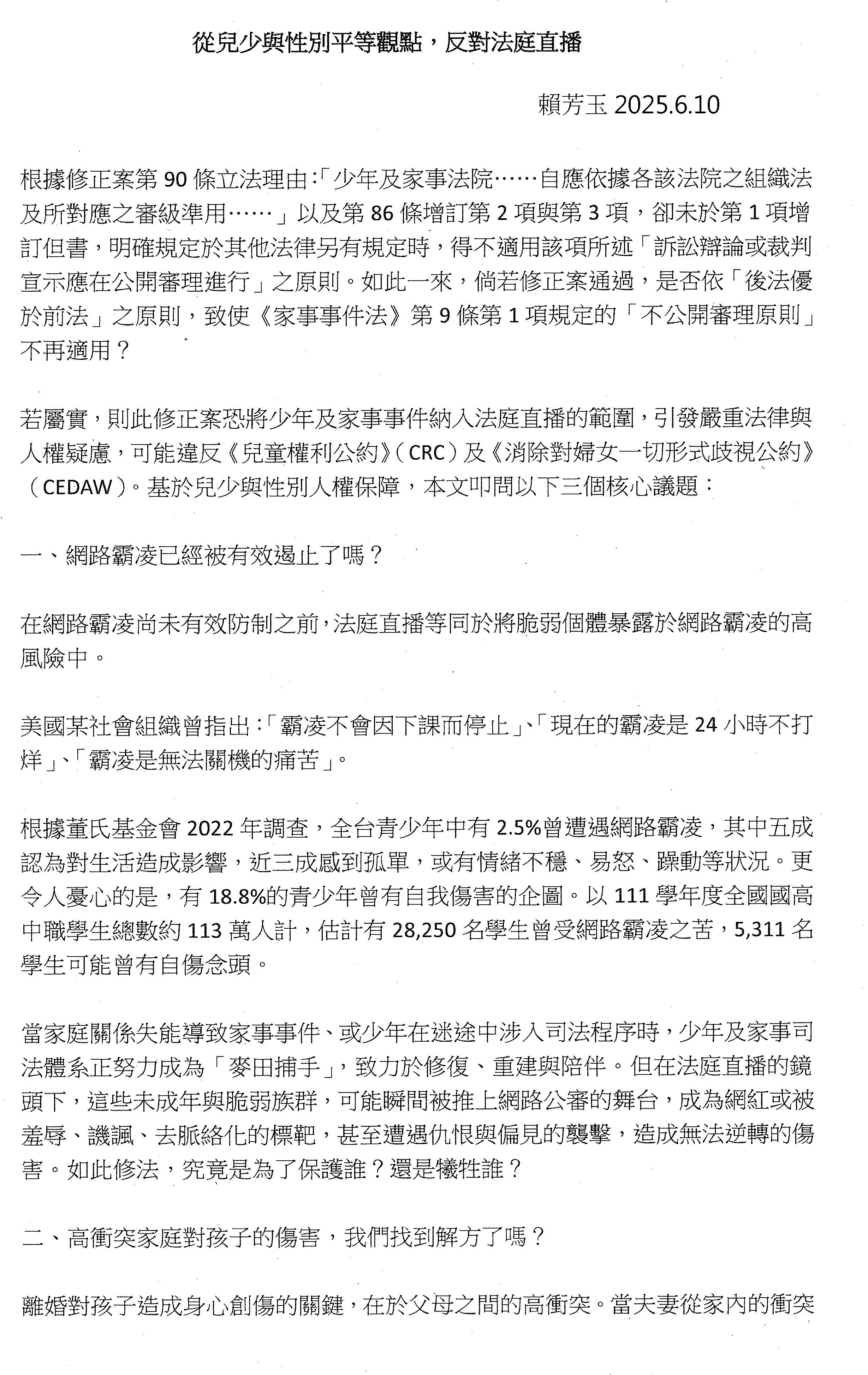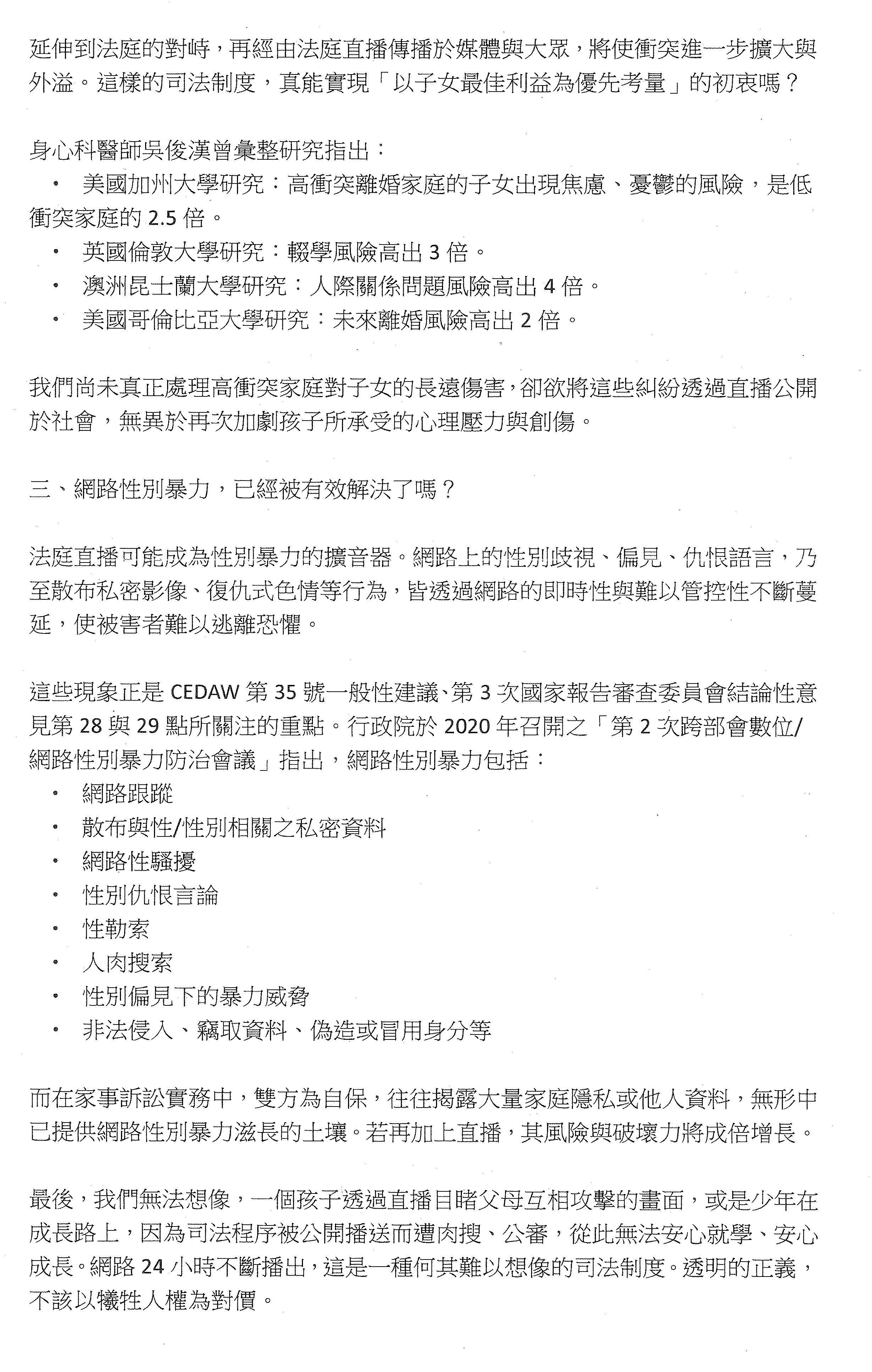 最後,我們呼籲立法院與司法院在推動法庭直播的同時,應保留家事案件的高度保密性,並正視婦女與兒少在家庭關係中所處的不對等處境,晚晴婦女協會將持續為此發聲,願與各界共同守護一個安全、更有人性的司法環境,謝謝大家。