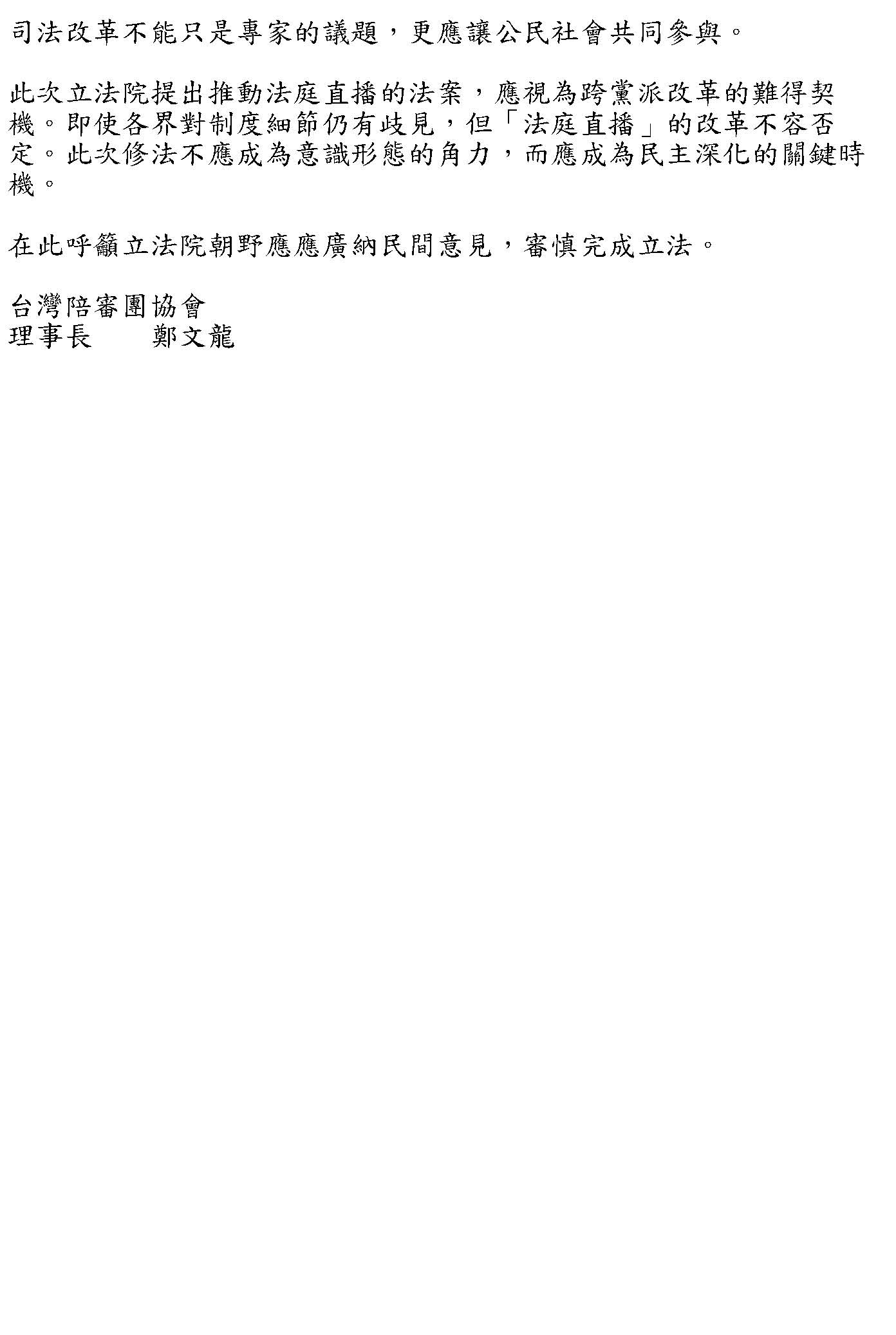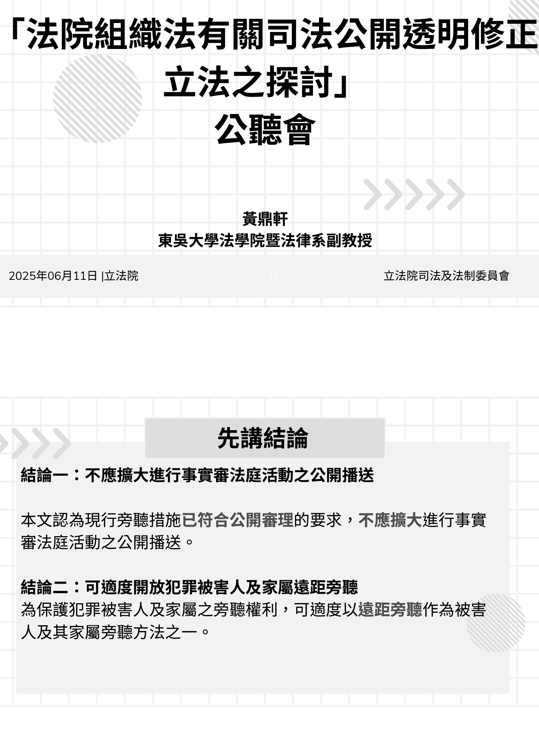 我相信文龍應該也是這個意思,剛才私底下與他做過討論,我們認為剛剛所提的那些法律絕對應該被排除在法庭直播的範圍之外。假設它是今天公聽會的共識,那麼啓楷也在場,這部法案絕對要進行修正,謝謝。