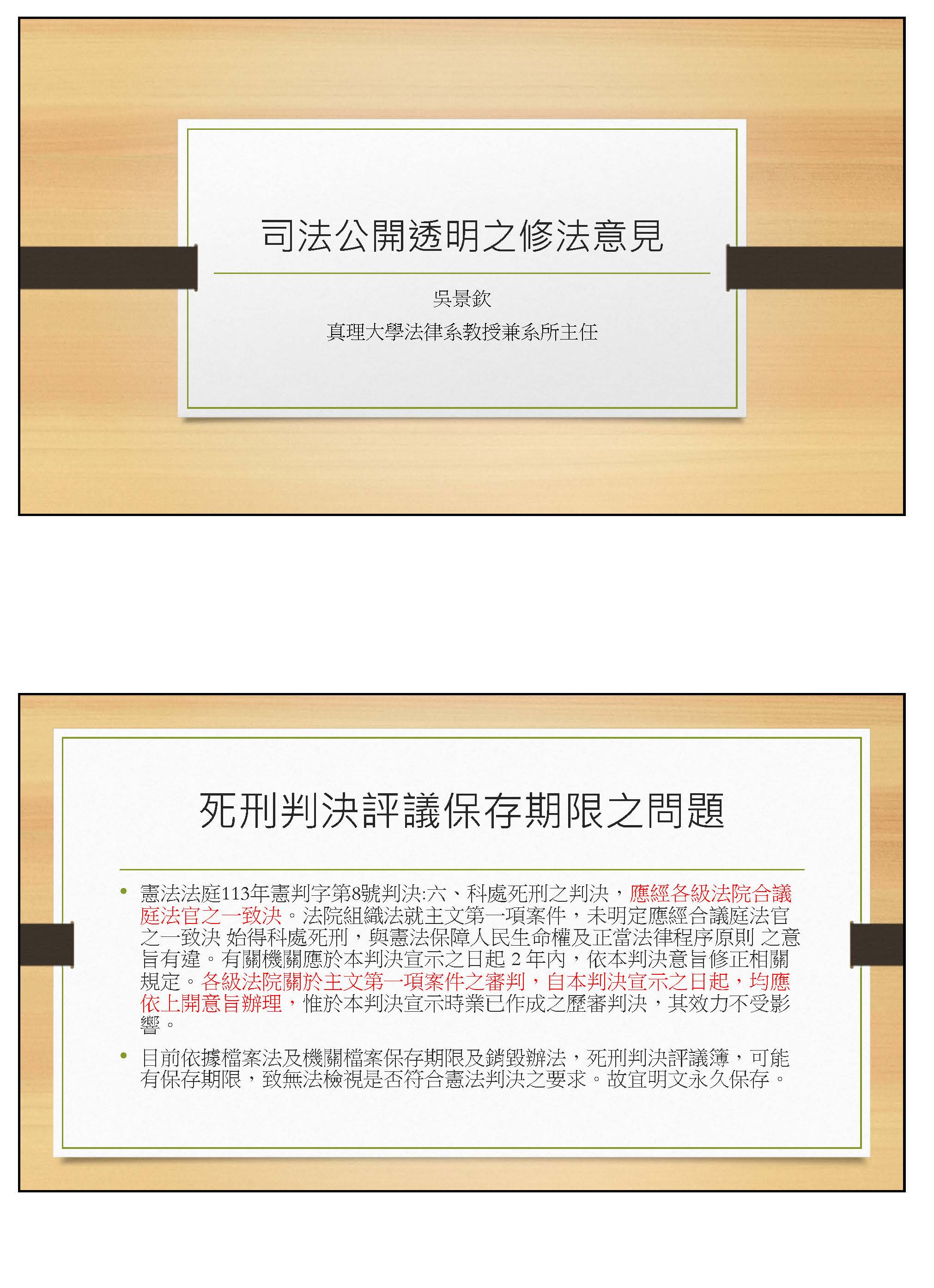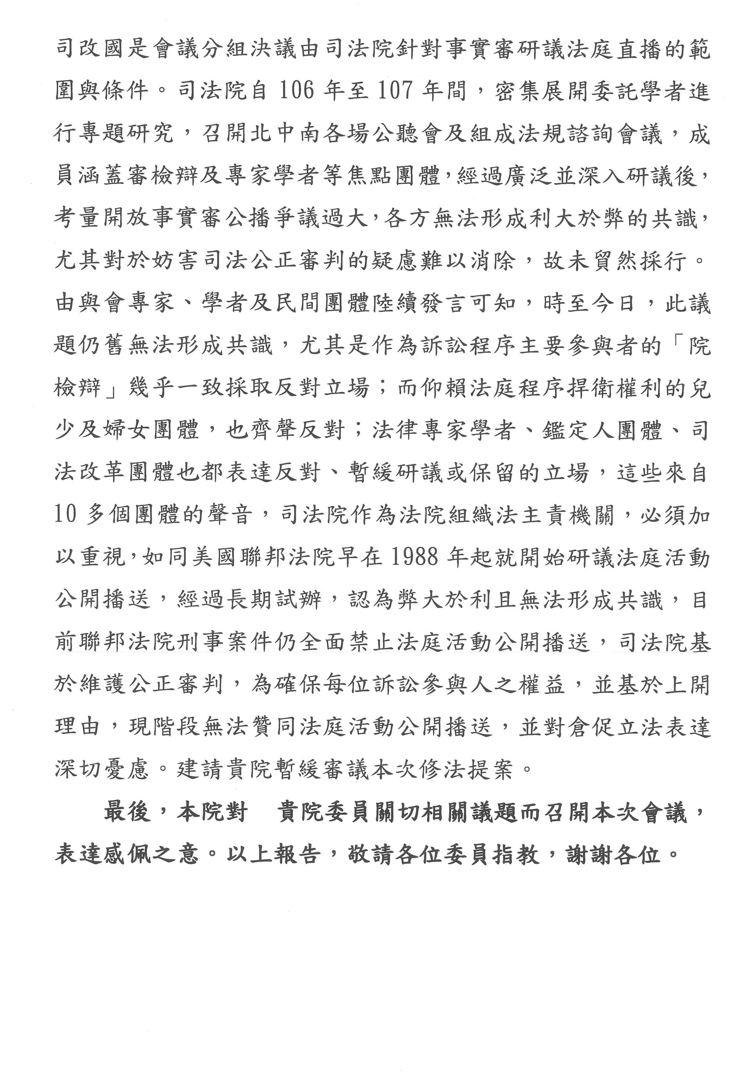 基於以上的理由,司法院現階段沒有辦法贊成法庭公播,而且對於倉促立法,我們必須表達很深切的憂慮。最後也建請立法院能夠暫緩審議這次法庭公播修法的提案,以上敬請指教,謝謝。
