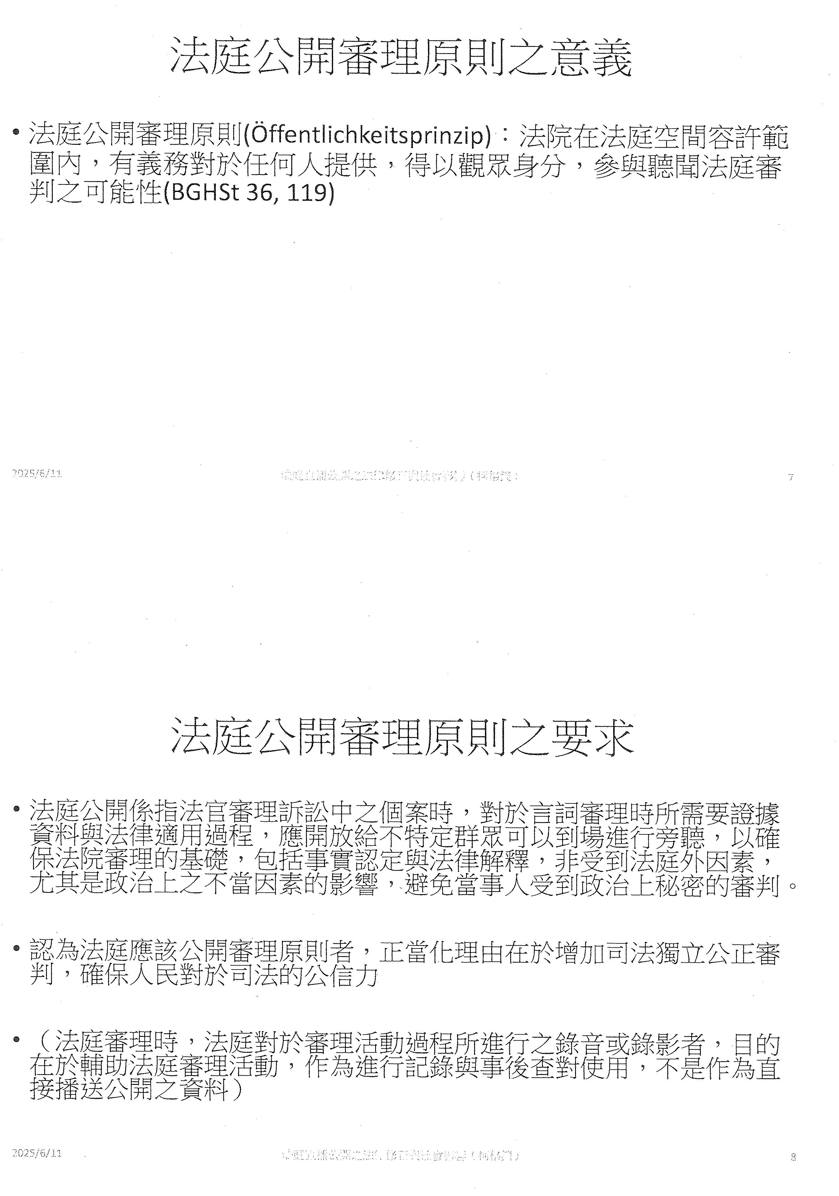 然後這個是德國,我講一下2015年我去德國,這是德國的最高法院,它不開放,我只能在門外,但是是靠關係才得以進去,結果我跟大家報告,德國最高法院開假的,沒有在辯論,去了有5個法官,原告上訴聲明、被上訴人……結果結案了,沒有在辯論的,那我不信啊!大家都說德國有多厲害,很多人留德拿什麼博士,我就繼續聽第二個案子,第二案也一樣啊!說是一個重大案子,上訴聲明、被上訴人,結案!德國沒有在真正的言詞辯論,它的最高法院也是假的,我們在學什麼德國?我們臺灣司法的問題就是傻傻地學落伍的德國。這個是德國的地方法院,我也看它的參審,德國的檢察官不會問證人,德國的律師也不會問證人,比臺灣的律師還不如,因為好在我們2003年採用了交互詰問制度,所以臺灣優秀的律師像現場賴芳玉就是優秀律師,我們的交互詰問技術都比德國的檢察官跟律師好,所以拜託,不要去學落伍的德國,我們現在的問題就是學了一個落伍國家的制度,什麼都不行!