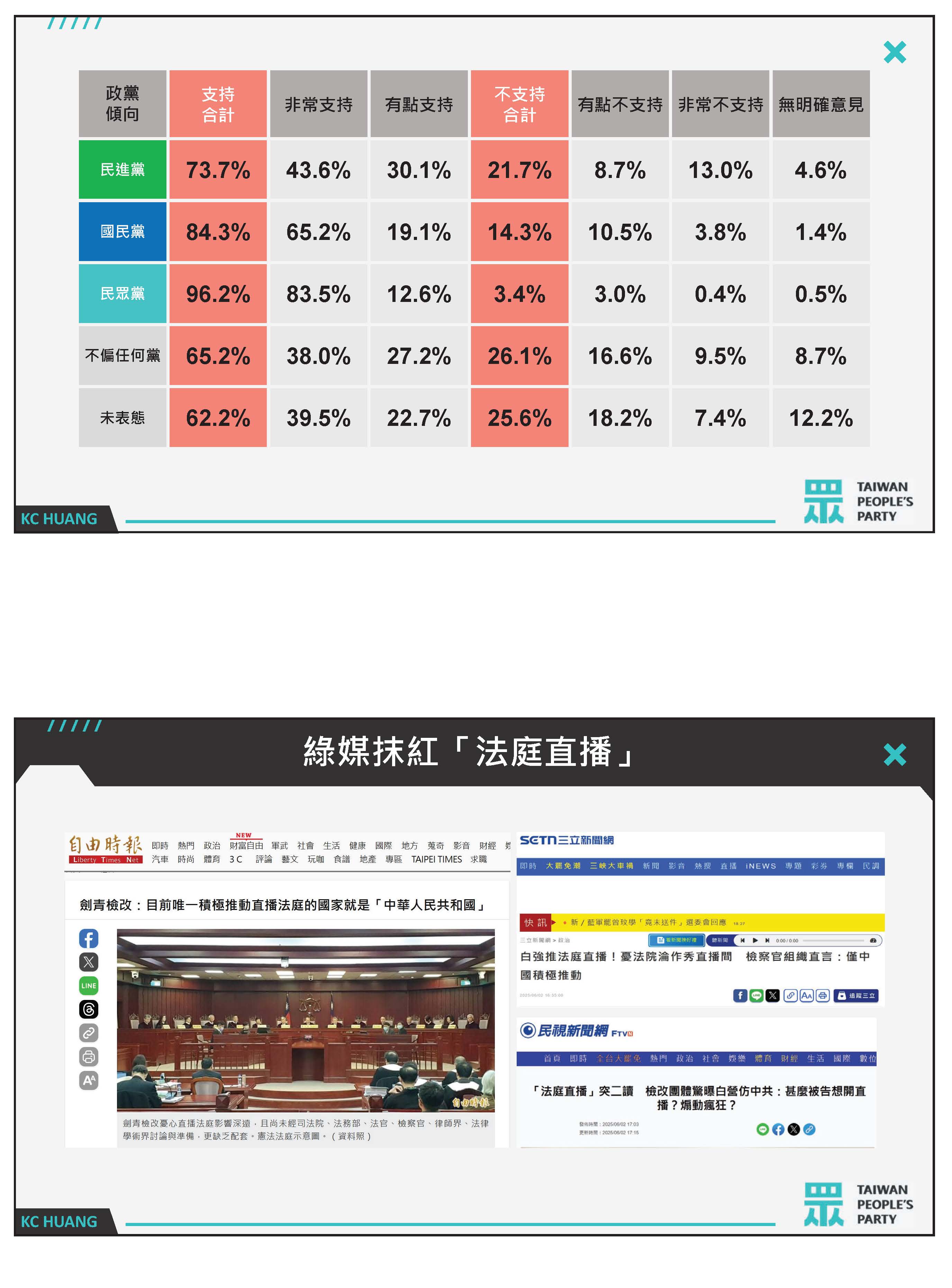 因此,我認為大家要討論這件事必須持平而論,今天大家並不是因為這是黃國昌的法案而反對,而是因為他的法案直接寫高等法院及地方法院涉及到重大公共利益或社會矚目的案件,什麼是社會矚目啊?柯文哲的案件就是社會矚目,所以這個案子就必須要法庭直播,是這樣嗎?這個案子也涉及到許多證人的詰問,真的要在詰問證人時透過直播的方式給證人不必要的壓力嗎?這個部分是要檢討的。
