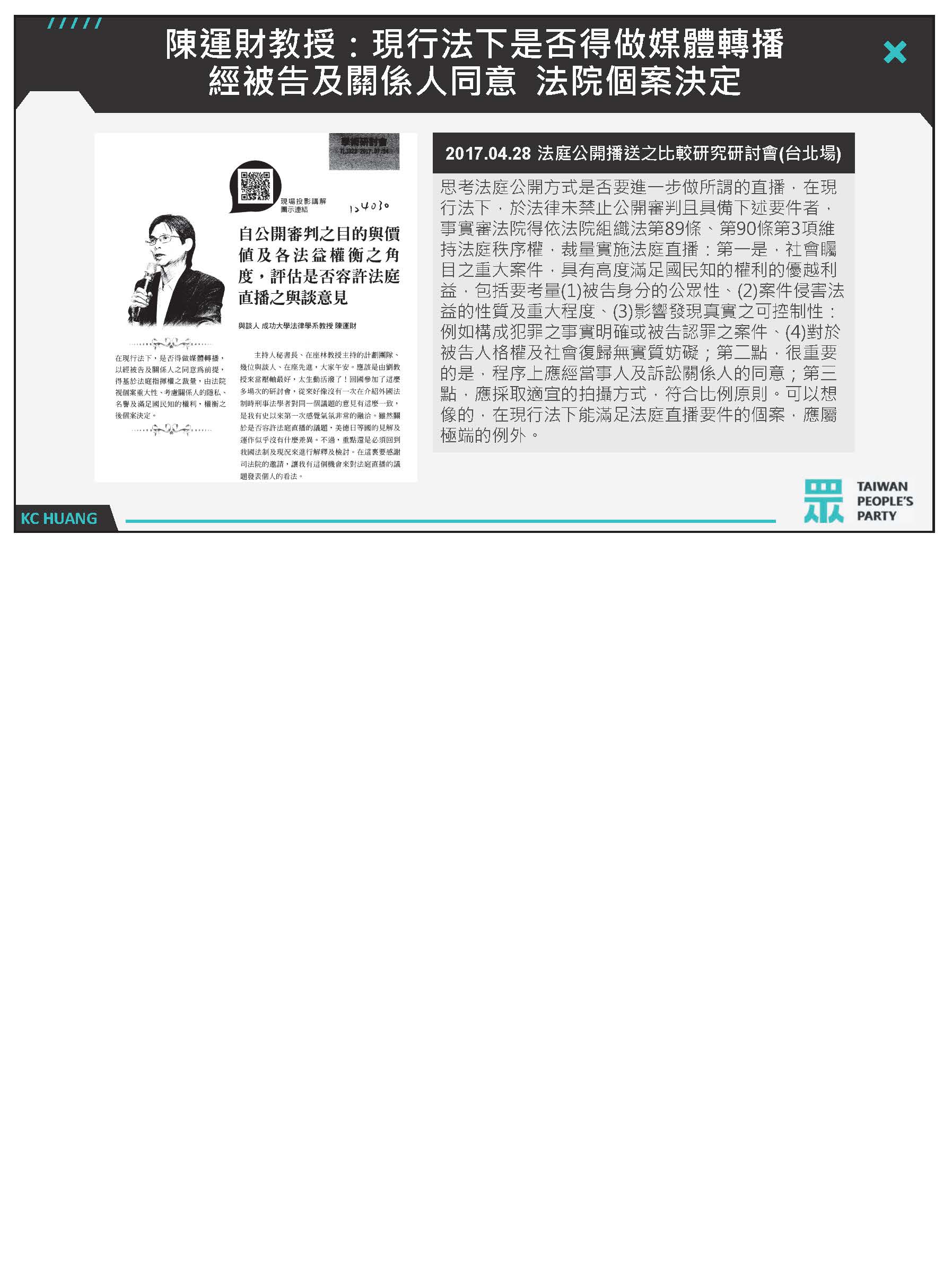 另外,在提案中他們提到法庭直播的發起權限:一、由被告聲請;二、由法院依照職權來裁定直播。我先說,我不知道什麼樣的被告會想要讓自己的審判在第一時間公諸於世?我更難以想像,怎麼樣的辯護人會想要把自己的當事人送上全國直播?所以我看到民眾黨這個逕付二讀的提案版本,要依被告聲請的立法模式,我真的要說,前所未見。而被告聲請的同時,他也不需要讓其他當事人,甚至是證人、鑑定人陳述意見,他們第一時間可不可以同意的這件事情完全沒有在修法、配套機制當中提到,一樣是莫名其妙、粗糙的修法,我認為他們這個動作會把審判變成秀場、把交互詰問變成一場大戲,最後把法官的自由心證變成全民公審。剛剛前兩位專家學者都已經提到,不管是家暴的案例,或者是後續網軍的操控,難道這真的是我們期待司法公開透明的審判模式嗎?